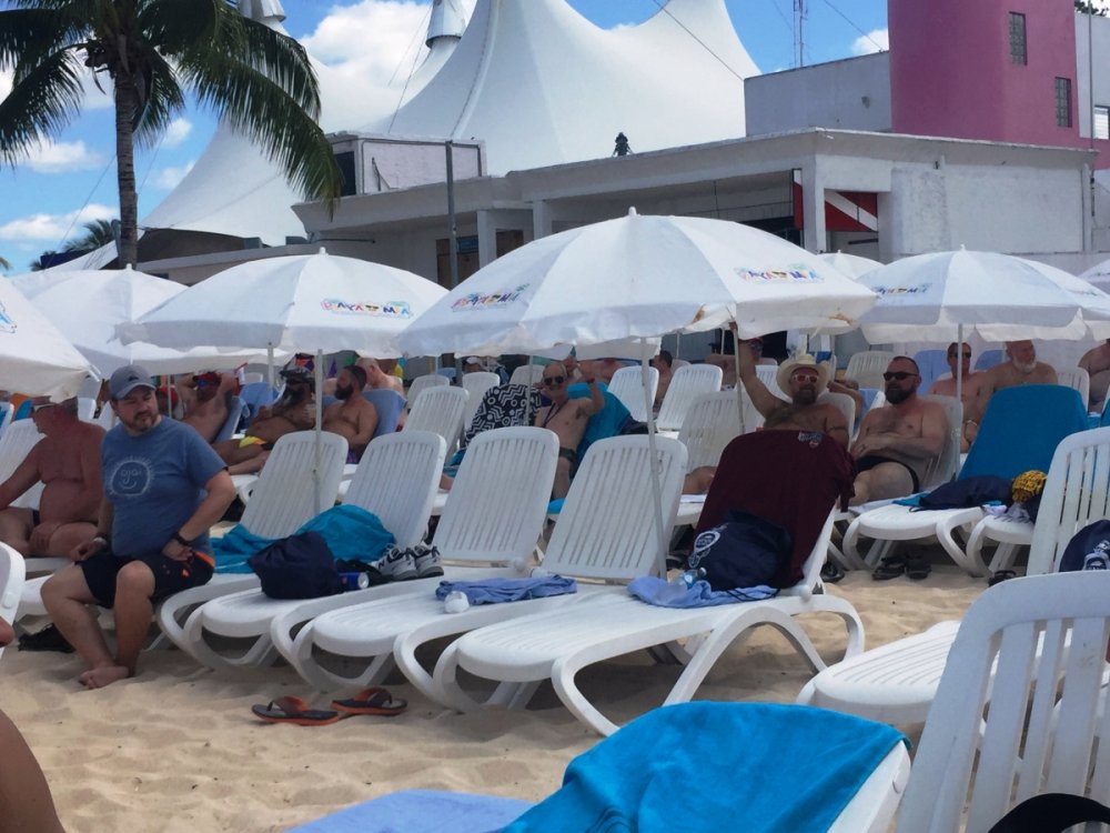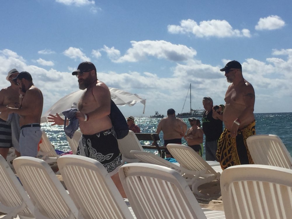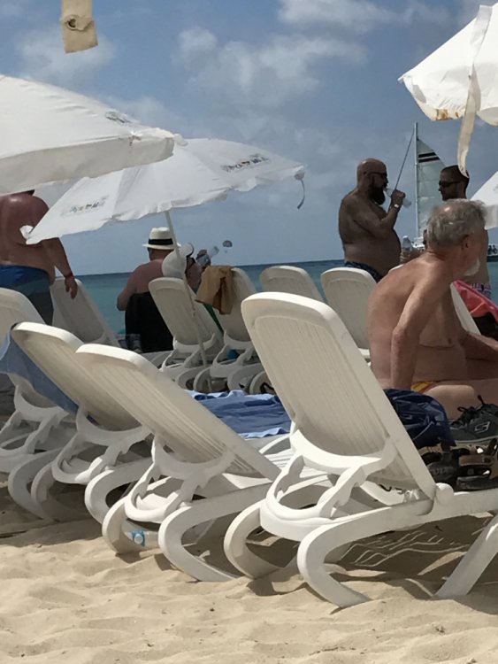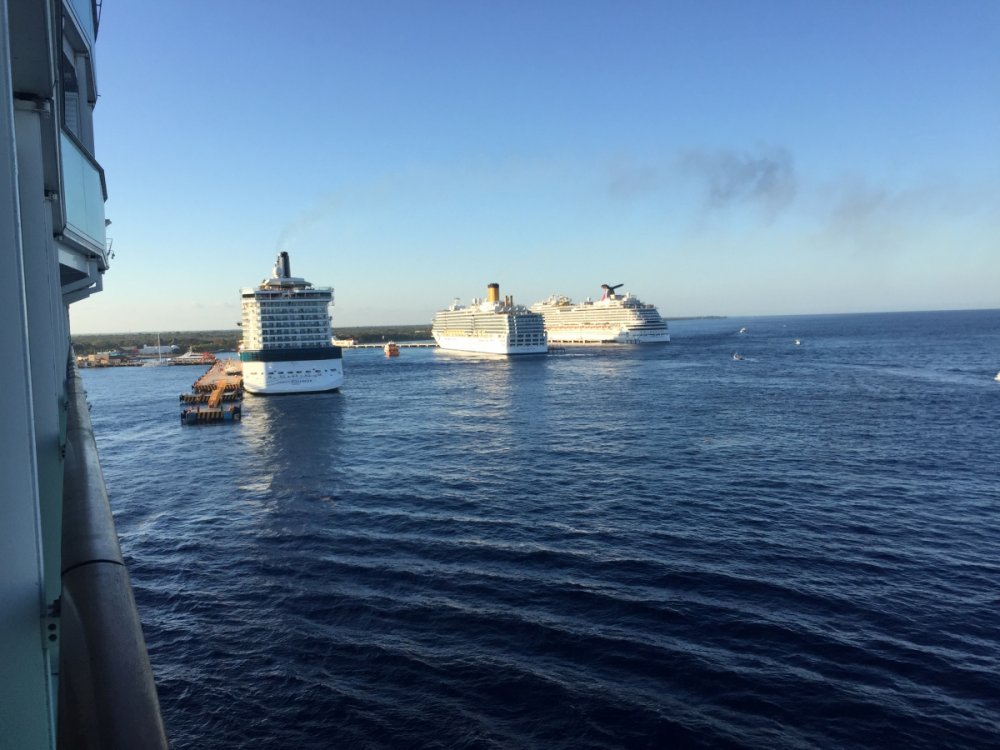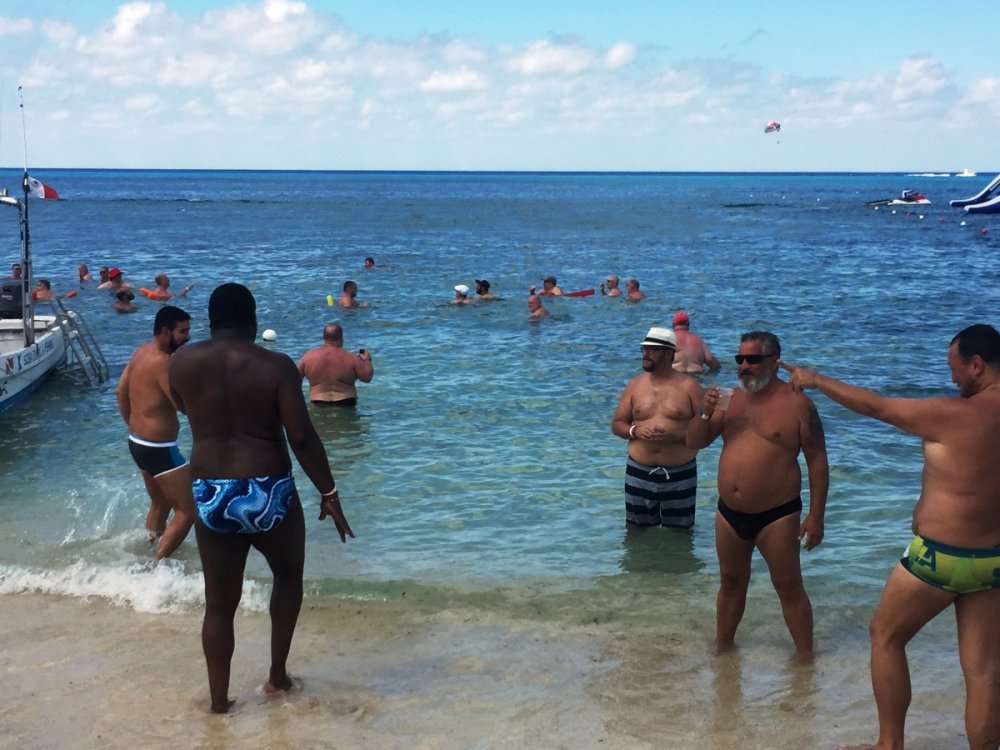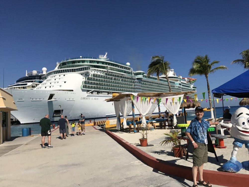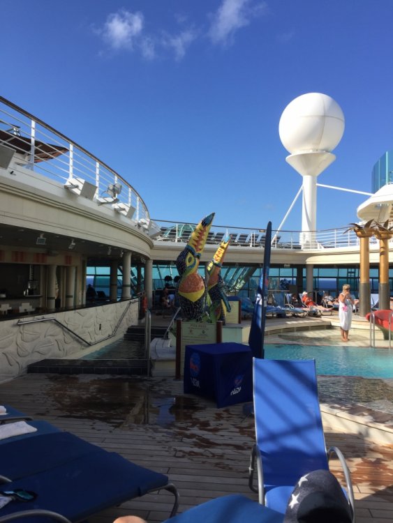 Day 6 (Cozumel) For the last port, we actually had a meet up at a sensible 9:30 (on the dock even), so there was no reason to get up early. But as usual, when on vacation, I was up pretty early, and was out on the balcony as we started to pull into the port – alongside 3 other ships that were already docked. and when I say “along side”, I mean really/really along side – we were so close to the Celebrity ship, we could see into the rooms easily, although there was no reason to look into the rooms, since almost all of the passengers seemed to be sitting out on their balconies staring at us as we pulled into the dock (in robes, that WE didn’t get, as we only had balcony cabin, not a suite..sheesh, RCCL, really?). Luckily, we had pants on, because yeah, they all seemed to be trying to get a peek at what was going on over on our ship. . . There was also some time-change screwery going on, that even tho we gained an hour when we pulled into Cozumel, the ship asked everyone to stay on ship time, which was an hour behind. . so that seemed to have messed up a lot of people in terms of waking up. For sure, there were way more people down in the MDR for breakfast this day than any other time we went. Nick was kind of awake, and was feeling pretty good, considering how much walking we had done yesterday at the ruins. . but him turning in early-ish had helped a lot and he woke up feeling OK. So I got him to go down to MDR, and we bumped into Adric in the hall who joined us for breakfast - where once again my eggs benedict were overcooked. Then we headed to get our Vanilla Mocha Lattes, and back up to the room to change for the Cozumel excursion (a “beach party”). . . . We were still well over an hour before it was time to meet up, but decided that we’d go ashore and do some shopping for a while before we had to meet up. Even at the early hour, there were already people drinking at the Senor Frog’s on the dock (I think that’s what it’s called), but we bypassed that, other than posing w/ some pics of the Liberty behind us, and decided to do a bit of shopping for Magnets and such. Now remember at the very start of this trip report, we dropped the dog, Roxxi, off for Medical boarding? (she’s diabetic and needs insulin shots twice a day (21 units each), as well as *completely* blind, and needs 3 different eyedrops each day (to keep the swelling/glaucoma in check). She’s going deaf in her right ear. . . She also has a number of tumors (we call her “lumpy” sometimes) which we’ve never had biopsied, as we don’t plan to treat them as long as her quality of life is good – which it really is still, she loves her walks (tho I walk her on a short leash so she doesn’t trip on curbs or sidewalk uneven-ness) she plays with her squeaky toys (tho when she flings them she can’t find them and runs back to her box to get more. . so we end up with squeaky-apocolypse on the living room floor if she’s been playful that day), and she still eats and poops with regularity.. she’s adjusted to the blindness/deafness and has a good quality of life still. So when we dropped her off, we gave them Nick’s number, since his phone is international, and mine is not (so mine was basically just a camera for the trip – which is why it was frustrating for Nick that he couldn’t find me sometimes when he turned in early). Anyways.. apparently Nick had (for some reason) turned his phone OFF while we were at sea, and so when we got ashore at Cozumel, he turned it on and had 5 missed calls, and a voicemail from an Austin number. He mentioned to me the calls, and asked “what is the vet’s number?”. .and I recognized it as soon as he read off the number. So I stepped out of the store we were in, and listened to the voicemail, and immediately called the Vet back, speaking to Roxxi’s “regular” vet, since the one who had called multiple times (Dr. Hopper) was a doctor at this clinic whom we hadn’t used in years, switching to Dr. Schubert since she’s always in on the Wed or Friday when we drop Roxxi off for Glucose Curves, check ups, etc. . . . Dr. Schubert told me that Roxxi hadn’t been eating (she’s usually a bit finicky when we board her) and when she did she was throwing up. . and that concerned them, since they couldn’t give her the insulin if she didn’t eat. I told Dr. Schubert that why didn’t they just let her re-eat what she threw up (ew. .but she’s a dog, she licks her butt), and that way the food ends up in her regardless. . .and she told me that’s what they did. But they were worried that she also seemed to be having trouble peeing. . and that they had tried to call us, but couldn’t get hold of us (since Monday, and this was Friday), so they had run cultures, and started her on antibiotics. Dr. Schubert said she was doing much, much better, and that we shouldn’t worry and enjoy the rest of the cruise. We hung up the phone, and I said to Nick, THAT is going to be expensive, even tho we had checked the box on the paperwork to “do not treat unless you contact us first” but there was nothing we could do about it now, and at least she was doing better. So we continued shopping and taking a few more pictures. I got a Day of the Dead magnet for a friend, and a magnet of a monkey masturbating for us (because, why not? It’s Cozumel!. . LOL), and then also bought a T-shirt, and Nick ended up buying a Texans (football team) shoulder bag, that he wasn’t intending to buy, but the cart-guy kept dropping the price, and he got it for something like $20, marked down from $38. . in the port shopping area too! I was shocked they lowered the price like that right on the docks, basically. After shopping a bit more it was time to meet under one of the big Palapas for our excursion. We didn’t know much about it, other than it was a “beach party” with a “semi private” beach for our group. It turned out it was at a pretty well known Tourist spot called “Playa Mia