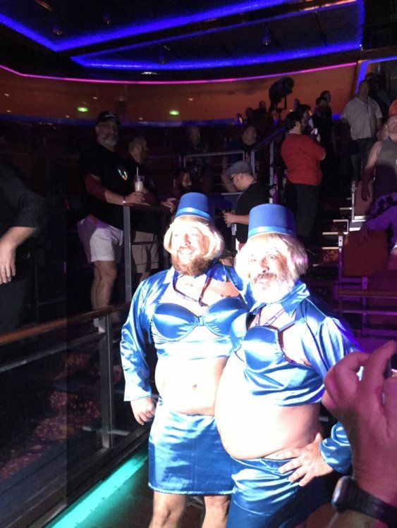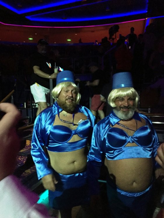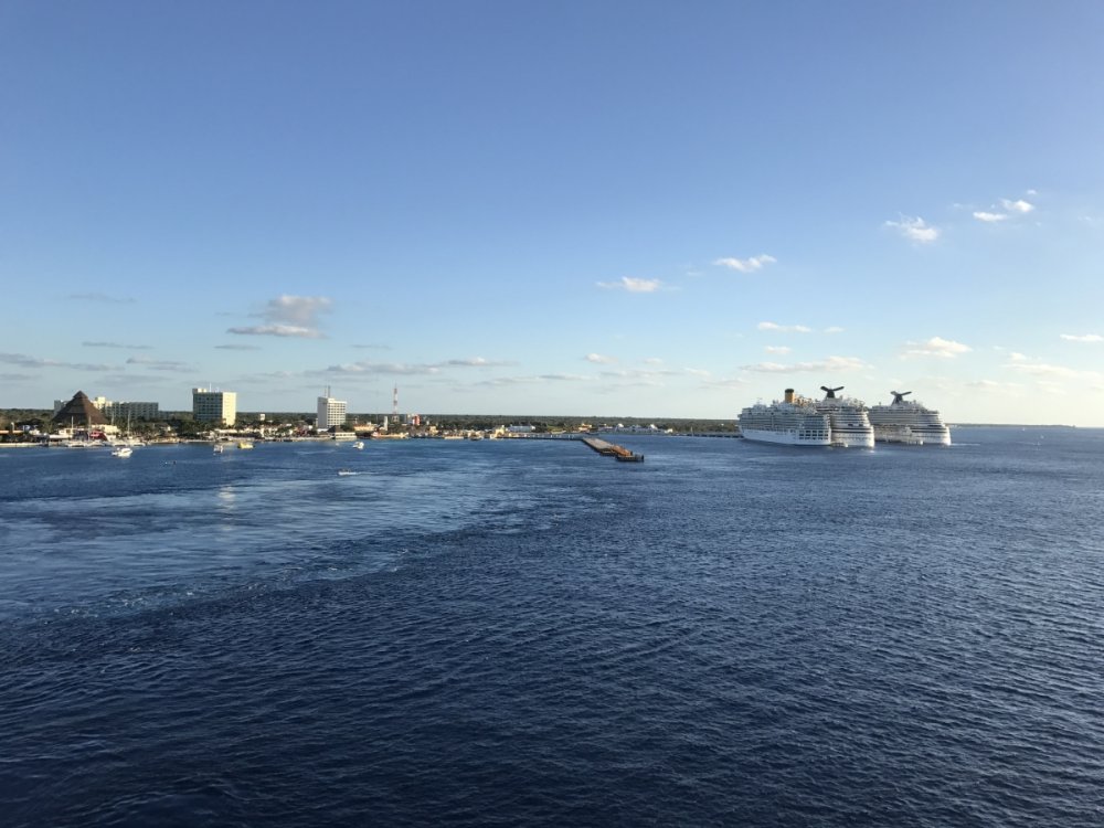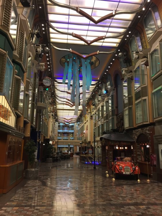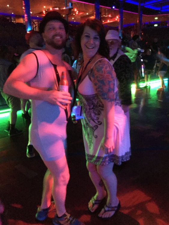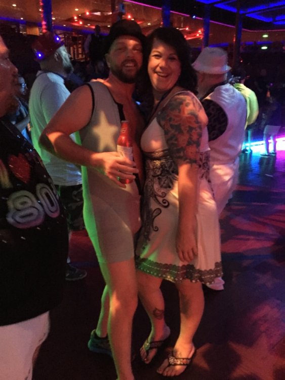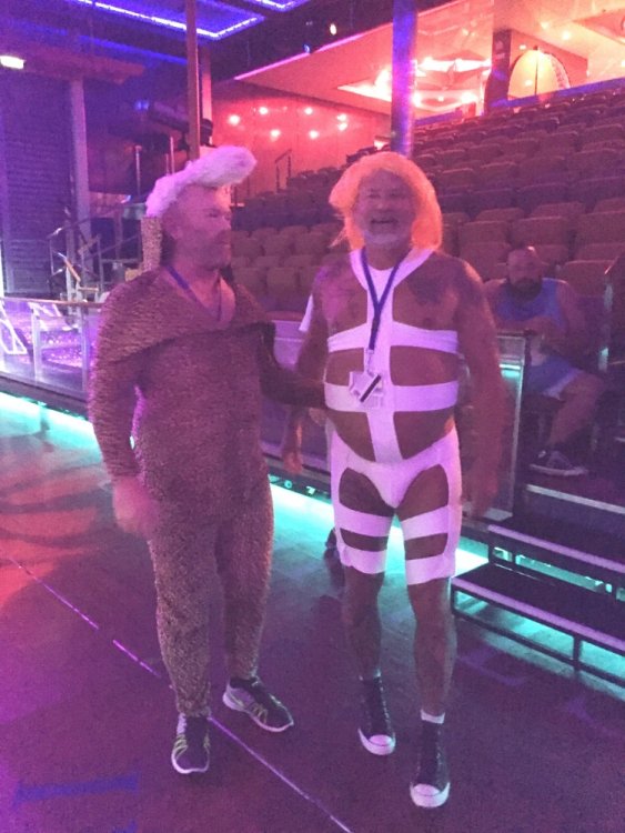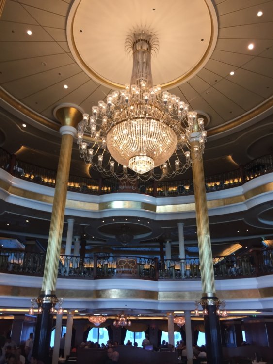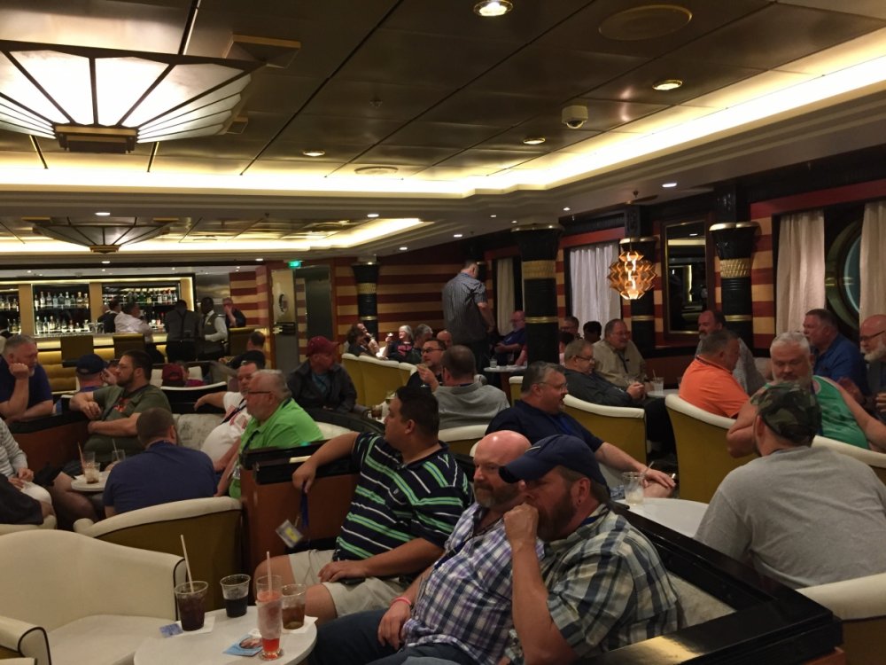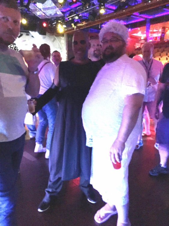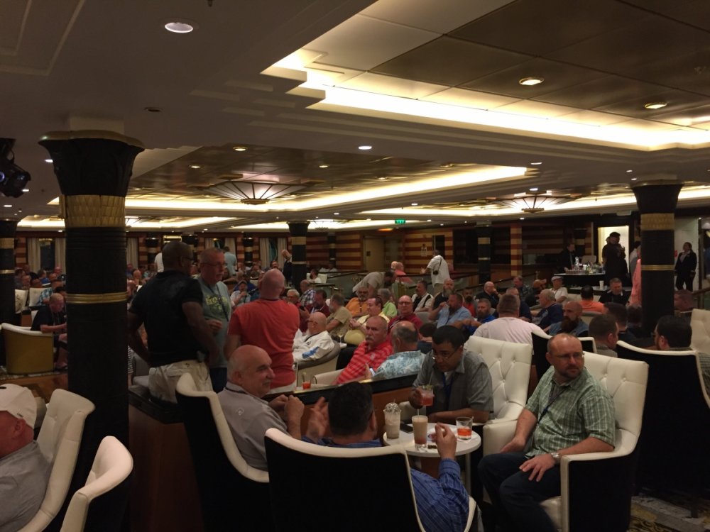 Day 7 (Sea Day) and Day 8 (disembark) On the final day, we both woke up by 9am, despite being able to sleep in. Although there wasn’t much on the agenda today – mainly we had used our OBC to book lunch at Sabor, the Mexican Upcharge restaurant with Anjeanne – we were up, so got out of the room and decided to go to Windjammer (for only the 2nd time for breakfast). We knew we had a big lunch in a few hours, so planned to eat light. That worked out fine, as with the previous breakfast experience at the buffet, the majority of the offerings were pretty disgusting. We ate fairly light, sticking to the pastry and fresh squeezed orange juice – which honestly is SO much better than what is offered for free, RCCL should be embarrassed by what they are serving for “free”. We ended up sitting at a table with some extra seats, and were happy to share with a group of younger (20’s) folks who asked could they sit with us and the table next to us. The younger group was quite entertaining, and we chatted for a while, as they asked us about our lanyards and Arno’s group. They seemed to be enjoying the cruise, but they commented how it looked like our group had been enjoying it more (yep, we had been)! After breakfast, we wandered down to the adult pool to see what was going on, as today was the “singlet ladies’ party, starting at noon. I had brought a leotard that would work as a singlet and had fully expected to participate, but I knew we had Noon lunch reservations, so weren’t gonna be able to do any swimming until after lunch. We still headed down that way, and spent a bit of time visiting with the folks that were out by the pool, before heading down to the Photo area, to purchase the couple of photos (the Hot Tub & the Belieze ones), and to wander the Promenade for a bit for Lattes, and to see if there was *anything* at all we were interested in from the shops, or the last day sales going on. Nope – we didn’t need watches, jewelry, alcohol, or any RCCL clothing. . so we still had quite a bit of OBC left. So we headed over to Schooner bar (across the hall from Sabor) and waited for Anjeanne to meet up with us for our reservations. We were seated pretty quickly, in a nice restaurant with an impressive mural going up one wall and all the way up the ceiling. . but no windows looking out at the ocean at all (odd). They came by with a cart, and made us some fresh guacamole (two versions: spicy for Anjeanne and I and mild for Nick). The Guac was very good. . .and then another cart came by and they made Anjeanne and I fresh Margaritas – mine was a spicy and sweet version. . also very good. We had mentioned to Gerald yesterday that we had reservations at Sabor for lunch, and invited him to join us with the assumption that we were a group of 3, so for sure there would be a 4th seat at the table not being used, so shouldn’t be an issue if he decided to meet us. He did show up, and sure enough, no issue seating him at the table with us. the group ordered a sampling of the Appetizers, and several options of the mains, and I wish I could say the food was ‘good’. . but it wasn’t. Others have had a better experience at Sabor, and I’ve seen raves about it – and yes, as noted the Guac and margaritas were great – but based on what we had? Food ranged from mediocre to terrible. I think Nick Is really the only one who “loved” his dish, he had the Cheese Quesadillas, and my Empanadas were acceptable (not blow me away good, but I finished them). .but Anjeanne ended up sending back her main, Gerald didn’t finish his man, and the sides were uniformly awful – either undercooked (the beans), underseasoned (the rice), or so overcooked that they were inedible (the “fries”, the fish tacos, the flautas, and the house made tortillas that if you didn’t eat immediately turned to concrete). The replacement dish they brought out for Anjeanne (the Red Snapper) was ok, she said, and they also brought out some sort of tacos that were decent but he didn’t’ tell us what they were – we all detected a bit of duck flavor, but when we asked after, were told they were chicken. That was some funky tasting chicken then! the Desert tray was also hit or miss, but the benefit there is that there were a lot of options so even tho some of it was only so-so (the flan, the bread pudding), the good stuff (the churros) counteracted that. Overall, if it hadn’t been the last day anyways? No way in hell would we have gone back there to eat again on the cruise. The saving grace was the company. . we had some wonderful conversations, and ended up hanging around the table talking for a long time among us, and were almost the last folks to leave from the lunch crowd. It was past 2pm by this point, so Nick and I headed up to the pool to check out the scene (with the intention of changing into the singlet and going swimming after). Apparently the Ship had moved far enough out of the Caribbean that the wind had turned a little chilly, and honestly, it was a bit too cold for us to want to swim. We looked and tho there were a few folks braving the singlets, we pussed out and just decided to blow off swimming, and to head back to the Casino for a few hours before the Farewell Meet up/ raffle. We still had over $100 bucks in OBC, so we traded it in at the casino for scratch offs, and we sat at the casino bar and scratched (and “won” a little bit.. something like $30). . . but it ate up a good chunk of time, and we had fun doing it. Not recalling what we did after this, but probably wandered Promenade or Schooners and visited with folks, and then it was time to go meet up for the final gathering. Tonight’s show, was one I wouldn’t have minded seeing, to be honest, “Saturday Night Fever” but the final meet up was at the same time as the earlier show, and the later show was when our dinner reservation was. . and you know by now how I feel about the buffet. . so we blew off this show too (minor comp
