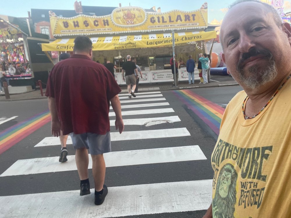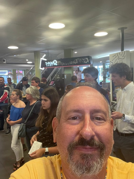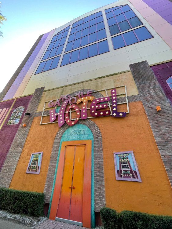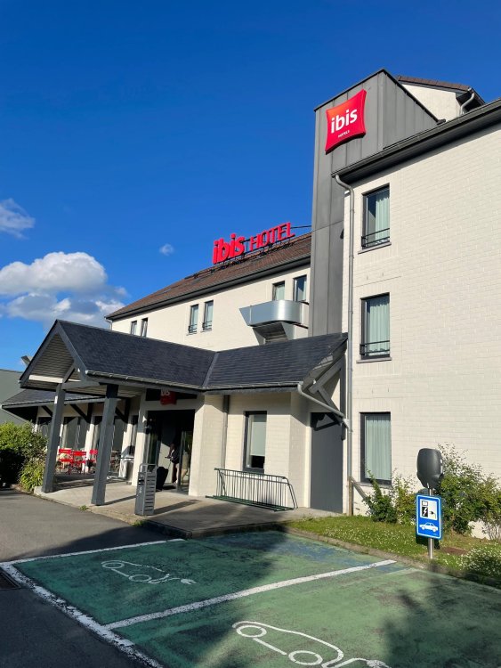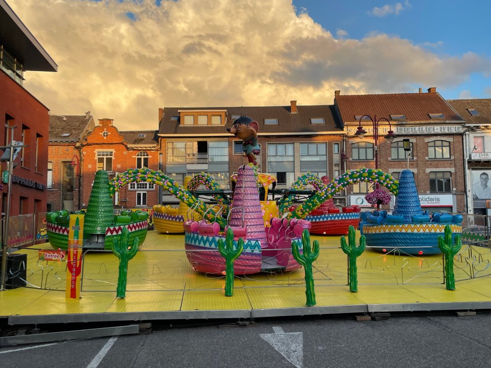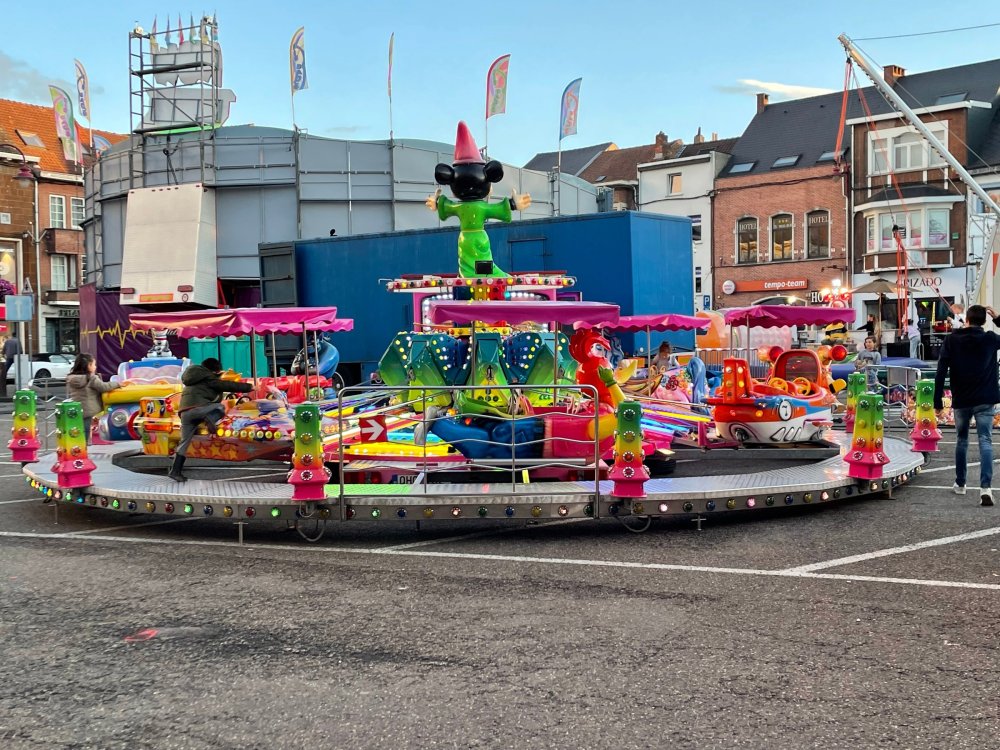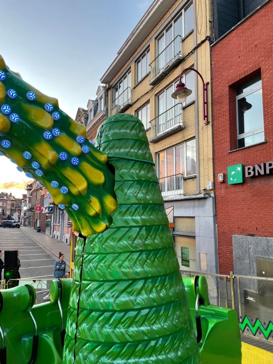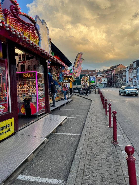 19. Day 7, evening. . . so we loaded up the bus, in the rain, and waved goodbye to Hotel Charles Lindbergh (and Phantasialand), and headed out towards Wavre, Belgium. that would be where our hotel for the night would be - only 1 night, as we were loading up the bus in the morning to spend the whole day at Walibi Belgium. Scenery as we were driving, it's always comforting to see a Nuclear Power plant. . . James and I mostly sat in row 3, so we got a nice view of the road - and this little guy (who's name I can't recall) that Robb purchased at Europa Parc where he's part of the Pirates ride. lovely countryside, as we moved from Germany into Belgium. And the sky had completely cleared up too. as we exited off the main road, into Wavre, the bus made some tight turns down some narrow (and jungle covered) roads towards our hotel for the night. excellent driving by our bus driver another really tight turn - the entrance gate at our hotel seemed REALLY surprised at the size of the bus about to attempt this turn in. but we made it in, and started unloading. our hotel for the night was another Ibis (same brand as the 1st hotel at the airport) with very similar looking rooms. we put our bags up in the room, and made plans to meet some folks down in the lobby. We had left Phantasialand before dinner, but were getting to Wavre by 8pm or so, so many in the group planned on heading out to grab some food and do some exploring in the charming smallish town. while waiting for the group I was going to grab food with, I snapped some pics of the lobby area and the breakfast area of the hotel. the hotel was pretty full - a football (soccer) team, that was passing thru, if I recall - tho we didn't really see any of them tonight. in the morning at breakfast we interacted with them quite a bit tho. Nice guys. and then once we had everyone who wanted to go check out the local fast food place - the Belgium version of McDonalds. . we headed out for the short walk into town. and here it is. . . not sure if it's specific to Beligum, or a European chain. Tho I can't recall if I ever saw another one on the trip, so maybe it *is* Belgium specific? basically a McDonalds: "Quick" for what it's worth? the name LIES. there are no counter folks to take orders. . all orders are placed at the touchscreens by the entrance doors. then you stand and wait until they call your number to go pick up your food from the counter. yeah. .it's *exactly* as much of a clusterfuck as one would think it was. Especially when busy at dinner time (which I guess this time of night was dinner time). it was absolute chaos. . . and, if I'm being honest, I loved every moment of it . . . LOL. . . . Eventually we got our food, and headed upstairs to a "quieter" area to eat. I don't really recall what I got, tho it looks like cheese balls, a poutine of some kind, and a burger that looked like this. it was ok, I suppose. But really no lasting memory of it, so i guess it was just a standard burger from a fast food place? we had planned to walk over to the Supermarket in the parking lot there and get some bottled water, but by the time we finished eating, the market had just closed for the evening. (I think they closed at 9 perhaps?). . . but as we slowly made our way back towards the hotel, someone in the group that had gone towards the city center (in search of nightlife/bars I believe) had posted to the TPR trip group chat that they had stumbled across a random Breakdance in the downtown area. even tho we had just spent a full day at Phantasialand. . . c'mon, I'm on a trip with TPR folks. . of COURSE we immediately detoured towards the center of town to see if we could find said breakdance. I double-taked on this sign at least 3 times, before I decided I just had to take a picture. "Immotheker finotheker". . . .has made it into my cursing lexicon we had passed a parking lot full of what looked like "Carny" vehicles. . and we started to hear music, so we continued heading that way, and finally came across this. (insert angelic singing here) wasn't super busy - but again, it was a Monday night, but it appeared an entire funfair had been plopped down over two city blocks in the center of Wavre. we weren't gonna cross illegally - gotta follow traffic rules in other Countries - so we headed down to the crosswalk. only to be pleasantly surprised that they were Rainbow Crosswalks. yay! Belgian Pride! while most of the games and rides, seemed targeted towards the way younger crowd. . there were a few "big" rides mixed in. (the stuff on the next street over seemed to be mostly closed this night tho, including a small kiddie coaster. . so we stuck to this main intersection for our exploring) Kiddie Bumper Cars - and no, I still didn't ride them. I was mesmerized by the floating kid's heads on the sign for this one (but I believe everything is independently owned, so it must be the owner's kids?). certainly didn't attract me to the place to purchase anything - tho I was full as I had just eaten a lot of fast food. that spotted donut doesn't look too happy tho! a funfair street cart selling Escargot? how intriguing (and a big ol HELL NO from me). . . but Smisty wanted to try them, so she and Erik got some. and to be fair? they SMELLED amazing. . . but . . . nope for me. the guys at the funfair (James, Erik, Andrew and me), waiting for Smisty to finish her snails some pics of the games. . lots and lots of stuffed animals to (attempt) to win. tho some booths had lots of typical American carnival crap on offer (this Duck Game) seemed to offer prizes as one would find at a ticket redemption counter in a Dave & Busters, or Pinballz arcade oooo. . very tempted. A Frozen Mirror Maze! . . I'm sure 100% officially licensed Disneyland Belgium! If I didn't think my fat ass would break it? I would have ridden on Aladdin's carpet. (tho the Woody Woodpecker confused me. maybe Donald broke and they needed a quick replacement?) it really is a Small World after all. ohhh. . . a big