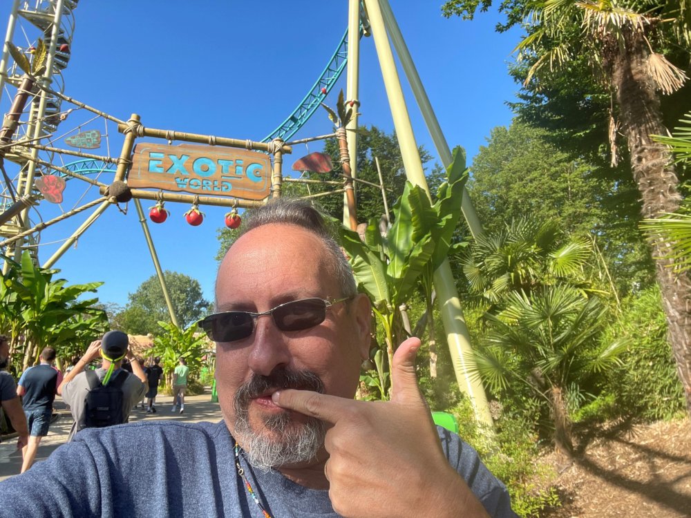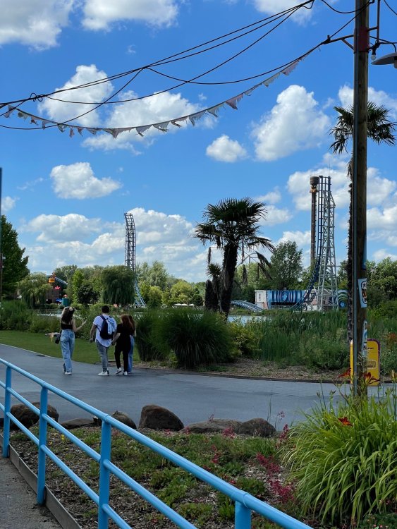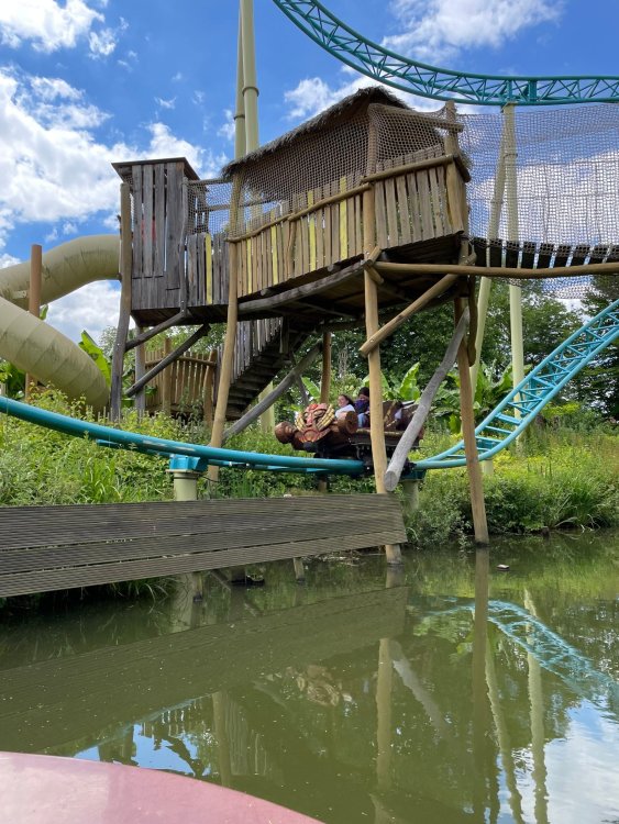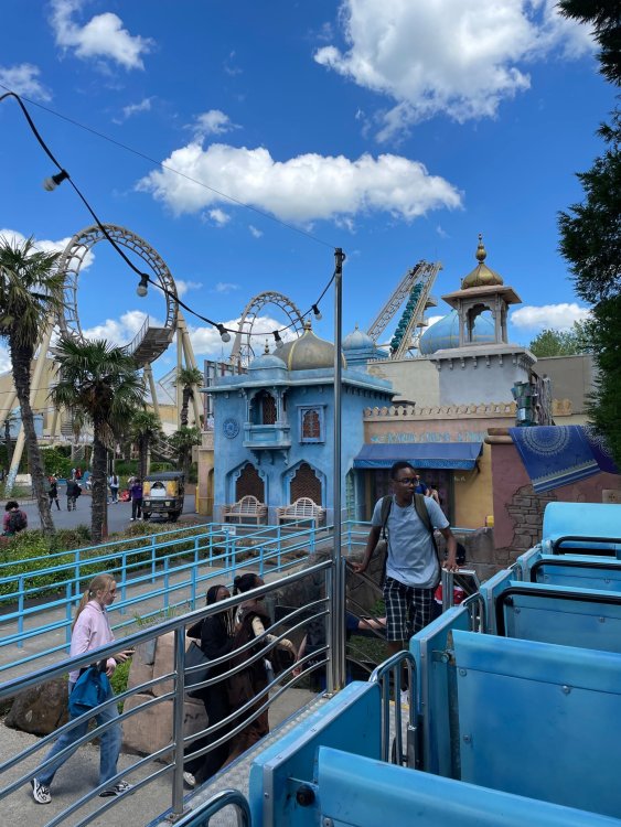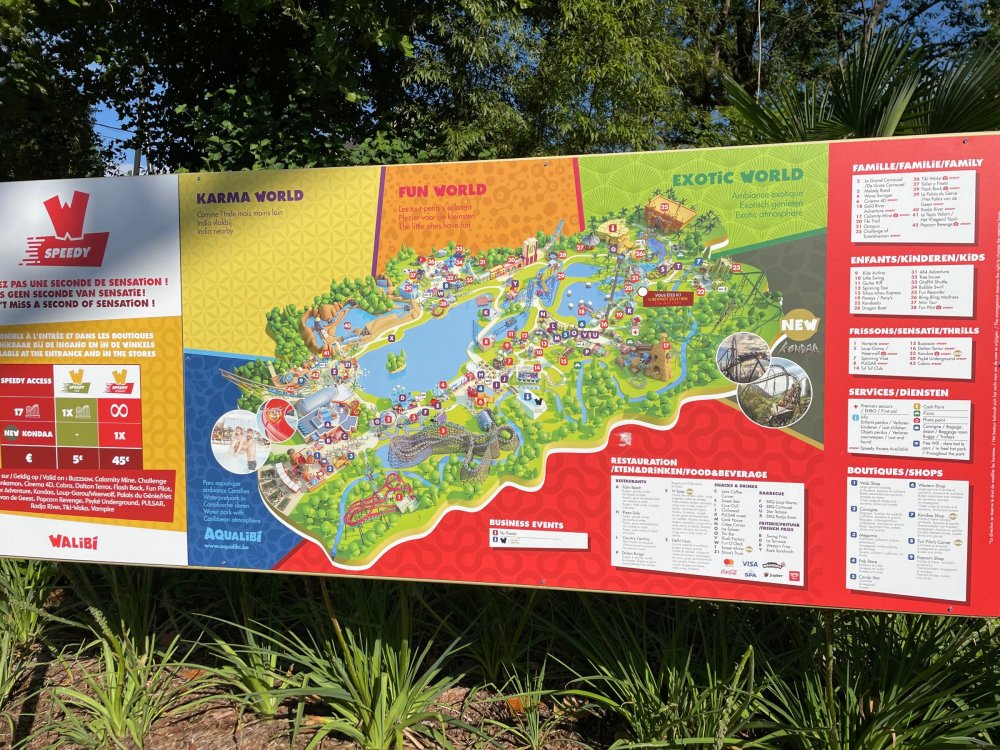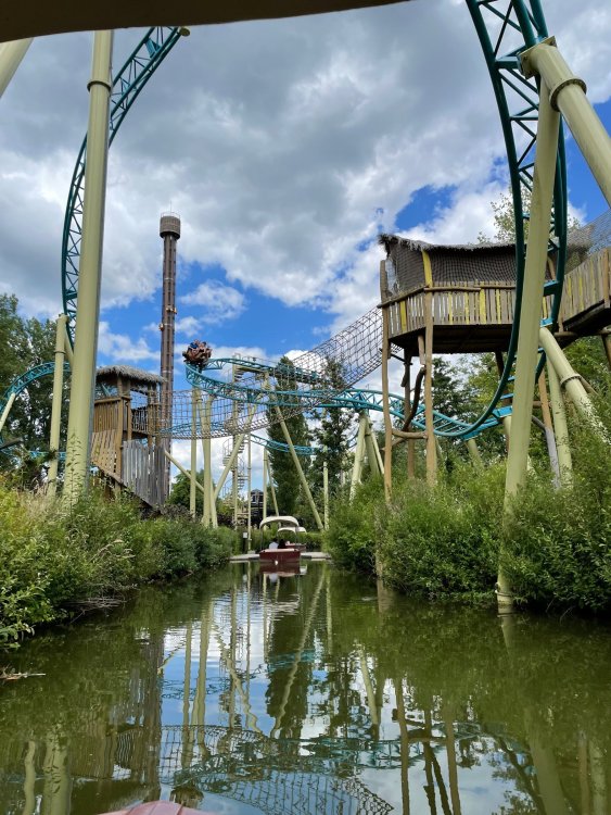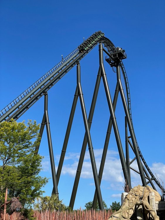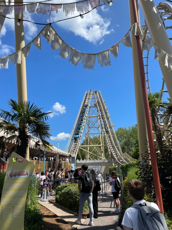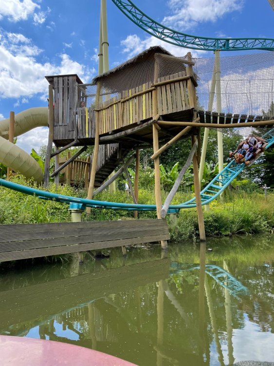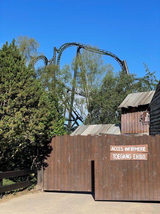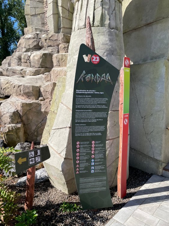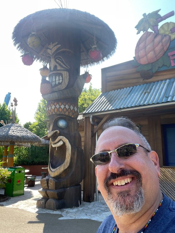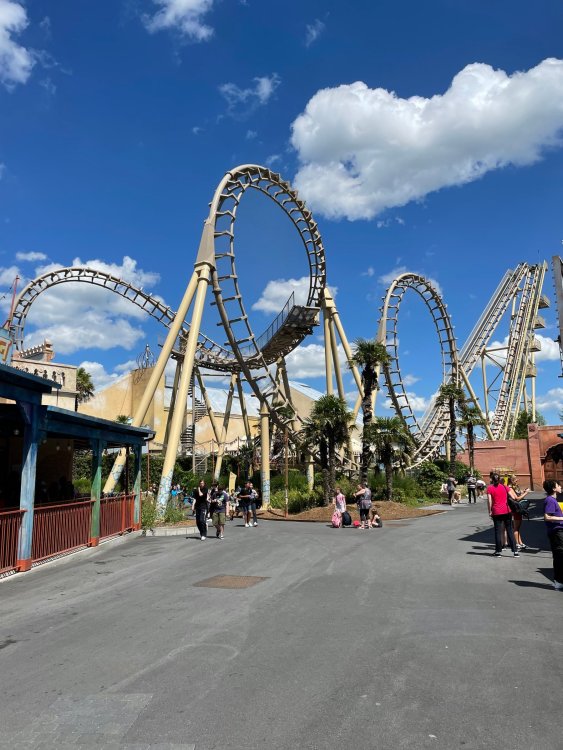 4. apologies for the weeks long break here. . . I know why I've been procrastinating in continuing on, but after talking thru it with my therapist, I'm ready to keep going now. Doesn't mean I'm not going to be sad, but there's lots more to see, ride, and share. . so continuing on. Day 8: Walibi Belgium, Part 1: we got up at the hotel, ate breakfast and checked out by 8:15. after loading the bus, we drove to nearby Walibi Belgium. we had stuff to do before park open: ERT on two coasters, and 1st rides of the day on their new Intamin, Kondaa. pulling into a mostly deserted parking lot. . tho it was a Tuesday, there were already buses in the parking lot, and it seemed it was a school holiday of some sort. very glad to be on this trip with TPR, because the extras - such as the skip the line passes. . it was certainly gonna help with what looked to be a busy day. not too crowded walking up - but it was still over an hour before park open. headed into the park, we see where we were going first: Loup-Garou, a kinda infamous Vekoma wooden coaster. Several of us had been talking and we reasoned that Anaconda at Walygator was vastly improved from what we had expected. . so perhaps it would be similar on this one? I was excited to see it regardless, as I love woodies (that's what he said!). . . but was prepared for 1 and done. I mean, it certainly wasn't warmed up 1st thing in the morning, so hoped for the best, but expected the worst. Still got excited to see it peeking up over the entrance plaza buildings tho. not as excited as I was to see the Park's Carousel front and center at the end of the entrance plaza tho, on the way to the coaster entrance i'd be back for you later! the coaster started testing as we approached it. apparently "Lupe Garou" means Warewolf in French . . so it had that "theming". . . in name and signage only, but hey, theming! it sure LOOKED pretty. . . .I felt my hopes slightly raise. Two hair-wolves (or are we both just Bears.. . Andrew???) ready to ride! they were running two trains during our ERT. . Green & Red. i really liked this train design. it was comfortable. . and you know what? it was a lot of fun, and other than one *really* funky transition that will realign your spine if you don't know it's coming and brace for it - which for some oddball reason is JUST before the photo snap (so everyone in the photos would be making a pained face. . LOL) - it was actually quite good. after the 1st ride, I knew when/where to brace, and I loved it. I think I rode it every cycle available during our ERT on it, which if I recall correctly was 1/2 hour, so I got 6 rides on it. (Pics courtesy of Elissa I think) I think most people on the trip liked it, and many of us kept riding until it was time to head to another coaster. walking from Loup Garou to our next stop - across the park - I snapped a few pics while walking (as usual). here's one of the spikes on Pulsar - one of only 4 Mack Powersplash operating in the world - at least until Aquaman at SFOT finally opens in 2023 ooo..a Top Spin? after Talocan the prior day, I was eager to try a "tamer" version. . so would come back for this later too. an Intamin drop tower, similar to Dungon Drop/Superman (Astroworld/SFStL) - which is now gone. . so wanted to ride this too. . . THRU THE TREES!!!. . that's Kondaa. . . wow, that looks amazing, but we weren't headed here yet. giant fries.. because. . . why not. Tho they didn't' entice me to want to eat any of them. we continued on into "Exotic World". . .. oooooooo kinky! down that way is Kondaa (angels singing). . . but not yet. Park Map THIS is where we were headed next for some quick ERT on the park's Gerstlauer Bobsled, Tiki-Waka really nice theming over here in "Exotic World" section of the park. and the Coaster itself really dominates this area, going around, and over, the walkways, and even interacting with the boat/river-raft ride next door. my turn! and pay attention, no voguing or dancing on this ride! Whee! as mentioned, it interacts with the river ride next to it.. really nice setting. after we all got a few rides on Tiki-Waka, it was time to head to the main event, as the park was opening up to the public. so we followed our Park Guide and Robb, over to the park's latest star attraction Kondaa if you've seen folks online complaining about the lack of theming around this Intamin coaster? yeah, they just haven't been on it. True, there's not a whole lot around the track (but really, what can you do to "theme" around a large, spread out Intamin coaster?). However the entrance plaza and surrounding area for the ride is beautifully done. I liked it so much, I bought yet another "ride" T-shirt - this time with the Kondaa dragon/logo on the front. the train design is so cool as well.. it's a dragon! yes, I waited to ride front row very "Aztek" looking stone design on the train. . . one of the better train designs I've seen. after we all got our opening of the day rides on Kondaa, we got our flash pass/skip the line bands, and then split off to enjoy the park for the day. a group of us - mostly the same folks I had hung out with at Phantasialand - headed to the 1st of the parks two EXCELLENT shooting dark rides. Challenge of Tutankhamon: full of pretty amazing animatronics, fire, and interactive targets. .this ride really is incredible. and the "guns" you shoot with are Ankhs: I think Andrew was shooting at a target and not me. . but who knows. . LOL oh, see that car in front of us? they are going to a "secret" bonus room. . that if the points in the car add up to high enough, you get an extra room with more fire effects and another scene! Oh yes, we immediately rode it again and really aimed, to make sure we got high enough points to do both versions. a photo op? Don't mind if I do. the park really was already starting to get busy, and we passed a LOT of people rushing past us towards the back of the park (where we were coming from Kondaa) and ignoring some of the flats. so when we pas