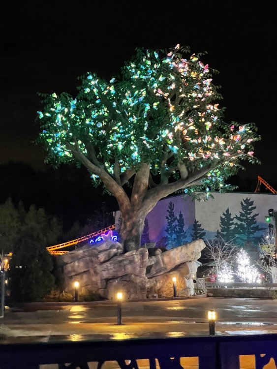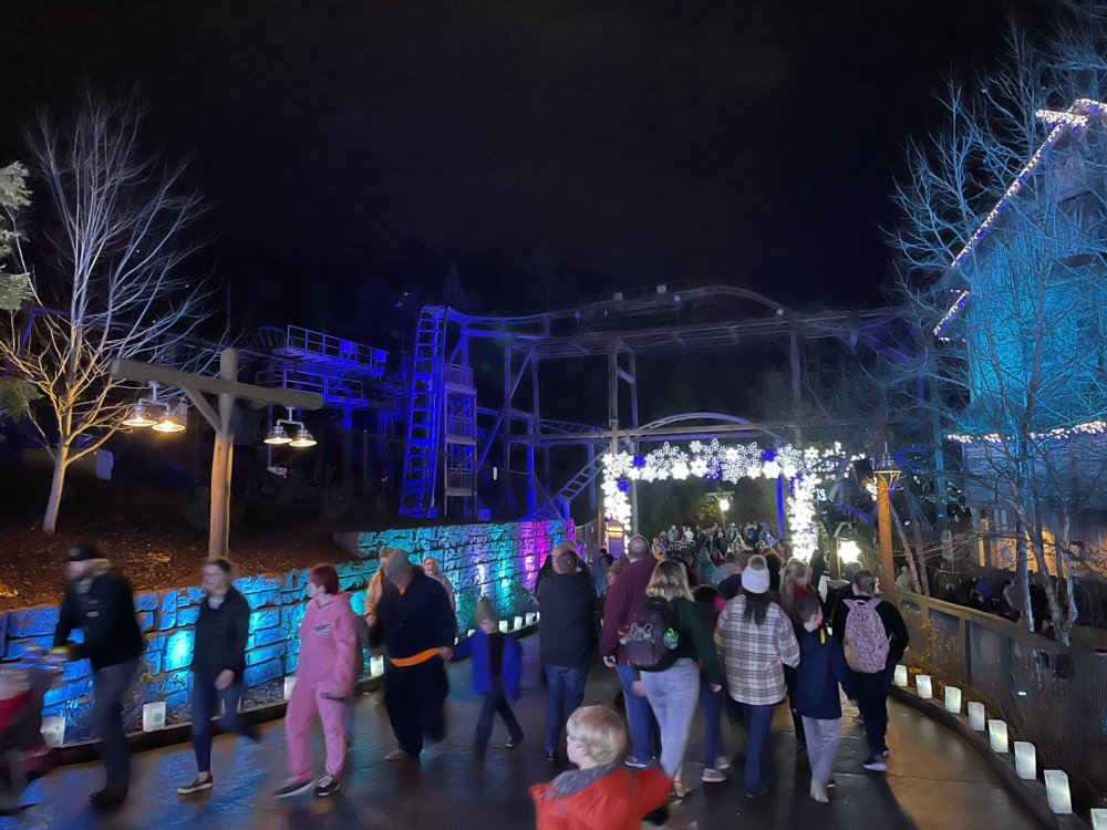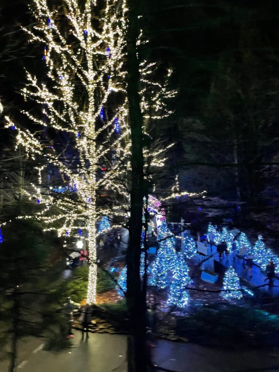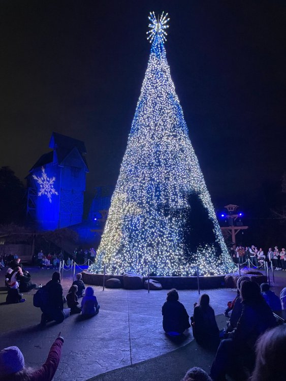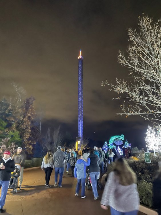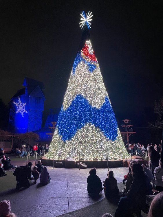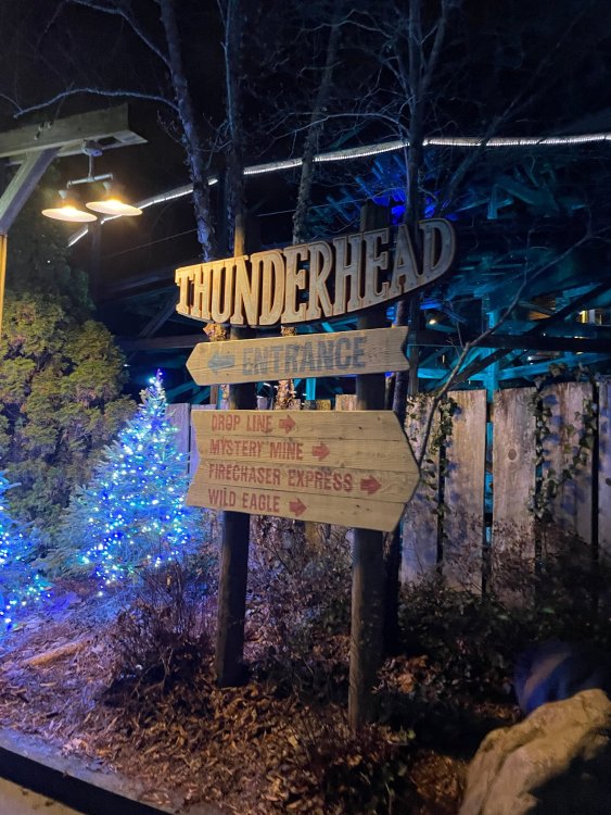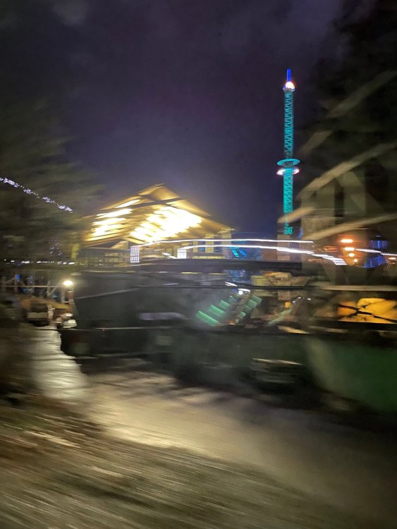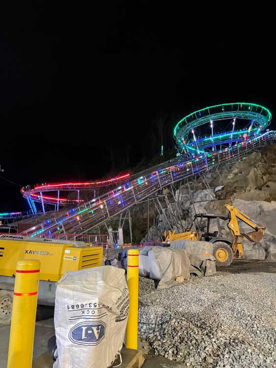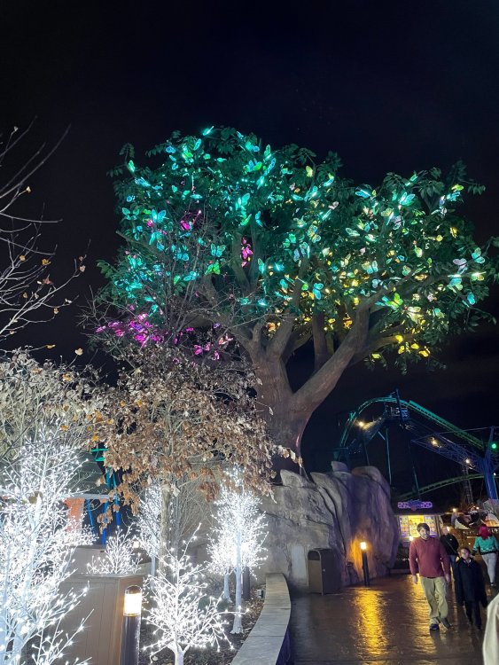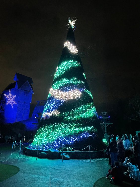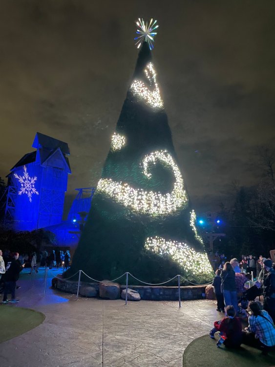 8. Part 2 - evening on Saturday, 12/3/22 as mentioned above, it got dark really quickly. . and by the time we had finished with the Teacups and the *hot* Hot Chocolate incident, and came back up to try and catch the train that was leaving in 20 minutes, it already looked like this. just gorgeous over here. by the way..the train depot is on the left out of picture range. . and this picture is taken from where we ended up in the line for the NEXT train, that was scheduled for 45 minutes from now! as noted, we debated, and decided just to stay in line, as the train was a must do, and we were here already. So just enjoyed the lights, and sipped our drinks. the folks that joined the line BEHIND us shortly after. . and partially why we decided to just stay in the line. yeah. . the train during the Holidays is popular (you'll see why in a moment) after about 20 minutes, the line in the walkways was funnelled into the train depot - well, some of it was, there was still quite a few folks who didn't make it into the depot and would have to wait for the next train. Luckily, we made it in and moved towards the front of the station - which they packed solid with folks, telling everyone "if you're in the Depot, you SHOULD get on" it was a lot of people, but they were packing them in the train rows like sardines, so we felt pretty confident in getting on. and success! here's the group I was with: back row: Amy and Scott our row: Me, Londyn, Jamie, Joseph, Xander and now. . . a handful of blurry pics from a moving train. (apologies for the blurry pics, but thought some might wanna see them, so included some of those that were blurred from the moving train) the new coaster. . . big portions of it built up already. and looks like almost all the track is on site and stacked up ready so if you've never taken the Dollywood train (and most of us had not) - it actually goes outside the park, and up the mountain! resulting in some fantastic views of the park. . . but what really makes this a must do during the Holidays? up in the mountain, there's a big "turn around" (the train uses the same tracks going up and down the mountain) that circles a large field. during the Holidays? Dollywood covers the field with *millions* of LED lights that play in patterns and colors. oh, and the train plays Christmas Carols by Dolly, and her telling stories over the speakers while the train is going. anyways. .here's some looks at the field of lights: and then you turn around and head back down the mountain, so the other side of the train gets some great views. again, that's the new coaster on the far right (orange track) coming back into the station, we were greeted upon disembarking by an acapella show. the "Mistletones". . . hokey name, but dang, they were good. So we stood and listened for a bit. then we headed towards the section of the park we hadn't been to yet - and had seen from the train - the area with the tree/Mystery Mine/Thunderhead, and wildwood grove. to get there tho, we had to pass Blazing Fury first - which looked lovely at night. Londyn wanted to "mine for crystals" - so they stopped there to do that while myself and the guys headed towards the tree. Scott hadn't been on Blazing Fury yet. . .so we stopped and took a ride. what's interesting. . is literally 30 seconds after I snapped this pic? the whole ride went dark - all lights on it out, and folks streamed out of the queue building. so we barely missed getting trapped and evacced from Blazing Fury (which would have been cool. . but there was only so much time left in the day, and way too much we still wanted to do, so I'm glad we weren't on it when the power went down) strangely the power outage only affected Blazing Fury. . the giant (and absolutely beautiful) area of icicle lights next to it that led up to Tennesse Tornado and Firechaser remained lit up. beautiful. . and color changing. . . looking back towards Blazing Fury eventually, we all met up at the Dollywood Christmas Tree. and to say I was impressed is an understatement. it was beautiful, but I didn't realize that the LED lights on it were going to tell a story. . and the whole tree is color changing! the speakers in the area came on, the crowd gathered, and the tree told us a story thru images and words. and there was quite the subtext in the story too. . . supposedly it was about a Polar Bear and a Brown Bear who are "friends" and the Polar Bear travels from the North Pole to spend Christmas with the Brown Bear. . . where they sled together, wrap presents together, and hold hands. yeah. . . LOL... never thought I'd see a gay interracial relationship celebrated at Dollywood (hey, that's how *I* took it) awww. . reaching out to hold hands and then, once they touch hands? yeah. . it started "snowing". . . . Dr. Frued ? analysis please? LOL but, it was so neat, really. recommended viewing. this is Scott's WTF is this face when the snow started "erupting" . . . LOL I have this as my desktop at the moment. perhaps my favorite pic I took on the trip: once the tree show was done, Joseph and I headed over to Mystery Mine, to grab a ride since it was close to walk on. I braced myself for the roughness, even tho I had heard that they had done some major track work on it (and in fact, the old U-shaped banked turn is still there! the new track just bypasses it). but at the end of the day it's a Gerstlauer, so I was prepared to hate it. . but was gonna ride regardless as all the coasters here were new to me. and you know what? it wasn't bad! yes, this park has a decent Arrow, a very good Vekoma (Dragonflier) AND a decent Gerstlauer. it was a Christmas miracle! (and it looks pretty amazing at night) after our ride, we all made our way down to Wildwood Grove to meet up with Amy and family who had continued walking while we stopped to ride. very overcast, but loved how the lights reflected off the clouds. big fences up for the new coaster. . lots of dirt and construction over here, where the station is gonna 