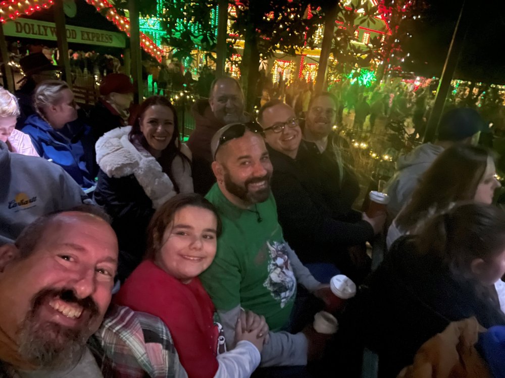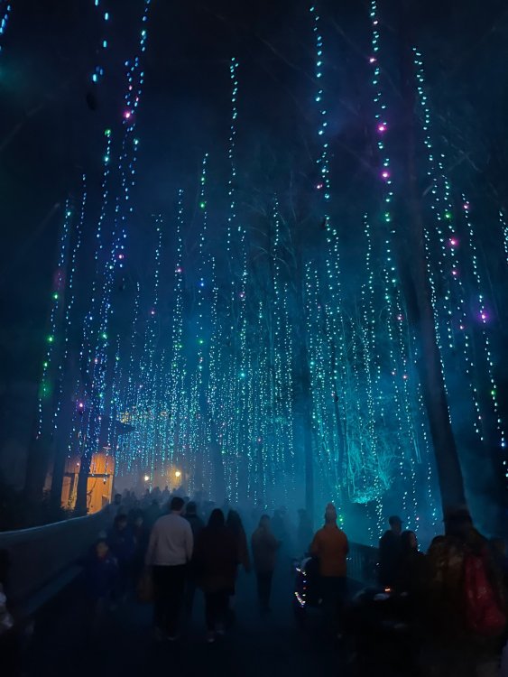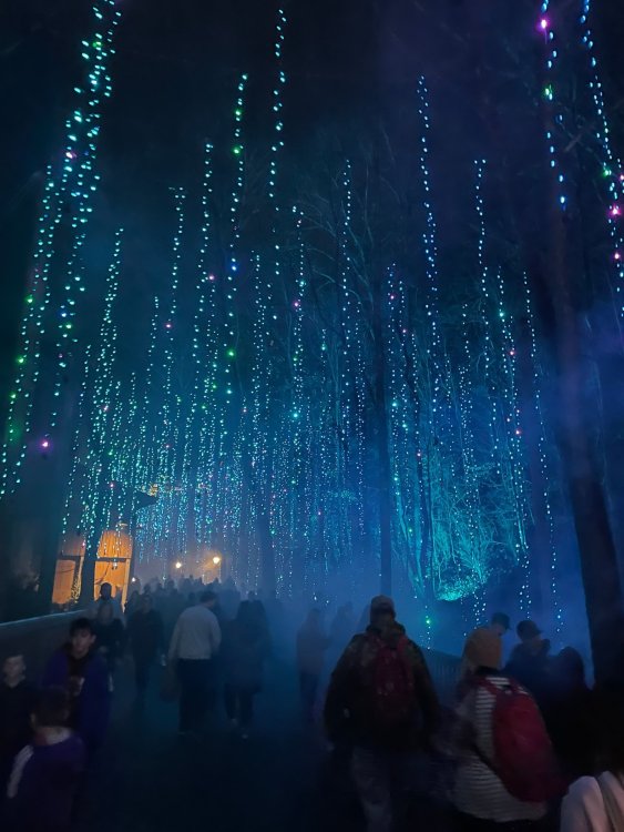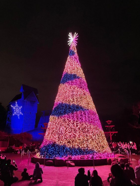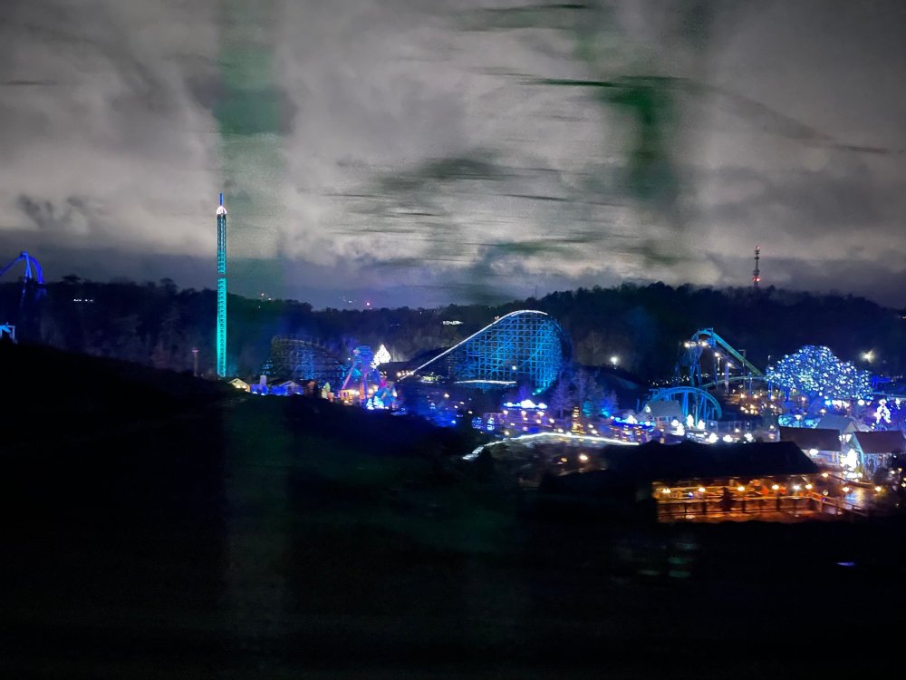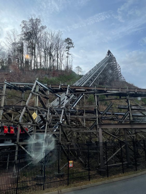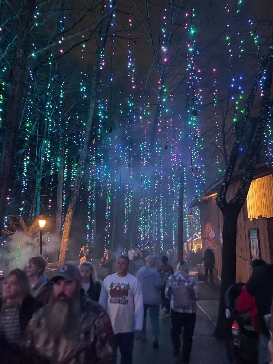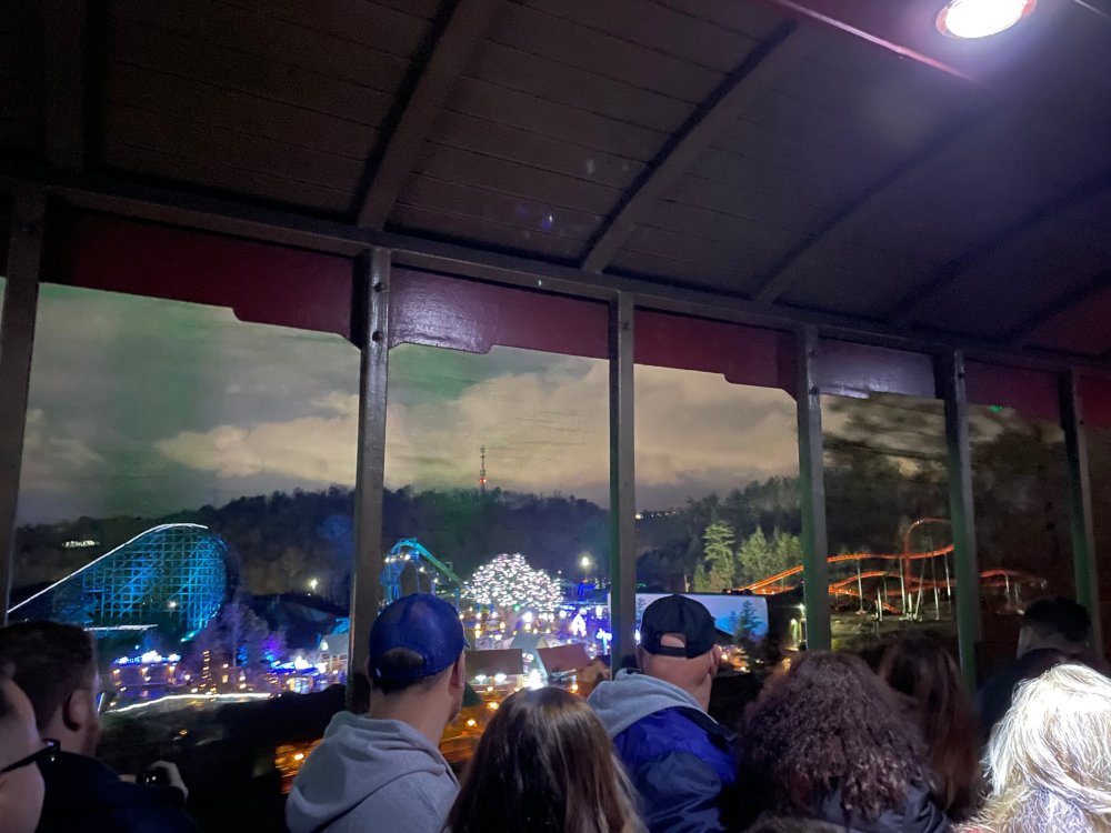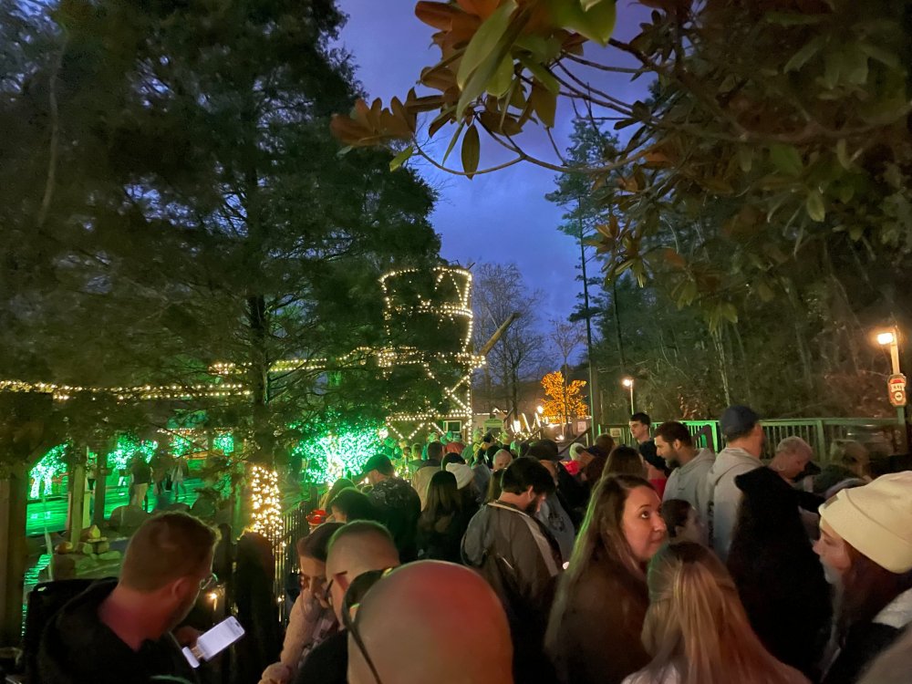 8. Part 2 - evening on Saturday, 12/3/22 as mentioned above, it got dark really quickly. . and by the time we had finished with the Teacups and the *hot* Hot Chocolate incident, and came back up to try and catch the train that was leaving in 20 minutes, it already looked like this. just gorgeous over here. by the way..the train depot is on the left out of picture range. . and this picture is taken from where we ended up in the line for the NEXT train, that was scheduled for 45 minutes from now! as noted, we debated, and decided just to stay in line, as the train was a must do, and we were here already. So just enjoyed the lights, and sipped our drinks. the folks that joined the line BEHIND us shortly after. . and partially why we decided to just stay in the line. yeah. . the train during the Holidays is popular (you'll see why in a moment) after about 20 minutes, the line in the walkways was funnelled into the train depot - well, some of it was, there was still quite a few folks who didn't make it into the depot and would have to wait for the next train. Luckily, we made it in and moved towards the front of the station - which they packed solid with folks, telling everyone "if you're in the Depot, you SHOULD get on" it was a lot of people, but they were packing them in the train rows like sardines, so we felt pretty confident in getting on. and success! here's the group I was with: back row: Amy and Scott our row: Me, Londyn, Jamie, Joseph, Xander and now. . . a handful of blurry pics from a moving train. (apologies for the blurry pics, but thought some might wanna see them, so included some of those that were blurred from the moving train) the new coaster. . . big portions of it built up already. and looks like almost all the track is on site and stacked up ready so if you've never taken the Dollywood train (and most of us had not) - it actually goes outside the park, and up the mountain! resulting in some fantastic views of the park. . . but what really makes this a must do during the Holidays? up in the mountain, there's a big "turn around" (the train uses the same tracks going up and down the mountain) that circles a large field. during the Holidays? Dollywood covers the field with *millions* of LED lights that play in patterns and colors. oh, and the train plays Christmas Carols by Dolly, and her telling stories over the speakers while the train is going. anyways. .here's some looks at the field of lights: and then you turn around and head back down the mountain, so the other side of the train gets some great views. again, that's the new coaster on the far right (orange track) coming back into the station, we were greeted upon disembarking by an acapella show. the "Mistletones". . . hokey name, but dang, they were good. So we stood and listened for a bit. then we headed towards the section of the park we hadn't been to yet - and had seen from the train - the area with the tree/Mystery Mine/Thunderhead, and wildwood grove. to get there tho, we had to pass Blazing Fury first - which looked lovely at night. Londyn wanted to "mine for crystals" - so they stopped there to do that while myself and the guys headed towards the tree. Scott hadn't been on Blazing Fury yet. . .so we stopped and took a ride. what's interesting. . is literally 30 seconds after I snapped this pic? the whole ride went dark - all lights on it out, and folks streamed out of the queue building. so we barely missed getting trapped and evacced from Blazing Fury (which would have been cool. . but there was only so much time left in the day, and way too much we still wanted to do, so I'm glad we weren't on it when the power went down) strangely the power outage only affected Blazing Fury. . the giant (and absolutely beautiful) area of icicle lights next to it that led up to Tennesse Tornado and Firechaser remained lit up. beautiful. . and color changing. . . looking back towards Blazing Fury eventually, we all met up at the Dollywood Christmas Tree. and to say I was impressed is an understatement. it was beautiful, but I didn't realize that the LED lights on it were going to tell a story. . and the whole tree is color changing! the speakers in the area came on, the crowd gathered, and the tree told us a story thru images and words. and there was quite the subtext in the story too. . . supposedly it was about a Polar Bear and a Brown Bear who are "friends" and the Polar Bear travels from the North Pole to spend Christmas with the Brown Bear. . . where they sled together, wrap presents together, and hold hands. yeah. . . LOL... never thought I'd see a gay interracial relationship celebrated at Dollywood (hey, that's how *I* took it) awww. . reaching out to hold hands and then, once they touch hands? yeah. . it started "snowing". . . . Dr. Frued ? analysis please? LOL but, it was so neat, really. recommended viewing. this is Scott's WTF is this face when the snow started "erupting" . . . LOL I have this as my desktop at the moment. perhaps my favorite pic I took on the trip: once the tree show was done, Joseph and I headed over to Mystery Mine, to grab a ride since it was close to walk on. I braced myself for the roughness, even tho I had heard that they had done some major track work on it (and in fact, the old U-shaped banked turn is still there! the new track just bypasses it). but at the end of the day it's a Gerstlauer, so I was prepared to hate it. . but was gonna ride regardless as all the coasters here were new to me. and you know what? it wasn't bad! yes, this park has a decent Arrow, a very good Vekoma (Dragonflier) AND a decent Gerstlauer. it was a Christmas miracle! (and it looks pretty amazing at night) after our ride, we all made our way down to Wildwood Grove to meet up with Amy and family who had continued walking while we stopped to ride. very overcast, but loved how the lights reflected off the clouds. big fences up for the new coaster. . lots of dirt and construction over here, where the station is gonna 