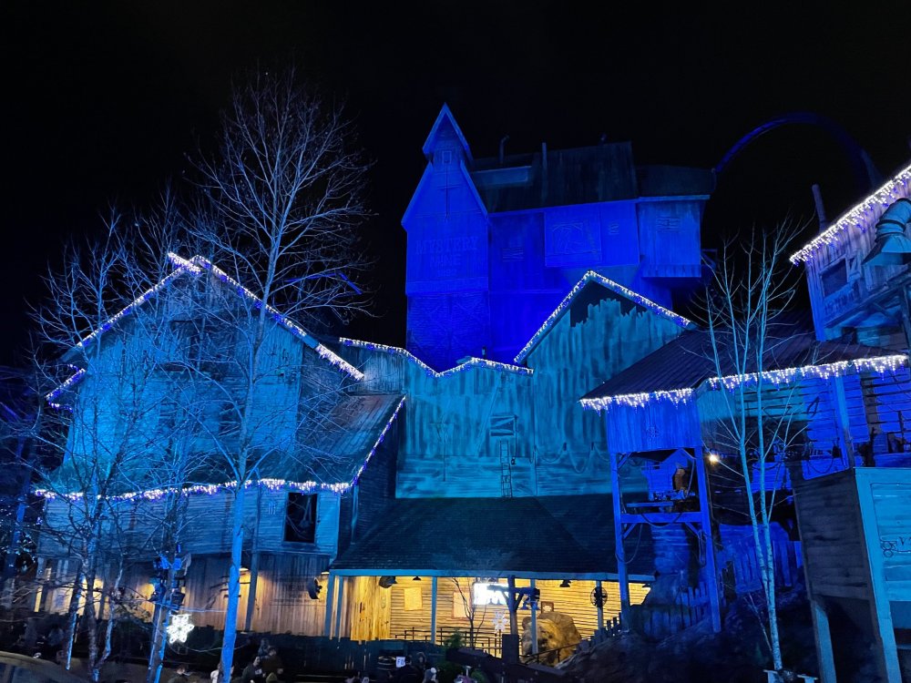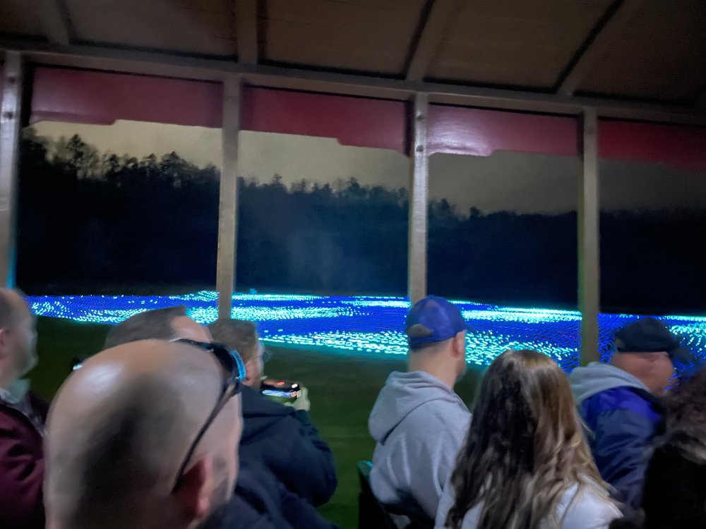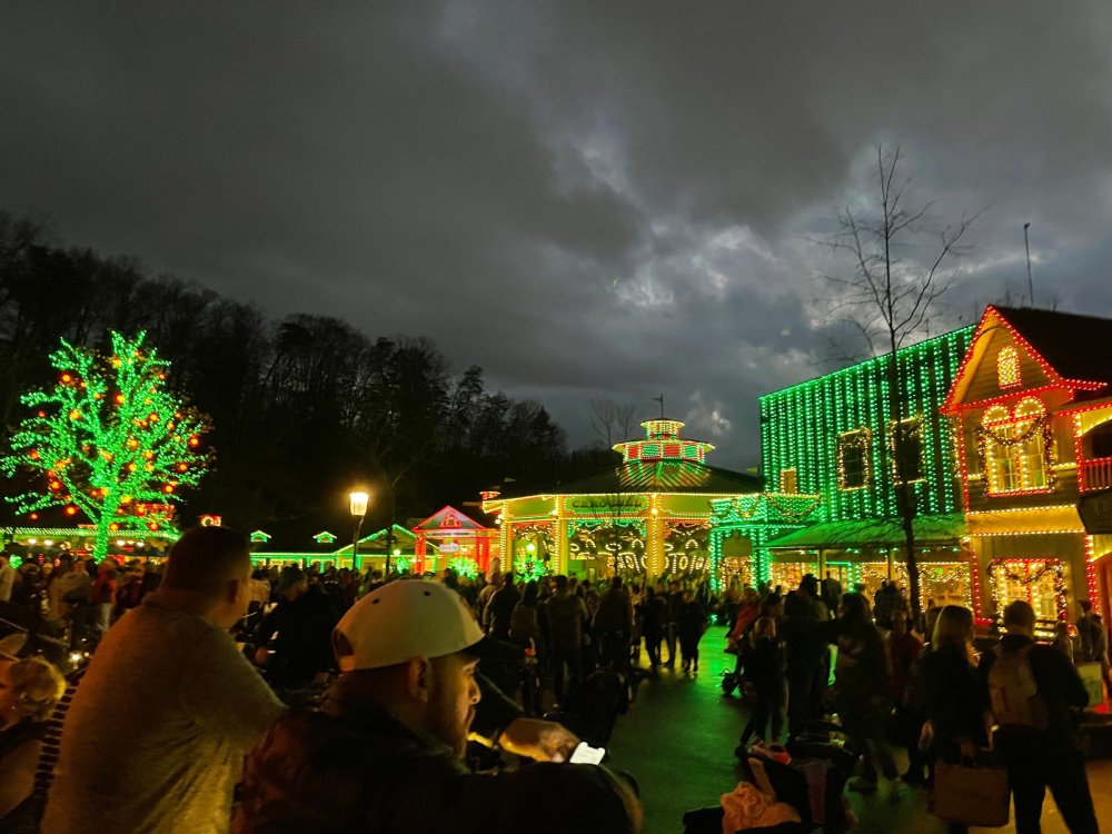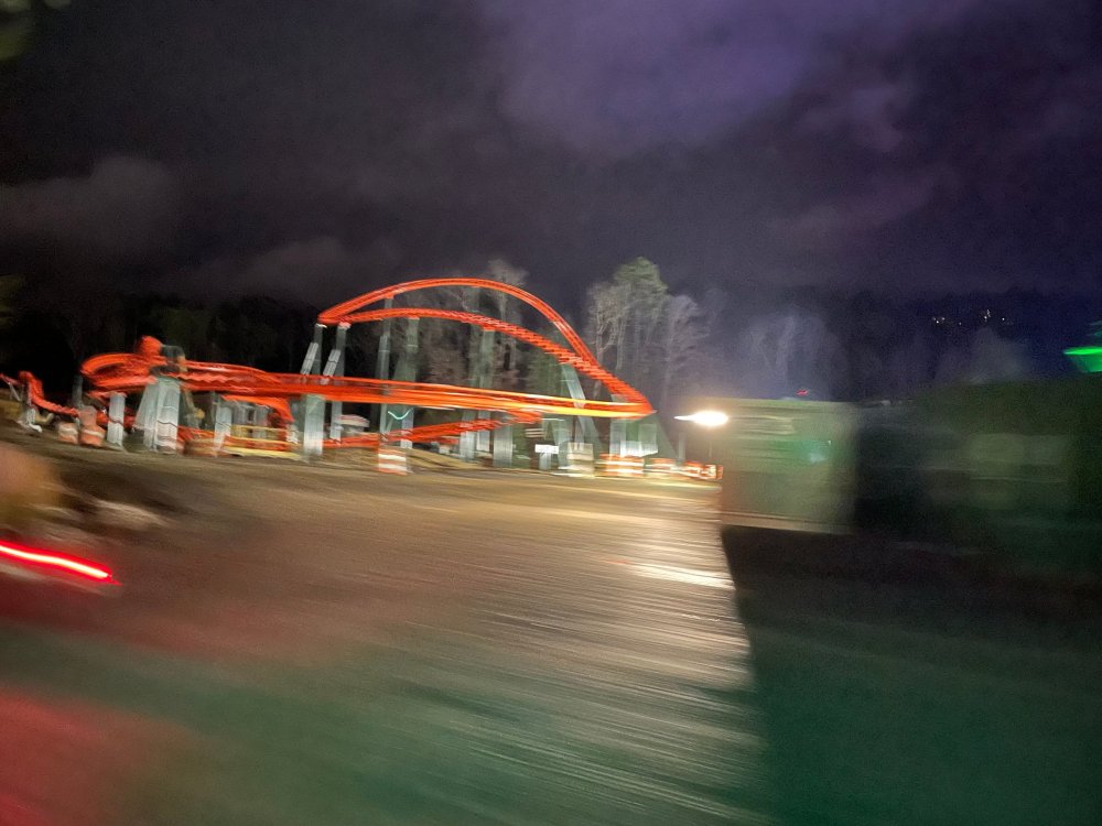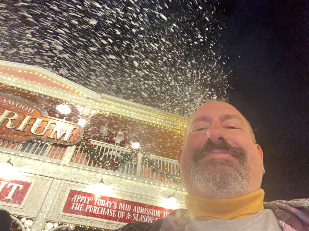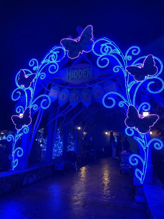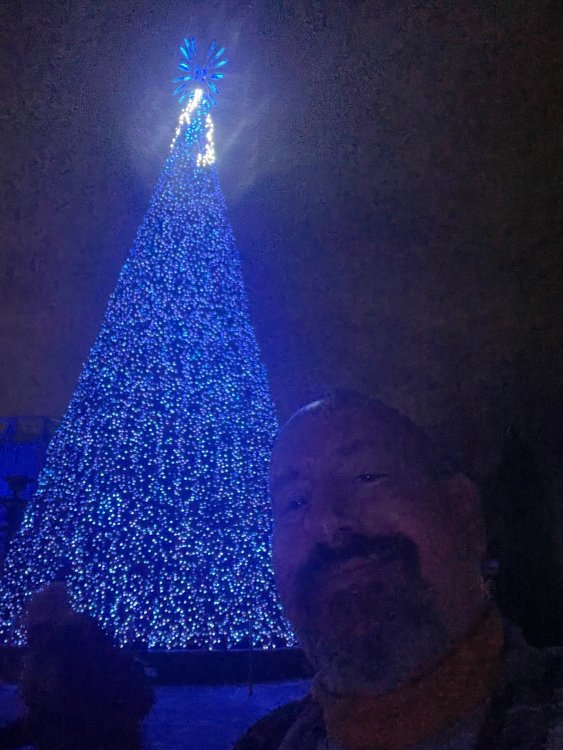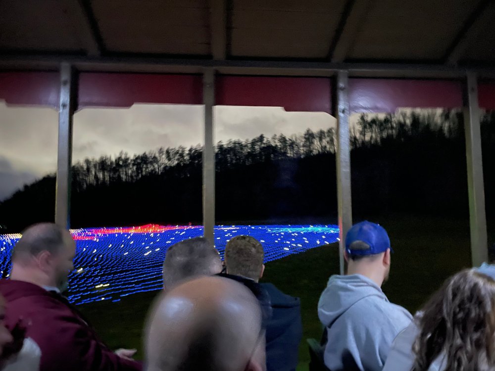 8. Part 2 - evening on Saturday, 12/3/22 as mentioned above, it got dark really quickly. . and by the time we had finished with the Teacups and the *hot* Hot Chocolate incident, and came back up to try and catch the train that was leaving in 20 minutes, it already looked like this. just gorgeous over here. by the way..the train depot is on the left out of picture range. . and this picture is taken from where we ended up in the line for the NEXT train, that was scheduled for 45 minutes from now! as noted, we debated, and decided just to stay in line, as the train was a must do, and we were here already. So just enjoyed the lights, and sipped our drinks. the folks that joined the line BEHIND us shortly after. . and partially why we decided to just stay in the line. yeah. . the train during the Holidays is popular (you'll see why in a moment) after about 20 minutes, the line in the walkways was funnelled into the train depot - well, some of it was, there was still quite a few folks who didn't make it into the depot and would have to wait for the next train. Luckily, we made it in and moved towards the front of the station - which they packed solid with folks, telling everyone "if you're in the Depot, you SHOULD get on" it was a lot of people, but they were packing them in the train rows like sardines, so we felt pretty confident in getting on. and success! here's the group I was with: back row: Amy and Scott our row: Me, Londyn, Jamie, Joseph, Xander and now. . . a handful of blurry pics from a moving train. (apologies for the blurry pics, but thought some might wanna see them, so included some of those that were blurred from the moving train) the new coaster. . . big portions of it built up already. and looks like almost all the track is on site and stacked up ready so if you've never taken the Dollywood train (and most of us had not) - it actually goes outside the park, and up the mountain! resulting in some fantastic views of the park. . . but what really makes this a must do during the Holidays? up in the mountain, there's a big "turn around" (the train uses the same tracks going up and down the mountain) that circles a large field. during the Holidays? Dollywood covers the field with *millions* of LED lights that play in patterns and colors. oh, and the train plays Christmas Carols by Dolly, and her telling stories over the speakers while the train is going. anyways. .here's some looks at the field of lights: and then you turn around and head back down the mountain, so the other side of the train gets some great views. again, that's the new coaster on the far right (orange track) coming back into the station, we were greeted upon disembarking by an acapella show. the "Mistletones". . . hokey name, but dang, they were good. So we stood and listened for a bit. then we headed towards the section of the park we hadn't been to yet - and had seen from the train - the area with the tree/Mystery Mine/Thunderhead, and wildwood grove. to get there tho, we had to pass Blazing Fury first - which looked lovely at night. Londyn wanted to "mine for crystals" - so they stopped there to do that while myself and the guys headed towards the tree. Scott hadn't been on Blazing Fury yet. . .so we stopped and took a ride. what's interesting. . is literally 30 seconds after I snapped this pic? the whole ride went dark - all lights on it out, and folks streamed out of the queue building. so we barely missed getting trapped and evacced from Blazing Fury (which would have been cool. . but there was only so much time left in the day, and way too much we still wanted to do, so I'm glad we weren't on it when the power went down) strangely the power outage only affected Blazing Fury. . the giant (and absolutely beautiful) area of icicle lights next to it that led up to Tennesse Tornado and Firechaser remained lit up. beautiful. . and color changing. . . looking back towards Blazing Fury eventually, we all met up at the Dollywood Christmas Tree. and to say I was impressed is an understatement. it was beautiful, but I didn't realize that the LED lights on it were going to tell a story. . and the whole tree is color changing! the speakers in the area came on, the crowd gathered, and the tree told us a story thru images and words. and there was quite the subtext in the story too. . . supposedly it was about a Polar Bear and a Brown Bear who are "friends" and the Polar Bear travels from the North Pole to spend Christmas with the Brown Bear. . . where they sled together, wrap presents together, and hold hands. yeah. . . LOL... never thought I'd see a gay interracial relationship celebrated at Dollywood (hey, that's how *I* took it) awww. . reaching out to hold hands and then, once they touch hands? yeah. . it started "snowing". . . . Dr. Frued ? analysis please? LOL but, it was so neat, really. recommended viewing. this is Scott's WTF is this face when the snow started "erupting" . . . LOL I have this as my desktop at the moment. perhaps my favorite pic I took on the trip: once the tree show was done, Joseph and I headed over to Mystery Mine, to grab a ride since it was close to walk on. I braced myself for the roughness, even tho I had heard that they had done some major track work on it (and in fact, the old U-shaped banked turn is still there! the new track just bypasses it). but at the end of the day it's a Gerstlauer, so I was prepared to hate it. . but was gonna ride regardless as all the coasters here were new to me. and you know what? it wasn't bad! yes, this park has a decent Arrow, a very good Vekoma (Dragonflier) AND a decent Gerstlauer. it was a Christmas miracle! (and it looks pretty amazing at night) after our ride, we all made our way down to Wildwood Grove to meet up with Amy and family who had continued walking while we stopped to ride. very overcast, but loved how the lights reflected off the clouds. big fences up for the new coaster. . lots of dirt and construction over here, where the station is gonna 