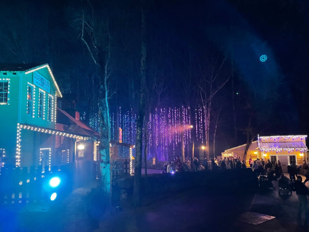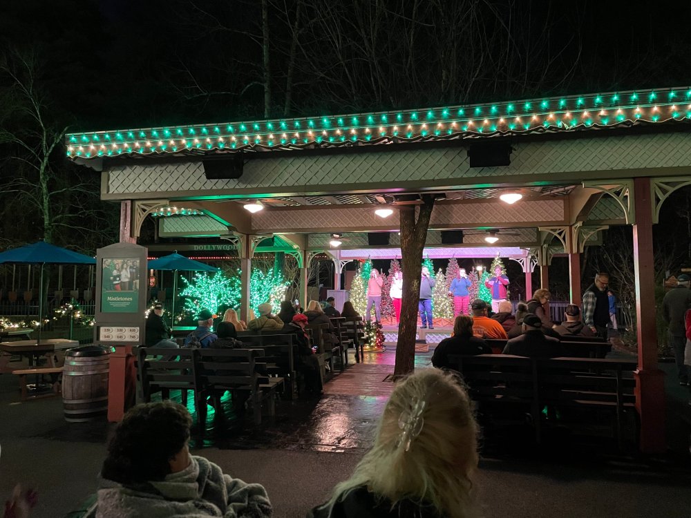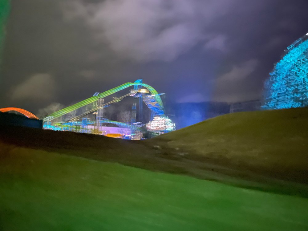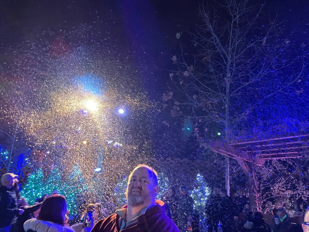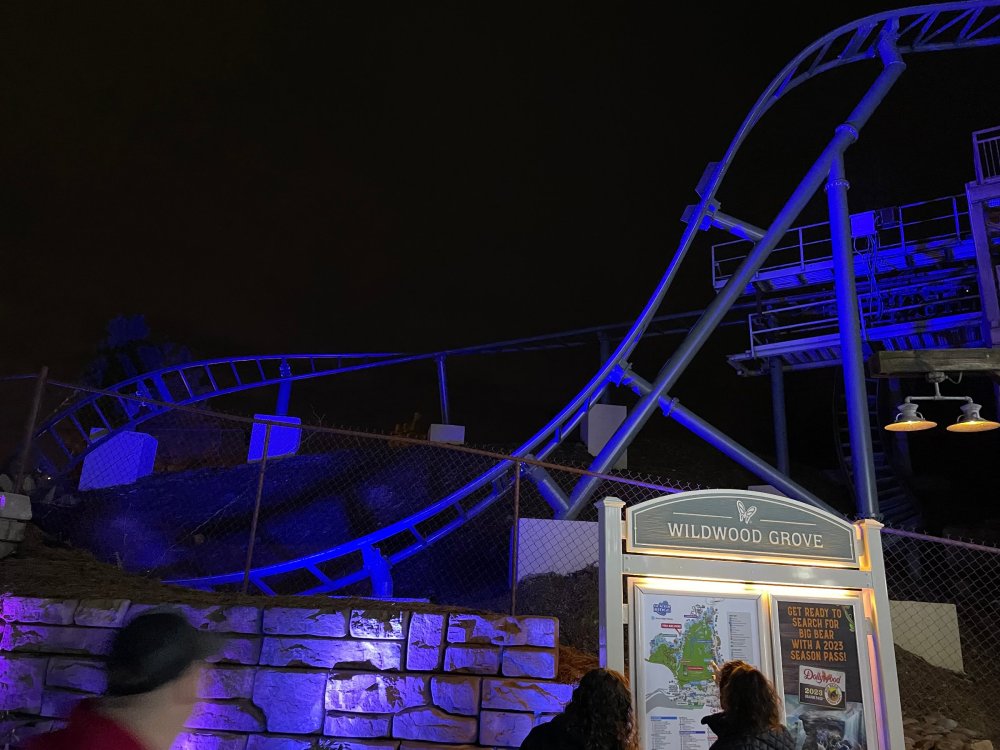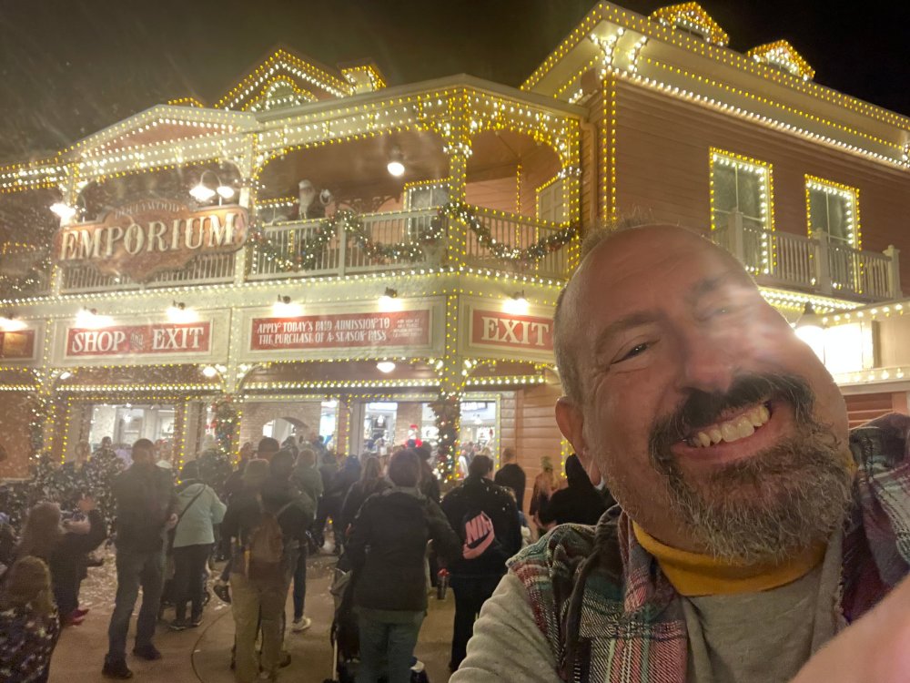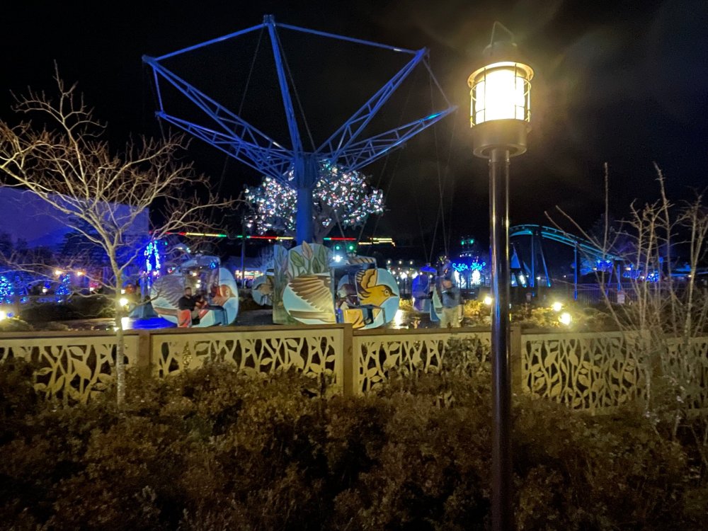 8. Part 2 - evening on Saturday, 12/3/22 as mentioned above, it got dark really quickly. . and by the time we had finished with the Teacups and the *hot* Hot Chocolate incident, and came back up to try and catch the train that was leaving in 20 minutes, it already looked like this. just gorgeous over here. by the way..the train depot is on the left out of picture range. . and this picture is taken from where we ended up in the line for the NEXT train, that was scheduled for 45 minutes from now! as noted, we debated, and decided just to stay in line, as the train was a must do, and we were here already. So just enjoyed the lights, and sipped our drinks. the folks that joined the line BEHIND us shortly after. . and partially why we decided to just stay in the line. yeah. . the train during the Holidays is popular (you'll see why in a moment) after about 20 minutes, the line in the walkways was funnelled into the train depot - well, some of it was, there was still quite a few folks who didn't make it into the depot and would have to wait for the next train. Luckily, we made it in and moved towards the front of the station - which they packed solid with folks, telling everyone "if you're in the Depot, you SHOULD get on" it was a lot of people, but they were packing them in the train rows like sardines, so we felt pretty confident in getting on. and success! here's the group I was with: back row: Amy and Scott our row: Me, Londyn, Jamie, Joseph, Xander and now. . . a handful of blurry pics from a moving train. (apologies for the blurry pics, but thought some might wanna see them, so included some of those that were blurred from the moving train) the new coaster. . . big portions of it built up already. and looks like almost all the track is on site and stacked up ready so if you've never taken the Dollywood train (and most of us had not) - it actually goes outside the park, and up the mountain! resulting in some fantastic views of the park. . . but what really makes this a must do during the Holidays? up in the mountain, there's a big "turn around" (the train uses the same tracks going up and down the mountain) that circles a large field. during the Holidays? Dollywood covers the field with *millions* of LED lights that play in patterns and colors. oh, and the train plays Christmas Carols by Dolly, and her telling stories over the speakers while the train is going. anyways. .here's some looks at the field of lights: and then you turn around and head back down the mountain, so the other side of the train gets some great views. again, that's the new coaster on the far right (orange track) coming back into the station, we were greeted upon disembarking by an acapella show. the "Mistletones". . . hokey name, but dang, they were good. So we stood and listened for a bit. then we headed towards the section of the park we hadn't been to yet - and had seen from the train - the area with the tree/Mystery Mine/Thunderhead, and wildwood grove. to get there tho, we had to pass Blazing Fury first - which looked lovely at night. Londyn wanted to "mine for crystals" - so they stopped there to do that while myself and the guys headed towards the tree. Scott hadn't been on Blazing Fury yet. . .so we stopped and took a ride. what's interesting. . is literally 30 seconds after I snapped this pic? the whole ride went dark - all lights on it out, and folks streamed out of the queue building. so we barely missed getting trapped and evacced from Blazing Fury (which would have been cool. . but there was only so much time left in the day, and way too much we still wanted to do, so I'm glad we weren't on it when the power went down) strangely the power outage only affected Blazing Fury. . the giant (and absolutely beautiful) area of icicle lights next to it that led up to Tennesse Tornado and Firechaser remained lit up. beautiful. . and color changing. . . looking back towards Blazing Fury eventually, we all met up at the Dollywood Christmas Tree. and to say I was impressed is an understatement. it was beautiful, but I didn't realize that the LED lights on it were going to tell a story. . and the whole tree is color changing! the speakers in the area came on, the crowd gathered, and the tree told us a story thru images and words. and there was quite the subtext in the story too. . . supposedly it was about a Polar Bear and a Brown Bear who are "friends" and the Polar Bear travels from the North Pole to spend Christmas with the Brown Bear. . . where they sled together, wrap presents together, and hold hands. yeah. . . LOL... never thought I'd see a gay interracial relationship celebrated at Dollywood (hey, that's how *I* took it) awww. . reaching out to hold hands and then, once they touch hands? yeah. . it started "snowing". . . . Dr. Frued ? analysis please? LOL but, it was so neat, really. recommended viewing. this is Scott's WTF is this face when the snow started "erupting" . . . LOL I have this as my desktop at the moment. perhaps my favorite pic I took on the trip: once the tree show was done, Joseph and I headed over to Mystery Mine, to grab a ride since it was close to walk on. I braced myself for the roughness, even tho I had heard that they had done some major track work on it (and in fact, the old U-shaped banked turn is still there! the new track just bypasses it). but at the end of the day it's a Gerstlauer, so I was prepared to hate it. . but was gonna ride regardless as all the coasters here were new to me. and you know what? it wasn't bad! yes, this park has a decent Arrow, a very good Vekoma (Dragonflier) AND a decent Gerstlauer. it was a Christmas miracle! (and it looks pretty amazing at night) after our ride, we all made our way down to Wildwood Grove to meet up with Amy and family who had continued walking while we stopped to ride. very overcast, but loved how the lights reflected off the clouds. big fences up for the new coaster. . lots of dirt and construction over here, where the station is gonna 