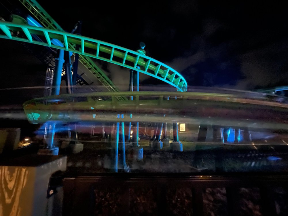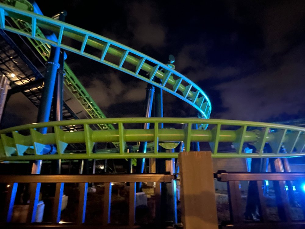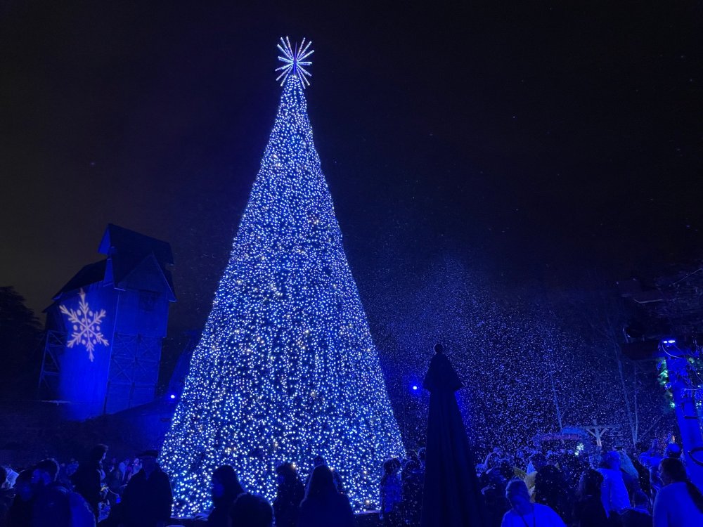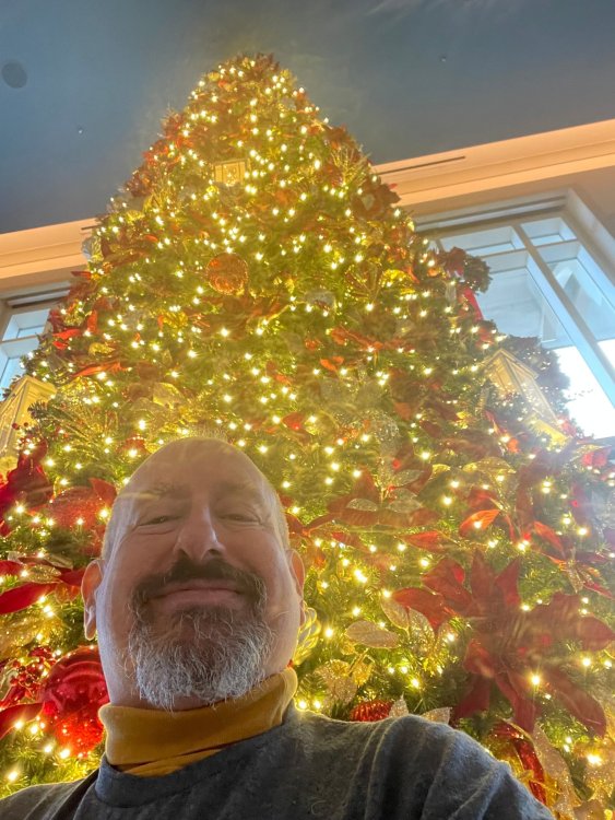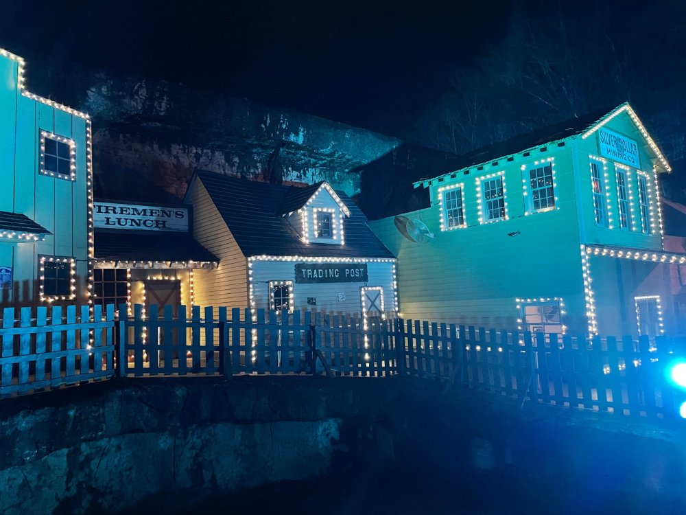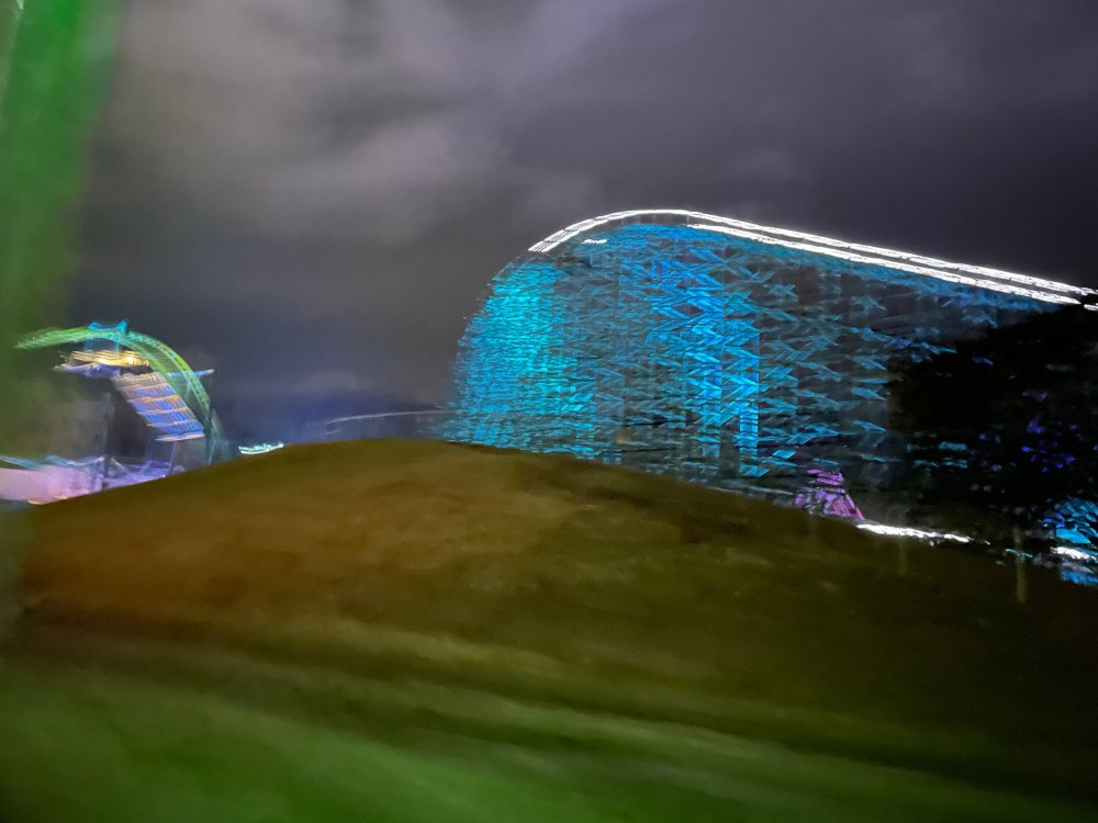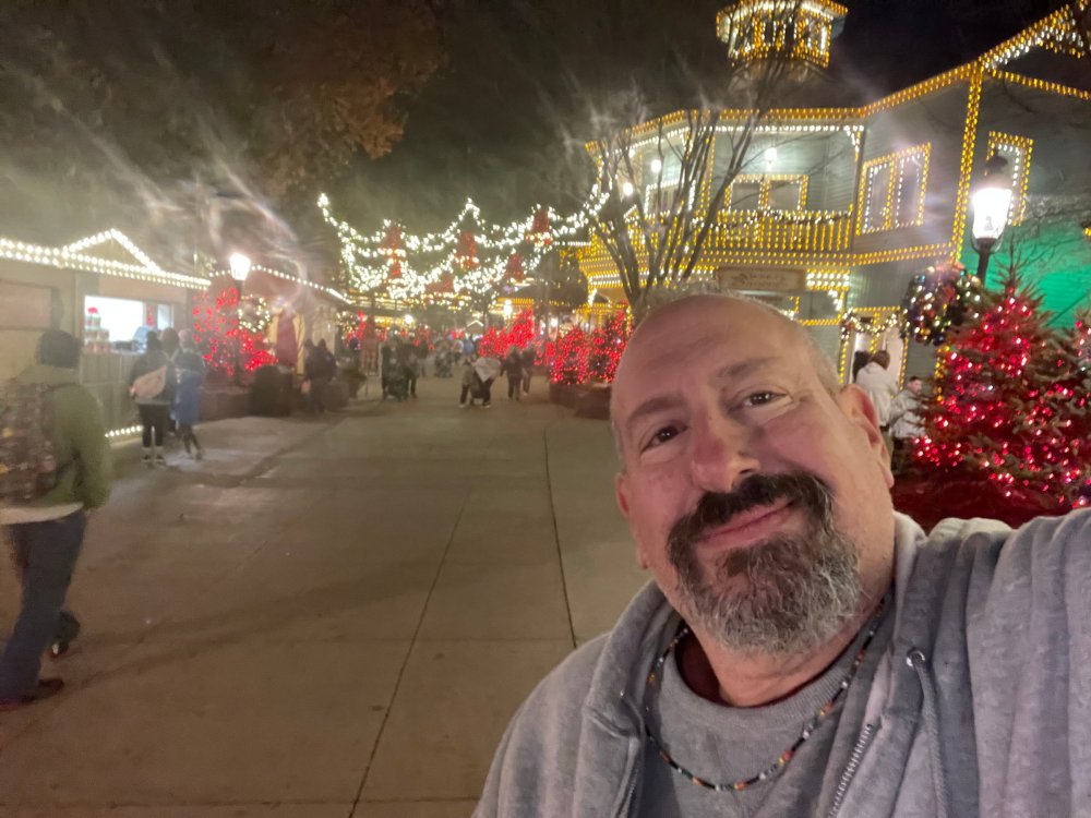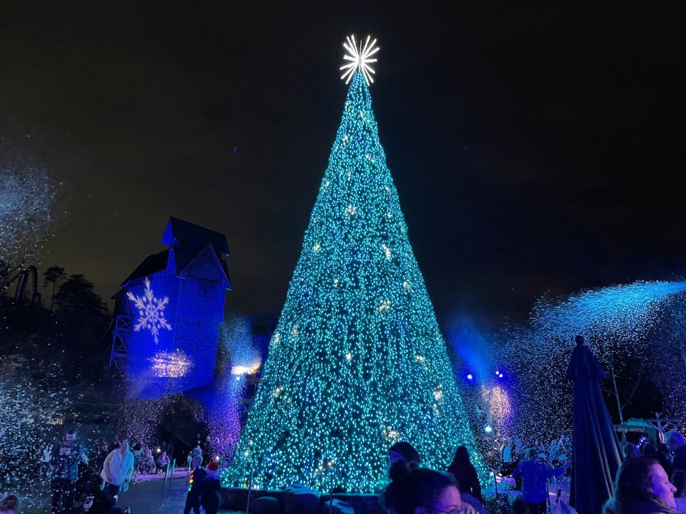 8. Part 2 - evening on Saturday, 12/3/22 as mentioned above, it got dark really quickly. . and by the time we had finished with the Teacups and the *hot* Hot Chocolate incident, and came back up to try and catch the train that was leaving in 20 minutes, it already looked like this. just gorgeous over here. by the way..the train depot is on the left out of picture range. . and this picture is taken from where we ended up in the line for the NEXT train, that was scheduled for 45 minutes from now! as noted, we debated, and decided just to stay in line, as the train was a must do, and we were here already. So just enjoyed the lights, and sipped our drinks. the folks that joined the line BEHIND us shortly after. . and partially why we decided to just stay in the line. yeah. . the train during the Holidays is popular (you'll see why in a moment) after about 20 minutes, the line in the walkways was funnelled into the train depot - well, some of it was, there was still quite a few folks who didn't make it into the depot and would have to wait for the next train. Luckily, we made it in and moved towards the front of the station - which they packed solid with folks, telling everyone "if you're in the Depot, you SHOULD get on" it was a lot of people, but they were packing them in the train rows like sardines, so we felt pretty confident in getting on. and success! here's the group I was with: back row: Amy and Scott our row: Me, Londyn, Jamie, Joseph, Xander and now. . . a handful of blurry pics from a moving train. (apologies for the blurry pics, but thought some might wanna see them, so included some of those that were blurred from the moving train) the new coaster. . . big portions of it built up already. and looks like almost all the track is on site and stacked up ready so if you've never taken the Dollywood train (and most of us had not) - it actually goes outside the park, and up the mountain! resulting in some fantastic views of the park. . . but what really makes this a must do during the Holidays? up in the mountain, there's a big "turn around" (the train uses the same tracks going up and down the mountain) that circles a large field. during the Holidays? Dollywood covers the field with *millions* of LED lights that play in patterns and colors. oh, and the train plays Christmas Carols by Dolly, and her telling stories over the speakers while the train is going. anyways. .here's some looks at the field of lights: and then you turn around and head back down the mountain, so the other side of the train gets some great views. again, that's the new coaster on the far right (orange track) coming back into the station, we were greeted upon disembarking by an acapella show. the "Mistletones". . . hokey name, but dang, they were good. So we stood and listened for a bit. then we headed towards the section of the park we hadn't been to yet - and had seen from the train - the area with the tree/Mystery Mine/Thunderhead, and wildwood grove. to get there tho, we had to pass Blazing Fury first - which looked lovely at night. Londyn wanted to "mine for crystals" - so they stopped there to do that while myself and the guys headed towards the tree. Scott hadn't been on Blazing Fury yet. . .so we stopped and took a ride. what's interesting. . is literally 30 seconds after I snapped this pic? the whole ride went dark - all lights on it out, and folks streamed out of the queue building. so we barely missed getting trapped and evacced from Blazing Fury (which would have been cool. . but there was only so much time left in the day, and way too much we still wanted to do, so I'm glad we weren't on it when the power went down) strangely the power outage only affected Blazing Fury. . the giant (and absolutely beautiful) area of icicle lights next to it that led up to Tennesse Tornado and Firechaser remained lit up. beautiful. . and color changing. . . looking back towards Blazing Fury eventually, we all met up at the Dollywood Christmas Tree. and to say I was impressed is an understatement. it was beautiful, but I didn't realize that the LED lights on it were going to tell a story. . and the whole tree is color changing! the speakers in the area came on, the crowd gathered, and the tree told us a story thru images and words. and there was quite the subtext in the story too. . . supposedly it was about a Polar Bear and a Brown Bear who are "friends" and the Polar Bear travels from the North Pole to spend Christmas with the Brown Bear. . . where they sled together, wrap presents together, and hold hands. yeah. . . LOL... never thought I'd see a gay interracial relationship celebrated at Dollywood (hey, that's how *I* took it) awww. . reaching out to hold hands and then, once they touch hands? yeah. . it started "snowing". . . . Dr. Frued ? analysis please? LOL but, it was so neat, really. recommended viewing. this is Scott's WTF is this face when the snow started "erupting" . . . LOL I have this as my desktop at the moment. perhaps my favorite pic I took on the trip: once the tree show was done, Joseph and I headed over to Mystery Mine, to grab a ride since it was close to walk on. I braced myself for the roughness, even tho I had heard that they had done some major track work on it (and in fact, the old U-shaped banked turn is still there! the new track just bypasses it). but at the end of the day it's a Gerstlauer, so I was prepared to hate it. . but was gonna ride regardless as all the coasters here were new to me. and you know what? it wasn't bad! yes, this park has a decent Arrow, a very good Vekoma (Dragonflier) AND a decent Gerstlauer. it was a Christmas miracle! (and it looks pretty amazing at night) after our ride, we all made our way down to Wildwood Grove to meet up with Amy and family who had continued walking while we stopped to ride. very overcast, but loved how the lights reflected off the clouds. big fences up for the new coaster. . lots of dirt and construction over here, where the station is gonna 