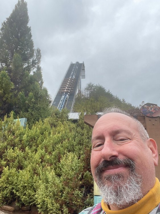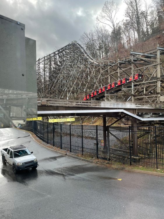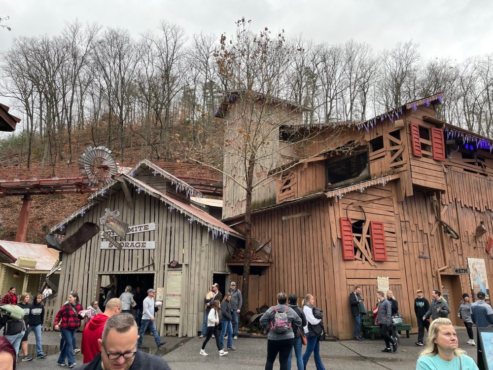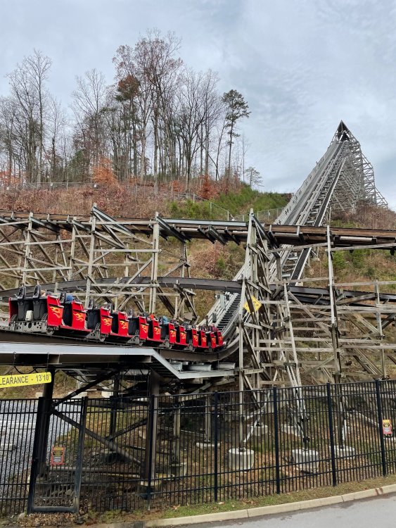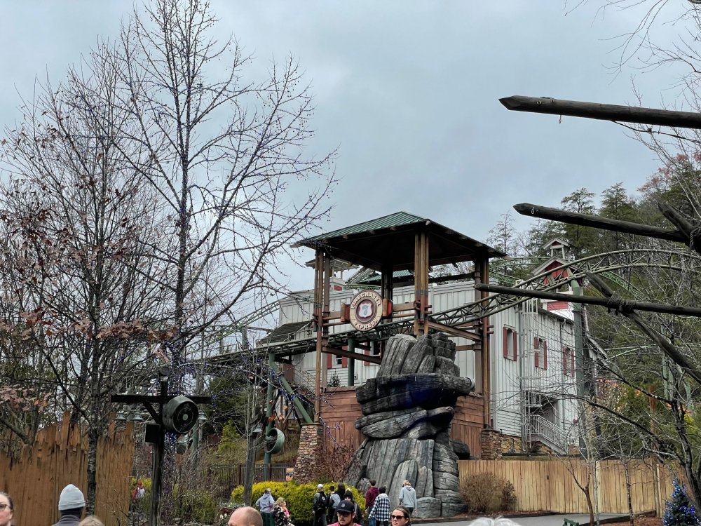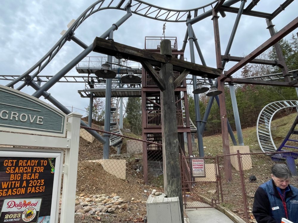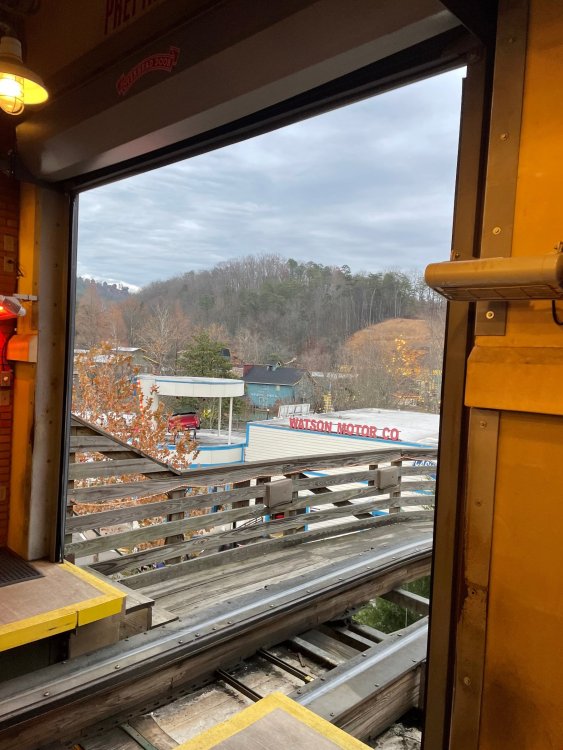 7. So Sunday we woke up and the weather cooperated in that it wasn't wet. . but it HAD gotten very cold. Park opened at 11. . but no one was in a huge rush to get to the park (all wiped out from yesterday) and besides, we were watching the temps and waiting for it to climb up high enough that things would actually operate. so I killed a little bit of time taking some morning pics. these were on almost every light switch, and I hadn't noticed them until this morning. OH MY! a better shot of the spiral staircase leading up to the upstairs loft (with the queen bunk beds, bathroom, pool table, deck, and arcade game) in front of the cabin keeping Amy company while she smoked view from the parking spot. from our decks we saw Flying Eagle start to cycle, so we headed to the park - with Cinnamon Bread on our minds - and got there just around 12:15 if I'm not mistaken. as we were headed to the Cinnamon Bread, we saw Lightning Rod had a 5 minute wait. . so we detoured over that way, and got in line. and as we climbed the stairs, heard a groan from above us, and people started exiting past us out of the line. We asked what happened, and LR had a roll back. and the people were stuck at the launch. we waited a moment to see if they could resolve, but when they started walking out to the train to evac? we called it and just went over to get Cinnamon Bread (as the digital signs in the park said LR was temporarily unavailable). got pics of the train sitting at the bottom of the launch tho - not blurry, as it wasn't moving how had I not seen the weird statues thruout the park yesterday?? kids riding on trees all over in this section while headed to the Grist Mill for Cinnamon Bread there was still a line - even tho the park was EMPTY (due to the cold). . but way shorter than last night. So we got in line. YUM!!! it was so cold, we actually went to the BarBQue place across the walkway - with the heated dining area- where some in the group bought food, so we could sit and eat in the heated area. so good! (and reheated well. . since I ended up taking 1/2 of my loaf home and it still tasted great 2 days later, after 5 minutes in a 350 oven). proof I had official Dollywood Cinnamon Bread we continued around the park, and I think we may have stopped at Blazing Fury for another ride. . but today really was about getting the few things missed yesterday, and Londyn shopping and riding the kiddie stuff. so really 1st on the list was Firechaser Express. not a walk on, but only 15 minute wait today. it's a fun family coaster, that looks way more extreme (and high) than it is. The backwards section is short, but memorable, and I enjoyed it. Didn't think it was great enough to get back in line to ride again, but I'm glad I got to ride it. Amy had missed out on Mystery Mine last night, as only Joseph and I had ridden it - so we headed that direction next. stopping for Photo Ops as I passed them tho, of course the old section of track still remaining is behind this tower. That "U" shaped wave turn. it's weird they left it.. but also, I kinda like it. we didnt' get to ride tho, because as we walked up, we saw them walking people from the back area (a group of girls) and the front of the ride was closed off. hurm. . . Oh well, I had gotten to ride it yesterday, and the only thing I really had remaining on my list was DropLine (which is close by). No one else wanted to ride, so I got in the walk on line. . and the group of girls we had seen coming out of Mystery Mine ended up right behind me. So I asked them if they had been evacced, and they freaked out telling me yes! and from the Vertical lift. that they had used a cherry picker to get them out of the train, and it freaked them out. but the park had given them skip the line passes. (not that it mattered, it was so cold park was dead). So that's two now that had to have people walked from down coasters - I have to assume the cold weather was affecting? anyways, DropLine was fun - tho very short. and it does have the added seatbelt restraint now. And oddly, the operator was discussing the Orlando drop tower incident with the guys sitting next to me on the ride (it came up because one of them was telling his friend someone had been injured on this ride and that's why it had been closed earlier this year). more polar bears around DropLine's setting. . which I hadn't noticed yesterday, as they were just glowing blobs by the time we came by here in the evening. I like this pic tho as you can see Thunderhead and the new Bear Mountain coaster in the background (along with the flyers). it really was a bit too cold to ride anything, and folks were just meandering. . . . luckily LOTS of photo ops all over the park. i particularly love this pic. Thru the trees! I wanted a daytime ride on Thunderhead even tho it was cold, and others were willing. . .so we headed over that way to get our ride. Londyn was excited because Whistle Stop Chaser is right next to it. . so she got to ride that 3 times. . . riding with most of us in the group. here's my turn. . pic courtesy of Xander. and then we go to go on Thunderhead. SUCH a great coaster, tho it was running a bit rougher during the daytime than it had been the night before. I still think it was fantastic, but some in the group said it hurt their back a bit. whee!!! more photo ops. . . we knew with the light crowd today, we wouldn't have any issue getting into the "headline" show, and sure enough, it wasn't a full auditorium for Christmas in the Smokies. it's an indoor theater, for an ~1 hour show. . so we went for it. very well done, with some really nice voices, and carols. (and way less Jesus-y than I had expected (I thought it was the story of Jesus, really). . . Amy said for that we'd have to watch the Nativity show) the show is. . . odd tho. it starts out with a story - folks coming home to the Smokies for Christmas, and visiting family, and singing. . then they all go sledding. . . then there's a cabin inside a church. . then Jesus 