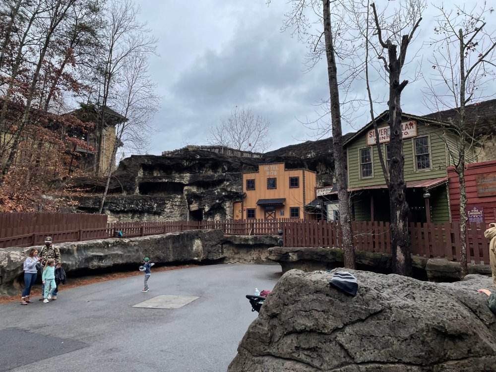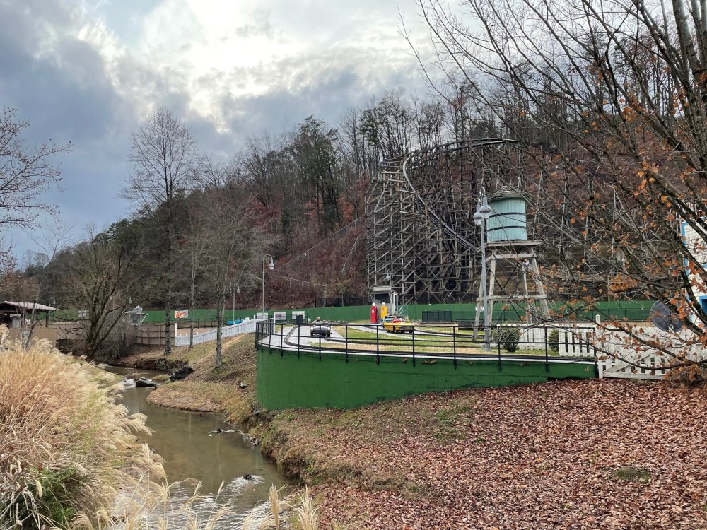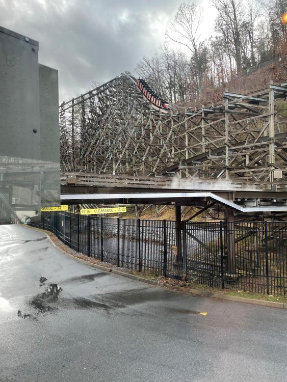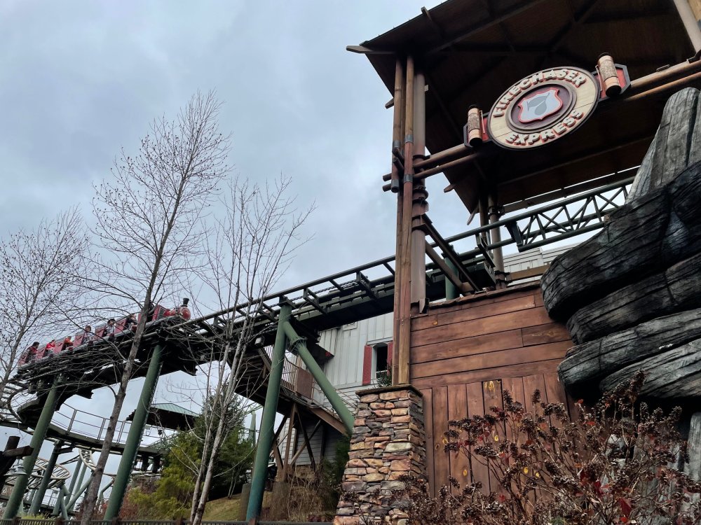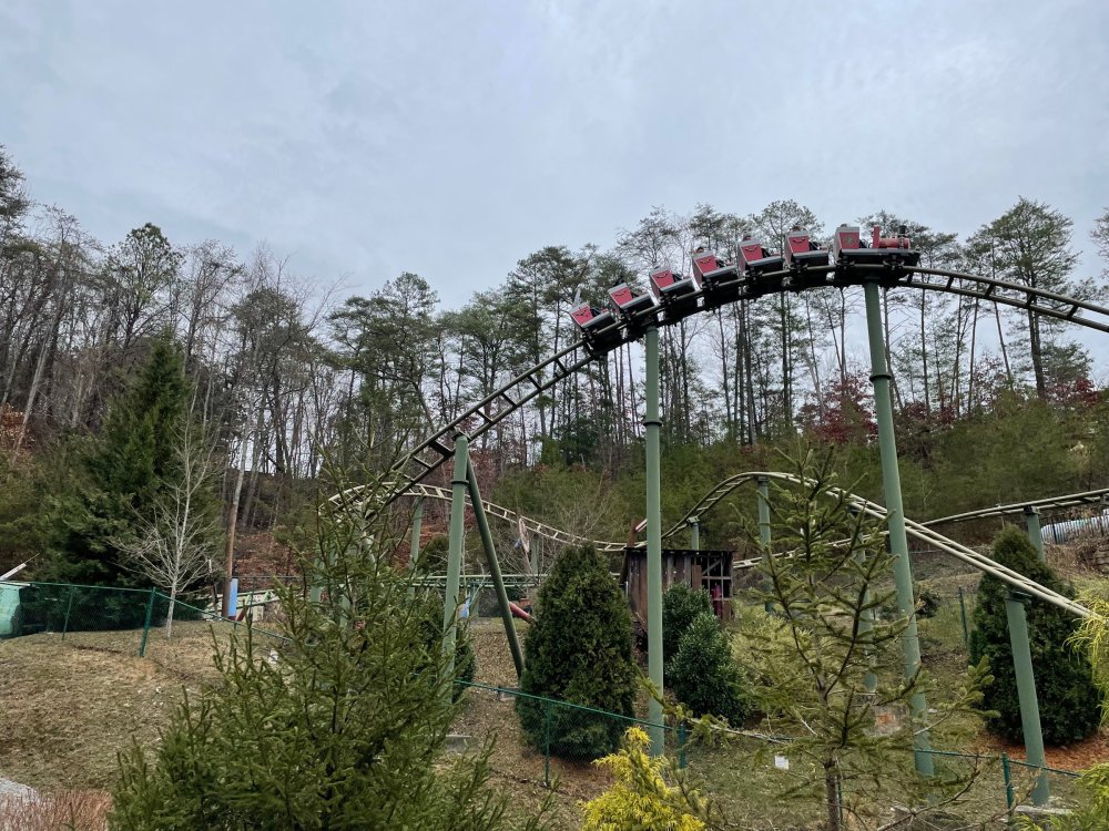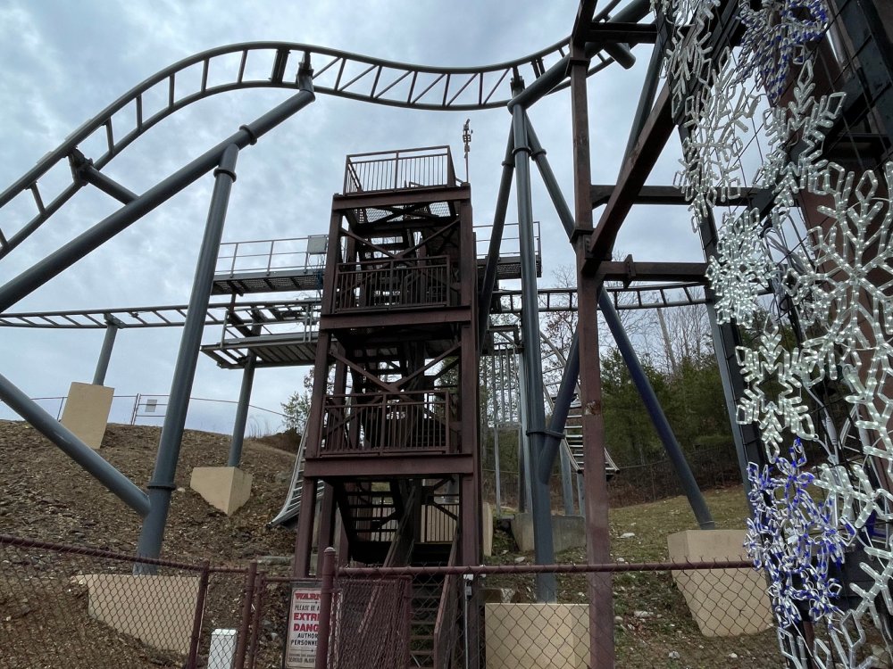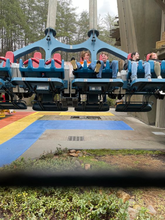7. So Sunday we woke up and the weather cooperated in that it wasn't wet. . but it HAD gotten very cold. Park opened at 11. . but no one was in a huge rush to get to the park (all wiped out from yesterday) and besides, we were watching the temps and waiting for it to climb up high enough that things would actually operate. so I killed a little bit of time taking some morning pics. these were on almost every light switch, and I hadn't noticed them until this morning. OH MY! a better shot of the spiral staircase leading up to the upstairs loft (with the queen bunk beds, bathroom, pool table, deck, and arcade game) in front of the cabin keeping Amy company while she smoked view from the parking spot. from our decks we saw Flying Eagle start to cycle, so we headed to the park - with Cinnamon Bread on our minds - and got there just around 12:15 if I'm not mistaken. as we were headed to the Cinnamon Bread, we saw Lightning Rod had a 5 minute wait. . so we detoured over that way, and got in line. and as we climbed the stairs, heard a groan from above us, and people started exiting past us out of the line. We asked what happened, and LR had a roll back. and the people were stuck at the launch. we waited a moment to see if they could resolve, but when they started walking out to the train to evac? we called it and just went over to get Cinnamon Bread (as the digital signs in the park said LR was temporarily unavailable). got pics of the train sitting at the bottom of the launch tho - not blurry, as it wasn't moving how had I not seen the weird statues thruout the park yesterday?? kids riding on trees all over in this section while headed to the Grist Mill for Cinnamon Bread there was still a line - even tho the park was EMPTY (due to the cold). . but way shorter than last night. So we got in line. YUM!!! it was so cold, we actually went to the BarBQue place across the walkway - with the heated dining area- where some in the group bought food, so we could sit and eat in the heated area. so good! (and reheated well. . since I ended up taking 1/2 of my loaf home and it still tasted great 2 days later, after 5 minutes in a 350 oven). proof I had official Dollywood Cinnamon Bread we continued around the park, and I think we may have stopped at Blazing Fury for another ride. . but today really was about getting the few things missed yesterday, and Londyn shopping and riding the kiddie stuff. so really 1st on the list was Firechaser Express. not a walk on, but only 15 minute wait today. it's a fun family coaster, that looks way more extreme (and high) than it is. The backwards section is short, but memorable, and I enjoyed it. Didn't think it was great enough to get back in line to ride again, but I'm glad I got to ride it. Amy had missed out on Mystery Mine last night, as only Joseph and I had ridden it - so we headed that direction next. stopping for Photo Ops as I passed them tho, of course the old section of track still remaining is behind this tower. That "U" shaped wave turn. it's weird they left it.. but also, I kinda like it. we didnt' get to ride tho, because as we walked up, we saw them walking people from the back area (a group of girls) and the front of the ride was closed off. hurm. . . Oh well, I had gotten to ride it yesterday, and the only thing I really had remaining on my list was DropLine (which is close by). No one else wanted to ride, so I got in the walk on line. . and the group of girls we had seen coming out of Mystery Mine ended up right behind me. So I asked them if they had been evacced, and they freaked out telling me yes! and from the Vertical lift. that they had used a cherry picker to get them out of the train, and it freaked them out. but the park had given them skip the line passes. (not that it mattered, it was so cold park was dead). So that's two now that had to have people walked from down coasters - I have to assume the cold weather was affecting? anyways, DropLine was fun - tho very short. and it does have the added seatbelt restraint now. And oddly, the operator was discussing the Orlando drop tower incident with the guys sitting next to me on the ride (it came up because one of them was telling his friend someone had been injured on this ride and that's why it had been closed earlier this year). more polar bears around DropLine's setting. . which I hadn't noticed yesterday, as they were just glowing blobs by the time we came by here in the evening. I like this pic tho as you can see Thunderhead and the new Bear Mountain coaster in the background (along with the flyers). it really was a bit too cold to ride anything, and folks were just meandering. . . . luckily LOTS of photo ops all over the park. i particularly love this pic. Thru the trees! I wanted a daytime ride on Thunderhead even tho it was cold, and others were willing. . .so we headed over that way to get our ride. Londyn was excited because Whistle Stop Chaser is right next to it. . so she got to ride that 3 times. . . riding with most of us in the group. here's my turn. . pic courtesy of Xander. and then we go to go on Thunderhead. SUCH a great coaster, tho it was running a bit rougher during the daytime than it had been the night before. I still think it was fantastic, but some in the group said it hurt their back a bit. whee!!! more photo ops. . . we knew with the light crowd today, we wouldn't have any issue getting into the "headline" show, and sure enough, it wasn't a full auditorium for Christmas in the Smokies. it's an indoor theater, for an ~1 hour show. . so we went for it. very well done, with some really nice voices, and carols. (and way less Jesus-y than I had expected (I thought it was the story of Jesus, really). . . Amy said for that we'd have to watch the Nativity show) the show is. . . odd tho. it starts out with a story - folks coming home to the Smokies for Christmas, and visiting family, and singing. . then they all go sledding. . . then there's a cabin inside a church. . then Jesus 