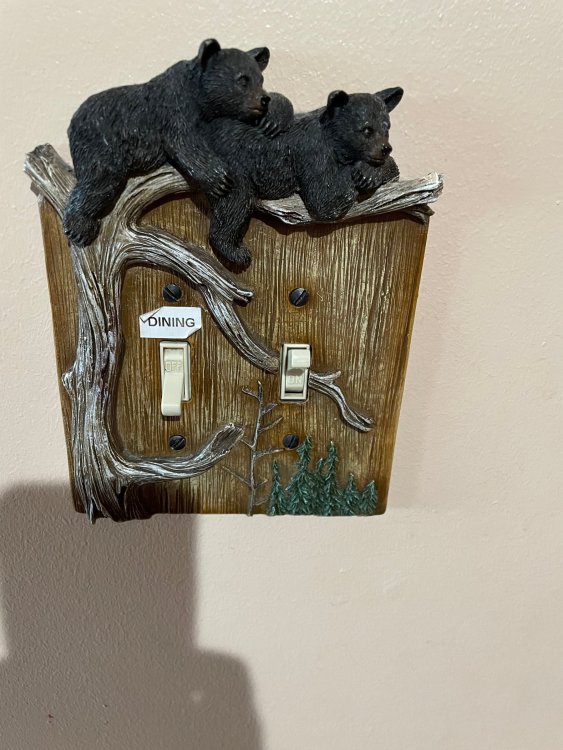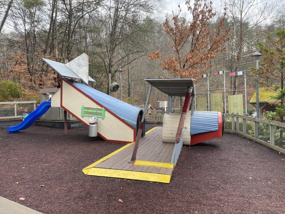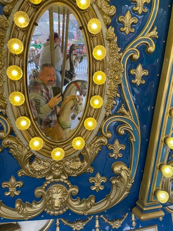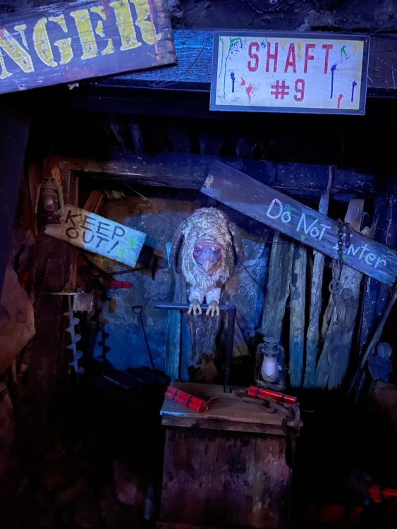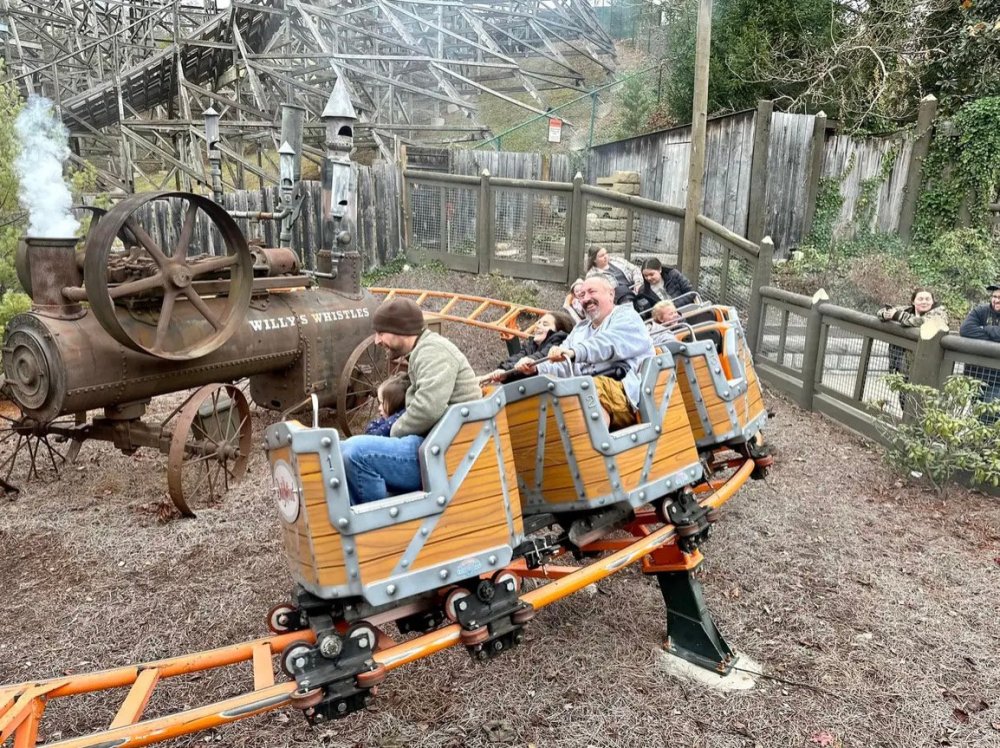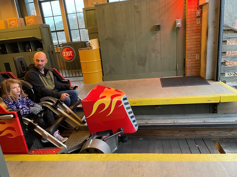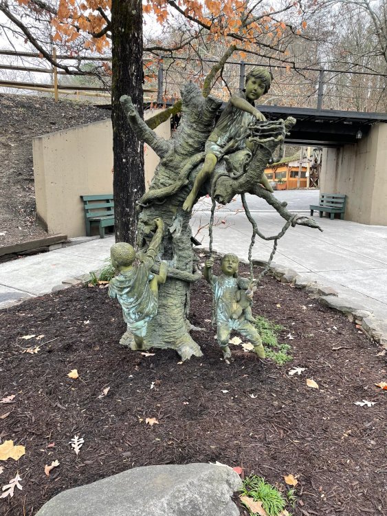 7. So Sunday we woke up and the weather cooperated in that it wasn't wet. . but it HAD gotten very cold. Park opened at 11. . but no one was in a huge rush to get to the park (all wiped out from yesterday) and besides, we were watching the temps and waiting for it to climb up high enough that things would actually operate. so I killed a little bit of time taking some morning pics. these were on almost every light switch, and I hadn't noticed them until this morning. OH MY! a better shot of the spiral staircase leading up to the upstairs loft (with the queen bunk beds, bathroom, pool table, deck, and arcade game) in front of the cabin keeping Amy company while she smoked view from the parking spot. from our decks we saw Flying Eagle start to cycle, so we headed to the park - with Cinnamon Bread on our minds - and got there just around 12:15 if I'm not mistaken. as we were headed to the Cinnamon Bread, we saw Lightning Rod had a 5 minute wait. . so we detoured over that way, and got in line. and as we climbed the stairs, heard a groan from above us, and people started exiting past us out of the line. We asked what happened, and LR had a roll back. and the people were stuck at the launch. we waited a moment to see if they could resolve, but when they started walking out to the train to evac? we called it and just went over to get Cinnamon Bread (as the digital signs in the park said LR was temporarily unavailable). got pics of the train sitting at the bottom of the launch tho - not blurry, as it wasn't moving how had I not seen the weird statues thruout the park yesterday?? kids riding on trees all over in this section while headed to the Grist Mill for Cinnamon Bread there was still a line - even tho the park was EMPTY (due to the cold). . but way shorter than last night. So we got in line. YUM!!! it was so cold, we actually went to the BarBQue place across the walkway - with the heated dining area- where some in the group bought food, so we could sit and eat in the heated area. so good! (and reheated well. . since I ended up taking 1/2 of my loaf home and it still tasted great 2 days later, after 5 minutes in a 350 oven). proof I had official Dollywood Cinnamon Bread we continued around the park, and I think we may have stopped at Blazing Fury for another ride. . but today really was about getting the few things missed yesterday, and Londyn shopping and riding the kiddie stuff. so really 1st on the list was Firechaser Express. not a walk on, but only 15 minute wait today. it's a fun family coaster, that looks way more extreme (and high) than it is. The backwards section is short, but memorable, and I enjoyed it. Didn't think it was great enough to get back in line to ride again, but I'm glad I got to ride it. Amy had missed out on Mystery Mine last night, as only Joseph and I had ridden it - so we headed that direction next. stopping for Photo Ops as I passed them tho, of course the old section of track still remaining is behind this tower. That "U" shaped wave turn. it's weird they left it.. but also, I kinda like it. we didnt' get to ride tho, because as we walked up, we saw them walking people from the back area (a group of girls) and the front of the ride was closed off. hurm. . . Oh well, I had gotten to ride it yesterday, and the only thing I really had remaining on my list was DropLine (which is close by). No one else wanted to ride, so I got in the walk on line. . and the group of girls we had seen coming out of Mystery Mine ended up right behind me. So I asked them if they had been evacced, and they freaked out telling me yes! and from the Vertical lift. that they had used a cherry picker to get them out of the train, and it freaked them out. but the park had given them skip the line passes. (not that it mattered, it was so cold park was dead). So that's two now that had to have people walked from down coasters - I have to assume the cold weather was affecting? anyways, DropLine was fun - tho very short. and it does have the added seatbelt restraint now. And oddly, the operator was discussing the Orlando drop tower incident with the guys sitting next to me on the ride (it came up because one of them was telling his friend someone had been injured on this ride and that's why it had been closed earlier this year). more polar bears around DropLine's setting. . which I hadn't noticed yesterday, as they were just glowing blobs by the time we came by here in the evening. I like this pic tho as you can see Thunderhead and the new Bear Mountain coaster in the background (along with the flyers). it really was a bit too cold to ride anything, and folks were just meandering. . . . luckily LOTS of photo ops all over the park. i particularly love this pic. Thru the trees! I wanted a daytime ride on Thunderhead even tho it was cold, and others were willing. . .so we headed over that way to get our ride. Londyn was excited because Whistle Stop Chaser is right next to it. . so she got to ride that 3 times. . . riding with most of us in the group. here's my turn. . pic courtesy of Xander. and then we go to go on Thunderhead. SUCH a great coaster, tho it was running a bit rougher during the daytime than it had been the night before. I still think it was fantastic, but some in the group said it hurt their back a bit. whee!!! more photo ops. . . we knew with the light crowd today, we wouldn't have any issue getting into the "headline" show, and sure enough, it wasn't a full auditorium for Christmas in the Smokies. it's an indoor theater, for an ~1 hour show. . so we went for it. very well done, with some really nice voices, and carols. (and way less Jesus-y than I had expected (I thought it was the story of Jesus, really). . . Amy said for that we'd have to watch the Nativity show) the show is. . . odd tho. it starts out with a story - folks coming home to the Smokies for Christmas, and visiting family, and singing. . then they all go sledding. . . then there's a cabin inside a church. . then Jesus 