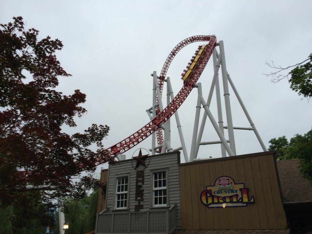 Day 5 & 6: Knobel’s Since it had been so wet and icky, the idea of walking thru the gardens at Hershey Hotel didn’t really appeal to us, and Nick decided he didn’t want to go to the car museum that was close by. So instead, we just slept in and went down to the coffee shop in the lobby for a light breakfast (egg sandwich) before heading out to Bloomsburg (where we were staying for Knobel’s) This was the shortest drive of the trip, only expected to take about an hour and 15 minutes, but we decided just to go ahead and head out anyways. Good thing we did too, as this is the one part of the trip where my printed directions failed us! Up in the hills, we missed a turn, and it took a while for us to realize that we had gone way longer than the “7 miles” the directions had indicated. There was literally no one around, and so after driving aimlessly for 20 minutes or so, I told Nick to turn around and we’d go back to the last place we saw a place to ask (a little gas station with a general store). So we backtracked, and pulled into the store, and as we are getting out of the car, I notice across the street a sign with the name of the street we had missed on our directions. But surely Google maps wouldn’t be directing us to cut thru a small town. . must just be a coincidence? So I decided to go inside to ask for directions and the counter ladies (three of em) quickly decide that I should talk to the lady in the back who’s stocking the beer cooler, as she will know! So this adorable little lady comes out, takes a look at my printed directions and says “why the hell do they make EVERYTHING so difficult?” She tells me that the directions I have are “silly” and that she’ll give me better directions to Bloomsburg. I was a little wary, because once I go “off map” we’re really screwed if we get lost, but I wrote down the directions she told me: “go to the light at the top of the hill, and take a right. Then go to the football field, and turn on the street that runs between the restaurant (no name, just THE restaurant), and the football field. Then just follow the road. . .it’s twisty and will keep us going for a good 15 miles and we’ll think we’re lost, but just keep following it. It will put us to Bloomsburg the easiest way. I know, because I go that way every Saturday to eat at the Olive Garden” LOL. . it was like a scene out of a bad comedy film, the four small town ladies helping the two lost gay boys find their way from the woods! But we followed her directions, and lo and behold, we started seeing Knobel’s signs, so that relieved us. At one point on this twisty road, it started to get overcast, just as we passed a gated off bridge that looked like it was going towards an abandoned . . something. I joked to Nick as we passed, “that looks like the bridge that takes you to “Silent Hill!” And then we rolled thru an old town that had gothic (and crumbling) old churches, before getting to the center of town (I believe it’s called Catawissa), a true old school small town – tiny little supermarket on the main street – but it was charming, and I wish we had stopped. But it was starting to get overcast, as I said, and we decided we better find the hotel. A few more wrong turns (but minor backtracking fixed it), and we were at the Comfort Suites, Bloomsburg, up on a hill – in the parking lot of a Lowe’s and a Wal*Mart. Really. The parking lot was almost completely deserted, but the lady at he desk told me that everyone was at the fairgrounds (never did find out what was going on there), and that they DID have a room for us, but it didn’t face the nice view from the hill. Since they were so busy, our room faced the Lowe’s loading dock. Oh well, we were just gonna sleep there so who cares about the view? Nice room with an odd design – there is a wall that acts as a room divider between the bed, and the sofa, and the sofa unfolds into a sleeper. . so we could have easily fit 6 people in that room. Also it included a Microwave and a Fridge, which was nice (we loaded up on Sodas from Wal*mart). As it was so early (only around 3, I think), we decided to check out the rest of the hotel – small indoor pool, game room, breakfast area (that doubles as a bar at night!), and free internet, including a desktop system set up in the lobby for guests to use (I used it to post on Theme Park Review messageboards). The front desk clerk told us it was about to get really busy as the storms were coming in and folks would be back soon. She also suggested if we have time, we should go up the road to see the town where they filmed some of the movie “Silent Hill” ! (what the heck!!!!). So we went up to the room to relax and watch the weather channel. The heavy rain seemed to be coming in waves, so we decided we’d hang out for a bit and head to Knobel’s between bands of rain. The parking is free, and admission is free, and Friday Night is bargain night, where a wristband is only $10 so we wanted to try it out regardless of weather. So around 6pm, we headed out to Knobel’s (the clerk was right, the parking lot really DID fill up completely). Since we had passed signs for Knobel’s on our way into Bloomsburg, we had absolutely no issue finding the park (my directions from the hotel to Knobel’s took us back partially the way we came in). It started to rain pretty hard as we pulled in, so we waited for it to slow to a drizzle and went to stand under a shuttle stop, and then went over to one of the big picnic areas (with tables, and a metal roof). Literally the *moment* we stepped under the picnic area? The sky opened up and it POURED. . like a hurricane. For about 40 minutes. I didn’t mind, as I love the rain, and we were dry. What else were we gonna do anyways? Sit in the room? I’d rather have been outside enjoying the heavy storm. But the heavy gushing water shocked the heck out of us – no wonder Knobel’s floods sometimes! Even more shocking / i