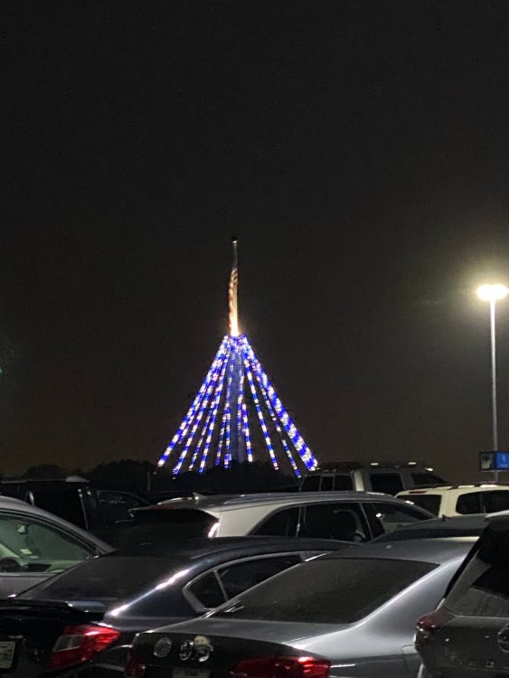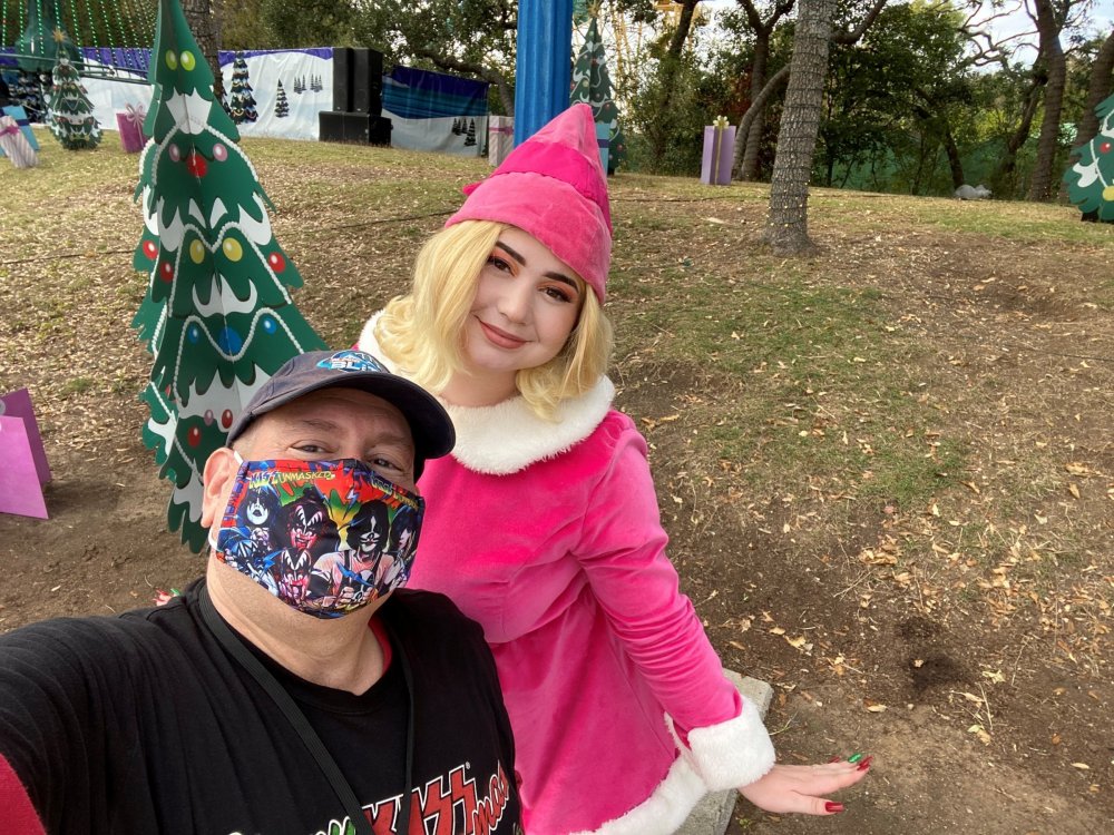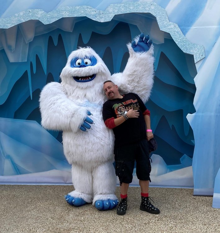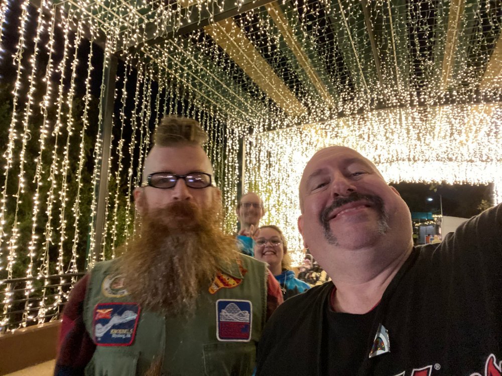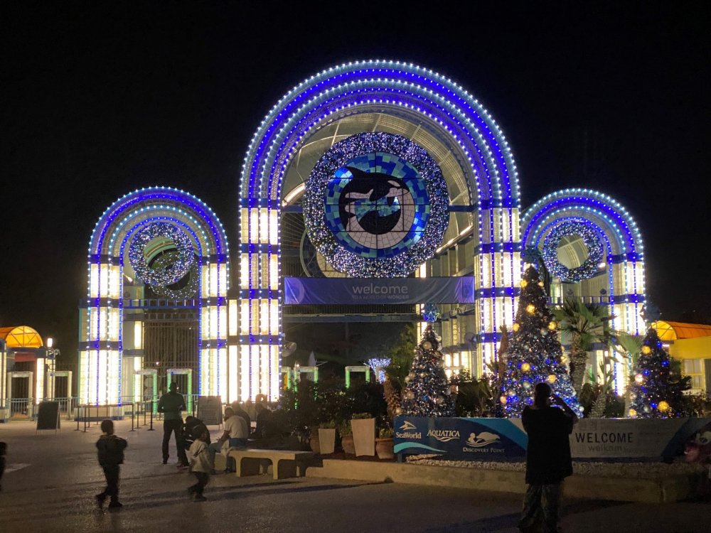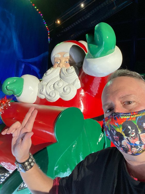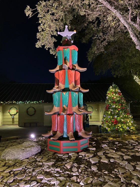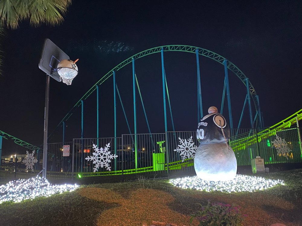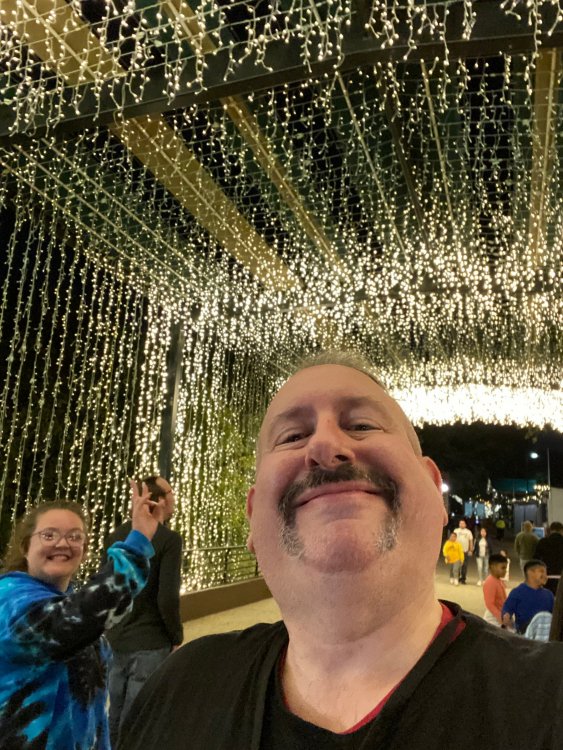 SWSA day concluded: so walking back from the car, was able to get a picture of the big "tree" that SWSA has at the entrance to the parking lot. Unfortunately, the Parking lot lights caused my iPhone 11 to pick up a lot of extra, and kinda put it into "night mode" and washed them out a little. same issue with this one.. tho as I got away from the parking lot lights, the night shots got better. they're not kidding around when they say it's the largest amount of lights in Texas. I mean, this is still OUTSIDE the main gates. . so many lights, all along the outer fence of the park. and the "welcome gates" are impressive as hell at night: once you actually get into the park, it's even more impressive in places. this whole area was hosted by Coca-Cola, and had the Red/White colors and the Polar Bear inflatables (drinking cokes of course). . . and a pop up bar that was offering all kinds of Coke drinks with and without alcohol. since we had just finished eating, I didn't try anything else, sadly, but I expect will be back at some point in Dec, (since have a pass now) and will try some of them out then. walking towards the lagoon (we were headed for a night ride on Texas Stingray since we didnt' have any evening ERT on it, so were just gonna stand in line) is so dang impressive. there were multiple stages set up along the pathways, and all of the performers were excellent. I called these guys the "nudies". . since - tho it's clear in the pics they are wearing pink pants? . . . in person, they were more "flesh" colored. .and as we came upon them, I really did a double take, as they looked like they were naked from the waist down! (LOL). the "brass" Christmas Carols were lovely tho, and drew a pretty good crowd in the walkway. they didn't have the lights ON Journey to Atlantis itself (but the event had just opened, so maybe still to come?), but the entire fence around it (and trees within it) were wrapped and looked stunning: I was shocked that although the park had gotten really crowded (I think I heard someone at ERT saying over 20,000 came in after 5:30 when it got dark), the line for Texas Stingray was still only ~15 minutes - even with only 1 train. here's what the majority of the queue looked like: after our ride, Oren, Sean, Paige and myself continued around the Lagoon, to take in the lights, and enjoy the scenery: lovely angle. . my jowls really stand out but I loved how Oren tucked his long beard into his vest for our ride on Stingray.. and in this pic he hadn't' untucked it yet. . LOL another performer over by Rio Loco entrance - who was really quite good. . she sounded a lot like Jewel. we stood and listened to her for a little bit. and then noticed Santa was meeting/greeting just behind us. Didn't get in line for him, but once we noticed he was wearing Red Leather Chaps? (we decided they are assless chaps, to counteract the Texas heat).. well. . just HAD to get a picture ! We headed over to the penguins - which was open, tho the Puffin portion was dark .. past their bedtime, I guess) and the whole building is just DRIPPING with lights. It really looked amazing. . and all around the front of the exhibit there were a whole bunch of "themed" Snowmen - including these "Blues Brothers" and this darkly humorous "San Antonio Spurs" Snowman who tossed his head, and kept the ball. dark! over by Steel Eel, the area seemed to be themed to CandyLand..with a multicolored light up path, giant gumdrops. . and was very purple. looking at the show schedule, it looked like there was an Orca show at 8:30. . which was perfect, since park closed at 9, and ERT started then. so we cut thru Sesame Street Bay of Play to head to Orca stadium. cool. . the "trash trees" even have lights on them. . and appropriately, the lights on one of em don't work. at the Orca show, Paige was VERY concerned we were gonna get wet - as basically 2/3rds of the stadium is tagged as "Splash Zone". But I went by how wet the floor was, and simply kept moving until we got to a section where the floor was mostly dry, and we sat pretty far up. So tho she stressed about it, we didnt' get wet - tho a lot of folks did, as this show had the BIG Orcas out, and they certainly made quite the splash during the show. of the 3 "animal" shows we saw today, this one was the least adapted to the Holiday Lights spirit. . . . really, all they did was put Snowflake cutouts along the tank, and called it a day, and just did the standard show (as far as I could tell). which is fine, as the show is quite enjoyable - and educational. It's just not very Christmasy. here's pics from it - as noted. . the big un Orcas were out performing today: Feeeeeed meeeeeeee ! the show over, most everyone headed to the left towards the front gates. .but we (with our neon pink wristbands indicating part of the ACE event) headed right, and went to Wave Breaker to meet up, and start the hour ERT on WaveBreaker, Great White, and Steel Eel. this time when passing this hysterical tackiness tho, I stopped and took a pic. This is close to where Santa is. . and yes. . it's a "Boot Tree" HAHAHAHAHAHA Hi Santa! we went to get in line for WaveBreaker 1st, even tho I don't think it's a super exciting coaster. But since we were there for ERT, we were able to go wherever we wanted, and decided to head to the back row. ok. . the back absolutely makes a difference (as I suspect riding at night did). . but this felt WAY faster in the back. Heck, I lost my necklace on it.. just blew right off me! so I'll say, night ride in the very back? elevates this coaster to at least a 7. Oh, it's still a family coaster, but daytime in the front is a 4-5. . I found it much more fun at night in the back. (in this pic too, you can see the penguin house with all the "dripping" blue lights. . .so lovely) and a full moon too? ooooo. . we were told riding Steel Eel (or as I call it: "ow, my balls!") during a full moon will bring good luck. So we decided we'd head over there after this ride and we'd all ride it 