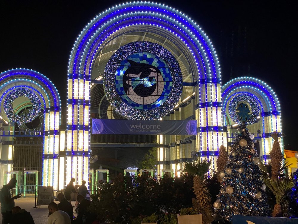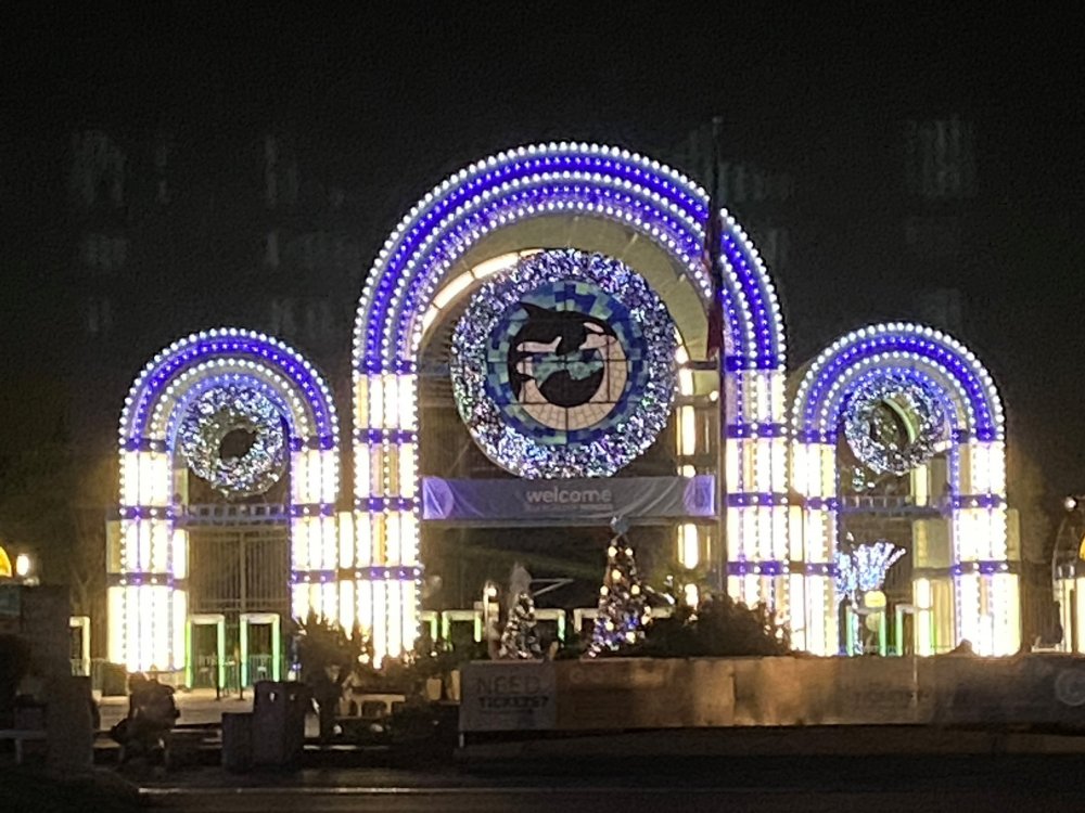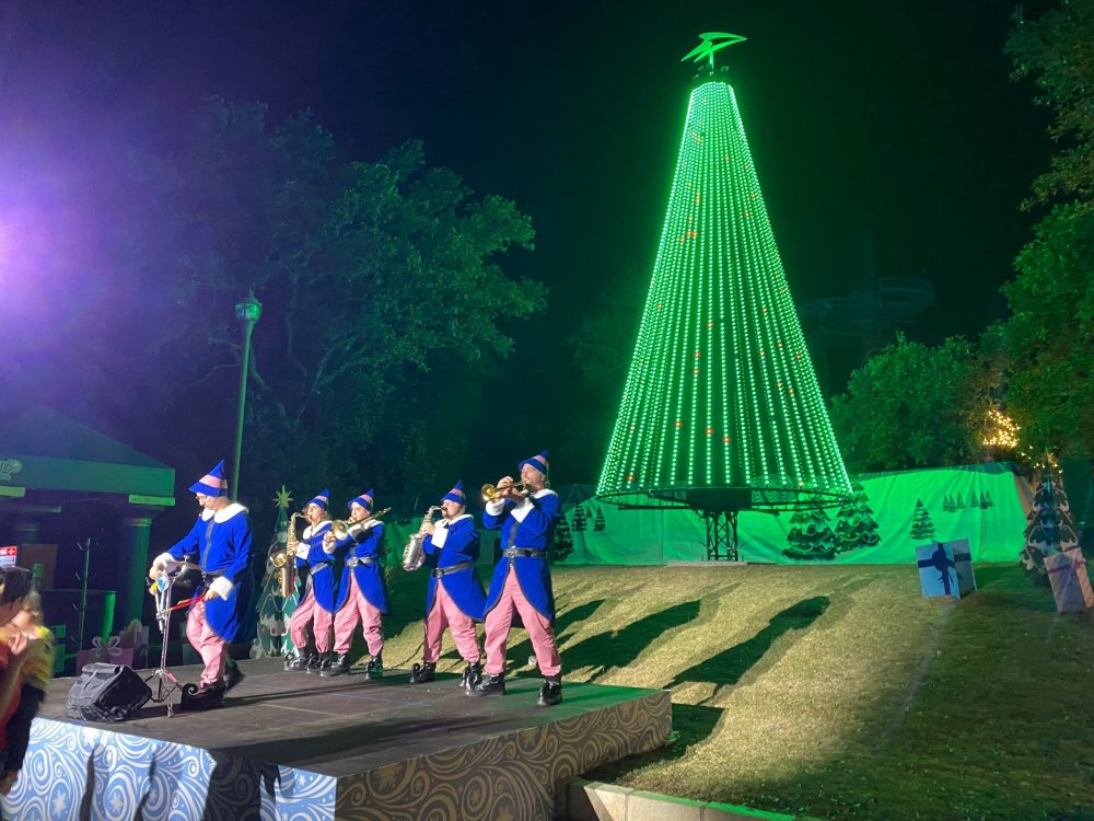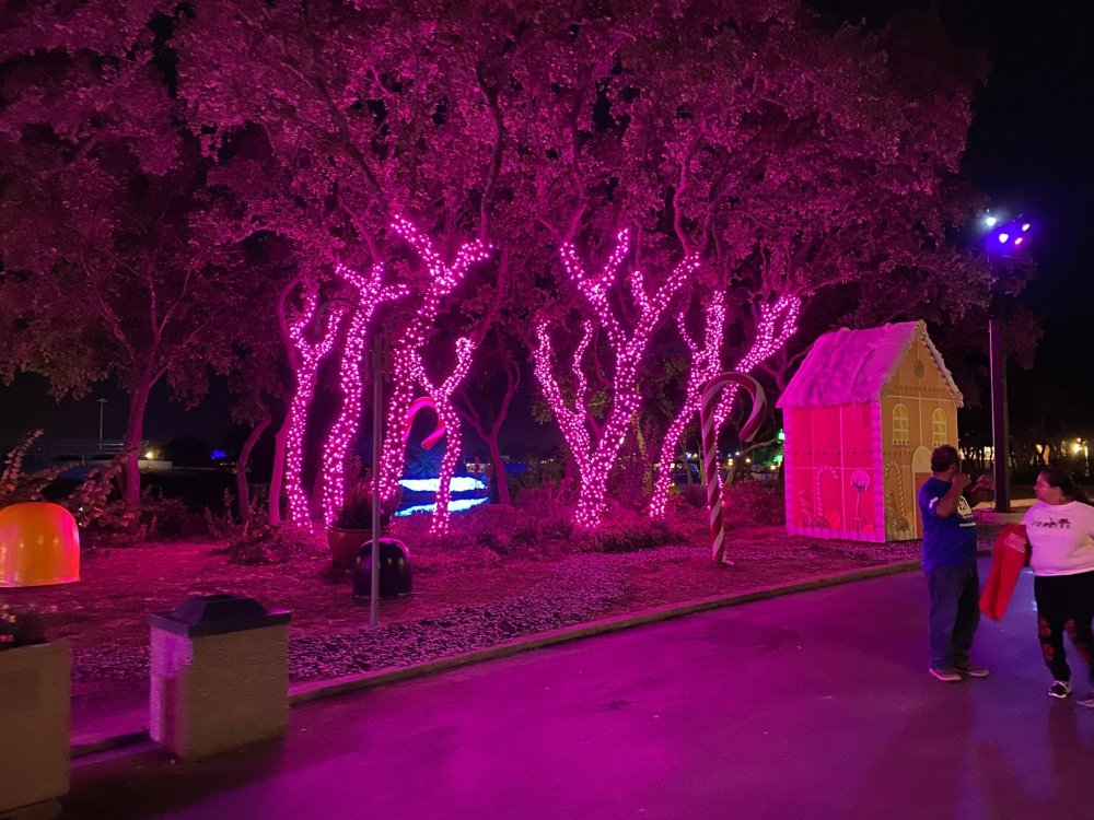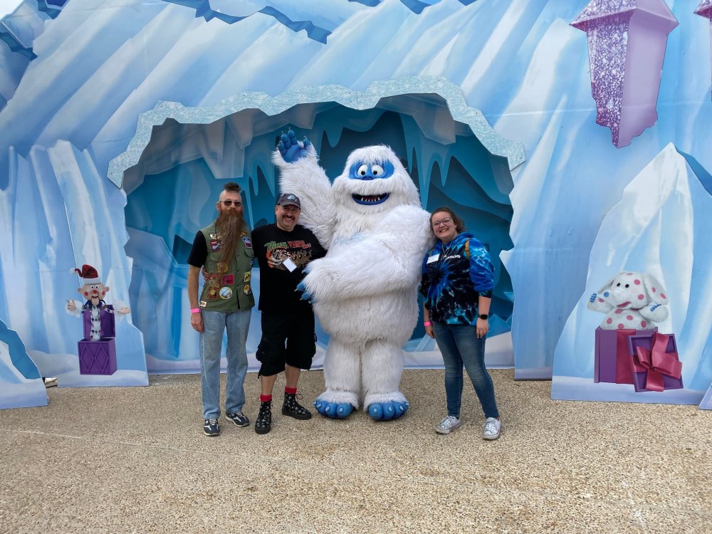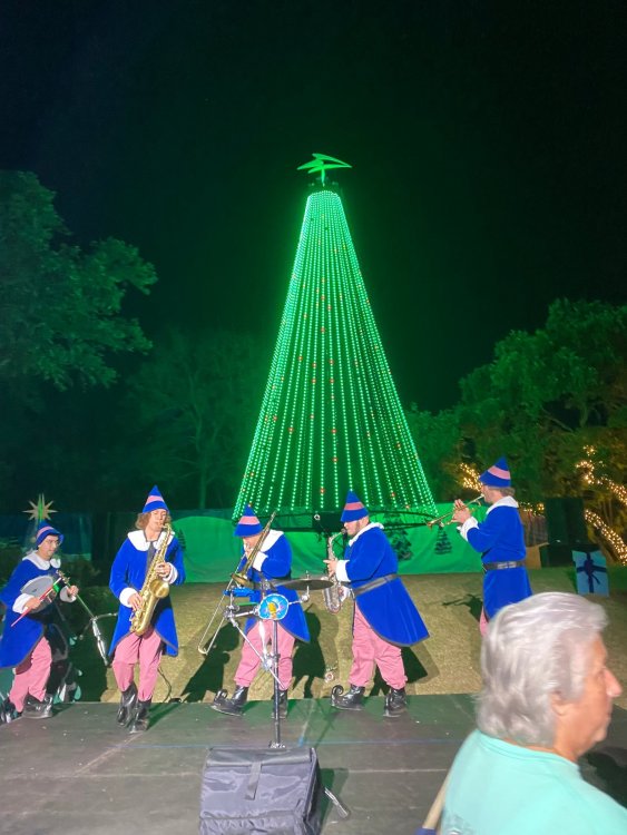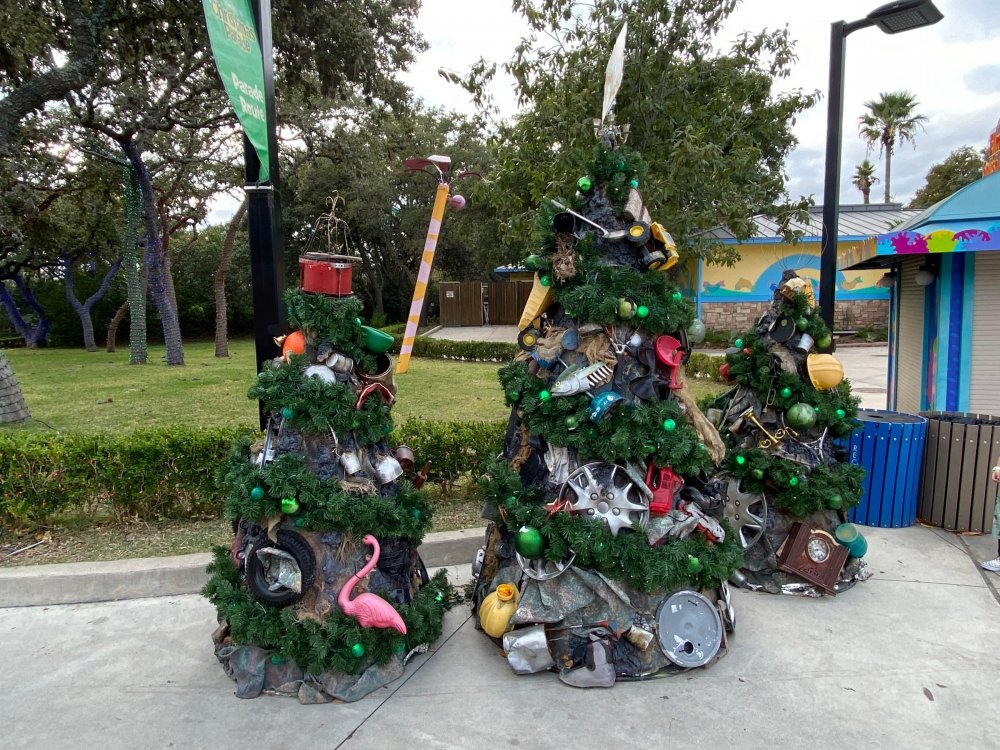 SWSA day concluded: so walking back from the car, was able to get a picture of the big "tree" that SWSA has at the entrance to the parking lot. Unfortunately, the Parking lot lights caused my iPhone 11 to pick up a lot of extra, and kinda put it into "night mode" and washed them out a little. same issue with this one.. tho as I got away from the parking lot lights, the night shots got better. they're not kidding around when they say it's the largest amount of lights in Texas. I mean, this is still OUTSIDE the main gates. . so many lights, all along the outer fence of the park. and the "welcome gates" are impressive as hell at night: once you actually get into the park, it's even more impressive in places. this whole area was hosted by Coca-Cola, and had the Red/White colors and the Polar Bear inflatables (drinking cokes of course). . . and a pop up bar that was offering all kinds of Coke drinks with and without alcohol. since we had just finished eating, I didn't try anything else, sadly, but I expect will be back at some point in Dec, (since have a pass now) and will try some of them out then. walking towards the lagoon (we were headed for a night ride on Texas Stingray since we didnt' have any evening ERT on it, so were just gonna stand in line) is so dang impressive. there were multiple stages set up along the pathways, and all of the performers were excellent. I called these guys the "nudies". . since - tho it's clear in the pics they are wearing pink pants? . . . in person, they were more "flesh" colored. .and as we came upon them, I really did a double take, as they looked like they were naked from the waist down! (LOL). the "brass" Christmas Carols were lovely tho, and drew a pretty good crowd in the walkway. they didn't have the lights ON Journey to Atlantis itself (but the event had just opened, so maybe still to come?), but the entire fence around it (and trees within it) were wrapped and looked stunning: I was shocked that although the park had gotten really crowded (I think I heard someone at ERT saying over 20,000 came in after 5:30 when it got dark), the line for Texas Stingray was still only ~15 minutes - even with only 1 train. here's what the majority of the queue looked like: after our ride, Oren, Sean, Paige and myself continued around the Lagoon, to take in the lights, and enjoy the scenery: lovely angle. . my jowls really stand out but I loved how Oren tucked his long beard into his vest for our ride on Stingray.. and in this pic he hadn't' untucked it yet. . LOL another performer over by Rio Loco entrance - who was really quite good. . she sounded a lot like Jewel. we stood and listened to her for a little bit. and then noticed Santa was meeting/greeting just behind us. Didn't get in line for him, but once we noticed he was wearing Red Leather Chaps? (we decided they are assless chaps, to counteract the Texas heat).. well. . just HAD to get a picture ! We headed over to the penguins - which was open, tho the Puffin portion was dark .. past their bedtime, I guess) and the whole building is just DRIPPING with lights. It really looked amazing. . and all around the front of the exhibit there were a whole bunch of "themed" Snowmen - including these "Blues Brothers" and this darkly humorous "San Antonio Spurs" Snowman who tossed his head, and kept the ball. dark! over by Steel Eel, the area seemed to be themed to CandyLand..with a multicolored light up path, giant gumdrops. . and was very purple. looking at the show schedule, it looked like there was an Orca show at 8:30. . which was perfect, since park closed at 9, and ERT started then. so we cut thru Sesame Street Bay of Play to head to Orca stadium. cool. . the "trash trees" even have lights on them. . and appropriately, the lights on one of em don't work. at the Orca show, Paige was VERY concerned we were gonna get wet - as basically 2/3rds of the stadium is tagged as "Splash Zone". But I went by how wet the floor was, and simply kept moving until we got to a section where the floor was mostly dry, and we sat pretty far up. So tho she stressed about it, we didnt' get wet - tho a lot of folks did, as this show had the BIG Orcas out, and they certainly made quite the splash during the show. of the 3 "animal" shows we saw today, this one was the least adapted to the Holiday Lights spirit. . . . really, all they did was put Snowflake cutouts along the tank, and called it a day, and just did the standard show (as far as I could tell). which is fine, as the show is quite enjoyable - and educational. It's just not very Christmasy. here's pics from it - as noted. . the big un Orcas were out performing today: Feeeeeed meeeeeeee ! the show over, most everyone headed to the left towards the front gates. .but we (with our neon pink wristbands indicating part of the ACE event) headed right, and went to Wave Breaker to meet up, and start the hour ERT on WaveBreaker, Great White, and Steel Eel. this time when passing this hysterical tackiness tho, I stopped and took a pic. This is close to where Santa is. . and yes. . it's a "Boot Tree" HAHAHAHAHAHA Hi Santa! we went to get in line for WaveBreaker 1st, even tho I don't think it's a super exciting coaster. But since we were there for ERT, we were able to go wherever we wanted, and decided to head to the back row. ok. . the back absolutely makes a difference (as I suspect riding at night did). . but this felt WAY faster in the back. Heck, I lost my necklace on it.. just blew right off me! so I'll say, night ride in the very back? elevates this coaster to at least a 7. Oh, it's still a family coaster, but daytime in the front is a 4-5. . I found it much more fun at night in the back. (in this pic too, you can see the penguin house with all the "dripping" blue lights. . .so lovely) and a full moon too? ooooo. . we were told riding Steel Eel (or as I call it: "ow, my balls!") during a full moon will bring good luck. So we decided we'd head over there after this ride and we'd all ride it 