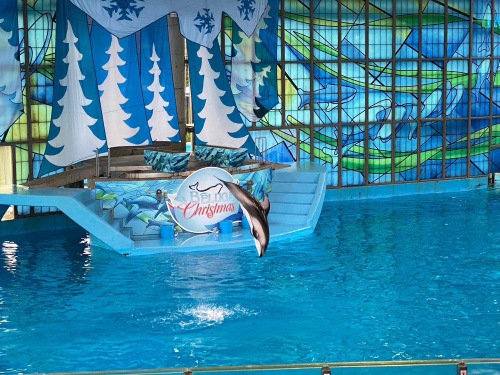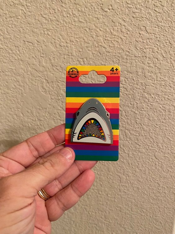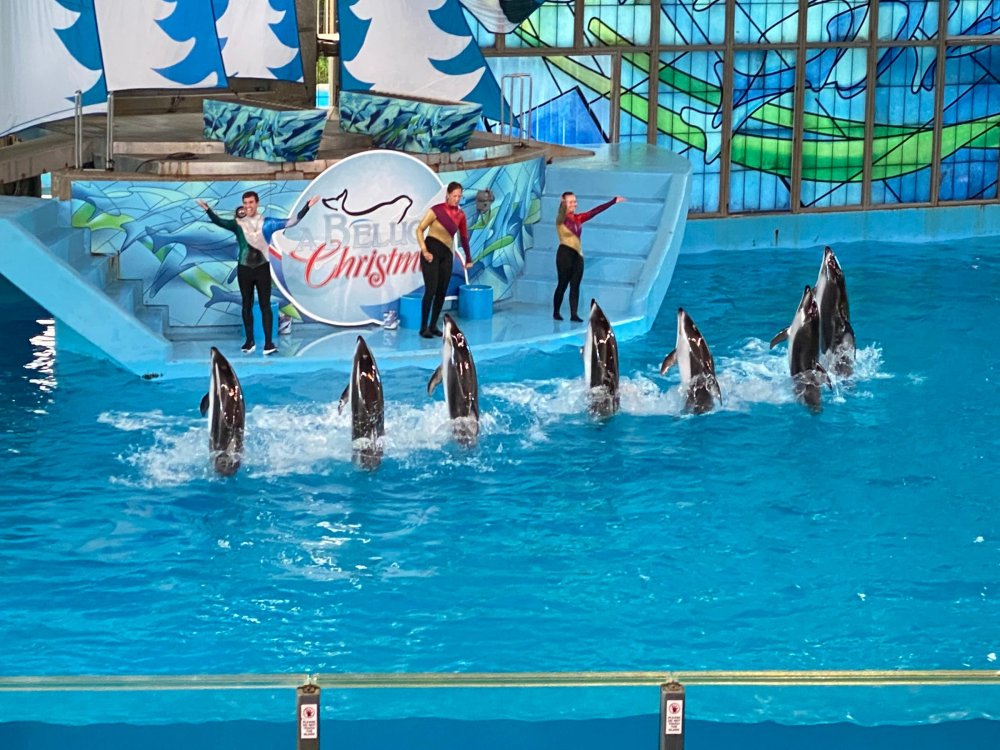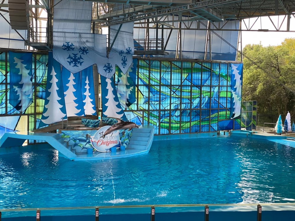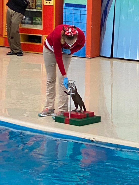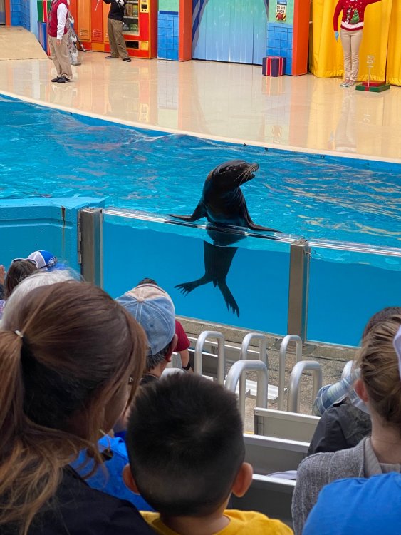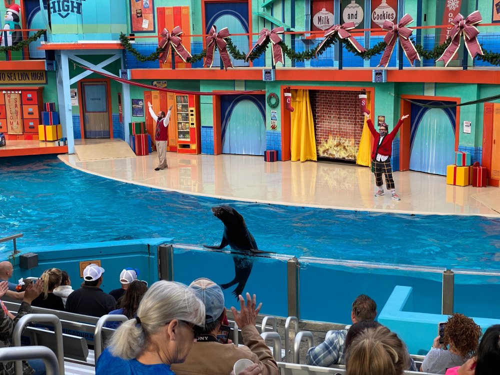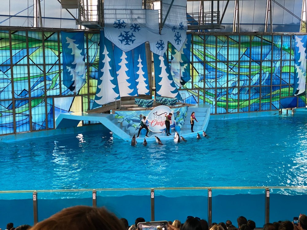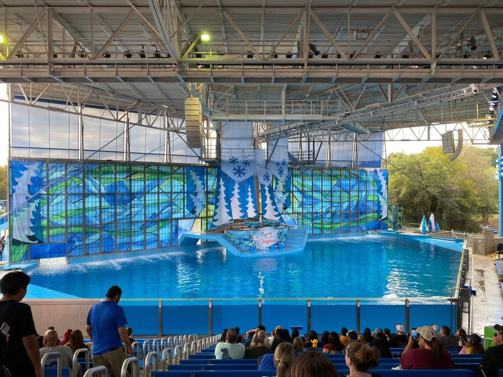 SWSA continued: after dropping off Sean at the hardhat tour, we continued on to the Beluga Show - only to discover we had missed that too during our delay on Wave Breaker but, we saw "Clyde & Seamore's Countdown to Christmas" was showing in about 30 minutes, so headed over that way to Sea Lion stadium. along the way tho, we passed Bumble who was out doing meet and greet . and of COURSE I'm a photo-op whore, so we hopped in line (gently dragging Oren & Paige with me, but they didn't protest too much): and an Elf out on the pathway being super cheerful also got stopped for a photo on the way to the stadium. the live entertainment thruout the park was quite good, with an excellent level of talent, and man these ladies had great voices too. Mariachi Christmas Carols for the win! I had missed the SeaLion show on my prior visit to SeaWorld SA, so had no idea what to expect. I mean, I knew it would be cheesy as all hell (which it was - even including a mime!!!), but I wasn't expecting the humor to skew a little "dark" - TWO jokes about death (including a melted Frosty being dumped back into the main tank) and vomit joke about getting car-sick rushing to the mall. Lots of slapstick with the mime and a female elf. the show is about Clyde and SeaMore getting SWSA ready for Santa to visit, and checking things off their list they need to do in order to get Santa to come visit. but it was cute, and a nice use of ~25 minutes. the otter is ADORBS! (even if he seemed to have no idea what was going on, and just did it for the treat) it was quite a full crowd, but once the show was over, pretty much everyone went next door to the habitat to look at the Sea Lions sunning on the rocks (something Paige and I had peeked at on Halloween, but the area was closed and we were shooed away (politely) at that time). lots of folks buying the cups of food to feed them tho. . . we were close to the front gates, so I split off to go to guest services to upgrade my day ticket to a season pass. it was very easy to do, tho "odd" in that "the machine is still broken" so my 1 year pass - good for 1 year from the date I purchased, since SWSA is a year round park - is a little piece of paper that I hope I don't tear or rip in the next 12 months. (Maybe I should go get it laminated?) then I headed back to go meet up with Paige/Oren over by the meet & greet (since Paige is friends with someone in the costumes and was gonna visit) . More stilts! yay!!! bet this is gonna look great once it gets dark! another look at the imposing Tidal Surge. This ride is gonna be great! found Paige, but before we left, I had to get in line for another pic, since Rudolf (red nose included), and Clarice were out! and just before we headed out to grab a ride on the Carousel (we had time before the 2nd attempt at the Beluga show), Bumble came back out. .so I took the opportunity for a solo pic - LURVE him: be-still my heart! going into Sesame Street "Bay of Play" we passsed these that caught my eye. are these. . .. . Christmas trees made out of trash? YES.. what an awesome touch, that if you weren't paying attention to, could easily walk past without noticing. . LOL Hi Oscar! tho I love me a photo op? the line for this group was way too long than I was willing to wait in (especially since it was almost all parent with tiny kids. . I mean, it's Sesame Street, I get it. .the right audience was in line for pics). So I just settled for a walk by picture. then onto the Carousel - which despite the crowd levels in the Sesame Street area, was only a 1 cycle wait. Carousel credit received, we headed over to Beluga Stadium to meet up with Oren for the show: "A Beluga Christmas" this one was a reach, because there really wasn't anything Christmasy about it, other than the tree banners on the backdrop, and it looked like someone when to Home Depot and bought some colored trees to put on either side of the stage. the music was sorta/kinda holiday themed, if you strained to hear it in there. . but really it was pretty much the standard show, I would say, with Belugas and Dolphins. which isn't a bad thing, I really enjoyed it. these Pacific White Sided Dolphins really get some height, and speed. Belugas! awwww. . a Momma and her calf. adorable LOL. . looks like it's jumping the logo from this angle by the time the show ended, it was just ~ an hour until dinner. Dinner was over in Discovery Point - which is outside the main gates of SeaWorld across the entrance plaza. But they have Bottle Nose Dolphin exhibit and a shark reef over there, so we decided to head that way a little early to check those out. there was an animal interaction tour going on, and they were feeding the bottlenose dolphins, as well as learning some of the training. and luckily we just happened to be in the perfect spot for when the trainer motioned them to jump: unfortunately the Shark Reef is closed at the moment as they are re-doing the floors in there, so we spent some time visiting with other ACE and TSU attendees, before heading into the underwater portion of the Dolphin exhibit. and then it was time for dinner: this time several different Pasta options/sauces, and a wonderful cinnamon/apple cobbler for desert. just the meals were well worth the cost of the event - not to mention that I was able to upgrade my admission into a Season Pass. I did NOT leave hungry I also won a gift bag at dinner with a small stuffed Shamu, a Coca-Cola Scarf, and an ornament. and found this (one of only 3 - of which I bought 2 of them) leftover from June "Pride" pins it's a Mega-Gay shark (if the rainbow teeth and glitter maw didn't give it away, they also put it on a rainbow backing to sell. . .LOL). too cute to pass up, so bought one for me, and one to have for a friend. then made the quick trip to the car to drop off the stuff and my hat/sunglasses, before heading back into the park proper to enjoy the lights, Orca show, & evening ERT. SWSA day to be concluded. . .