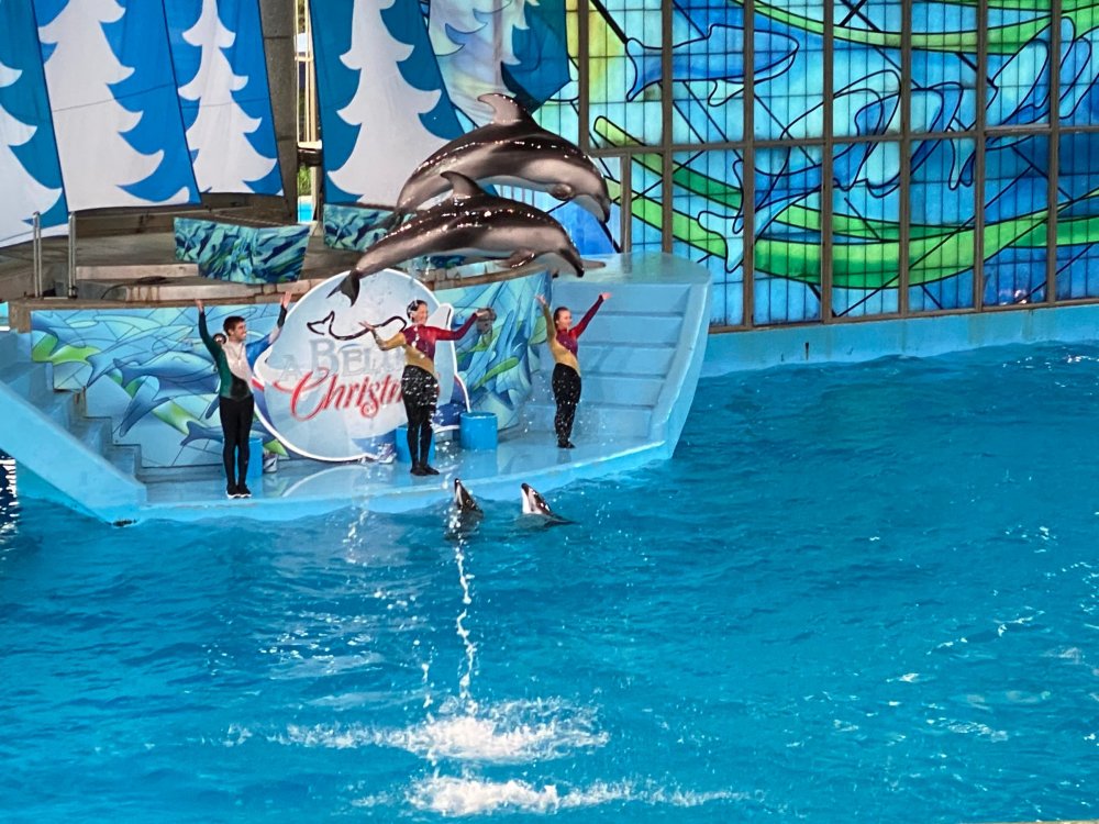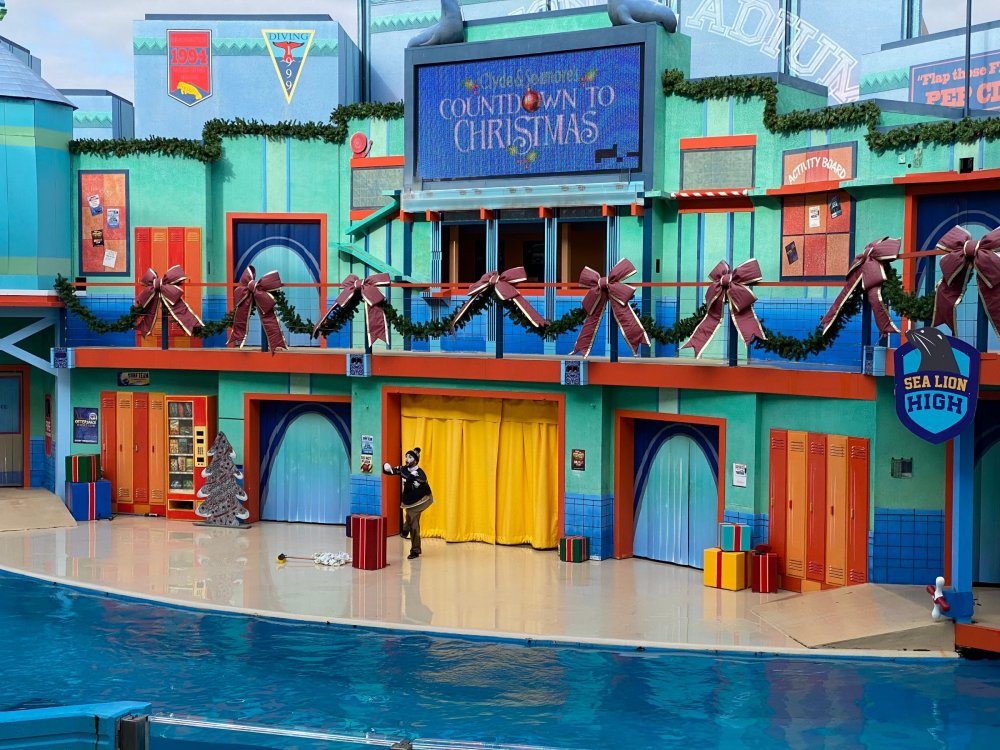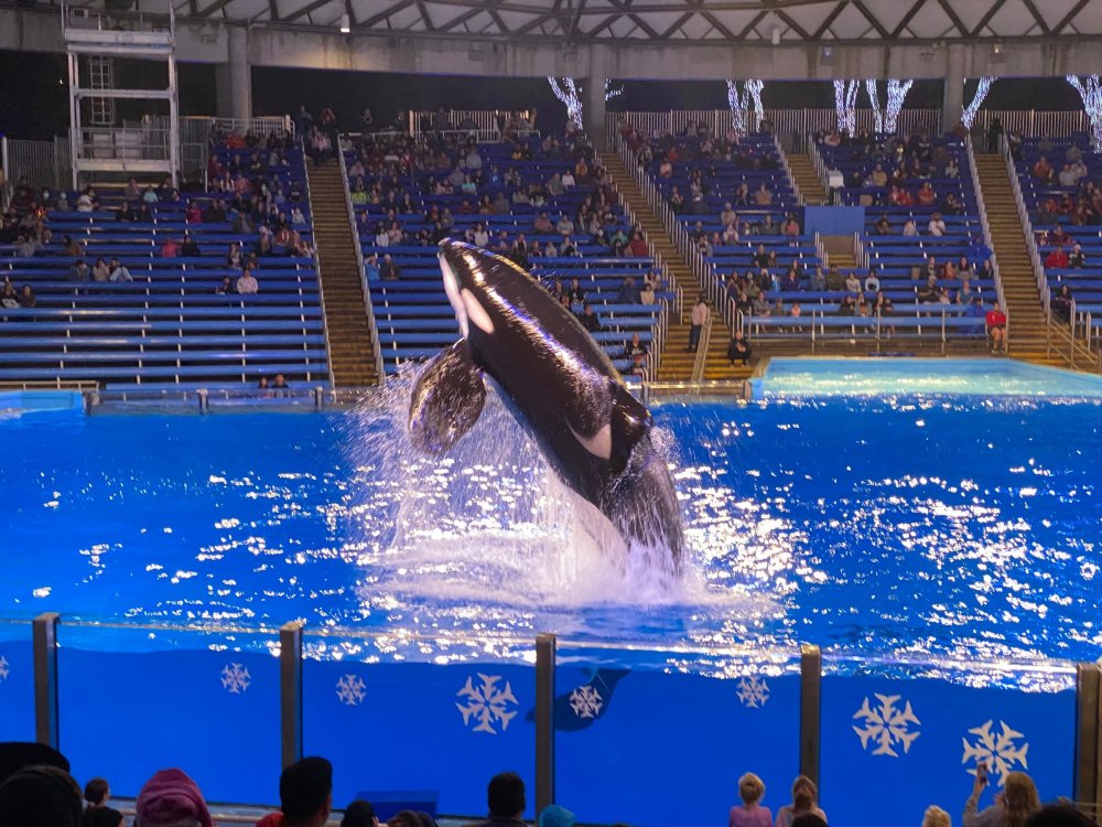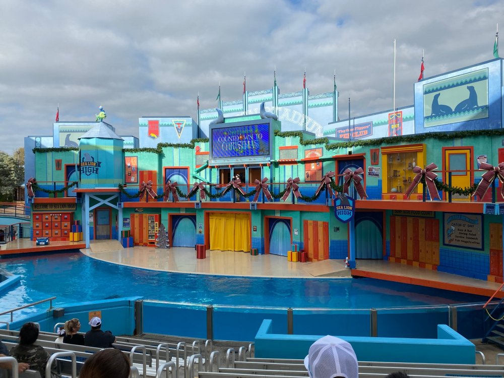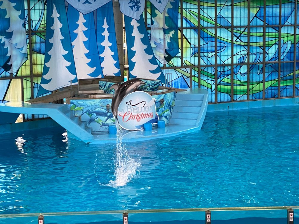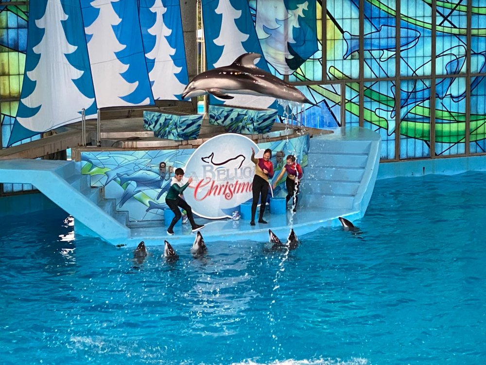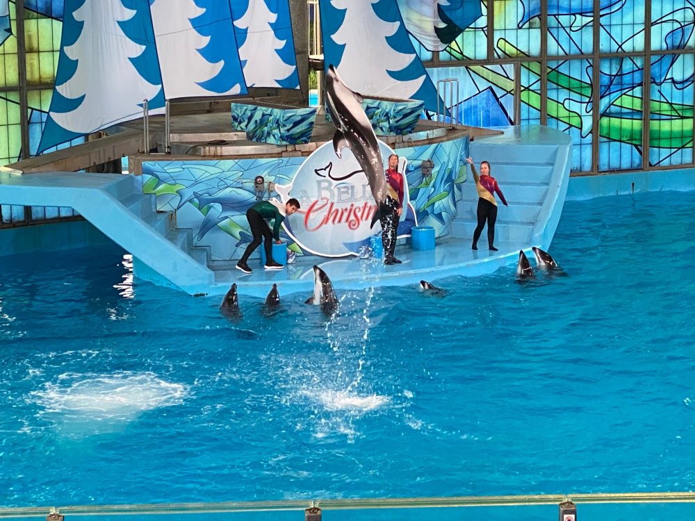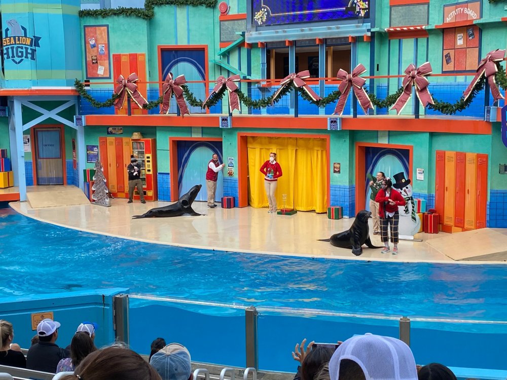 SWSA continued: after dropping off Sean at the hardhat tour, we continued on to the Beluga Show - only to discover we had missed that too during our delay on Wave Breaker but, we saw "Clyde & Seamore's Countdown to Christmas" was showing in about 30 minutes, so headed over that way to Sea Lion stadium. along the way tho, we passed Bumble who was out doing meet and greet . and of COURSE I'm a photo-op whore, so we hopped in line (gently dragging Oren & Paige with me, but they didn't protest too much): and an Elf out on the pathway being super cheerful also got stopped for a photo on the way to the stadium. the live entertainment thruout the park was quite good, with an excellent level of talent, and man these ladies had great voices too. Mariachi Christmas Carols for the win! I had missed the SeaLion show on my prior visit to SeaWorld SA, so had no idea what to expect. I mean, I knew it would be cheesy as all hell (which it was - even including a mime!!!), but I wasn't expecting the humor to skew a little "dark" - TWO jokes about death (including a melted Frosty being dumped back into the main tank) and vomit joke about getting car-sick rushing to the mall. Lots of slapstick with the mime and a female elf. the show is about Clyde and SeaMore getting SWSA ready for Santa to visit, and checking things off their list they need to do in order to get Santa to come visit. but it was cute, and a nice use of ~25 minutes. the otter is ADORBS! (even if he seemed to have no idea what was going on, and just did it for the treat) it was quite a full crowd, but once the show was over, pretty much everyone went next door to the habitat to look at the Sea Lions sunning on the rocks (something Paige and I had peeked at on Halloween, but the area was closed and we were shooed away (politely) at that time). lots of folks buying the cups of food to feed them tho. . . we were close to the front gates, so I split off to go to guest services to upgrade my day ticket to a season pass. it was very easy to do, tho "odd" in that "the machine is still broken" so my 1 year pass - good for 1 year from the date I purchased, since SWSA is a year round park - is a little piece of paper that I hope I don't tear or rip in the next 12 months. (Maybe I should go get it laminated?) then I headed back to go meet up with Paige/Oren over by the meet & greet (since Paige is friends with someone in the costumes and was gonna visit) . More stilts! yay!!! bet this is gonna look great once it gets dark! another look at the imposing Tidal Surge. This ride is gonna be great! found Paige, but before we left, I had to get in line for another pic, since Rudolf (red nose included), and Clarice were out! and just before we headed out to grab a ride on the Carousel (we had time before the 2nd attempt at the Beluga show), Bumble came back out. .so I took the opportunity for a solo pic - LURVE him: be-still my heart! going into Sesame Street "Bay of Play" we passsed these that caught my eye. are these. . .. . Christmas trees made out of trash? YES.. what an awesome touch, that if you weren't paying attention to, could easily walk past without noticing. . LOL Hi Oscar! tho I love me a photo op? the line for this group was way too long than I was willing to wait in (especially since it was almost all parent with tiny kids. . I mean, it's Sesame Street, I get it. .the right audience was in line for pics). So I just settled for a walk by picture. then onto the Carousel - which despite the crowd levels in the Sesame Street area, was only a 1 cycle wait. Carousel credit received, we headed over to Beluga Stadium to meet up with Oren for the show: "A Beluga Christmas" this one was a reach, because there really wasn't anything Christmasy about it, other than the tree banners on the backdrop, and it looked like someone when to Home Depot and bought some colored trees to put on either side of the stage. the music was sorta/kinda holiday themed, if you strained to hear it in there. . but really it was pretty much the standard show, I would say, with Belugas and Dolphins. which isn't a bad thing, I really enjoyed it. these Pacific White Sided Dolphins really get some height, and speed. Belugas! awwww. . a Momma and her calf. adorable LOL. . looks like it's jumping the logo from this angle by the time the show ended, it was just ~ an hour until dinner. Dinner was over in Discovery Point - which is outside the main gates of SeaWorld across the entrance plaza. But they have Bottle Nose Dolphin exhibit and a shark reef over there, so we decided to head that way a little early to check those out. there was an animal interaction tour going on, and they were feeding the bottlenose dolphins, as well as learning some of the training. and luckily we just happened to be in the perfect spot for when the trainer motioned them to jump: unfortunately the Shark Reef is closed at the moment as they are re-doing the floors in there, so we spent some time visiting with other ACE and TSU attendees, before heading into the underwater portion of the Dolphin exhibit. and then it was time for dinner: this time several different Pasta options/sauces, and a wonderful cinnamon/apple cobbler for desert. just the meals were well worth the cost of the event - not to mention that I was able to upgrade my admission into a Season Pass. I did NOT leave hungry I also won a gift bag at dinner with a small stuffed Shamu, a Coca-Cola Scarf, and an ornament. and found this (one of only 3 - of which I bought 2 of them) leftover from June "Pride" pins it's a Mega-Gay shark (if the rainbow teeth and glitter maw didn't give it away, they also put it on a rainbow backing to sell. . .LOL). too cute to pass up, so bought one for me, and one to have for a friend. then made the quick trip to the car to drop off the stuff and my hat/sunglasses, before heading back into the park proper to enjoy the lights, Orca show, & evening ERT. SWSA day to be concluded. . .