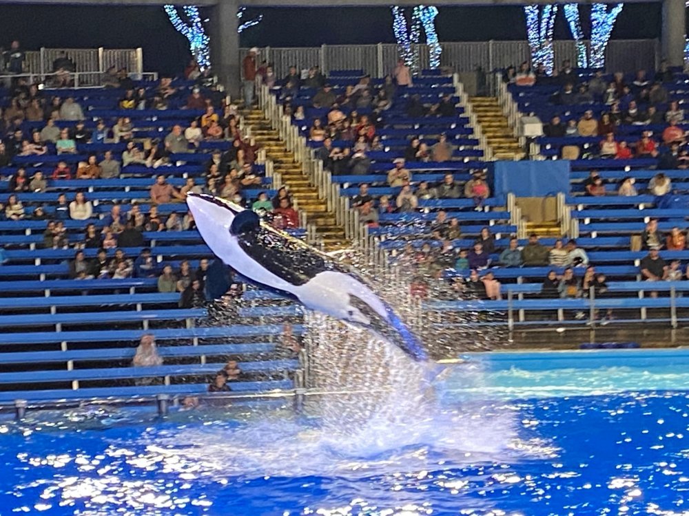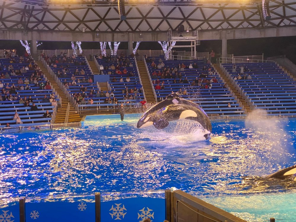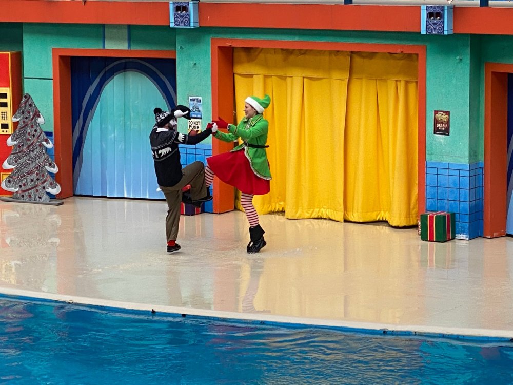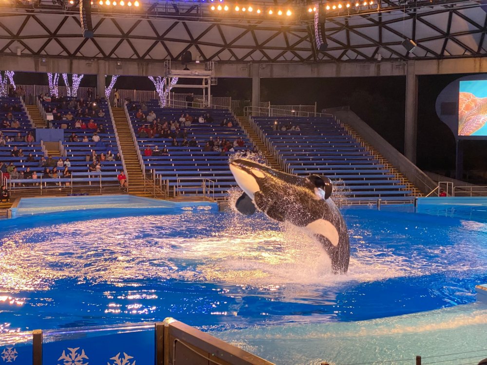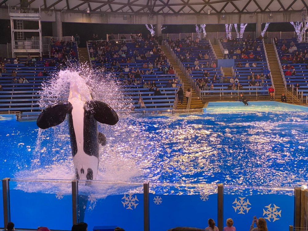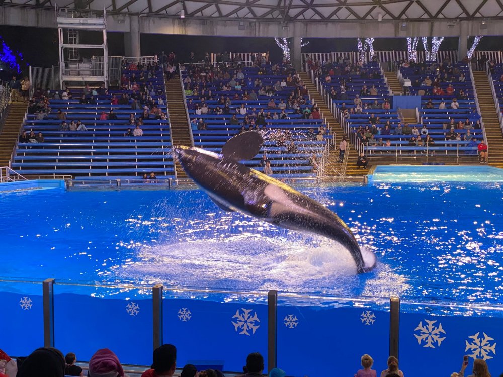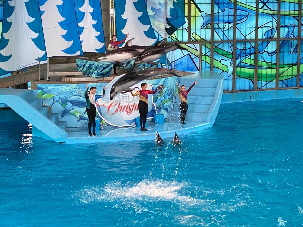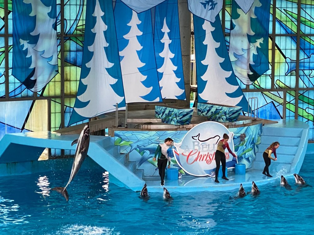 SWSA continued: after dropping off Sean at the hardhat tour, we continued on to the Beluga Show - only to discover we had missed that too during our delay on Wave Breaker but, we saw "Clyde & Seamore's Countdown to Christmas" was showing in about 30 minutes, so headed over that way to Sea Lion stadium. along the way tho, we passed Bumble who was out doing meet and greet . and of COURSE I'm a photo-op whore, so we hopped in line (gently dragging Oren & Paige with me, but they didn't protest too much): and an Elf out on the pathway being super cheerful also got stopped for a photo on the way to the stadium. the live entertainment thruout the park was quite good, with an excellent level of talent, and man these ladies had great voices too. Mariachi Christmas Carols for the win! I had missed the SeaLion show on my prior visit to SeaWorld SA, so had no idea what to expect. I mean, I knew it would be cheesy as all hell (which it was - even including a mime!!!), but I wasn't expecting the humor to skew a little "dark" - TWO jokes about death (including a melted Frosty being dumped back into the main tank) and vomit joke about getting car-sick rushing to the mall. Lots of slapstick with the mime and a female elf. the show is about Clyde and SeaMore getting SWSA ready for Santa to visit, and checking things off their list they need to do in order to get Santa to come visit. but it was cute, and a nice use of ~25 minutes. the otter is ADORBS! (even if he seemed to have no idea what was going on, and just did it for the treat) it was quite a full crowd, but once the show was over, pretty much everyone went next door to the habitat to look at the Sea Lions sunning on the rocks (something Paige and I had peeked at on Halloween, but the area was closed and we were shooed away (politely) at that time). lots of folks buying the cups of food to feed them tho. . . we were close to the front gates, so I split off to go to guest services to upgrade my day ticket to a season pass. it was very easy to do, tho "odd" in that "the machine is still broken" so my 1 year pass - good for 1 year from the date I purchased, since SWSA is a year round park - is a little piece of paper that I hope I don't tear or rip in the next 12 months. (Maybe I should go get it laminated?) then I headed back to go meet up with Paige/Oren over by the meet & greet (since Paige is friends with someone in the costumes and was gonna visit) . More stilts! yay!!! bet this is gonna look great once it gets dark! another look at the imposing Tidal Surge. This ride is gonna be great! found Paige, but before we left, I had to get in line for another pic, since Rudolf (red nose included), and Clarice were out! and just before we headed out to grab a ride on the Carousel (we had time before the 2nd attempt at the Beluga show), Bumble came back out. .so I took the opportunity for a solo pic - LURVE him: be-still my heart! going into Sesame Street "Bay of Play" we passsed these that caught my eye. are these. . .. . Christmas trees made out of trash? YES.. what an awesome touch, that if you weren't paying attention to, could easily walk past without noticing. . LOL Hi Oscar! tho I love me a photo op? the line for this group was way too long than I was willing to wait in (especially since it was almost all parent with tiny kids. . I mean, it's Sesame Street, I get it. .the right audience was in line for pics). So I just settled for a walk by picture. then onto the Carousel - which despite the crowd levels in the Sesame Street area, was only a 1 cycle wait. Carousel credit received, we headed over to Beluga Stadium to meet up with Oren for the show: "A Beluga Christmas" this one was a reach, because there really wasn't anything Christmasy about it, other than the tree banners on the backdrop, and it looked like someone when to Home Depot and bought some colored trees to put on either side of the stage. the music was sorta/kinda holiday themed, if you strained to hear it in there. . but really it was pretty much the standard show, I would say, with Belugas and Dolphins. which isn't a bad thing, I really enjoyed it. these Pacific White Sided Dolphins really get some height, and speed. Belugas! awwww. . a Momma and her calf. adorable LOL. . looks like it's jumping the logo from this angle by the time the show ended, it was just ~ an hour until dinner. Dinner was over in Discovery Point - which is outside the main gates of SeaWorld across the entrance plaza. But they have Bottle Nose Dolphin exhibit and a shark reef over there, so we decided to head that way a little early to check those out. there was an animal interaction tour going on, and they were feeding the bottlenose dolphins, as well as learning some of the training. and luckily we just happened to be in the perfect spot for when the trainer motioned them to jump: unfortunately the Shark Reef is closed at the moment as they are re-doing the floors in there, so we spent some time visiting with other ACE and TSU attendees, before heading into the underwater portion of the Dolphin exhibit. and then it was time for dinner: this time several different Pasta options/sauces, and a wonderful cinnamon/apple cobbler for desert. just the meals were well worth the cost of the event - not to mention that I was able to upgrade my admission into a Season Pass. I did NOT leave hungry I also won a gift bag at dinner with a small stuffed Shamu, a Coca-Cola Scarf, and an ornament. and found this (one of only 3 - of which I bought 2 of them) leftover from June "Pride" pins it's a Mega-Gay shark (if the rainbow teeth and glitter maw didn't give it away, they also put it on a rainbow backing to sell. . .LOL). too cute to pass up, so bought one for me, and one to have for a friend. then made the quick trip to the car to drop off the stuff and my hat/sunglasses, before heading back into the park proper to enjoy the lights, Orca show, & evening ERT. SWSA day to be concluded. . .