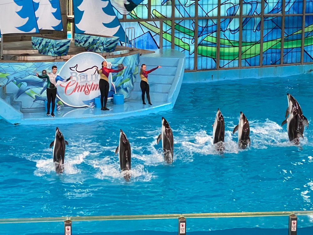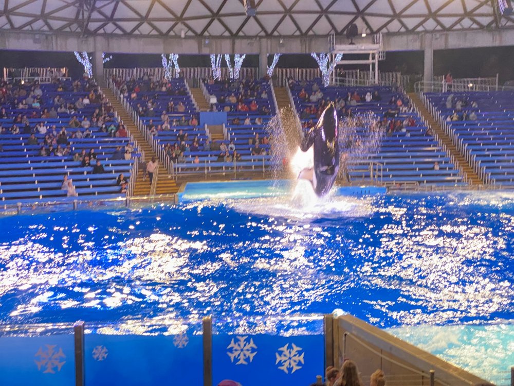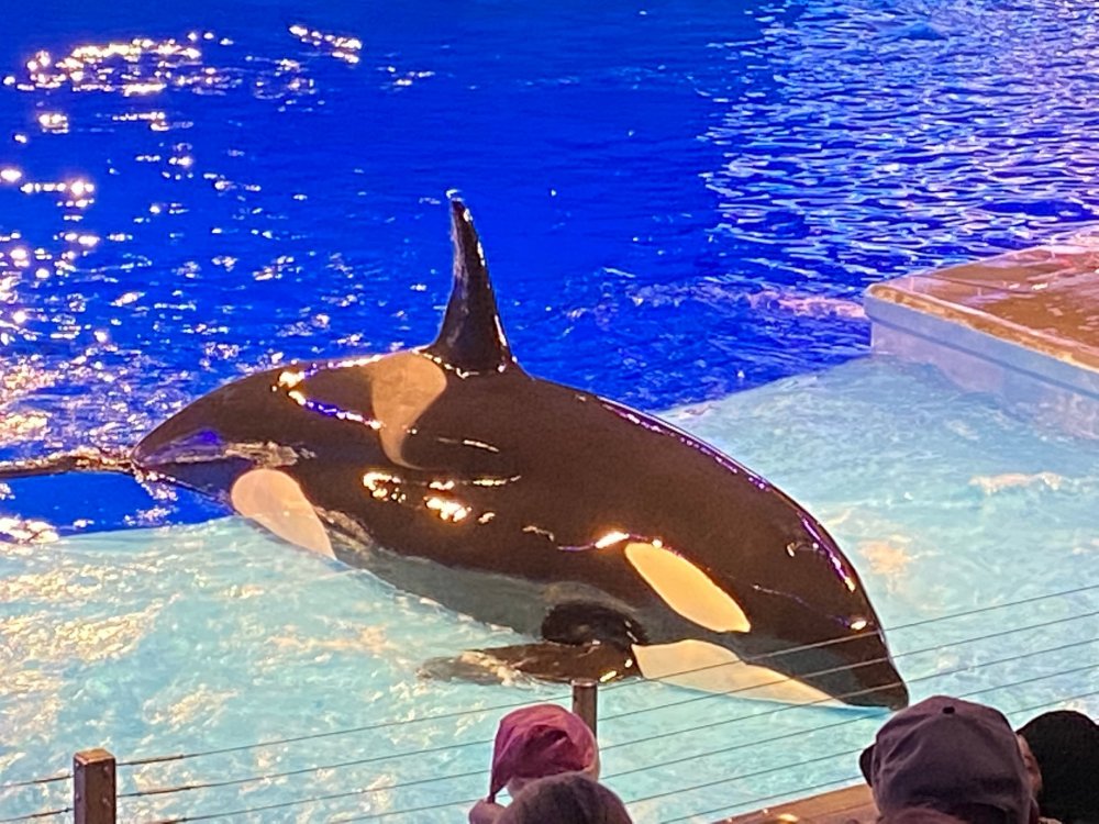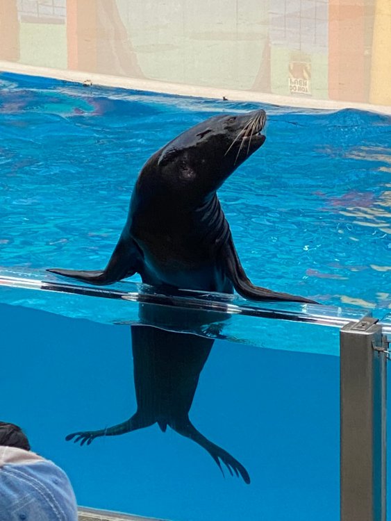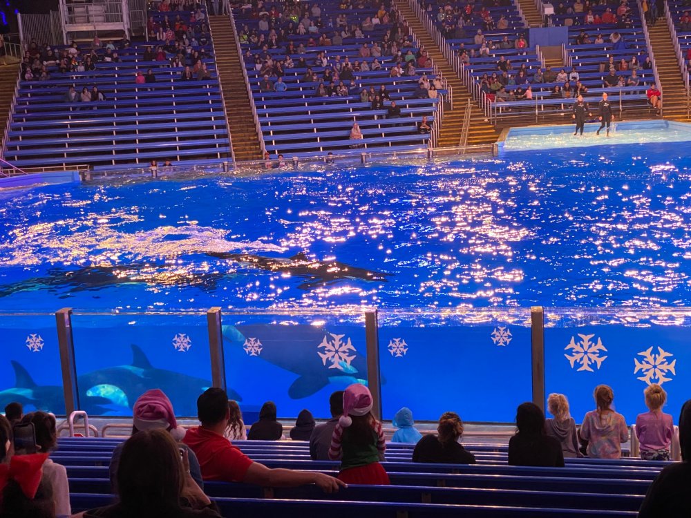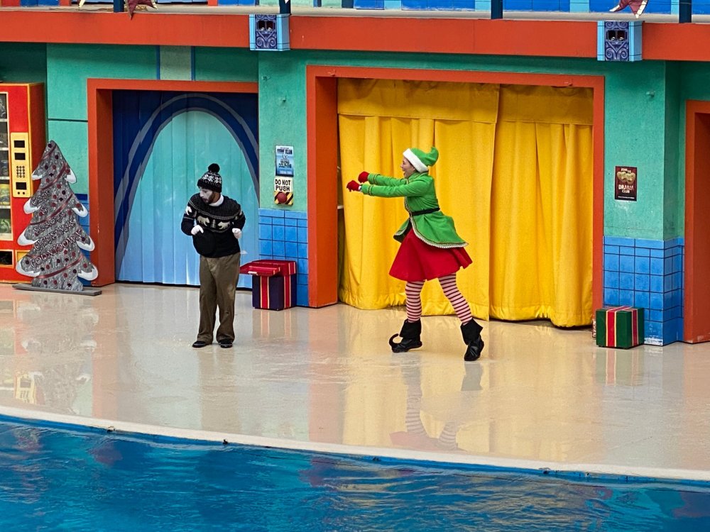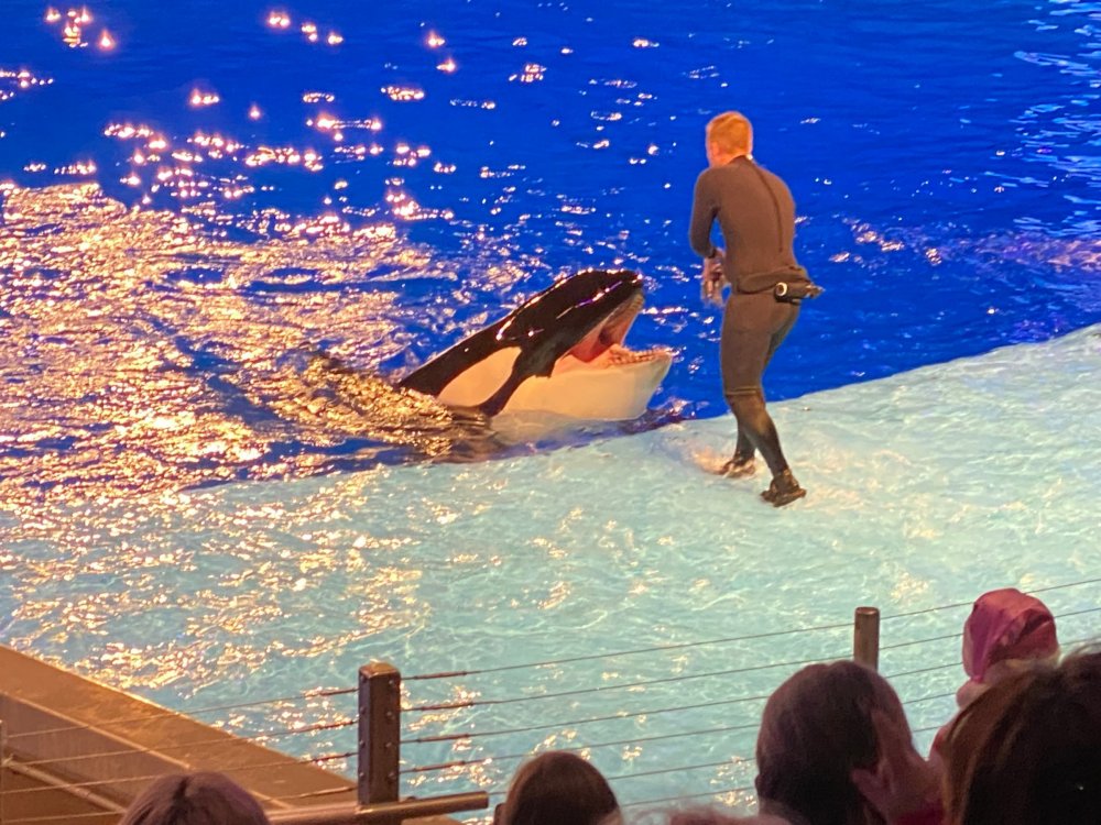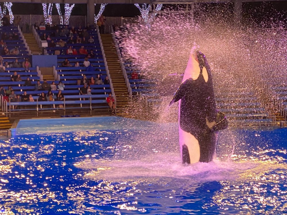 SWSA continued: after dropping off Sean at the hardhat tour, we continued on to the Beluga Show - only to discover we had missed that too during our delay on Wave Breaker but, we saw "Clyde & Seamore's Countdown to Christmas" was showing in about 30 minutes, so headed over that way to Sea Lion stadium. along the way tho, we passed Bumble who was out doing meet and greet . and of COURSE I'm a photo-op whore, so we hopped in line (gently dragging Oren & Paige with me, but they didn't protest too much): and an Elf out on the pathway being super cheerful also got stopped for a photo on the way to the stadium. the live entertainment thruout the park was quite good, with an excellent level of talent, and man these ladies had great voices too. Mariachi Christmas Carols for the win! I had missed the SeaLion show on my prior visit to SeaWorld SA, so had no idea what to expect. I mean, I knew it would be cheesy as all hell (which it was - even including a mime!!!), but I wasn't expecting the humor to skew a little "dark" - TWO jokes about death (including a melted Frosty being dumped back into the main tank) and vomit joke about getting car-sick rushing to the mall. Lots of slapstick with the mime and a female elf. the show is about Clyde and SeaMore getting SWSA ready for Santa to visit, and checking things off their list they need to do in order to get Santa to come visit. but it was cute, and a nice use of ~25 minutes. the otter is ADORBS! (even if he seemed to have no idea what was going on, and just did it for the treat) it was quite a full crowd, but once the show was over, pretty much everyone went next door to the habitat to look at the Sea Lions sunning on the rocks (something Paige and I had peeked at on Halloween, but the area was closed and we were shooed away (politely) at that time). lots of folks buying the cups of food to feed them tho. . . we were close to the front gates, so I split off to go to guest services to upgrade my day ticket to a season pass. it was very easy to do, tho "odd" in that "the machine is still broken" so my 1 year pass - good for 1 year from the date I purchased, since SWSA is a year round park - is a little piece of paper that I hope I don't tear or rip in the next 12 months. (Maybe I should go get it laminated?) then I headed back to go meet up with Paige/Oren over by the meet & greet (since Paige is friends with someone in the costumes and was gonna visit) . More stilts! yay!!! bet this is gonna look great once it gets dark! another look at the imposing Tidal Surge. This ride is gonna be great! found Paige, but before we left, I had to get in line for another pic, since Rudolf (red nose included), and Clarice were out! and just before we headed out to grab a ride on the Carousel (we had time before the 2nd attempt at the Beluga show), Bumble came back out. .so I took the opportunity for a solo pic - LURVE him: be-still my heart! going into Sesame Street "Bay of Play" we passsed these that caught my eye. are these. . .. . Christmas trees made out of trash? YES.. what an awesome touch, that if you weren't paying attention to, could easily walk past without noticing. . LOL Hi Oscar! tho I love me a photo op? the line for this group was way too long than I was willing to wait in (especially since it was almost all parent with tiny kids. . I mean, it's Sesame Street, I get it. .the right audience was in line for pics). So I just settled for a walk by picture. then onto the Carousel - which despite the crowd levels in the Sesame Street area, was only a 1 cycle wait. Carousel credit received, we headed over to Beluga Stadium to meet up with Oren for the show: "A Beluga Christmas" this one was a reach, because there really wasn't anything Christmasy about it, other than the tree banners on the backdrop, and it looked like someone when to Home Depot and bought some colored trees to put on either side of the stage. the music was sorta/kinda holiday themed, if you strained to hear it in there. . but really it was pretty much the standard show, I would say, with Belugas and Dolphins. which isn't a bad thing, I really enjoyed it. these Pacific White Sided Dolphins really get some height, and speed. Belugas! awwww. . a Momma and her calf. adorable LOL. . looks like it's jumping the logo from this angle by the time the show ended, it was just ~ an hour until dinner. Dinner was over in Discovery Point - which is outside the main gates of SeaWorld across the entrance plaza. But they have Bottle Nose Dolphin exhibit and a shark reef over there, so we decided to head that way a little early to check those out. there was an animal interaction tour going on, and they were feeding the bottlenose dolphins, as well as learning some of the training. and luckily we just happened to be in the perfect spot for when the trainer motioned them to jump: unfortunately the Shark Reef is closed at the moment as they are re-doing the floors in there, so we spent some time visiting with other ACE and TSU attendees, before heading into the underwater portion of the Dolphin exhibit. and then it was time for dinner: this time several different Pasta options/sauces, and a wonderful cinnamon/apple cobbler for desert. just the meals were well worth the cost of the event - not to mention that I was able to upgrade my admission into a Season Pass. I did NOT leave hungry I also won a gift bag at dinner with a small stuffed Shamu, a Coca-Cola Scarf, and an ornament. and found this (one of only 3 - of which I bought 2 of them) leftover from June "Pride" pins it's a Mega-Gay shark (if the rainbow teeth and glitter maw didn't give it away, they also put it on a rainbow backing to sell. . .LOL). too cute to pass up, so bought one for me, and one to have for a friend. then made the quick trip to the car to drop off the stuff and my hat/sunglasses, before heading back into the park proper to enjoy the lights, Orca show, & evening ERT. SWSA day to be concluded. . .