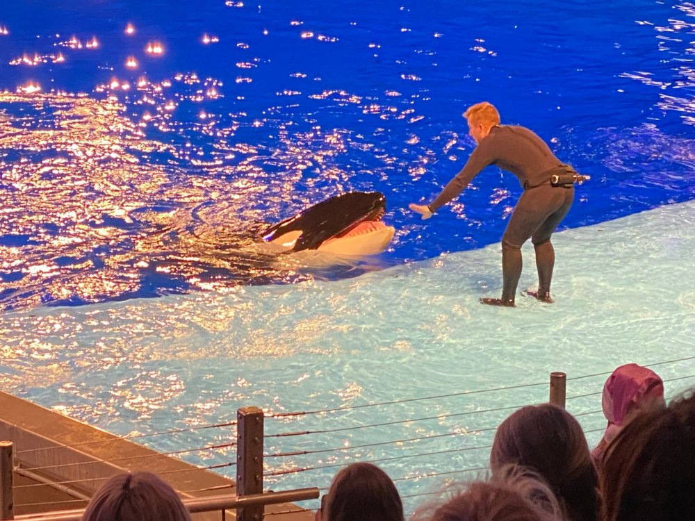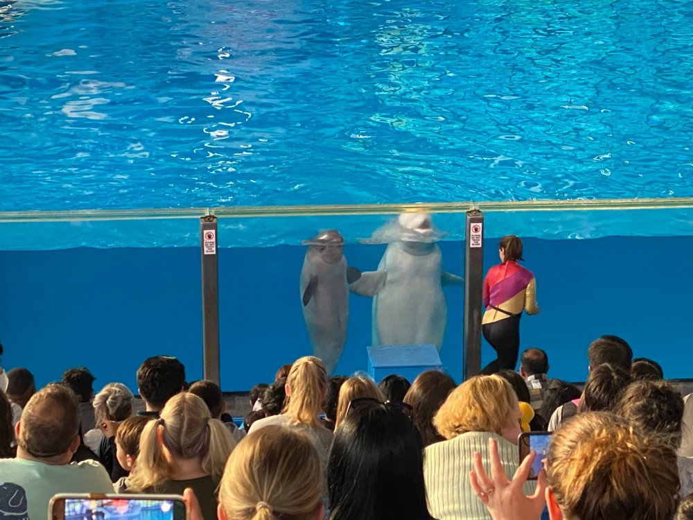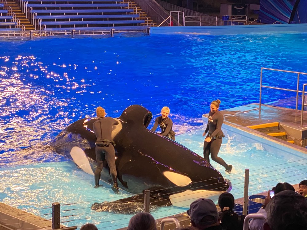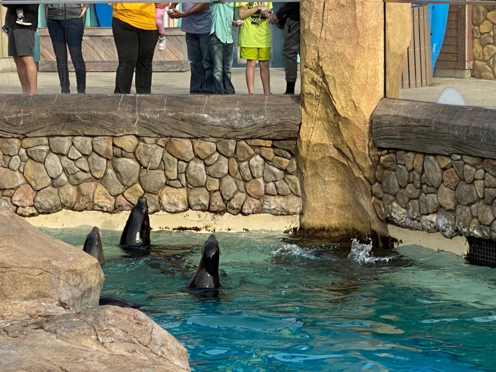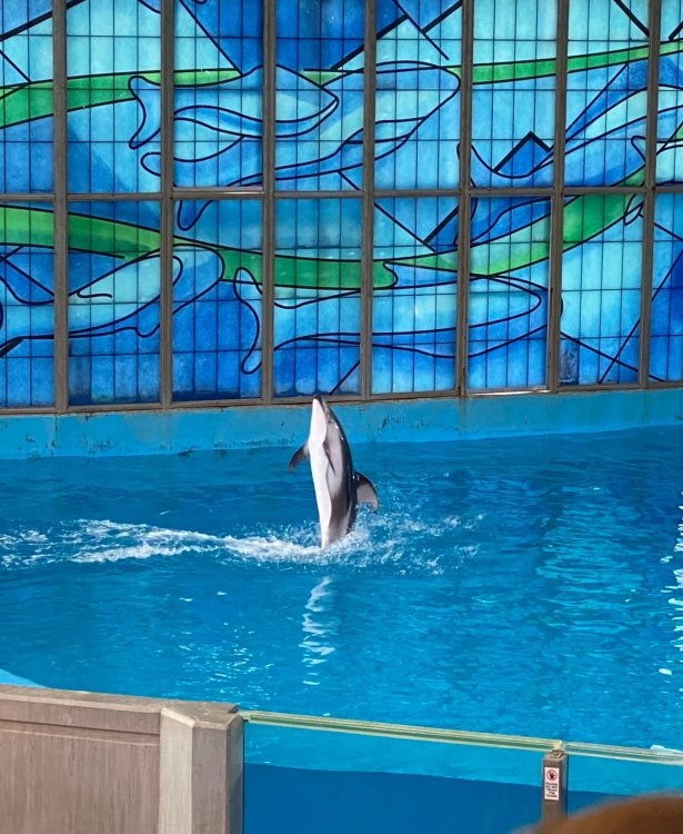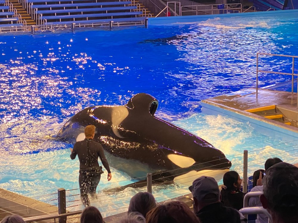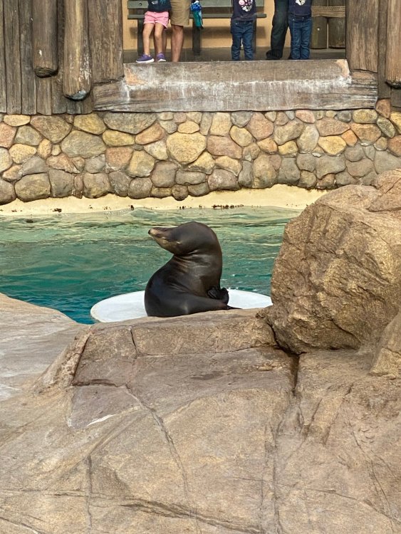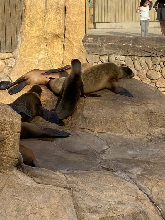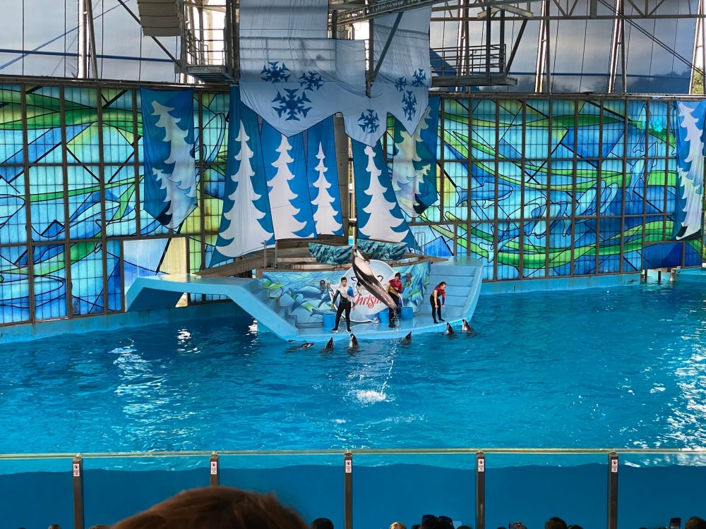 SWSA continued: after dropping off Sean at the hardhat tour, we continued on to the Beluga Show - only to discover we had missed that too during our delay on Wave Breaker but, we saw "Clyde & Seamore's Countdown to Christmas" was showing in about 30 minutes, so headed over that way to Sea Lion stadium. along the way tho, we passed Bumble who was out doing meet and greet . and of COURSE I'm a photo-op whore, so we hopped in line (gently dragging Oren & Paige with me, but they didn't protest too much): and an Elf out on the pathway being super cheerful also got stopped for a photo on the way to the stadium. the live entertainment thruout the park was quite good, with an excellent level of talent, and man these ladies had great voices too. Mariachi Christmas Carols for the win! I had missed the SeaLion show on my prior visit to SeaWorld SA, so had no idea what to expect. I mean, I knew it would be cheesy as all hell (which it was - even including a mime!!!), but I wasn't expecting the humor to skew a little "dark" - TWO jokes about death (including a melted Frosty being dumped back into the main tank) and vomit joke about getting car-sick rushing to the mall. Lots of slapstick with the mime and a female elf. the show is about Clyde and SeaMore getting SWSA ready for Santa to visit, and checking things off their list they need to do in order to get Santa to come visit. but it was cute, and a nice use of ~25 minutes. the otter is ADORBS! (even if he seemed to have no idea what was going on, and just did it for the treat) it was quite a full crowd, but once the show was over, pretty much everyone went next door to the habitat to look at the Sea Lions sunning on the rocks (something Paige and I had peeked at on Halloween, but the area was closed and we were shooed away (politely) at that time). lots of folks buying the cups of food to feed them tho. . . we were close to the front gates, so I split off to go to guest services to upgrade my day ticket to a season pass. it was very easy to do, tho "odd" in that "the machine is still broken" so my 1 year pass - good for 1 year from the date I purchased, since SWSA is a year round park - is a little piece of paper that I hope I don't tear or rip in the next 12 months. (Maybe I should go get it laminated?) then I headed back to go meet up with Paige/Oren over by the meet & greet (since Paige is friends with someone in the costumes and was gonna visit) . More stilts! yay!!! bet this is gonna look great once it gets dark! another look at the imposing Tidal Surge. This ride is gonna be great! found Paige, but before we left, I had to get in line for another pic, since Rudolf (red nose included), and Clarice were out! and just before we headed out to grab a ride on the Carousel (we had time before the 2nd attempt at the Beluga show), Bumble came back out. .so I took the opportunity for a solo pic - LURVE him: be-still my heart! going into Sesame Street "Bay of Play" we passsed these that caught my eye. are these. . .. . Christmas trees made out of trash? YES.. what an awesome touch, that if you weren't paying attention to, could easily walk past without noticing. . LOL Hi Oscar! tho I love me a photo op? the line for this group was way too long than I was willing to wait in (especially since it was almost all parent with tiny kids. . I mean, it's Sesame Street, I get it. .the right audience was in line for pics). So I just settled for a walk by picture. then onto the Carousel - which despite the crowd levels in the Sesame Street area, was only a 1 cycle wait. Carousel credit received, we headed over to Beluga Stadium to meet up with Oren for the show: "A Beluga Christmas" this one was a reach, because there really wasn't anything Christmasy about it, other than the tree banners on the backdrop, and it looked like someone when to Home Depot and bought some colored trees to put on either side of the stage. the music was sorta/kinda holiday themed, if you strained to hear it in there. . but really it was pretty much the standard show, I would say, with Belugas and Dolphins. which isn't a bad thing, I really enjoyed it. these Pacific White Sided Dolphins really get some height, and speed. Belugas! awwww. . a Momma and her calf. adorable LOL. . looks like it's jumping the logo from this angle by the time the show ended, it was just ~ an hour until dinner. Dinner was over in Discovery Point - which is outside the main gates of SeaWorld across the entrance plaza. But they have Bottle Nose Dolphin exhibit and a shark reef over there, so we decided to head that way a little early to check those out. there was an animal interaction tour going on, and they were feeding the bottlenose dolphins, as well as learning some of the training. and luckily we just happened to be in the perfect spot for when the trainer motioned them to jump: unfortunately the Shark Reef is closed at the moment as they are re-doing the floors in there, so we spent some time visiting with other ACE and TSU attendees, before heading into the underwater portion of the Dolphin exhibit. and then it was time for dinner: this time several different Pasta options/sauces, and a wonderful cinnamon/apple cobbler for desert. just the meals were well worth the cost of the event - not to mention that I was able to upgrade my admission into a Season Pass. I did NOT leave hungry I also won a gift bag at dinner with a small stuffed Shamu, a Coca-Cola Scarf, and an ornament. and found this (one of only 3 - of which I bought 2 of them) leftover from June "Pride" pins it's a Mega-Gay shark (if the rainbow teeth and glitter maw didn't give it away, they also put it on a rainbow backing to sell. . .LOL). too cute to pass up, so bought one for me, and one to have for a friend. then made the quick trip to the car to drop off the stuff and my hat/sunglasses, before heading back into the park proper to enjoy the lights, Orca show, & evening ERT. SWSA day to be concluded. . .