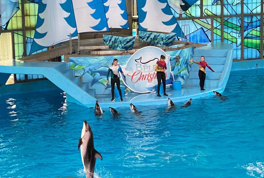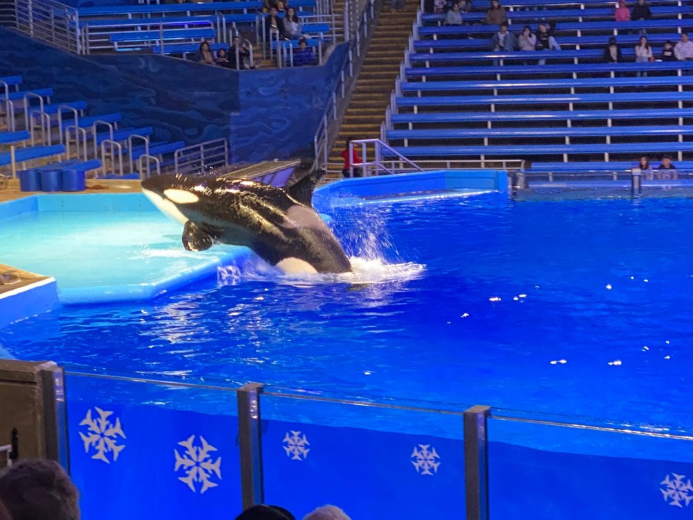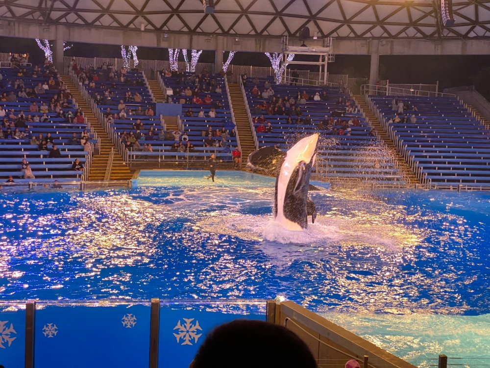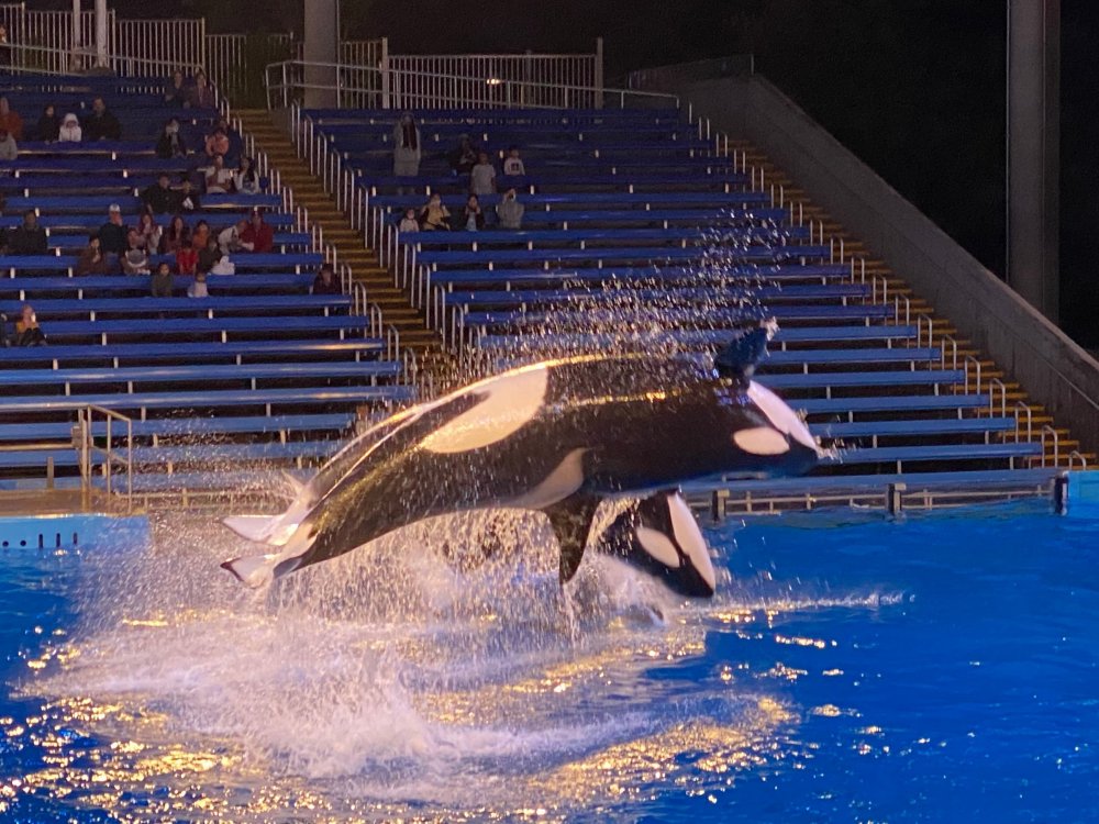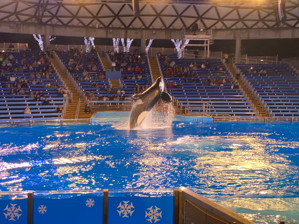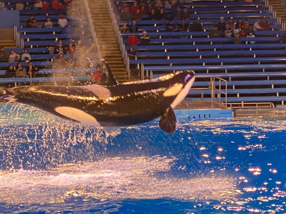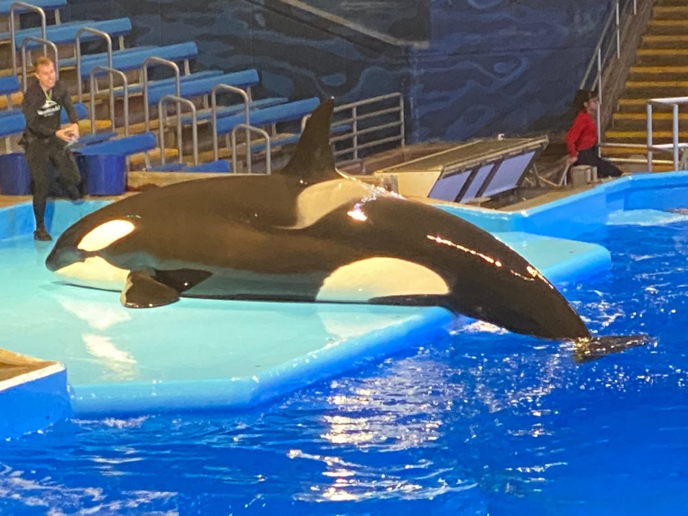 SWSA continued: after dropping off Sean at the hardhat tour, we continued on to the Beluga Show - only to discover we had missed that too during our delay on Wave Breaker but, we saw "Clyde & Seamore's Countdown to Christmas" was showing in about 30 minutes, so headed over that way to Sea Lion stadium. along the way tho, we passed Bumble who was out doing meet and greet . and of COURSE I'm a photo-op whore, so we hopped in line (gently dragging Oren & Paige with me, but they didn't protest too much): and an Elf out on the pathway being super cheerful also got stopped for a photo on the way to the stadium. the live entertainment thruout the park was quite good, with an excellent level of talent, and man these ladies had great voices too. Mariachi Christmas Carols for the win! I had missed the SeaLion show on my prior visit to SeaWorld SA, so had no idea what to expect. I mean, I knew it would be cheesy as all hell (which it was - even including a mime!!!), but I wasn't expecting the humor to skew a little "dark" - TWO jokes about death (including a melted Frosty being dumped back into the main tank) and vomit joke about getting car-sick rushing to the mall. Lots of slapstick with the mime and a female elf. the show is about Clyde and SeaMore getting SWSA ready for Santa to visit, and checking things off their list they need to do in order to get Santa to come visit. but it was cute, and a nice use of ~25 minutes. the otter is ADORBS! (even if he seemed to have no idea what was going on, and just did it for the treat) it was quite a full crowd, but once the show was over, pretty much everyone went next door to the habitat to look at the Sea Lions sunning on the rocks (something Paige and I had peeked at on Halloween, but the area was closed and we were shooed away (politely) at that time). lots of folks buying the cups of food to feed them tho. . . we were close to the front gates, so I split off to go to guest services to upgrade my day ticket to a season pass. it was very easy to do, tho "odd" in that "the machine is still broken" so my 1 year pass - good for 1 year from the date I purchased, since SWSA is a year round park - is a little piece of paper that I hope I don't tear or rip in the next 12 months. (Maybe I should go get it laminated?) then I headed back to go meet up with Paige/Oren over by the meet & greet (since Paige is friends with someone in the costumes and was gonna visit) . More stilts! yay!!! bet this is gonna look great once it gets dark! another look at the imposing Tidal Surge. This ride is gonna be great! found Paige, but before we left, I had to get in line for another pic, since Rudolf (red nose included), and Clarice were out! and just before we headed out to grab a ride on the Carousel (we had time before the 2nd attempt at the Beluga show), Bumble came back out. .so I took the opportunity for a solo pic - LURVE him: be-still my heart! going into Sesame Street "Bay of Play" we passsed these that caught my eye. are these. . .. . Christmas trees made out of trash? YES.. what an awesome touch, that if you weren't paying attention to, could easily walk past without noticing. . LOL Hi Oscar! tho I love me a photo op? the line for this group was way too long than I was willing to wait in (especially since it was almost all parent with tiny kids. . I mean, it's Sesame Street, I get it. .the right audience was in line for pics). So I just settled for a walk by picture. then onto the Carousel - which despite the crowd levels in the Sesame Street area, was only a 1 cycle wait. Carousel credit received, we headed over to Beluga Stadium to meet up with Oren for the show: "A Beluga Christmas" this one was a reach, because there really wasn't anything Christmasy about it, other than the tree banners on the backdrop, and it looked like someone when to Home Depot and bought some colored trees to put on either side of the stage. the music was sorta/kinda holiday themed, if you strained to hear it in there. . but really it was pretty much the standard show, I would say, with Belugas and Dolphins. which isn't a bad thing, I really enjoyed it. these Pacific White Sided Dolphins really get some height, and speed. Belugas! awwww. . a Momma and her calf. adorable LOL. . looks like it's jumping the logo from this angle by the time the show ended, it was just ~ an hour until dinner. Dinner was over in Discovery Point - which is outside the main gates of SeaWorld across the entrance plaza. But they have Bottle Nose Dolphin exhibit and a shark reef over there, so we decided to head that way a little early to check those out. there was an animal interaction tour going on, and they were feeding the bottlenose dolphins, as well as learning some of the training. and luckily we just happened to be in the perfect spot for when the trainer motioned them to jump: unfortunately the Shark Reef is closed at the moment as they are re-doing the floors in there, so we spent some time visiting with other ACE and TSU attendees, before heading into the underwater portion of the Dolphin exhibit. and then it was time for dinner: this time several different Pasta options/sauces, and a wonderful cinnamon/apple cobbler for desert. just the meals were well worth the cost of the event - not to mention that I was able to upgrade my admission into a Season Pass. I did NOT leave hungry I also won a gift bag at dinner with a small stuffed Shamu, a Coca-Cola Scarf, and an ornament. and found this (one of only 3 - of which I bought 2 of them) leftover from June "Pride" pins it's a Mega-Gay shark (if the rainbow teeth and glitter maw didn't give it away, they also put it on a rainbow backing to sell. . .LOL). too cute to pass up, so bought one for me, and one to have for a friend. then made the quick trip to the car to drop off the stuff and my hat/sunglasses, before heading back into the park proper to enjoy the lights, Orca show, & evening ERT. SWSA day to be concluded. . .