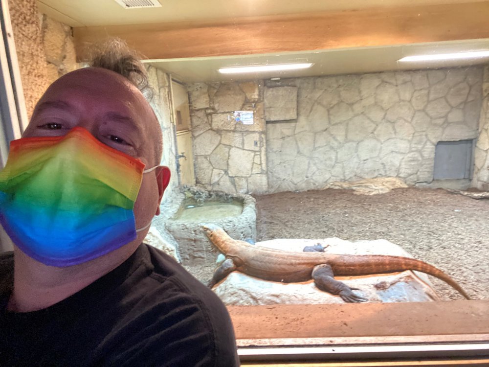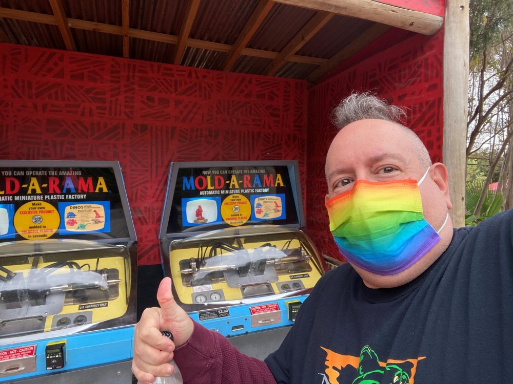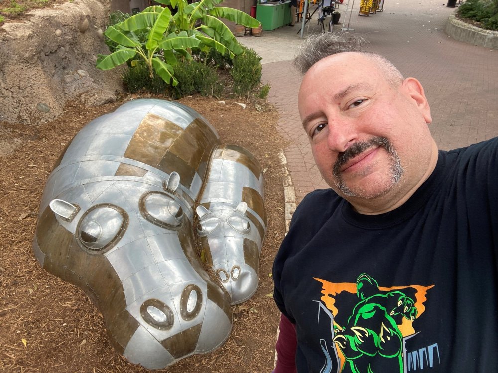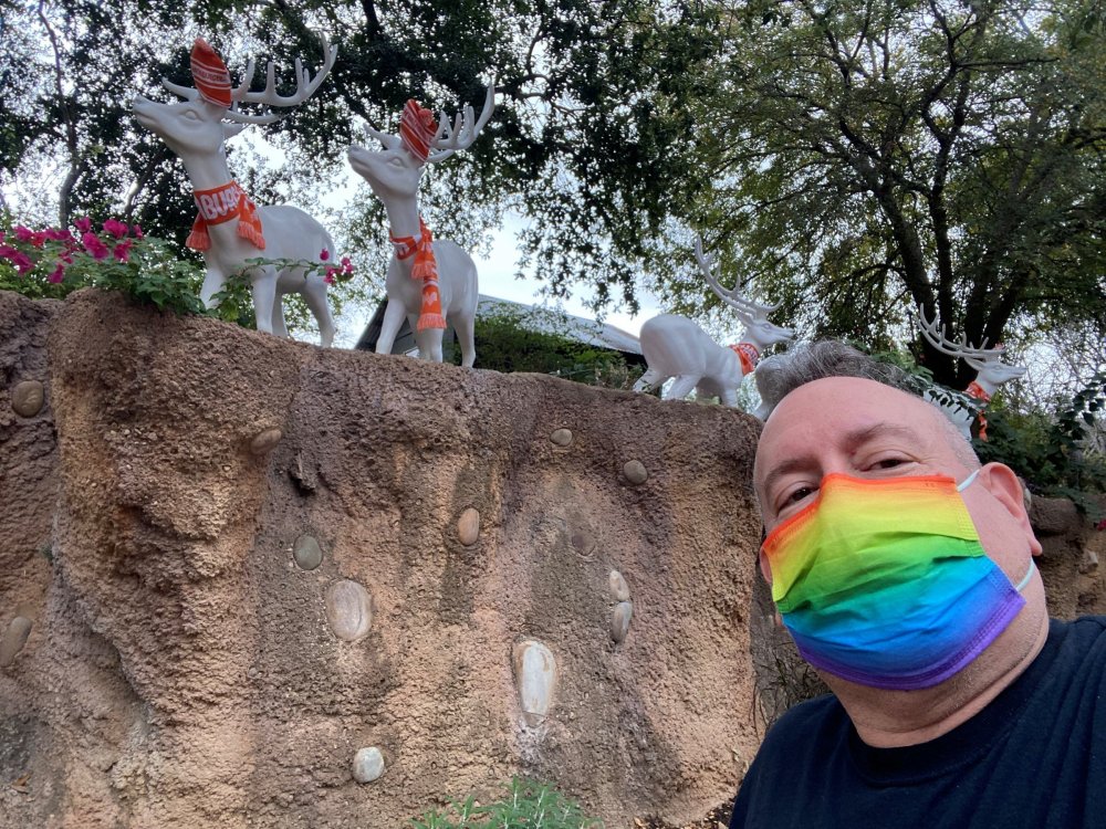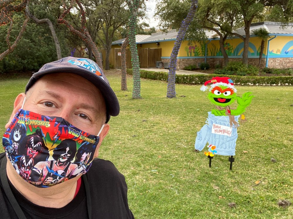 More zoo.. . still in Africa section: the Elephants were all out, and were pretty active today too and just up the pathway? FEEEEEED MEEEEEEEEE the San Antonio Zoo has gotten in on the trend of places charging for every possible extra. . so yeah, you can feed the Elephants, or fish, or Birds, or Giraffes (if you pay extra) or walk with the flamingos, or kangaroos, or take behind the scenes tours. . if you pay. i TOTALLY get that they are raising additional cash this way, and good on them. but is sucks that things like the Giraffe Enclosure - that used to let you get up pretty close to that barrier, no longer lets you do that - unless you want to pay to feed them lettuce. oh well, still got some pretty good pictures. the Giraffe Enclosure also has Zebras and some Emus in it. . some of those guys just don't wanna deal with people, and preferred to hang out towards the back of the enclosure eating the provided food, instead of having to intermingle with HUMANS to get it: the Emu was hiding underneath the platform. .but can still see them from certain angles More of that really nice artwork that's around the San Antonio Zoo.. this one just outside the Rhino enclosure who were also all out and about. . .and eating. They must have just done a feeding after the zoo opened. these were put up for the Zoo Lights. . so temporary art. but love the signs warning the kids to keep off "Santa's Watching". . . . LOL and a Rhino that also lights up Warthogs recall I noted that one can really tell where the "old zoo" starts and the "new zoo" ends? yeah. . getting over into the older zoo section now with the old skool enclosures: for some reason, this display wasn't near the Giraffes. .but was in front of the Lion enclosure. I thought Lions didn't tend to go after Giraffes since they are so big? the Giant Anteater was actually out. think it's the first time I've ever seen him! I saw these suckers in Japan. .they are MEAN. and they look mean! just look at those claws. amusingly. . as so many of the animals that are never active were active today? the big cats - that usually are prowling - were sleeping, and kinda hidden, today. here's the Lions: and here's the Tiger - hanging out in the hammock even the Kangaroos were kinda lazy this afternoon. tho the Porcupines were quite active yeah. . older section of the zoos.. but at least this enclosure seems to be getting a bit of love. (some of them have sat empty for years, and one of them even just has a giant tree in it) how does *this* bear measure up? hahahaha. .that sad enclosure that I just mentioned that only has a tree in it? they "festive-ed" it up, by putting lights on it, and a snowman! HA! again, the enclosures in the "older" section of the zoo, can be a little bit depressing. but I guess Fish (and birds) that tend to be over in this section, don't really care. Mean. . . so mean. and just waiting for a small child to fall lin. another "repurposed" empty enclosure. HO HO HO way way back at the very end of a dead end. . is the Kangaroo encounter (no feeding tho). the zoo put this big Kanga at the end of the main path to at least draw people over, so they would see what's over there. it worked for me. . even if I didn't bother with the paid "Encounter" [Kennywood] Turrrrrrrr-tullllllllllle [/Kennywood] wow. . BOTH Eagles were out. one perched: and one on the ground eating what looked like a dead mouse: moving out of the older section back into the newer areas as I make my way around the zoo. . ther really are some lovely areas. think this is an older part still tho.. as it's not ADA compliant, and several sections of this path were closed-off and way overgrown. but you can get some nice pics from this "bridge" another one of those huge "I'm not scared of humans" Black Squirrels I'd held it off long enough.. time for a ride on the Zoo Carousel. Strangely, NOT called the "Conservation Carousel" here. I wonder if the National Zoo Association knows they broke precedent? at only $3 a ride, it's a fairly good deal. I had really wanted to ride the Eagle. . but once I got to it, I quickly realized that any adult is gonna have an issue. . as the way they did the wings? there's no place for one's legs to go! so I settled for the Tree Frog next to the Eagle. Whee! It really is quite lovely. . if not the greatest Carousel I've ever been on. Still. .it's a nice one. and a *really* nice job on the animals/reptiles on it. it was getting past 2pm by this point, and SFFT had opened at 2. . so I headed over to the last sections of the Zoo I'd not yet been to - mainly Amphibia, for the frogs/creatures. and they had this area all done up for the Zoo Lights with a few displays up. " so I stopped in front of a few of the decorated trees/backgrounds that I liked for some selfies. it was so quiet over here, I took my mask off for the pics. (this area is really sorta hidden off the main pathway around the zoo, since the Kiddie Amusement area cuts it off from the front gates of the zoo) as noted. .it's really sorta hidden back here. So imagine my surprise when I realized that over here is where they had put Santa and "Twinkle Penguin the Elf" for photos. Twinkle saw me taking pics and called/waved me over to them. She said "So what would you like for Christmas?" and I responded: "Well, I'm Jewish, and Chanukah starts soon. . so what I'd really like for Chanukah is a free photo with you and Santa on my phone, instead of paying for a picture" She and Santa both laughed. . and: Ta-Da! there was no one else around, so I hung out and talked to them for a few minutes - she liked my shirt, and my hair.. and we just BSed until some families showed up to purchase photos - at which point I took a quick pic of them, and went on into the Amphibia display. not sure what kind of sea-snakes these are. .but they freaked me out. NOPE Big, ol, fat, frog. there's a nice play area out back over here with some lovely mosaics too. Some small animal enclosures. .but I think they might rent this area out 