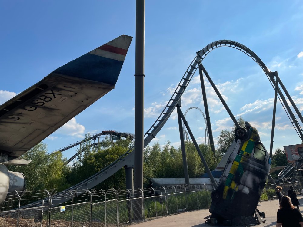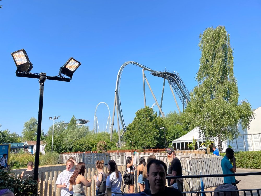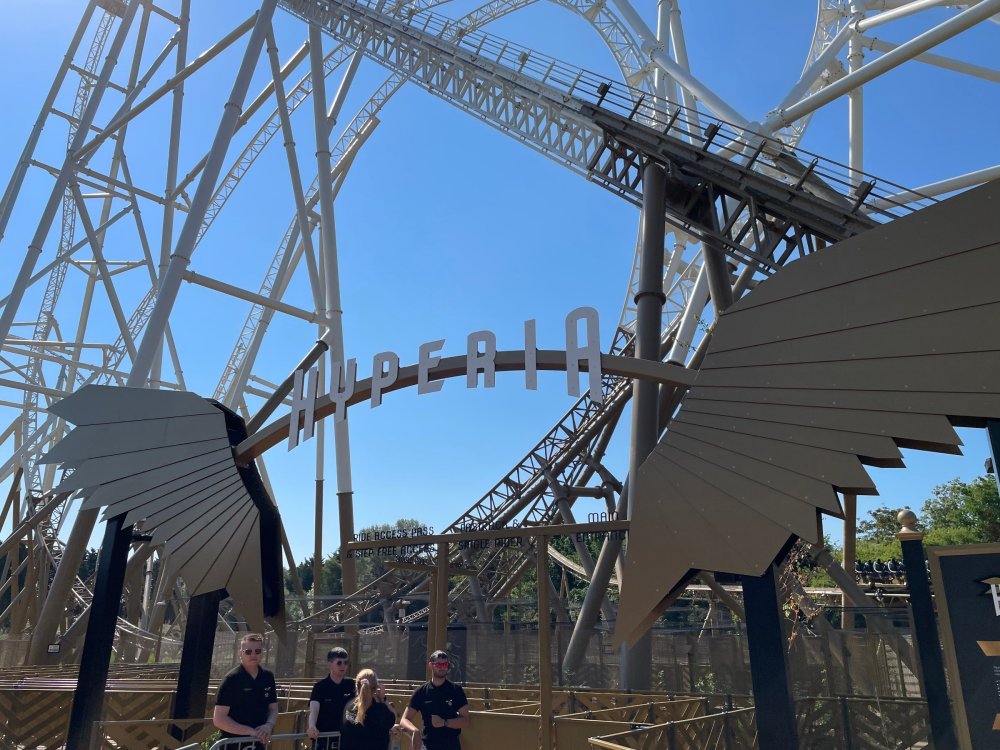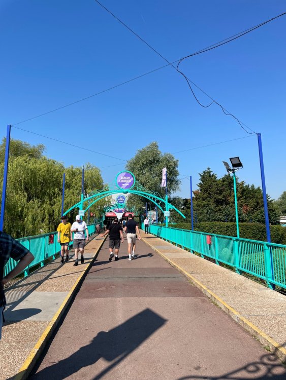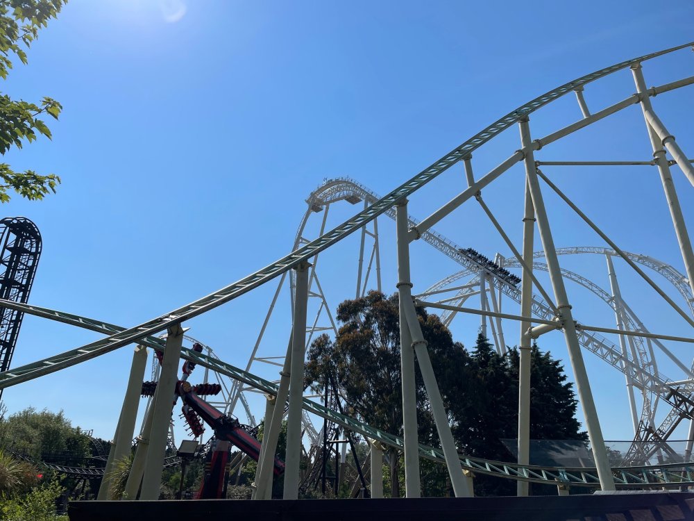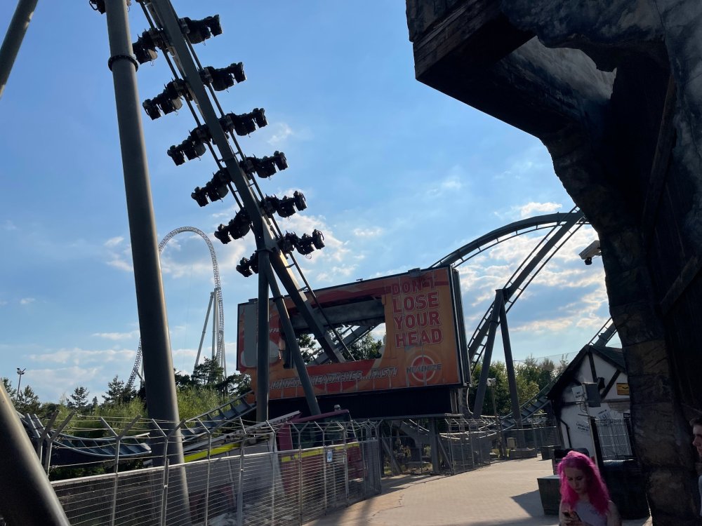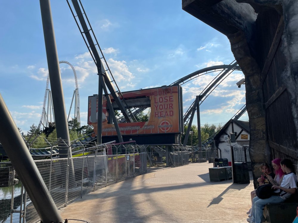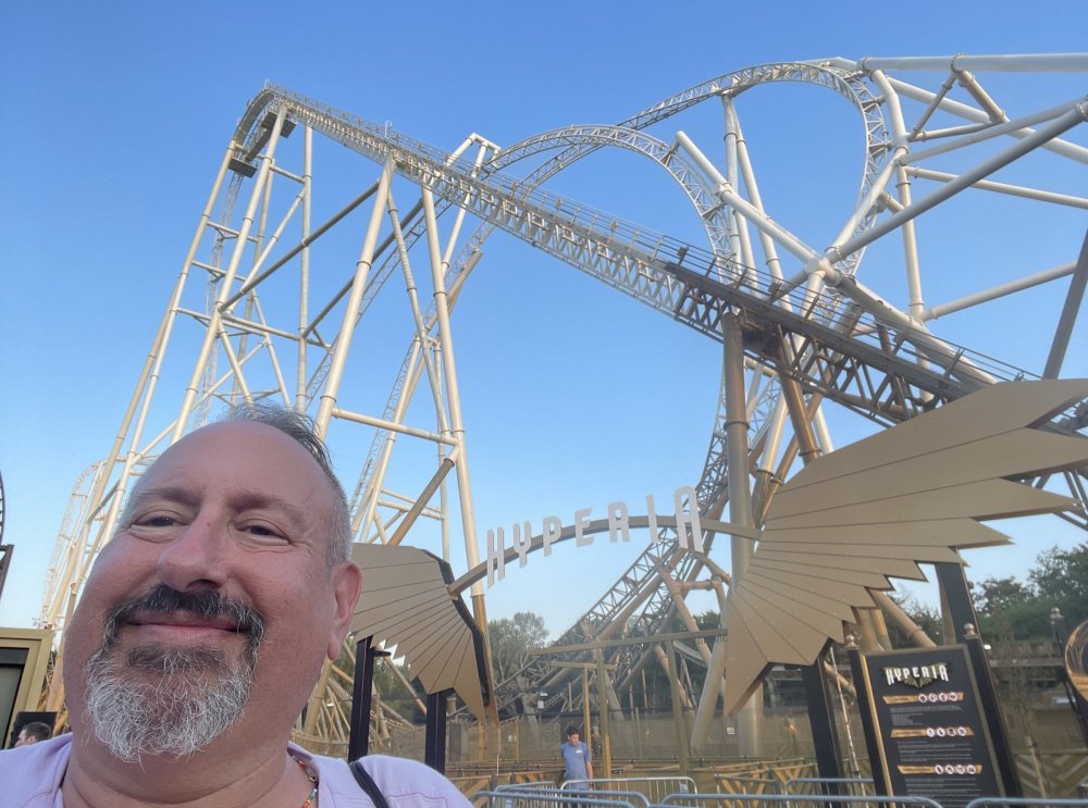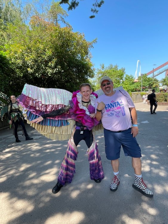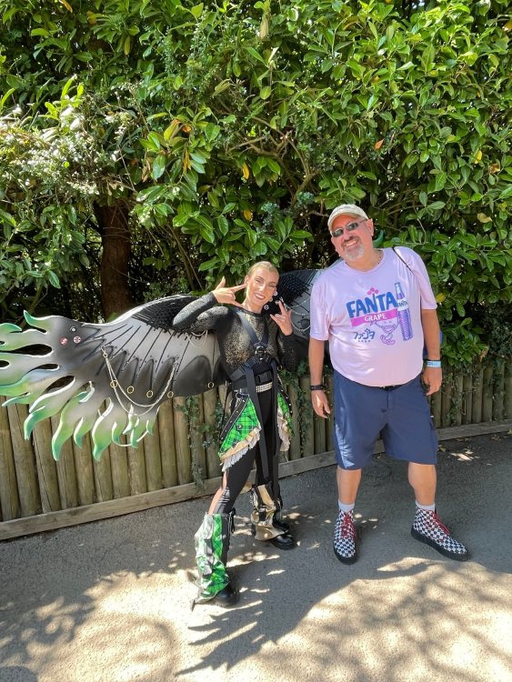 Day 2 (part 1): Thorpe Park! First off, apologies that it's been so long since the Day1 update from Chessington. Life got in the way, and have been so dang busy! (I'm rewarding myself for doing two things I *had* to get done this weekend - completed, so came to update day 2). so, I didn't know very much about Thorpe Park. I mean, once there, I was familiar with one or two rides, but I had never really paid much attention to it, as it was in the UK and I'd probably never go there. and I prefer to be "surprised" so when going on a TPR trip, I almost never do a lot of research on the parks themselves. But I was very much aware about Hyperia, as folks had been talking about it for months, and I was keeping fingers crossed it would behave for us, as it had been having a lot of down time since it had officially opened. a fairly short bus trip later, and we were parking at Thorpe park and spotting Hyperia immediately from the entrance bridge across the lake to the park. the main entrance over the lake, is quite lovely: we were walked back to what would be our "basecamp" for the day - back at the events pavilion that's under those white tent-like building behind the water rides. that coaster there is "the Swarm" - which I recognized the name and hadn't realized was in THIS park. it was testing as we walked by, but we were there slightly before park open, so many of the rides still stood silent. better view of Swarm from our basecamp pavilion patio. . and that white coaster back there is Stealth - but that one seemed like it was down today, as folks were working on it. just before the park opened, our hosts were very kind and walked us back to Hyperia. . . we weren't getting ERT on it until after park close, but everyone was excited to be over there and near the front of the line when it opened. it's a lovely park, and walking thru, I simply had not realized this is a major thrill park. . with many "extreme" rides. just looking on RCBD, of the 8 roller coasters at this park, SIX of them are ranked "Extreme". the other is the kiddie coaster, and an indoor coaster. and the flats are pretty crazy too. . so this is really a park going for the adrenaline junkies. . . we were held in front of the queue, and when the park opened, the opened up the queue and we all headed thru the back and forths and then it tested once (or twice) and. .stopped. the line, which had already gotten a bit long was held just before entry into the actual ride queue. (which is beautiful by the way) we hung out in the line about 20 minutes, reasoning if it does open soon, it's still going to be a shorter line than any other time today. but the other coasters nearby started cycling with guests. this is Colossus. *(and you can see the full rows of queue behind us already) the park announced they weren't quite ready to open yet, and had no established time to open Hyperia. since this was a new park to many of us, most decided to call it (we were supposed to ride later anyways with ERT) and we headed to the closest coaster, Colossus. over the shoulder restraints? uh oh. . this is the 10 inversion coaster! it's pretty. . but yeah, it beat the crap out of me. . .so one and done. luckily I had aspirin with me and popped on right away. while we were on Colossus, Hyperia started testing. . but the train was full of water dummies (we know they were water dummies, because some of the lids weren't closed tightly and in some inversions the sprays of water were as impressive as fireworks. it was pretty funny. water dummies are a good sign, but also means it wasn't opening right away yet. anyways, we were over here by Samurai (the Top Scan at the lower bottom) and Saw: the Ride (on the left there) I don't quite remember, but I'm pretty sure we had fast pass at this park (only ride it wasn't good on was Hyperia). . so the line was short enough we got in it for Samurai it ran a pretty good cycle too. . .again, this seemed to be a park geared to the extreme thrillseekers. Watching Saw cycle next door while waiting for our ride. and then we headed under the bridge and past Colossus towards the custom Gerstlauer Eurofighter NOT a fan of Eurofighters, but I was loving the theming (you drop undeneath spinning sawblades). . .so we got in line. it moved fairly slow - capacity, I guess, or maybe someone that couldn't fit in the seats? but eventually we made it up to the platform. and there is some nice theming in the queue line. Stacey and I finally at the station! how was it. . . um. . pretty rough I thought. but I've been on worse Eurofighters. This one did have some headbang - I recall we sat in the front row. but others who rode it said it wasn't that bad. so maybe we just had a janky car? anyways. . 1 and done. Hyperia seemed to be cycling now. . so we headed back over to be faced with a pretty massive line. lunch was fairly soon, and we didn't want to miss that, so instead we stopped into the bathrooms over there (themed and Neon). . kewl. the closest I got to Hyperia this morning and then headed over to a section we hadn't been in yet - which was sorta on the way back to the Pavilion. ooo.. .the "Hyperia Fairies" were out and about - I didn't realize that these folks are part of the show that gets put on near the entrance (more pics of that coming up soon). . but they were happy to pose for pics. this guy was the Choreographer of the show, from what I understand. but they were all charming. Mr Monkeys Banana Ride!! what amazing theming for a swinging ship ride. . LOL yeah, baby!!! we headed back to the pavilion for a very decent lunch served to us by the park: and then our hosts surprised us by giving each of us a one time pass for Hyperia to use the quick queue line. . .so many of us - myself included - headed over to Hyperia to have a ride. here's the aforementioned show that takes place several times a day at the stage near the ride entrance. without even asking, Stacey and I got assigned to Front Row !! we took the advantage - mainly because
