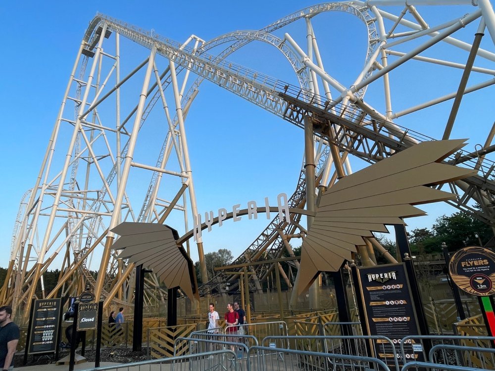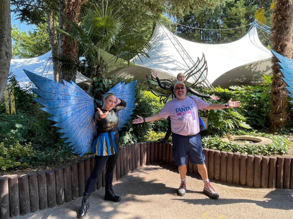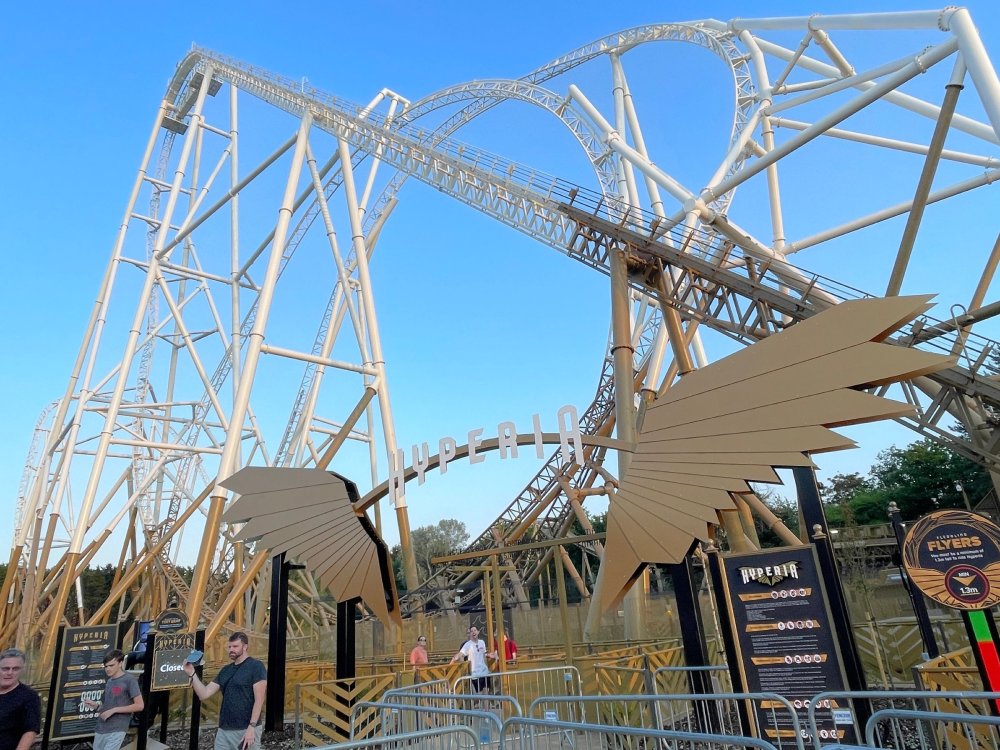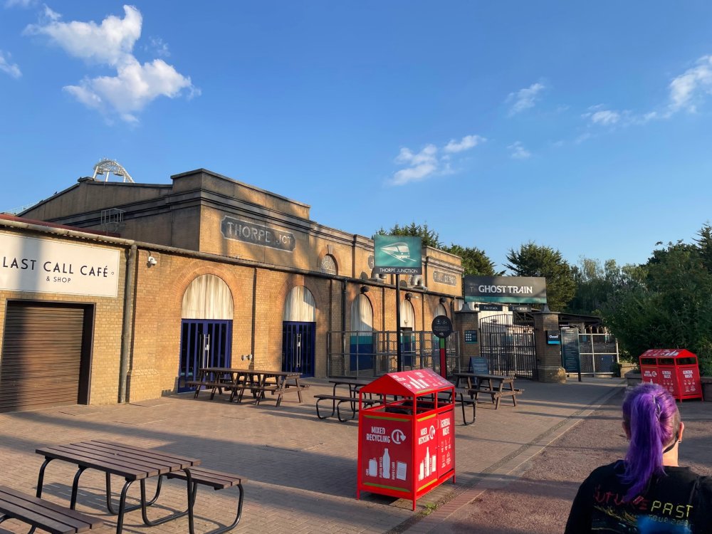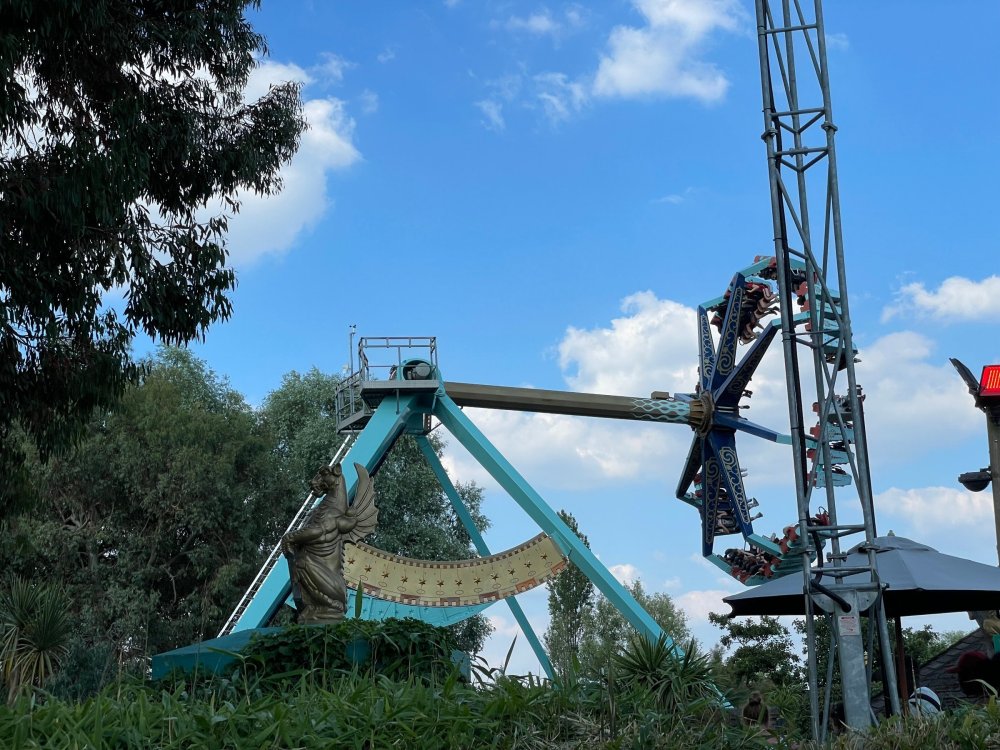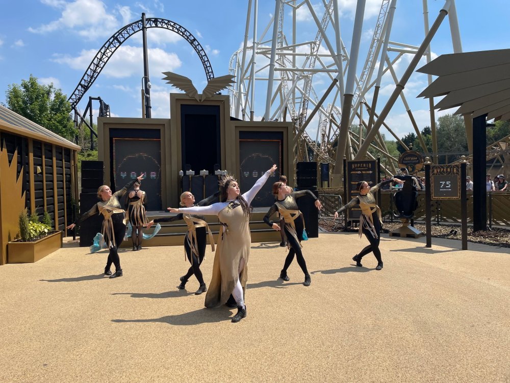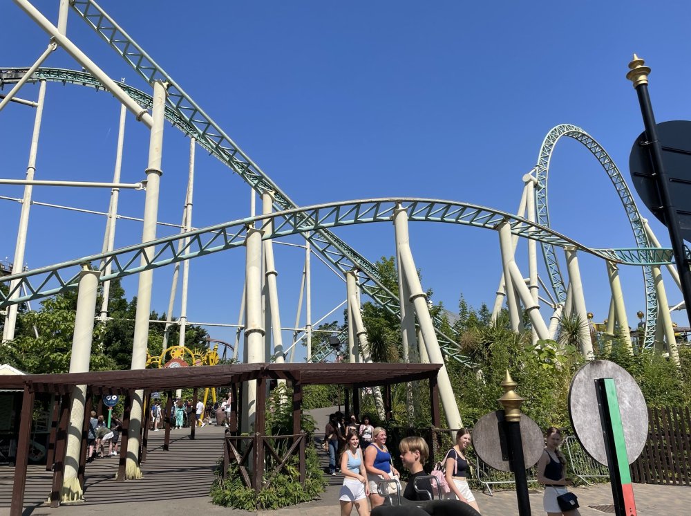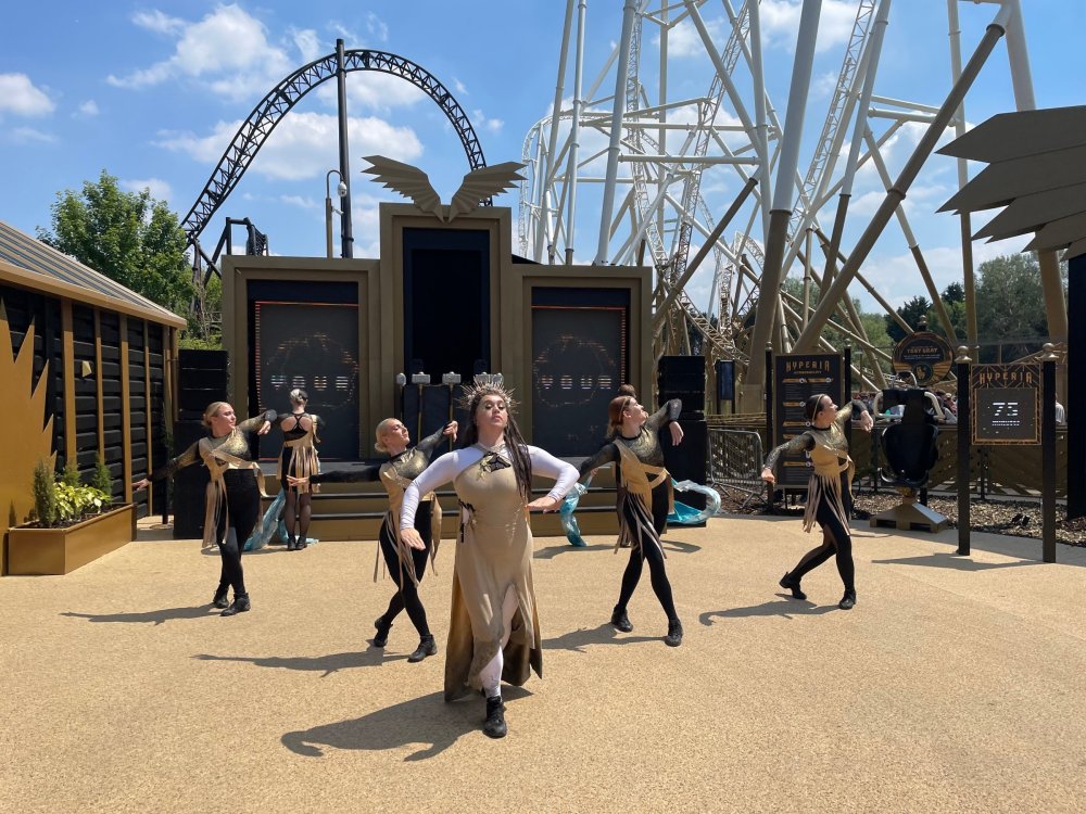 Day 2 (part 1): Thorpe Park! First off, apologies that it's been so long since the Day1 update from Chessington. Life got in the way, and have been so dang busy! (I'm rewarding myself for doing two things I *had* to get done this weekend - completed, so came to update day 2). so, I didn't know very much about Thorpe Park. I mean, once there, I was familiar with one or two rides, but I had never really paid much attention to it, as it was in the UK and I'd probably never go there. and I prefer to be "surprised" so when going on a TPR trip, I almost never do a lot of research on the parks themselves. But I was very much aware about Hyperia, as folks had been talking about it for months, and I was keeping fingers crossed it would behave for us, as it had been having a lot of down time since it had officially opened. a fairly short bus trip later, and we were parking at Thorpe park and spotting Hyperia immediately from the entrance bridge across the lake to the park. the main entrance over the lake, is quite lovely: we were walked back to what would be our "basecamp" for the day - back at the events pavilion that's under those white tent-like building behind the water rides. that coaster there is "the Swarm" - which I recognized the name and hadn't realized was in THIS park. it was testing as we walked by, but we were there slightly before park open, so many of the rides still stood silent. better view of Swarm from our basecamp pavilion patio. . and that white coaster back there is Stealth - but that one seemed like it was down today, as folks were working on it. just before the park opened, our hosts were very kind and walked us back to Hyperia. . . we weren't getting ERT on it until after park close, but everyone was excited to be over there and near the front of the line when it opened. it's a lovely park, and walking thru, I simply had not realized this is a major thrill park. . with many "extreme" rides. just looking on RCBD, of the 8 roller coasters at this park, SIX of them are ranked "Extreme". the other is the kiddie coaster, and an indoor coaster. and the flats are pretty crazy too. . so this is really a park going for the adrenaline junkies. . . we were held in front of the queue, and when the park opened, the opened up the queue and we all headed thru the back and forths and then it tested once (or twice) and. .stopped. the line, which had already gotten a bit long was held just before entry into the actual ride queue. (which is beautiful by the way) we hung out in the line about 20 minutes, reasoning if it does open soon, it's still going to be a shorter line than any other time today. but the other coasters nearby started cycling with guests. this is Colossus. *(and you can see the full rows of queue behind us already) the park announced they weren't quite ready to open yet, and had no established time to open Hyperia. since this was a new park to many of us, most decided to call it (we were supposed to ride later anyways with ERT) and we headed to the closest coaster, Colossus. over the shoulder restraints? uh oh. . this is the 10 inversion coaster! it's pretty. . but yeah, it beat the crap out of me. . .so one and done. luckily I had aspirin with me and popped on right away. while we were on Colossus, Hyperia started testing. . but the train was full of water dummies (we know they were water dummies, because some of the lids weren't closed tightly and in some inversions the sprays of water were as impressive as fireworks. it was pretty funny. water dummies are a good sign, but also means it wasn't opening right away yet. anyways, we were over here by Samurai (the Top Scan at the lower bottom) and Saw: the Ride (on the left there) I don't quite remember, but I'm pretty sure we had fast pass at this park (only ride it wasn't good on was Hyperia). . so the line was short enough we got in it for Samurai it ran a pretty good cycle too. . .again, this seemed to be a park geared to the extreme thrillseekers. Watching Saw cycle next door while waiting for our ride. and then we headed under the bridge and past Colossus towards the custom Gerstlauer Eurofighter NOT a fan of Eurofighters, but I was loving the theming (you drop undeneath spinning sawblades). . .so we got in line. it moved fairly slow - capacity, I guess, or maybe someone that couldn't fit in the seats? but eventually we made it up to the platform. and there is some nice theming in the queue line. Stacey and I finally at the station! how was it. . . um. . pretty rough I thought. but I've been on worse Eurofighters. This one did have some headbang - I recall we sat in the front row. but others who rode it said it wasn't that bad. so maybe we just had a janky car? anyways. . 1 and done. Hyperia seemed to be cycling now. . so we headed back over to be faced with a pretty massive line. lunch was fairly soon, and we didn't want to miss that, so instead we stopped into the bathrooms over there (themed and Neon). . kewl. the closest I got to Hyperia this morning and then headed over to a section we hadn't been in yet - which was sorta on the way back to the Pavilion. ooo.. .the "Hyperia Fairies" were out and about - I didn't realize that these folks are part of the show that gets put on near the entrance (more pics of that coming up soon). . but they were happy to pose for pics. this guy was the Choreographer of the show, from what I understand. but they were all charming. Mr Monkeys Banana Ride!! what amazing theming for a swinging ship ride. . LOL yeah, baby!!! we headed back to the pavilion for a very decent lunch served to us by the park: and then our hosts surprised us by giving each of us a one time pass for Hyperia to use the quick queue line. . .so many of us - myself included - headed over to Hyperia to have a ride. here's the aforementioned show that takes place several times a day at the stage near the ride entrance. without even asking, Stacey and I got assigned to Front Row !! we took the advantage - mainly because