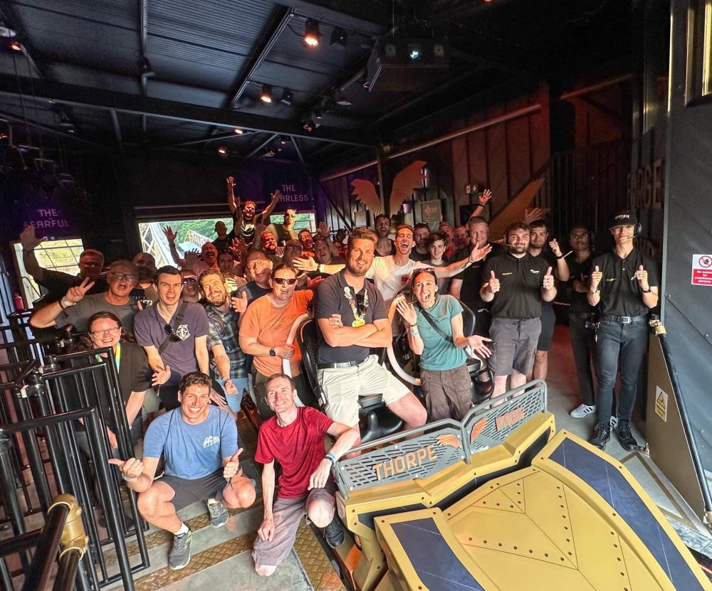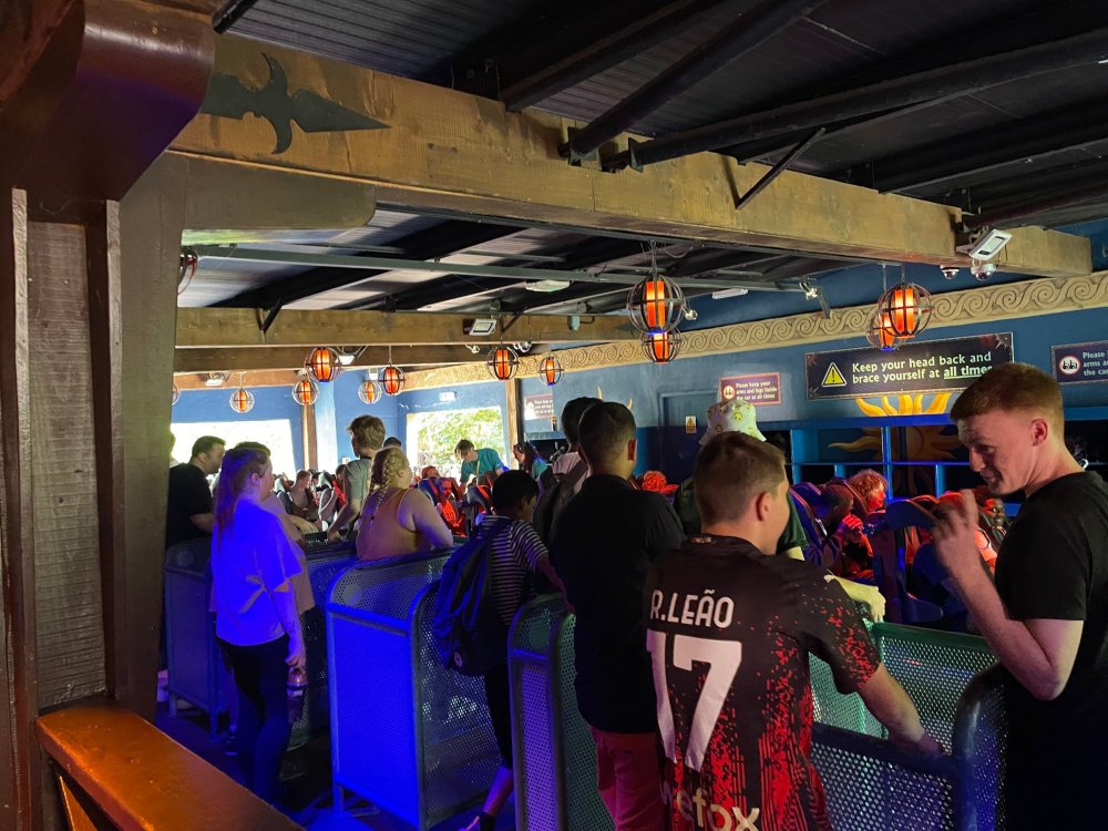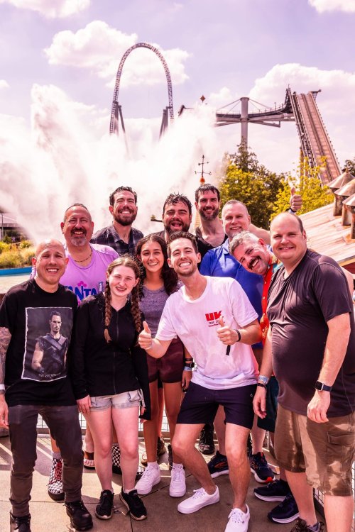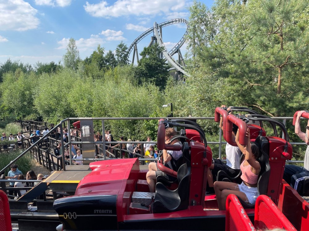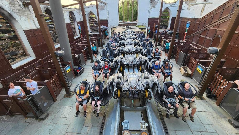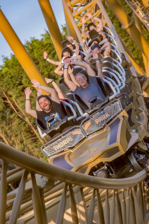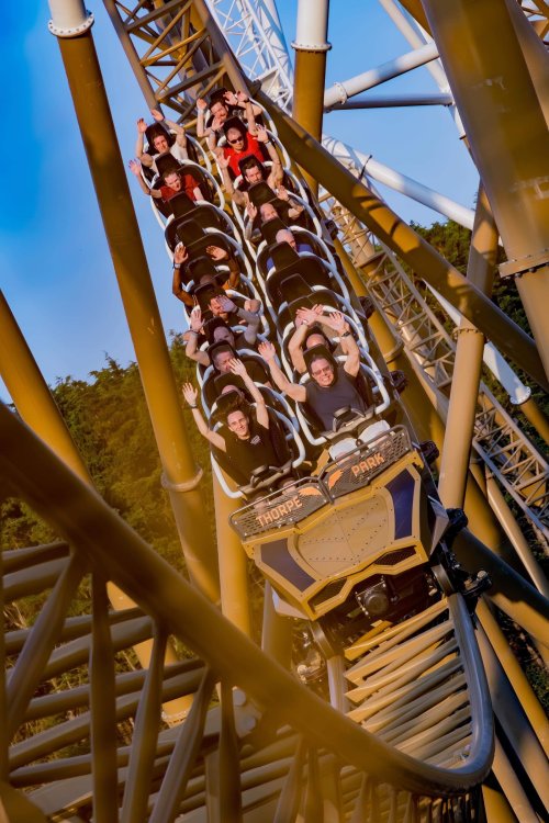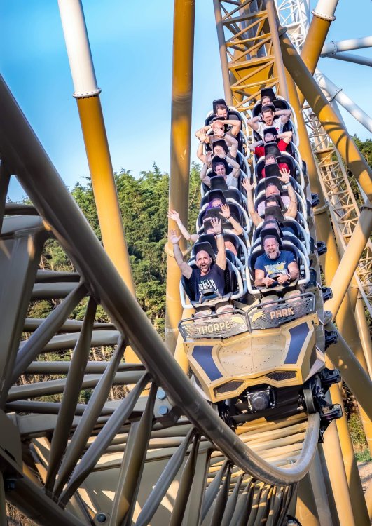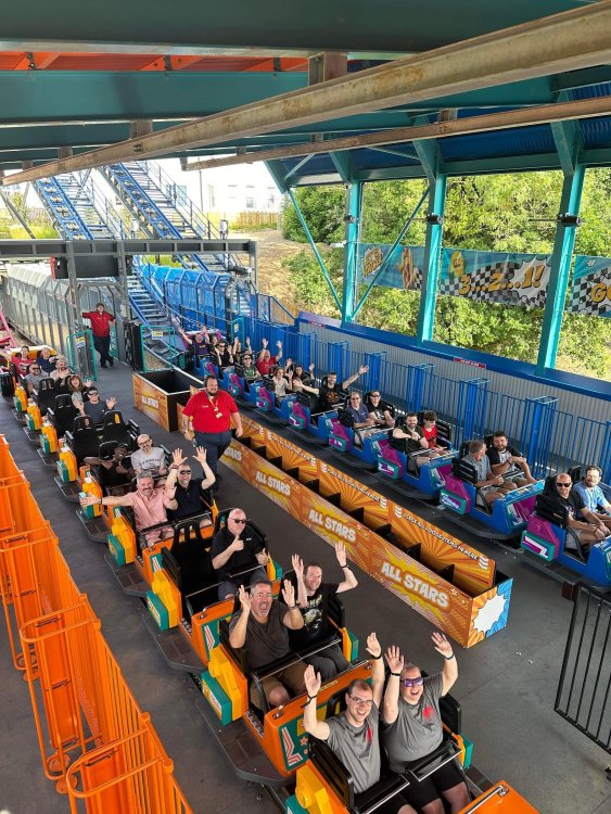 Day 2 (part 2): Thorpe Park! We also went and did the "Ghost Train" - which I knew nothing about, but had been recommended by several park employees I had talked to. It's not really a "ride" but rather an experience - an interactive show, with some brilliant special effects and a set that "moves". . so it feels like you trapped on a train that's moving as crazy things happen. It was very cool and I loved it so much I bought multiple Magnets from it. . and was looking to buy a shirt for it (but they didn't have anything I really loved). for some strange reason, I don't have ANY pictures of this ride - I'm shocked myself. I know I was incredibly distracted (or as my friends call it "dickstracted") by a cute bear couple that was in the queue with us - which would explain why I have no pics of the outside of the ride. And you couldn't take pics during the experience. but still. . I'm truly surprised I don't have any pics. . LOL I think it was around this time, that (*I think) we got a message from Robb asking who wanted to ride the Tidal Wave as a group, and if so, meet by the ride. So a whole bunch of TPR folks got together, and our park guild got them to set aside a boat for TPR (plus one family who were added to the back row not realizing a completely full TPR boat was gonna be heavy and get a bigger splash) and off we went. COMPLETELY soaked. . like being dipped into a bathtub. . and I loved it. the following pics are all from either Robb or Andy, I believe: the aftermath. . posing in front of the next boat's splash. with time in the day running out, several of us headed to the last section of the park - seemed to be themed to a lost Jungle/ruins, to ride the flats over there: a giant swing, an Enterprise, a Flying Carpet, and a "claw" the swing was ok, but kind of underwhelming to me because a) the cycle was so short, and b) I've been on the tallest one at SWSA here in Texas. it was fun, but not exciting, if that makes sense. loved the theming over here tho. . .very, very green and "overgrown" looking, but with rides just popping up in the center of it. Zodiac is the Enterprise. the Flying Carpet went down while we were in queue for the Enterprise (had to wait for next cycle), so didn't get to ride that - think it was just too close to end of day for Maintenance to mess with it today . . but it framed Swarm very nicely for a picture I thought and the claw was also over here. see? I LOVE Enterprises (Robb just asked about who loves them on the TPR Facebook page) . . . this one didn't run a great cycle. . and it was really quick considering how long it took the one operator to get it loaded. . but any Enterprise is a fun Enterprise. it was so close to the end of night, that Stacey and I hit a store for shopping before heading back to the Pavilion to meet up with the group. no, I didn't buy this. . but I was VERY tempted. LOL.. if it hadn't been at the start of the trip and I was already worrying about suitcase space, prolly would have grabbed it. as we waited for the park to clear (and more importantly the Hyperia line to clear thru), we headed over to Swarm for our 1st ERT. apparently the theming is an alien invasion. . tho Thorpe park does seem to have a thing for wrecked planes (there were several of them thruout the park as theming. . LOL). but I loved this. and I was actually sorry I hadn't gone over here during the daytime, as I absolutely LOVED this B&M Flyer. my favorite ride in the park, and I think I rode every cycle of our ERT. glass smooth with an amazing diving first drop, and an inversion over/thru the station - which is themed to a bombed out Church. the inversion I mentioned, from inside the station the design of the trains is SO good. . this is the back of the row in front of us! Pic courtesy of Elissa, I believe (or possibly Robb) following pics courtesy of Elissa, Robb, or Andy: whee. . . front row! after 25 minutes or so at Swarm (and I think 9 rides), we headed as a group over to Hyperia. HAHAHAHAHA. . and I actually *did* get a pic of the front of Ghost Train as we walked past it. so good on me. . tho all closed up, doesn't look too exciting. and here is the main course. . ERT on Hyperia. after it had warmed up and was running amazing. Edit: D'oh!!! that's Kristen with her Dad (Robb) in the seats behind me in this pic! She looks so much like her Mom! So this pic must be courtesy of Elissa. I couldn't ride Hyperia over and over, as by the end of the day, it was a wee bit too intense for me (I kept having to tuck my shirt back in after riding)! . . . so I didn't do every cycle, but I did ride 2, then rest, then 2 then rest, then 2 - including last ride. so I THINK I got six rides on it at end of night during our ERT? but some in the group ride every dispatch. . . more power to em! and they look like they are having a blast! end of night pic with our park guides, and the crew. . thank you to Thorpe Park for an amazing day! Pic by Robb and then it was time to head back to the bus for the ride back to the hotel. I *believe* this stunning pic of Stealth during sunset is from Brad. and back on the bus. .everyone is happy. . . except for Robb's plushie. getting back to the hotel, several of us headed back over to WagaMama for dinner. . . not really recalling what this is, but I think Firecracker chicken & pasta? and Gyoza. . so good. and after filling up on Wagamama? back to the room to shower, and crash. we had another busy day tomorrow - checking out of Hotel and off to the next hotel. but along the way? Suprise Park! we were gonna visit LegoLand Windsor for a few hours, and ride their brand new "mini figure speedway" dueling coaster. hopefully won't take me a month for that next update!