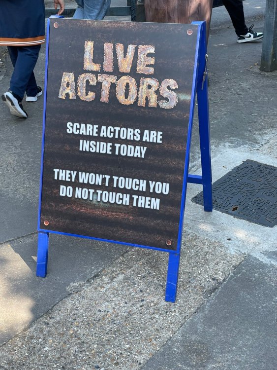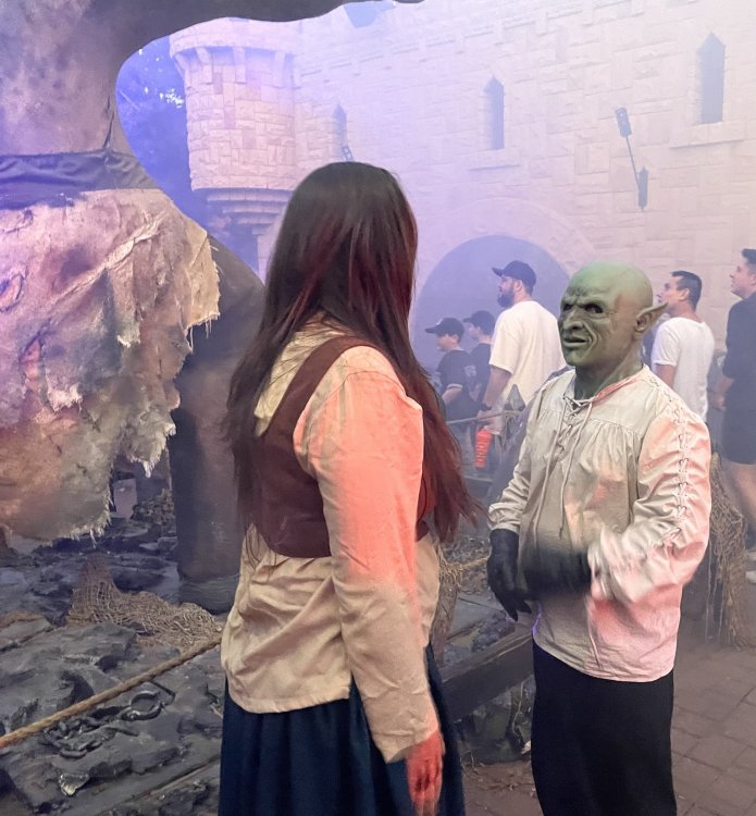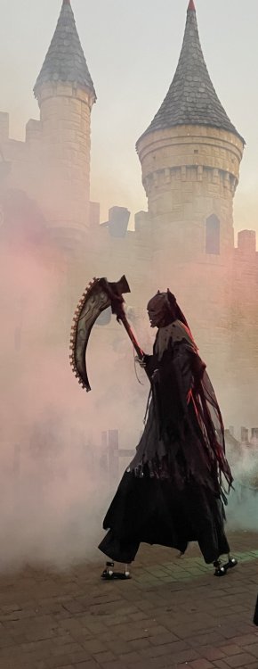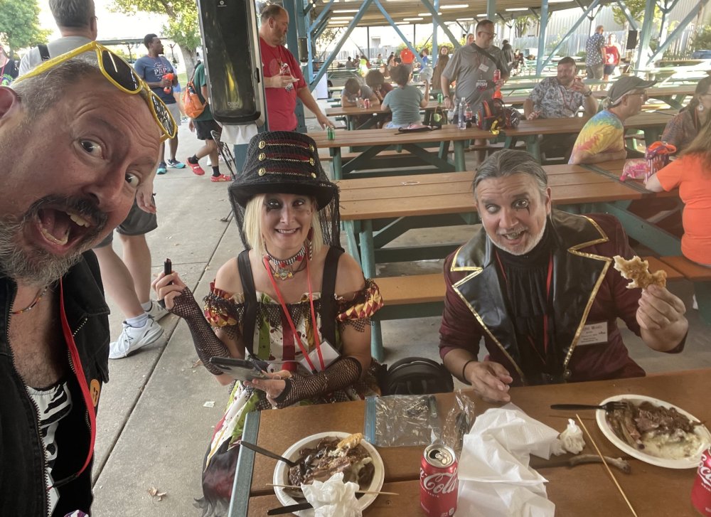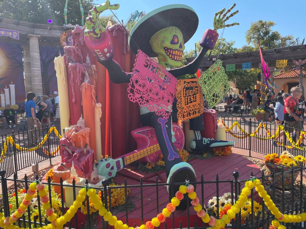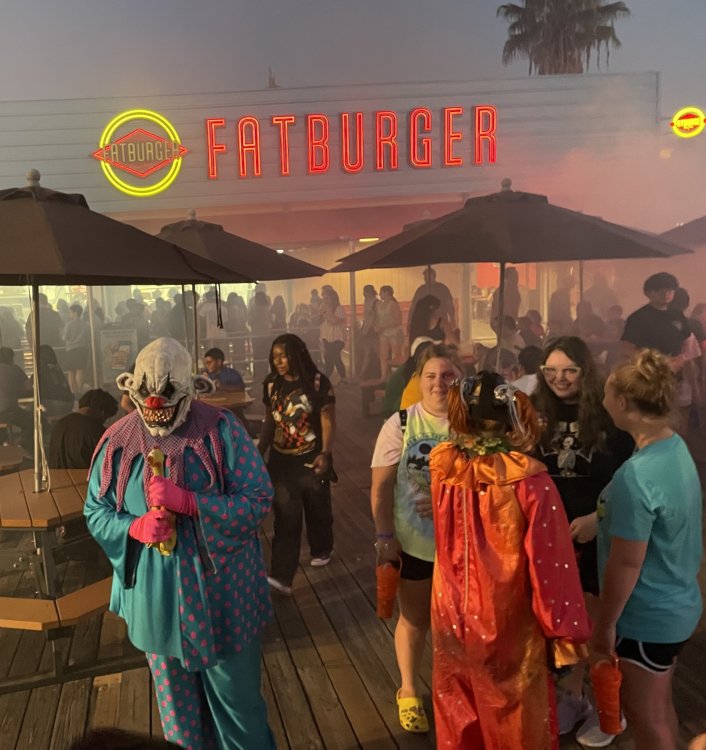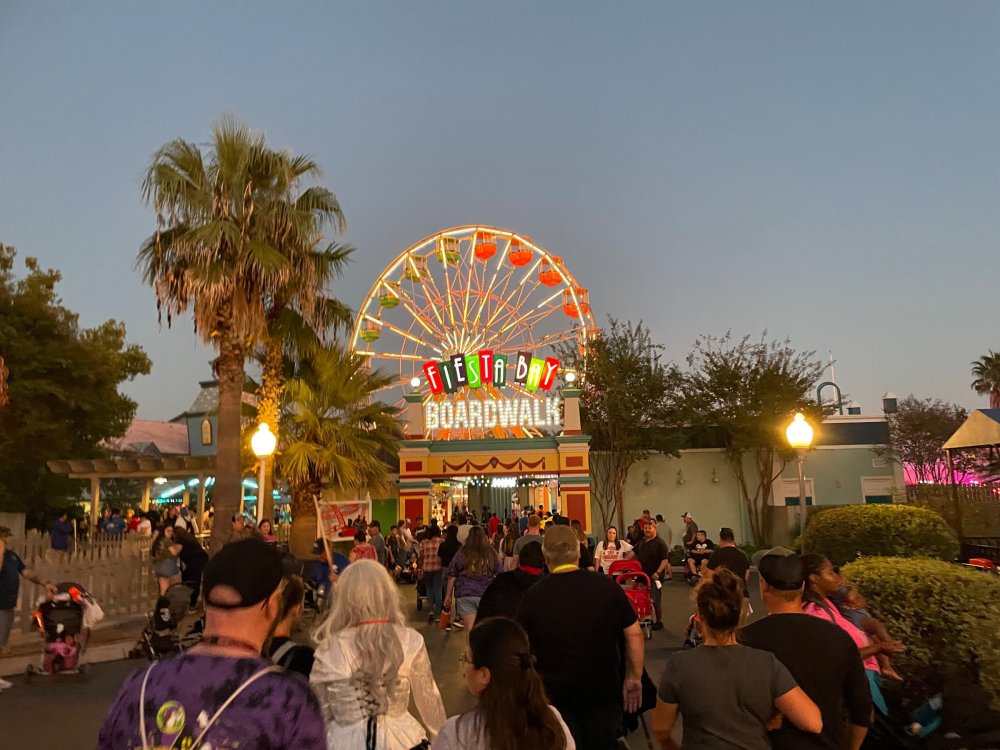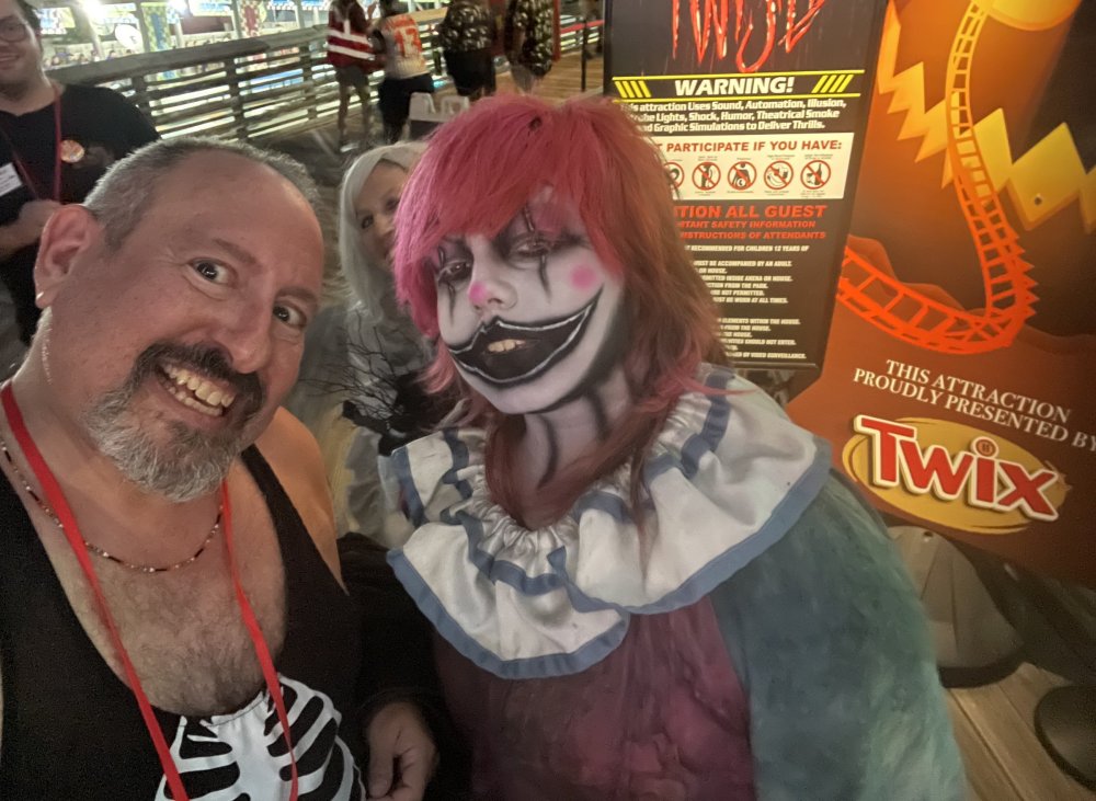 as part of Fright Bash, we had reserved seating for several shows - and although Fiesta is well known for their shows, I had seen versions of the evening ones, and so was most excited about "Haunted Hollywood" - a Halloween version of the excellent Hollywood thru the years show the park had new for 2024. it's mostly the same cast (a few new faces) performing "spooky" or "scary" songs. . .y'all. .it's SO good. highly, highly recommended: wish I could remember all the songs. . but they were mostly of the Halloween variety. . . really talented cast tho. (the only one I didn't care for was "Feed My Frankenstein" - as the guy was way out of key (and that's hard to do on an Alice Cooper song). . but huge props to him for making it down all those stairs in the giant Frankenstein boots). the Count with the puppet Dracula was hysterical. . and the song was so good too (even if I can't recall it right now) this one I remember, as it truly is a show standout: "Psycho Killer". . featuring little Vignettes of each victim being chased by their killer. . . before all joining up in the center stage for some great choreography. and HUGE points to the park for staying in true character - the "bad guys" all run. . . except for Michael Myers. . he just slowly walks after his victim. perfection! the Addams Family theme song a kinda cringy "dancing pillowcases" number for Casper the Friendly ghost. but I mean. . it was amusing. and of course, the show ender/ show stopper, is a full performance of "Thriller" after the show, the organizers asked all attendees on the stage for a group picture (I kept my hat on, so a bit noticeable) and then we got a meet and greet with the cast. . these 3 are among my favorite performers at SFFT, and any show they are in? I'll be there! back out into the heat, we had a couple of hours until dinner. . so it was time to ride some stuff! pic by my friend Belinda - who's in the very front. SO many characters out during the day (I would guess many of them change outfits to be ghouls at night). . but so many photo ops, and this is a lovely park anyways! Supergirl retheme completely done, and the Starflyer looks great. after a bunch of riding (I had my camera put away, so not many pics) it was time for dinner, and some Q&A with park folks. I didn't take a pic of my dinner, but did bump into the Quirky Coaster Couple (who had changed from Luigi/Mario for a "nighttime" look). Glad I snapped this pic, as you can get a look at the food. the chicken schnitzel on a stick was incredible, as were the ribs, and the german potato salad (and potato pancakes with applesauce). as a group of 17 strong (!) we decided to hit some of the houses that opened at 6.. as most folks were heading over to the Crackaxle train station for the Arrival (where the scarezone actors arrive by train and pour out into their own scare zones thruout the park). it was SO crowded that day, that I didn't want to be anywhere near Crackaxle - so instead we hit the Stranger Things House (yawn), the Conjuring House (excellent!!), Slaughterhouse (very good), the Voodoo House (which during the day is a kid friendly "tour of the collector's store" walkthru, but at night is filled with scare actors and low lights), Trapped (way better than in previous years, as they took some of the props from the discontinued Buried Alive house). the Voodoo house let us out right into the scare zone in Spassburg, so we decided it was close enough to the Arrival, that we would wait for the characters to arrive in the Scarezone before continuing onto the boardwalk - as the big outdoor maze (Hell Cemetery) is staffed by some of the ghouls on the train. it was a perfect spot to get some pics as they slowly made their way into the park, from a PACKED (so I was told) Crackaxle train stop. once they scare actors were out and about in the park, we headed to the boardwalk for the last House, Twisted, and the large (free) outdoor maze Hell Acres: the clown zone had filled up with scare actors from the Arrival. I think people don't realize this is a house here, and they think it's a queue for Pandemonium. but it never really has a line, even without the skip the line, we wouldn't have had to wait very long in the regular pass line. but it's a great house, with some really good animatronics in it. it had gotten a bit too stuffy, so had put the hat in the car after dinner. . . loved Twisted, but then down the steps to the Cemetery. Excellent. Large. and Free (as it's considered a Scare Zone, not a house) SUCH atmosphere down here. and some wonderfully spooky pics of the boardwalk due to the lights and fog. this one also benefited from reuse of props from the closed Buried Alive and Rockkill High houses. after this, we walked across the park to the other outdoor walkthru "Scarezone" - "Fear Acres" - which takes over a pretty good chunk of the waterpark, and has historically been SO packed, that I've never even gone thru the whole thing. Surprisingly as packed as the park was? "Fear Acres" had no line to get in, and the crowds were moving pretty well thru this large, and very well staffed haunt zone. crazy farmers, scarecrows, pig masks, machetes and chainsaws. . . check. very good, and for free too. . even if the makeups were mainly greasepaint and not as intricate as in the houses. we had reserved seating for two more shows, and the fireworkds "Frightful Finale" - followed by an hour + ERT on Dr. Diabolical and Iron Rattler. . . . but doing the math in my head, I said to my friend (who had driven). . if we stay for the fireworks, we're not getting home until 2am. as even if we dont' stay for ERT, we'll be stuck in the parking lot. I was exhausted - having been to a late concert the night before, and still not recovered from Germany late nights. . . so I told him I'm ok with whatever he wants to do. His son had come with us and he also works nights and he had gotten off work and immediately got in the car with us to San Antonio. . so I know he was tired too. so