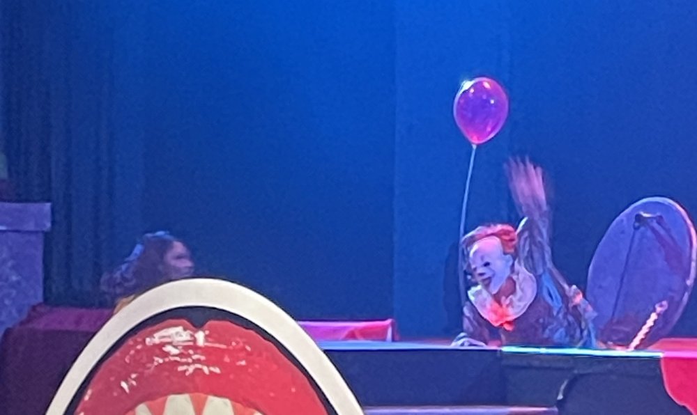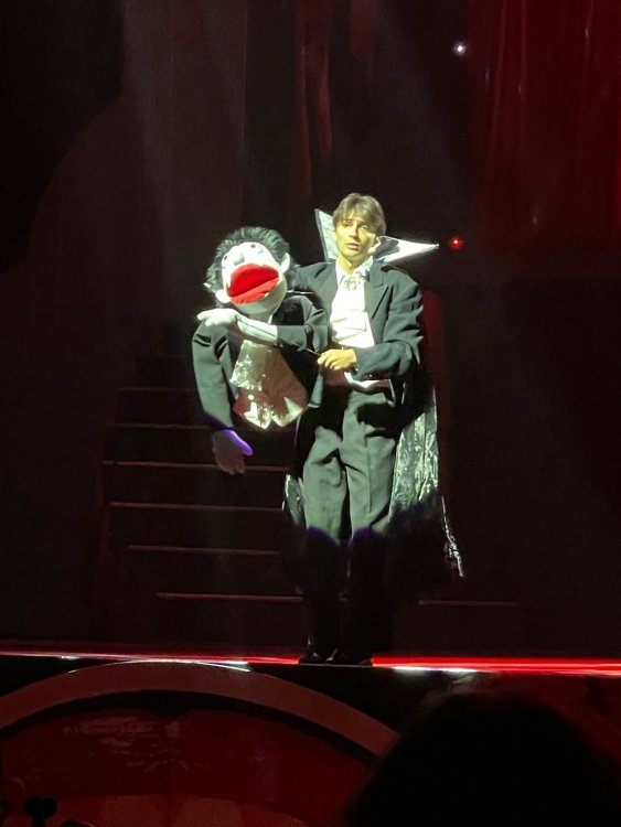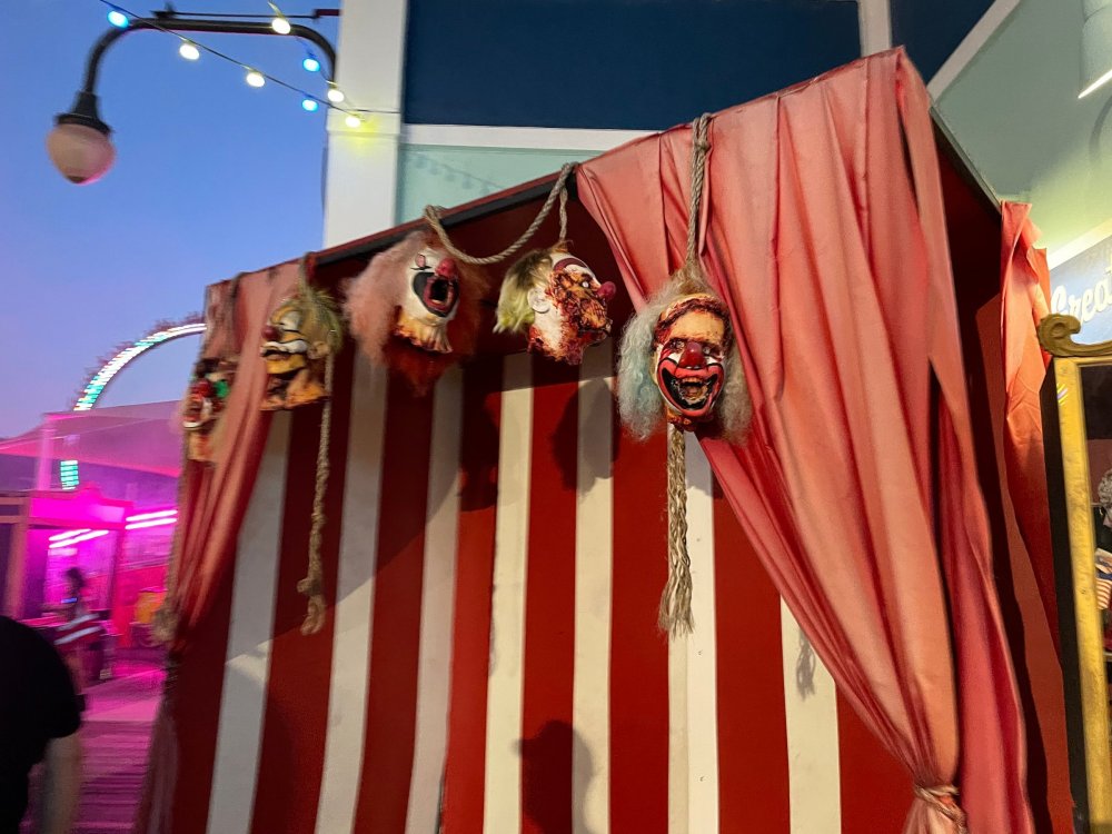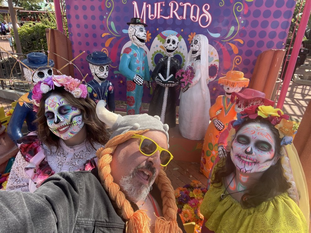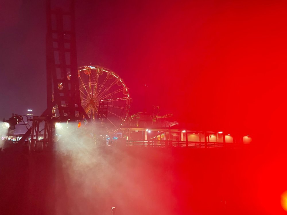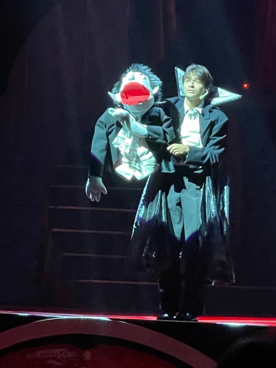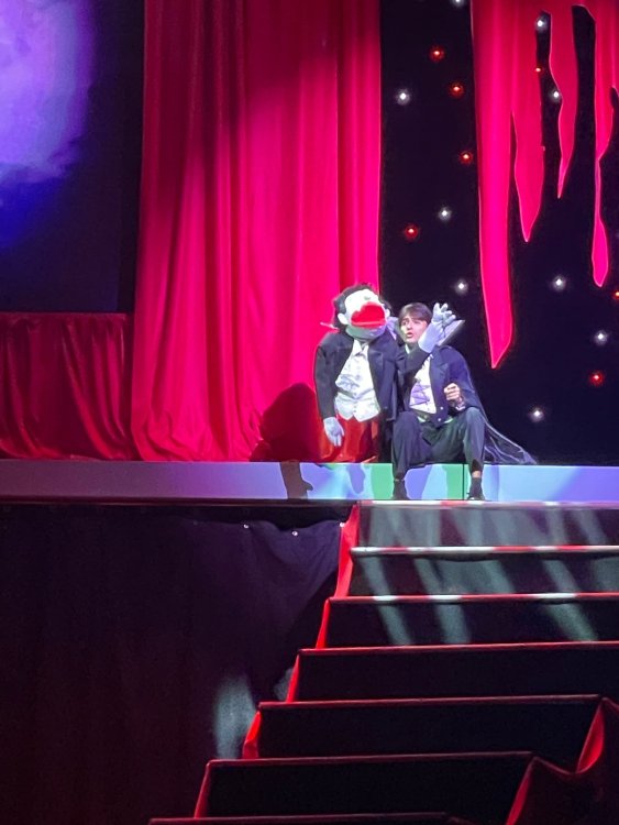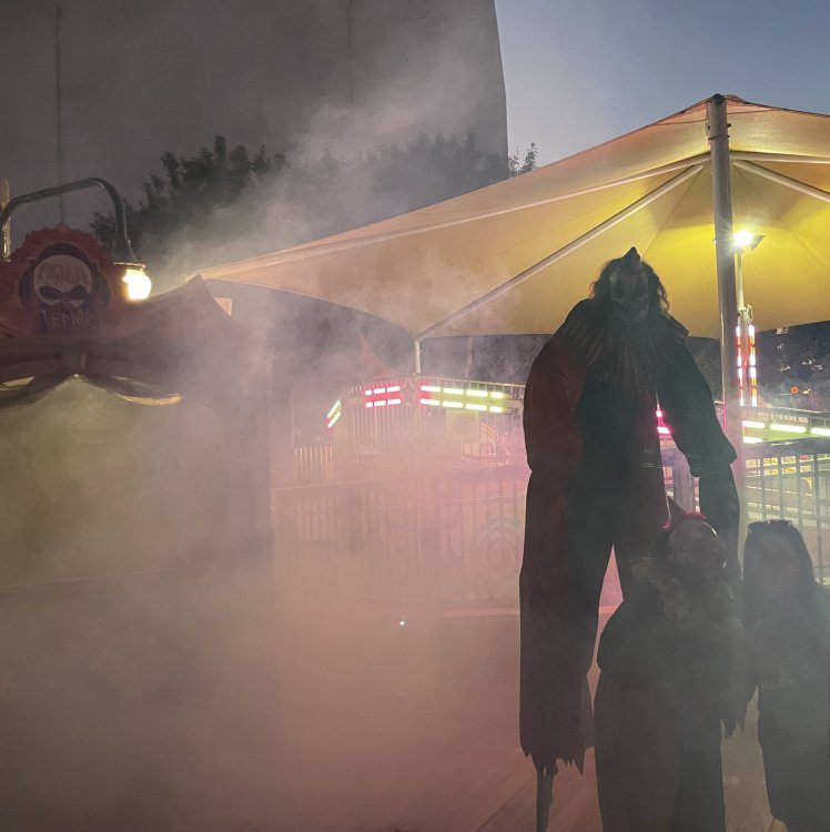 as part of Fright Bash, we had reserved seating for several shows - and although Fiesta is well known for their shows, I had seen versions of the evening ones, and so was most excited about "Haunted Hollywood" - a Halloween version of the excellent Hollywood thru the years show the park had new for 2024. it's mostly the same cast (a few new faces) performing "spooky" or "scary" songs. . .y'all. .it's SO good. highly, highly recommended: wish I could remember all the songs. . but they were mostly of the Halloween variety. . . really talented cast tho. (the only one I didn't care for was "Feed My Frankenstein" - as the guy was way out of key (and that's hard to do on an Alice Cooper song). . but huge props to him for making it down all those stairs in the giant Frankenstein boots). the Count with the puppet Dracula was hysterical. . and the song was so good too (even if I can't recall it right now) this one I remember, as it truly is a show standout: "Psycho Killer". . featuring little Vignettes of each victim being chased by their killer. . . before all joining up in the center stage for some great choreography. and HUGE points to the park for staying in true character - the "bad guys" all run. . . except for Michael Myers. . he just slowly walks after his victim. perfection! the Addams Family theme song a kinda cringy "dancing pillowcases" number for Casper the Friendly ghost. but I mean. . it was amusing. and of course, the show ender/ show stopper, is a full performance of "Thriller" after the show, the organizers asked all attendees on the stage for a group picture (I kept my hat on, so a bit noticeable) and then we got a meet and greet with the cast. . these 3 are among my favorite performers at SFFT, and any show they are in? I'll be there! back out into the heat, we had a couple of hours until dinner. . so it was time to ride some stuff! pic by my friend Belinda - who's in the very front. SO many characters out during the day (I would guess many of them change outfits to be ghouls at night). . but so many photo ops, and this is a lovely park anyways! Supergirl retheme completely done, and the Starflyer looks great. after a bunch of riding (I had my camera put away, so not many pics) it was time for dinner, and some Q&A with park folks. I didn't take a pic of my dinner, but did bump into the Quirky Coaster Couple (who had changed from Luigi/Mario for a "nighttime" look). Glad I snapped this pic, as you can get a look at the food. the chicken schnitzel on a stick was incredible, as were the ribs, and the german potato salad (and potato pancakes with applesauce). as a group of 17 strong (!) we decided to hit some of the houses that opened at 6.. as most folks were heading over to the Crackaxle train station for the Arrival (where the scarezone actors arrive by train and pour out into their own scare zones thruout the park). it was SO crowded that day, that I didn't want to be anywhere near Crackaxle - so instead we hit the Stranger Things House (yawn), the Conjuring House (excellent!!), Slaughterhouse (very good), the Voodoo House (which during the day is a kid friendly "tour of the collector's store" walkthru, but at night is filled with scare actors and low lights), Trapped (way better than in previous years, as they took some of the props from the discontinued Buried Alive house). the Voodoo house let us out right into the scare zone in Spassburg, so we decided it was close enough to the Arrival, that we would wait for the characters to arrive in the Scarezone before continuing onto the boardwalk - as the big outdoor maze (Hell Cemetery) is staffed by some of the ghouls on the train. it was a perfect spot to get some pics as they slowly made their way into the park, from a PACKED (so I was told) Crackaxle train stop. once they scare actors were out and about in the park, we headed to the boardwalk for the last House, Twisted, and the large (free) outdoor maze Hell Acres: the clown zone had filled up with scare actors from the Arrival. I think people don't realize this is a house here, and they think it's a queue for Pandemonium. but it never really has a line, even without the skip the line, we wouldn't have had to wait very long in the regular pass line. but it's a great house, with some really good animatronics in it. it had gotten a bit too stuffy, so had put the hat in the car after dinner. . . loved Twisted, but then down the steps to the Cemetery. Excellent. Large. and Free (as it's considered a Scare Zone, not a house) SUCH atmosphere down here. and some wonderfully spooky pics of the boardwalk due to the lights and fog. this one also benefited from reuse of props from the closed Buried Alive and Rockkill High houses. after this, we walked across the park to the other outdoor walkthru "Scarezone" - "Fear Acres" - which takes over a pretty good chunk of the waterpark, and has historically been SO packed, that I've never even gone thru the whole thing. Surprisingly as packed as the park was? "Fear Acres" had no line to get in, and the crowds were moving pretty well thru this large, and very well staffed haunt zone. crazy farmers, scarecrows, pig masks, machetes and chainsaws. . . check. very good, and for free too. . even if the makeups were mainly greasepaint and not as intricate as in the houses. we had reserved seating for two more shows, and the fireworkds "Frightful Finale" - followed by an hour + ERT on Dr. Diabolical and Iron Rattler. . . . but doing the math in my head, I said to my friend (who had driven). . if we stay for the fireworks, we're not getting home until 2am. as even if we dont' stay for ERT, we'll be stuck in the parking lot. I was exhausted - having been to a late concert the night before, and still not recovered from Germany late nights. . . so I told him I'm ok with whatever he wants to do. His son had come with us and he also works nights and he had gotten off work and immediately got in the car with us to San Antonio. . so I know he was tired too. so