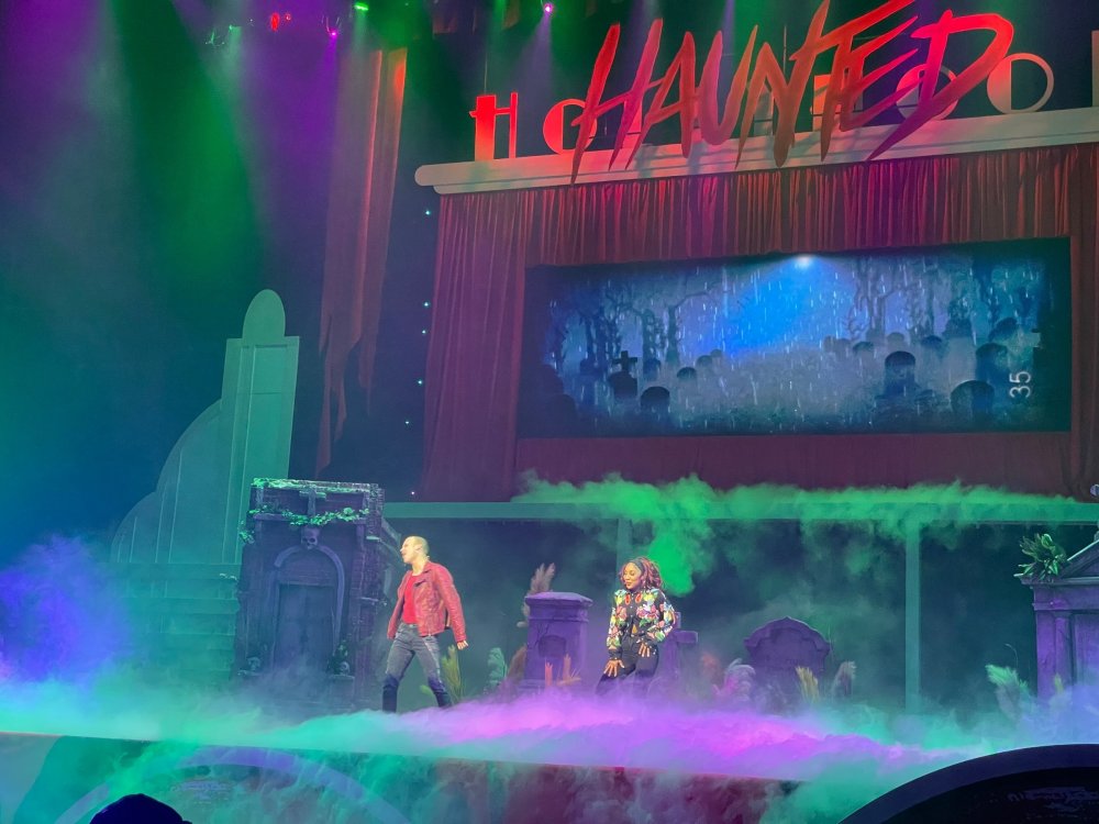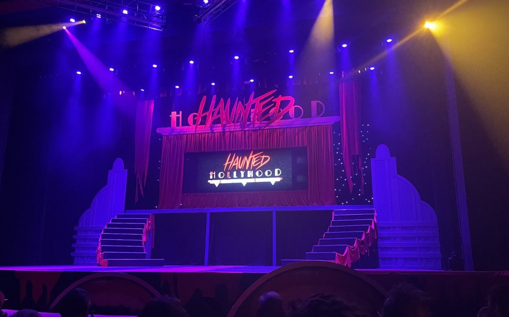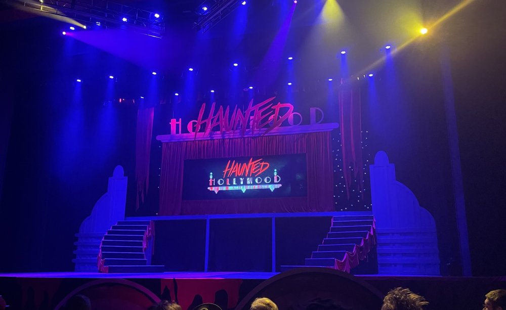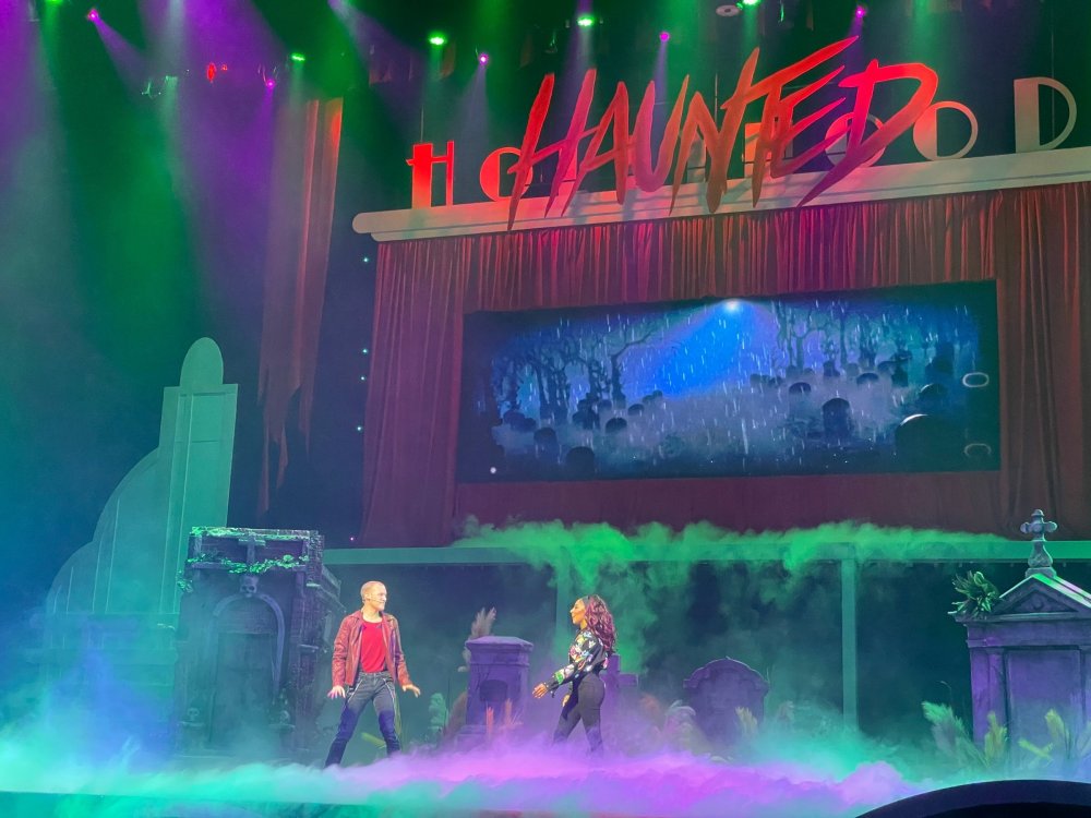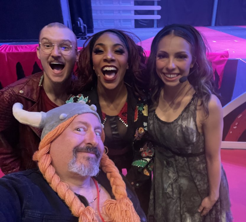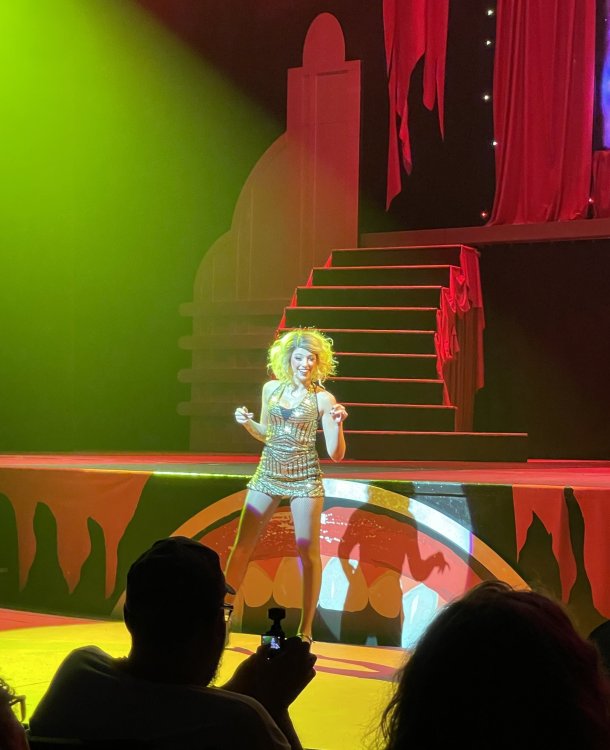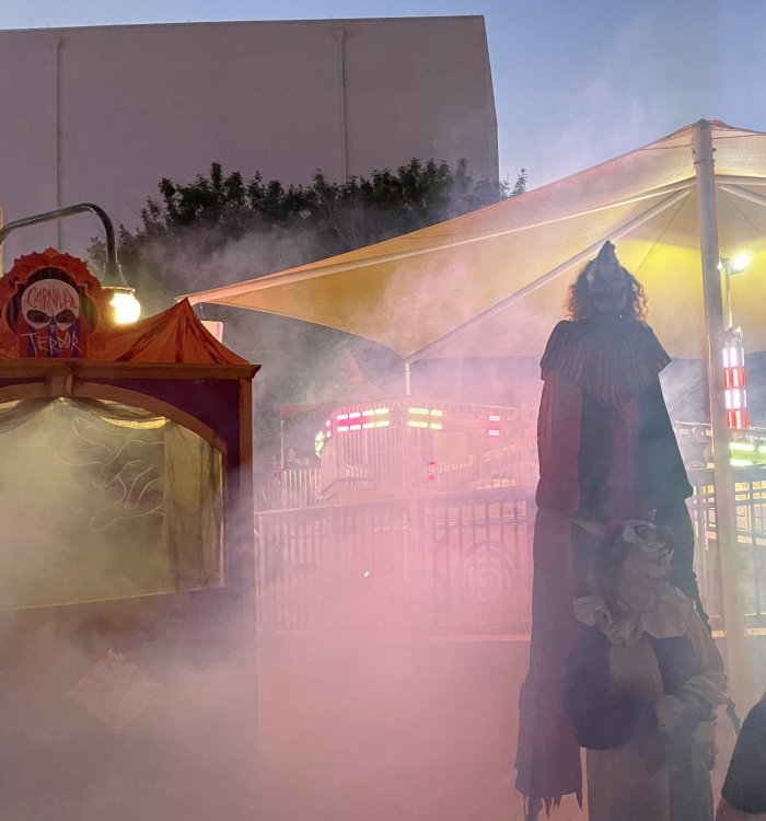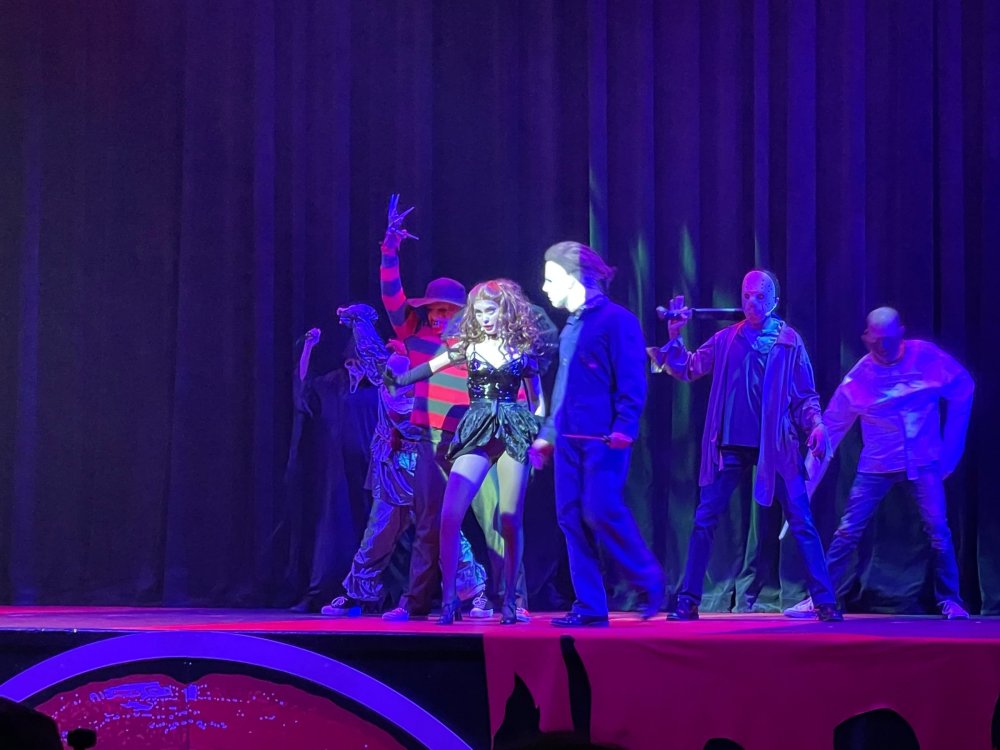 as part of Fright Bash, we had reserved seating for several shows - and although Fiesta is well known for their shows, I had seen versions of the evening ones, and so was most excited about "Haunted Hollywood" - a Halloween version of the excellent Hollywood thru the years show the park had new for 2024. it's mostly the same cast (a few new faces) performing "spooky" or "scary" songs. . .y'all. .it's SO good. highly, highly recommended: wish I could remember all the songs. . but they were mostly of the Halloween variety. . . really talented cast tho. (the only one I didn't care for was "Feed My Frankenstein" - as the guy was way out of key (and that's hard to do on an Alice Cooper song). . but huge props to him for making it down all those stairs in the giant Frankenstein boots). the Count with the puppet Dracula was hysterical. . and the song was so good too (even if I can't recall it right now) this one I remember, as it truly is a show standout: "Psycho Killer". . featuring little Vignettes of each victim being chased by their killer. . . before all joining up in the center stage for some great choreography. and HUGE points to the park for staying in true character - the "bad guys" all run. . . except for Michael Myers. . he just slowly walks after his victim. perfection! the Addams Family theme song a kinda cringy "dancing pillowcases" number for Casper the Friendly ghost. but I mean. . it was amusing. and of course, the show ender/ show stopper, is a full performance of "Thriller" after the show, the organizers asked all attendees on the stage for a group picture (I kept my hat on, so a bit noticeable) and then we got a meet and greet with the cast. . these 3 are among my favorite performers at SFFT, and any show they are in? I'll be there! back out into the heat, we had a couple of hours until dinner. . so it was time to ride some stuff! pic by my friend Belinda - who's in the very front. SO many characters out during the day (I would guess many of them change outfits to be ghouls at night). . but so many photo ops, and this is a lovely park anyways! Supergirl retheme completely done, and the Starflyer looks great. after a bunch of riding (I had my camera put away, so not many pics) it was time for dinner, and some Q&A with park folks. I didn't take a pic of my dinner, but did bump into the Quirky Coaster Couple (who had changed from Luigi/Mario for a "nighttime" look). Glad I snapped this pic, as you can get a look at the food. the chicken schnitzel on a stick was incredible, as were the ribs, and the german potato salad (and potato pancakes with applesauce). as a group of 17 strong (!) we decided to hit some of the houses that opened at 6.. as most folks were heading over to the Crackaxle train station for the Arrival (where the scarezone actors arrive by train and pour out into their own scare zones thruout the park). it was SO crowded that day, that I didn't want to be anywhere near Crackaxle - so instead we hit the Stranger Things House (yawn), the Conjuring House (excellent!!), Slaughterhouse (very good), the Voodoo House (which during the day is a kid friendly "tour of the collector's store" walkthru, but at night is filled with scare actors and low lights), Trapped (way better than in previous years, as they took some of the props from the discontinued Buried Alive house). the Voodoo house let us out right into the scare zone in Spassburg, so we decided it was close enough to the Arrival, that we would wait for the characters to arrive in the Scarezone before continuing onto the boardwalk - as the big outdoor maze (Hell Cemetery) is staffed by some of the ghouls on the train. it was a perfect spot to get some pics as they slowly made their way into the park, from a PACKED (so I was told) Crackaxle train stop. once they scare actors were out and about in the park, we headed to the boardwalk for the last House, Twisted, and the large (free) outdoor maze Hell Acres: the clown zone had filled up with scare actors from the Arrival. I think people don't realize this is a house here, and they think it's a queue for Pandemonium. but it never really has a line, even without the skip the line, we wouldn't have had to wait very long in the regular pass line. but it's a great house, with some really good animatronics in it. it had gotten a bit too stuffy, so had put the hat in the car after dinner. . . loved Twisted, but then down the steps to the Cemetery. Excellent. Large. and Free (as it's considered a Scare Zone, not a house) SUCH atmosphere down here. and some wonderfully spooky pics of the boardwalk due to the lights and fog. this one also benefited from reuse of props from the closed Buried Alive and Rockkill High houses. after this, we walked across the park to the other outdoor walkthru "Scarezone" - "Fear Acres" - which takes over a pretty good chunk of the waterpark, and has historically been SO packed, that I've never even gone thru the whole thing. Surprisingly as packed as the park was? "Fear Acres" had no line to get in, and the crowds were moving pretty well thru this large, and very well staffed haunt zone. crazy farmers, scarecrows, pig masks, machetes and chainsaws. . . check. very good, and for free too. . even if the makeups were mainly greasepaint and not as intricate as in the houses. we had reserved seating for two more shows, and the fireworkds "Frightful Finale" - followed by an hour + ERT on Dr. Diabolical and Iron Rattler. . . . but doing the math in my head, I said to my friend (who had driven). . if we stay for the fireworks, we're not getting home until 2am. as even if we dont' stay for ERT, we'll be stuck in the parking lot. I was exhausted - having been to a late concert the night before, and still not recovered from Germany late nights. . . so I told him I'm ok with whatever he wants to do. His son had come with us and he also works nights and he had gotten off work and immediately got in the car with us to San Antonio. . so I know he was tired too. so