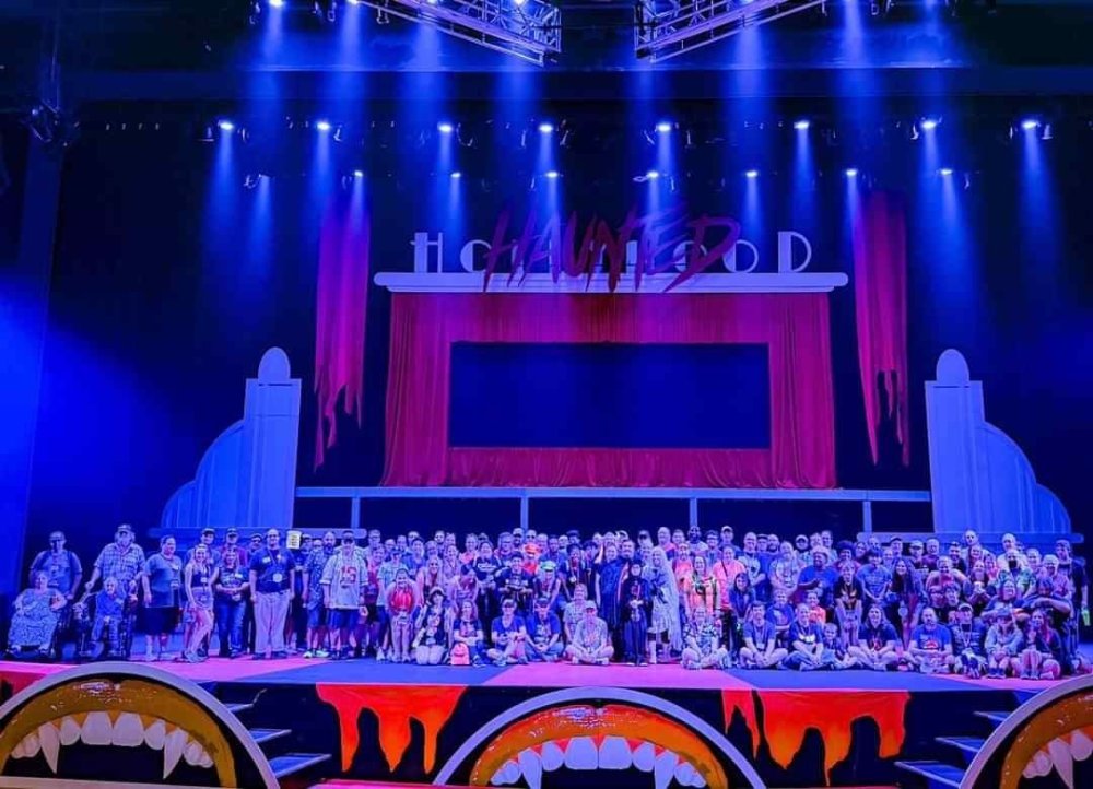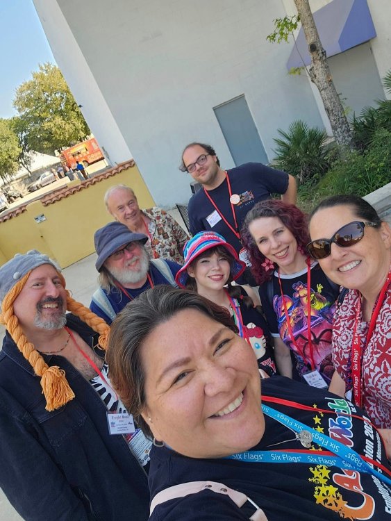 as part of Fright Bash, we had reserved seating for several shows - and although Fiesta is well known for their shows, I had seen versions of the evening ones, and so was most excited about "Haunted Hollywood" - a Halloween version of the excellent Hollywood thru the years show the park had new for 2024. it's mostly the same cast (a few new faces) performing "spooky" or "scary" songs. . .y'all. .it's SO good. highly, highly recommended: wish I could remember all the songs. . but they were mostly of the Halloween variety. . . really talented cast tho. (the only one I didn't care for was "Feed My Frankenstein" - as the guy was way out of key (and that's hard to do on an Alice Cooper song). . but huge props to him for making it down all those stairs in the giant Frankenstein boots). the Count with the puppet Dracula was hysterical. . and the song was so good too (even if I can't recall it right now) this one I remember, as it truly is a show standout: "Psycho Killer". . featuring little Vignettes of each victim being chased by their killer. . . before all joining up in the center stage for some great choreography. and HUGE points to the park for staying in true character - the "bad guys" all run. . . except for Michael Myers. . he just slowly walks after his victim. perfection! the Addams Family theme song a kinda cringy "dancing pillowcases" number for Casper the Friendly ghost. but I mean. . it was amusing. and of course, the show ender/ show stopper, is a full performance of "Thriller" after the show, the organizers asked all attendees on the stage for a group picture (I kept my hat on, so a bit noticeable) and then we got a meet and greet with the cast. . these 3 are among my favorite performers at SFFT, and any show they are in? I'll be there! back out into the heat, we had a couple of hours until dinner. . so it was time to ride some stuff! pic by my friend Belinda - who's in the very front. SO many characters out during the day (I would guess many of them change outfits to be ghouls at night). . but so many photo ops, and this is a lovely park anyways! Supergirl retheme completely done, and the Starflyer looks great. after a bunch of riding (I had my camera put away, so not many pics) it was time for dinner, and some Q&A with park folks. I didn't take a pic of my dinner, but did bump into the Quirky Coaster Couple (who had changed from Luigi/Mario for a "nighttime" look). Glad I snapped this pic, as you can get a look at the food. the chicken schnitzel on a stick was incredible, as were the ribs, and the german potato salad (and potato pancakes with applesauce). as a group of 17 strong (!) we decided to hit some of the houses that opened at 6.. as most folks were heading over to the Crackaxle train station for the Arrival (where the scarezone actors arrive by train and pour out into their own scare zones thruout the park). it was SO crowded that day, that I didn't want to be anywhere near Crackaxle - so instead we hit the Stranger Things House (yawn), the Conjuring House (excellent!!), Slaughterhouse (very good), the Voodoo House (which during the day is a kid friendly "tour of the collector's store" walkthru, but at night is filled with scare actors and low lights), Trapped (way better than in previous years, as they took some of the props from the discontinued Buried Alive house). the Voodoo house let us out right into the scare zone in Spassburg, so we decided it was close enough to the Arrival, that we would wait for the characters to arrive in the Scarezone before continuing onto the boardwalk - as the big outdoor maze (Hell Cemetery) is staffed by some of the ghouls on the train. it was a perfect spot to get some pics as they slowly made their way into the park, from a PACKED (so I was told) Crackaxle train stop. once they scare actors were out and about in the park, we headed to the boardwalk for the last House, Twisted, and the large (free) outdoor maze Hell Acres: the clown zone had filled up with scare actors from the Arrival. I think people don't realize this is a house here, and they think it's a queue for Pandemonium. but it never really has a line, even without the skip the line, we wouldn't have had to wait very long in the regular pass line. but it's a great house, with some really good animatronics in it. it had gotten a bit too stuffy, so had put the hat in the car after dinner. . . loved Twisted, but then down the steps to the Cemetery. Excellent. Large. and Free (as it's considered a Scare Zone, not a house) SUCH atmosphere down here. and some wonderfully spooky pics of the boardwalk due to the lights and fog. this one also benefited from reuse of props from the closed Buried Alive and Rockkill High houses. after this, we walked across the park to the other outdoor walkthru "Scarezone" - "Fear Acres" - which takes over a pretty good chunk of the waterpark, and has historically been SO packed, that I've never even gone thru the whole thing. Surprisingly as packed as the park was? "Fear Acres" had no line to get in, and the crowds were moving pretty well thru this large, and very well staffed haunt zone. crazy farmers, scarecrows, pig masks, machetes and chainsaws. . . check. very good, and for free too. . even if the makeups were mainly greasepaint and not as intricate as in the houses. we had reserved seating for two more shows, and the fireworkds "Frightful Finale" - followed by an hour + ERT on Dr. Diabolical and Iron Rattler. . . . but doing the math in my head, I said to my friend (who had driven). . if we stay for the fireworks, we're not getting home until 2am. as even if we dont' stay for ERT, we'll be stuck in the parking lot. I was exhausted - having been to a late concert the night before, and still not recovered from Germany late nights. . . so I told him I'm ok with whatever he wants to do. His son had come with us and he also works nights and he had gotten off work and immediately got in the car with us to San Antonio. . so I know he was tired too. so