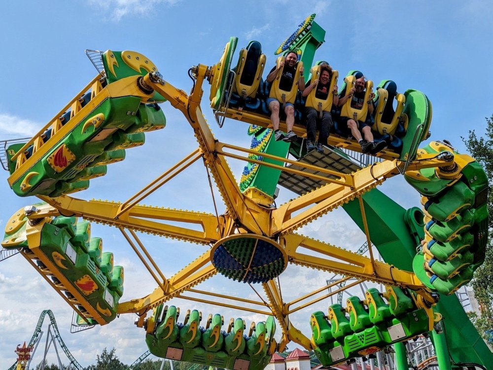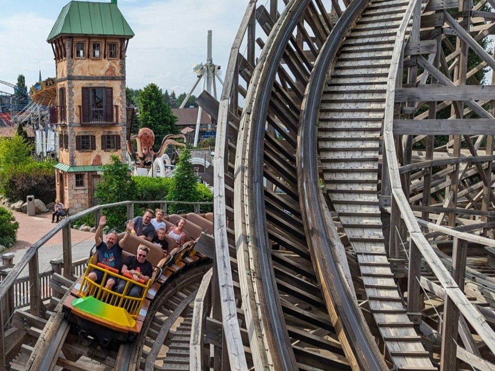 Day 22: Saturday, June 24th - busy morning at Särkänniemi (before a drive to Helsinki). Part 1 of 2 Starting off bright and early (well. . overcast a little and early, but it never rained). a peek at the outskirts of the park, and the bus we'd been riding in since landing in Finland on that flight. they really did cram quite a bit of stuff in here . . tho honestly, the vast majority of it I didn't care for. but what I loved? I REALLY loved. the main gates: and the park's landmark tower - it houses a fancy restaurant at the top (can't recall if it spun or not), and in the base, a small, but decent, aquarium/reptile house, as well as gift shop, and I THINK a planetarium? even in Finland, those *freaking* scooters are just left everywhere. headed into the main park - via a back walkway. . . Similar to the exhibited motor I had seen yesterday, inside the park - albeit in a "backyard" area - was a preserved train. I didn't want to leave the group to go take a look at it, so not sure why they have it preserved here. VERY cool. . our path in, walks along side and under the park's flume ride, and the Intamin coaster. here's a good look at Tornado - the Intamin suspended coaster, that I believe is the last of it's kind in the world. \ weirdly, Tornado's station is underground, in a very "industrial" setting. we went in thru the exit, I think, so didn't see the main queue that goes down steps from the top of the hill. but got a pic of the ride sign, as we went into the exit queue. as noted yesterday, bright neon Orange & Yellow trains. why? I dunno. . but they sure are noticeable. we greatly enjoyed our morning ERT on this ride. rode it at least 8 times. . and since they were running both trains? got some pretty zen rides. Steve and I (I believe courtesy of Elissa) Matthew looks like he's enjoying it! quick peek into the operators booth, while taking a break between rides. Wheeeee! very Zen in the front row. (pic courtesy of Elissa) I'm flying, Jack!!! after a bunch of rides, I needed to take a break and stepped into the main park (still before open to public) to snap some pics in the area: the setting of this coaster, really is just perfect for pictures. not sure why it's the last of it's kind, the ride is great! more parks should have them. perusing the park ahead of us. .it really is quite lovely. tho has a bit of an identity crisis. . . like it's not sure what exactly it wants to be. lovely, but small, carousel. that adults were not allowed to ride. But I got a pic, so I'm happy. and an interesting game. . where one sits on a toilet. and "pees" into the bathtubs. I guess? to win Minecraft inspired stuffies. told ya..this park is weird. I did really like how so many kiddie rides are scattered about among the big rides. for example, that Convoy ride, right next to Tornado. "Boom" (what a name, LOL) is actually the drop tower! the Skyrocket II behind it is called "Hype" yeah. I dunno, as I said, "Identity Crisis" the park also has this piece of crap pure torture machine: Trombi - a flying Zamperla Volare. which, by the way, is Finnish for . . . "Tornado" so yeah, they have two coasters named Tornado - one brilliant, and one shitty. oh. . wait. . I should say HAD - RCDB notes it was removed as of late 2023! wasn't quite ready for us tho, so looked around the area while they got it ready to open for us. going for the Gen X crowd? this area has lots of carnival flats - all running pretty decent programs, and all with unique names. other than this Troika. . which was just called "Troika" Turning our attention back to Trombi. .they were getting it ready for us. Even tho it LOOKED like it had been abandoned and was rotting away. but it still wasn't open just yet, so we headed over to the Skyrocket II (Hype) I mean. . I don't MIND the theming, but I don't really "get" it either. I guess as noted, they are going for Gen X? I reminded me very much of Plopsaland and their "youtube" section of the park. apparently the restaurant (that wasn't open yet as we were still before park open) is called "Play" perhaps it blasts music during the day? I rode this, I think, exactly once. i'm just not really a fan of this type of coaster (and didn't ride the one the next day at the final park). but others really love them. death glare from Hans and Jon without glasses. . I wonder if they made everyone take off glasses, even with straps? when it was my turn to ride? I actually let out a guffaw when I sat down in the seat and saw this. And then quickly pulled out my camera to snap a pic (with permission). I don't think this warning label looks like what they THINK it looks like. Rode my one time (maybe I rode twice, but I think only once) and then stepped out front to snap pics Proof I rode it. I even look like I'm having fun? (yeah, no glasses. .they must have made folks take them off) Pics courtesy of Elissa I gathered my wits about me, while others in the group rode Hype a few more times. is this a kids area? there seemed to be more than one. . .but it was nicely detailed over here. . . . if a bit "freaky" and the pavement a bit psychedelic. . or "Q-bert-y" if you prefer (and are of a certain age to understand that) we got the note that Trombi was ready for us, if anyone wanted to ride. I felt we were basically DARED to ride, as I'd heard so many horrible things about Volares (pst. . all were TRUE!!!!) Pic courtesy of Elissa. OMG. . just look at these faces!!! HATED it. hell, I think my back spasm-ed just looking at this pic. I *did* it. . but I don't think I'd do one ever again. . .LOL watching some of the carnival flats cycling. . the park had just opened to the public, and so it were starting to see the first batches of school kids. I don't think I rode the first batch of folks on Take Off (hence getting this pic), but it did end up with it being almost a full TPR cycle. then over to High Voltage..which was no where near as insane as it looked - tho it DOES do some weird things to one's body. see? that's me on the