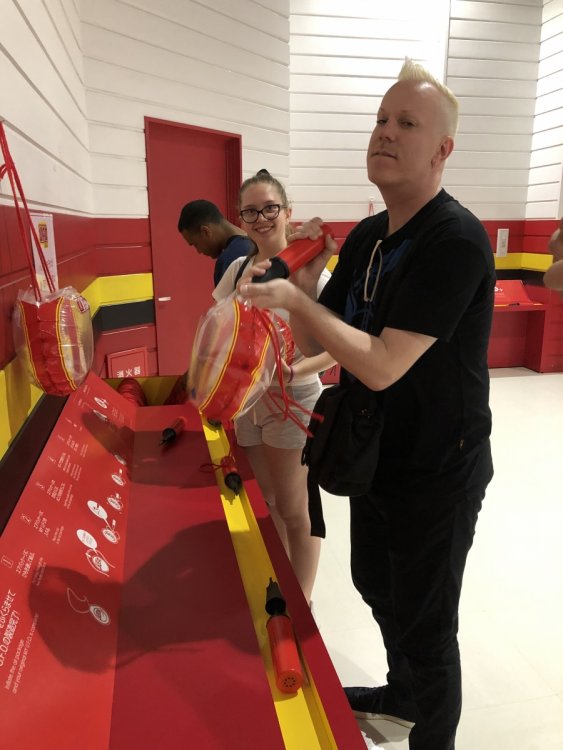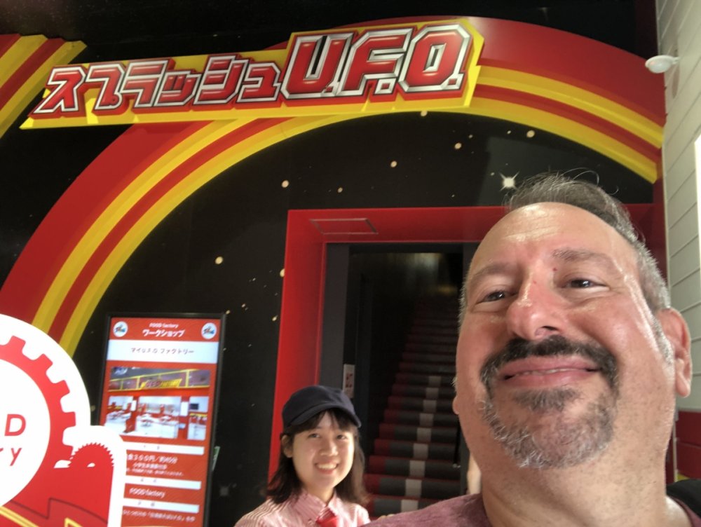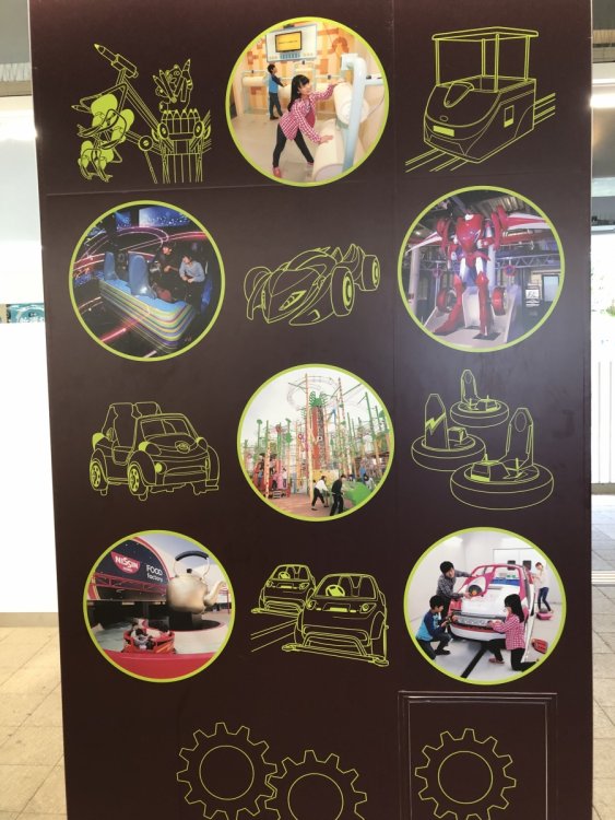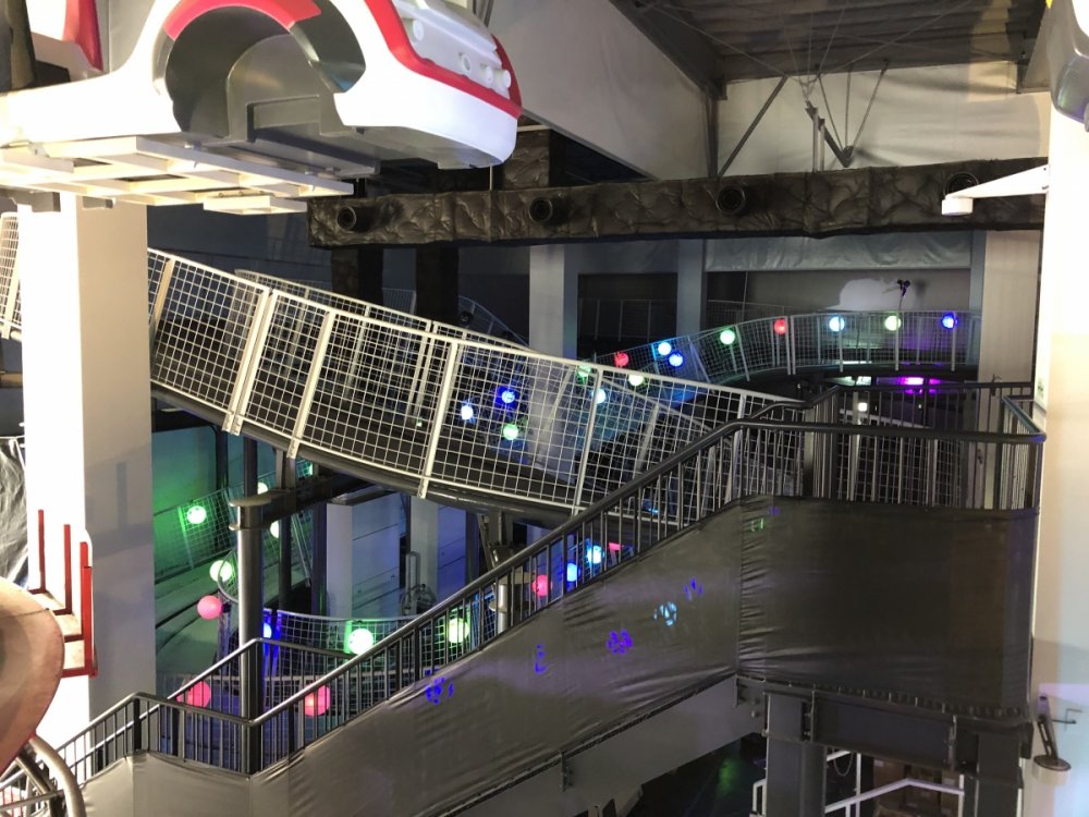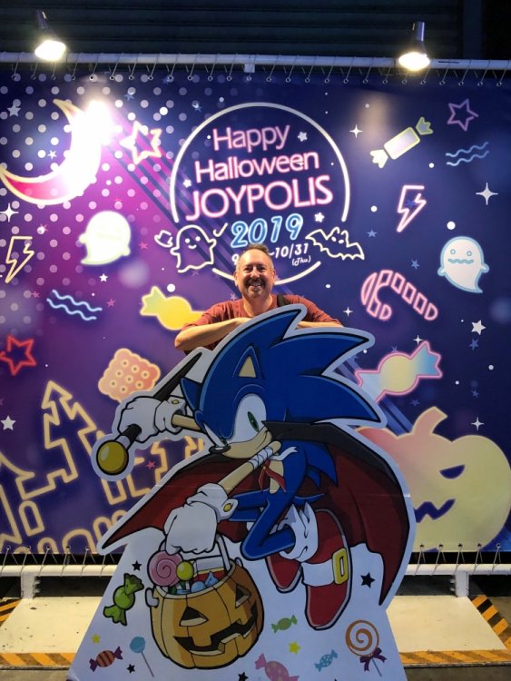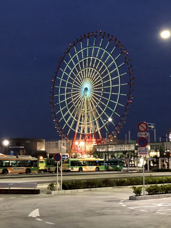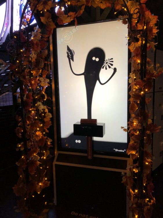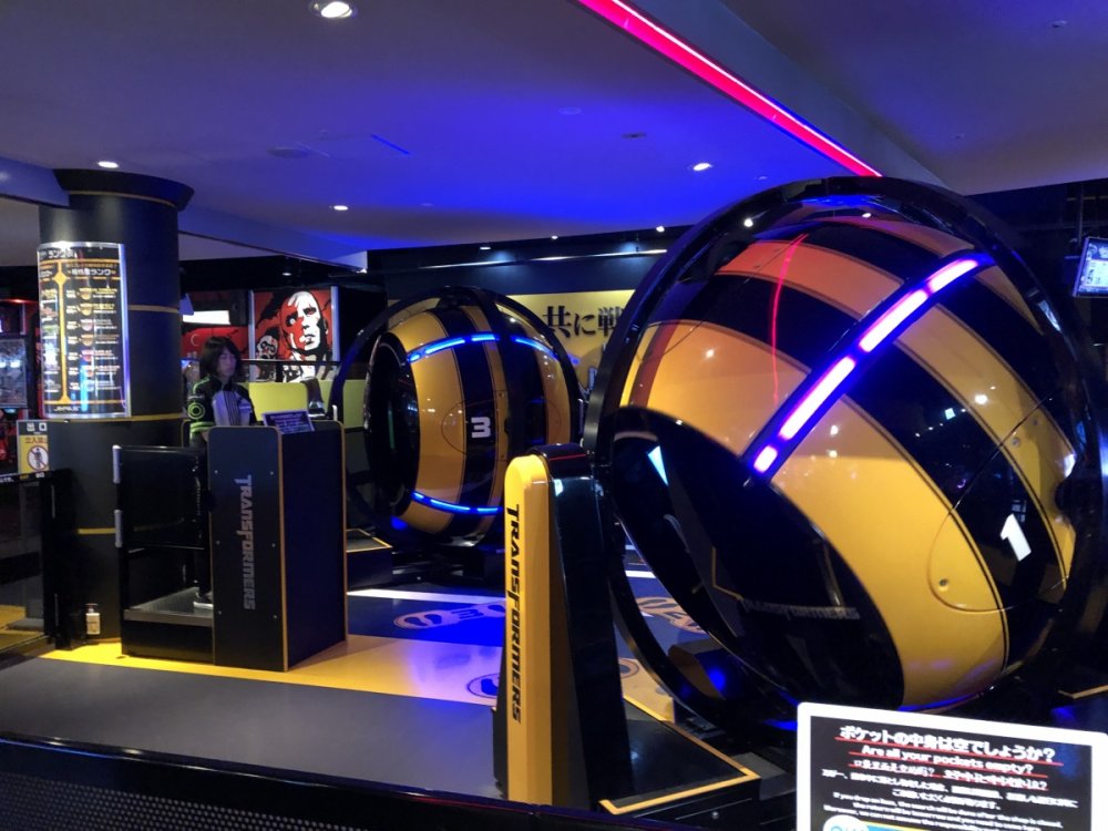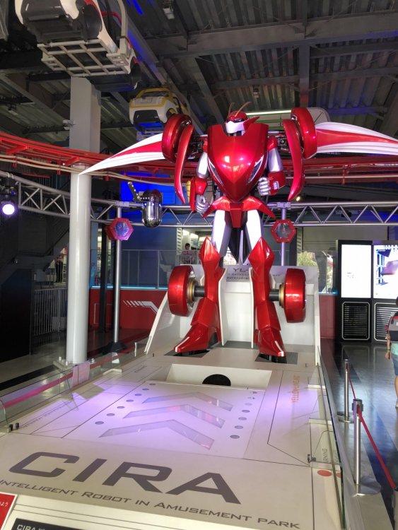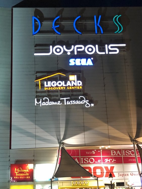so we left Yomiuriland, and after a few train changes, we pulled into the Odaiba Station in Tokyo. We were headed to Tokyo Joypolis (a place my brain insisted on calling "Joy-Opolis", even after hearing it called "Joy-polis" multiple times). It had already been a long day of fun and excitement at Yomiuriland, and I knew I had to get up early in the morning, but no way was I going to pass up a chance to visit this place that I'd heard about for decades - and was home to the first spinning coaster with an inversion. we exited the Station, and weren't exactly sure which way to go. . oh sure, we could have followed the signs, but we didn't need no steenking signs! in actuality, I think most of us (at least I cans speak for myself) was distracted by the wonderfully lit Odaiba Ferris Wheel. .so we exited the station towards that. the Ferris wheel was fantastic looking, and we tentatively discussed coming back later to ride it. .but we soon figured out we needed to go the other direction, and so went up the platform to take the bridge over the traffic. and while walking across got a lovely view of Tokyo. it turns out that Tokyo Joypolis is part of a shopping complex called "Decks" (or as Alex and i called it: "Deksssss", so named because the center, when viewed from the side facing Tokyo Bay, is built to look like a ship. To quote from the booklet I grabbed inside: "The Ship Theme Park! DECKS Tokyo Beach is a ship-themed shopping center. Starting with the wooden open terrace modeled after the deck of a ship, there are decorations thruout the mall that recall boating themes. Walk along the deck and feel the salty sea wind blowing pleasantly across you as you enjoy shopping and dining in a setting that feels as though you're on a luxurious cruise ship sailing around Tokyo Bay. On the 3F Seasside Deck, take in a panoramic view of Tokyo Bay! Relax on a Wave-Themed Sofa, or enjoy the 6F Restaurant Floor's Ocean-themed mural" heh. . I love the "hype text" used in Japan there's also a Legoland Discovery Center, a Madame Tussauds & a bunch of shopping at this center, but we were getting here ~6pm and most were closing or closed). What we were really here for was the top one listed on this sign tho: Sega Joypolis - it was open until 10pm, and although last entry was 9:30 pc, we still had at least 3 1/2 hours before close. we made it! (terrible angle, but we took this pic to prove we found our way there!). and they offered a "Night Passport" after 5pm, which was only ~$35 and included admission and rides for some reason, I didn't take a picture of the front entrance of Joypolis, only this one from outside. not sure why. . I don't even have a blurry one! I blame the excitement of being there, since I DID take pics of the machines we used to buy our Night Passports (all came out so blurry tho, not posting). Joypolis is a really large space: 3 floors, that are packed with activities, and tech wonders. . .there was no way we were even going to get to do a fraction of the attractions offered, even tho it wasn't very crowded. but that was OK, as personally, I really only wanted to do one ride (the coaster) everything else was gravy. our 1st stop was the "Gekion Live Coaster" - this is the spinner with the inversion. It's described on the park map as thus: "Part music game, part roller coaster, it's the world's first "concert coaster" ! You'll fly at insane speeds through a course of spectacular lights and sounds" this coaster apparently gets a lot of overlays, and during our visit, it was themed to a J-Pop band that seemed to be super popular. the first part of the ride, involves the 4 person car stopping multiple times in front of screens, where you had to push your color coded buttons to match what was happening on the screen. The gameplay was simlilar to guitar hero, where you had to hit the buttons when "your" color bubbles moved into "your" target range. it was fun, and not confusing, but it was way more shooting dark ride - albeit with blasting loud music - than coaster. until you get to the top of the lift hill, and finish playing the game on the final screen prior to the launch. Then it launches you out over the main atrium (open air beneath you), it does it's signature inversion, before going back into an enclosed room, with the same song blasting, lots of disco lights and screens on a giant tower in the center of the room, and then the care unlocks and you spin while the track loops around the outside of the room several times). . then you pull into the station, and you see who had the high score in your vehicle. (shocker - Jon won both times, or was it 3 times we rode?). they are VERY strict about nothing in your pockets here, and you have to put them in a cubby space at the bottom of the stairs. I mean, really strict - someone had to get out of line and go back to the cubby to put in a chapstick they had in their pocket. Really. but the ride was fun, and I'm glad we bought the Night Pass, so we could ride multiple times, instead of just purchasing per ride. But my phone was locked away, hence no pics of the ride queue or the ride itself here. This fun thing that I DO have a picture of here, is one of the multiple "interactive" tech things spread thruout Joypolis. they call these: Space Interaction ("Experience the fusioin of Digital and Real world"). This particular one, you stood on a marked spot, and the screen turned you into a creepy "Schmoo". .that mimicked your movements and did all kinds of fun stuff. the "Spaceship" it's holding in it's right hand, is actually my phone snapping this pic, that the display turned into something else Not everyone wanted to ride, so they enjoyed "bench" the ride, while others of us got into queue. the queue had several more of those interactive elements - where if you stared at a TV with your picture on it, a digital wig appeared on your head. . or your head became bubbles. It made the time in the queue fly. the J-Pop band that the coaster is themed to? The Mai
