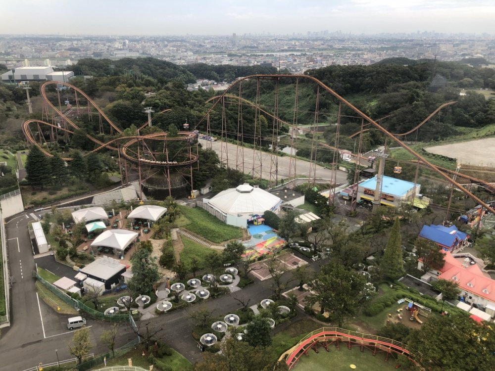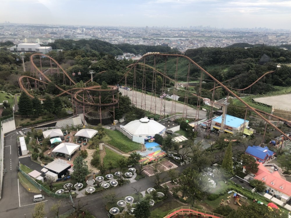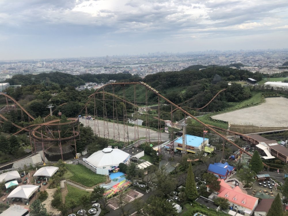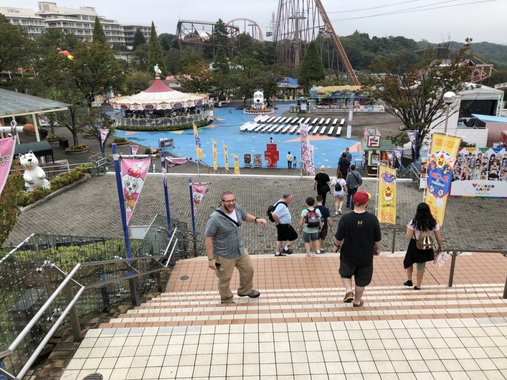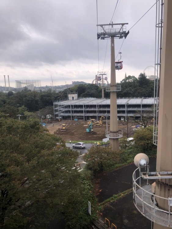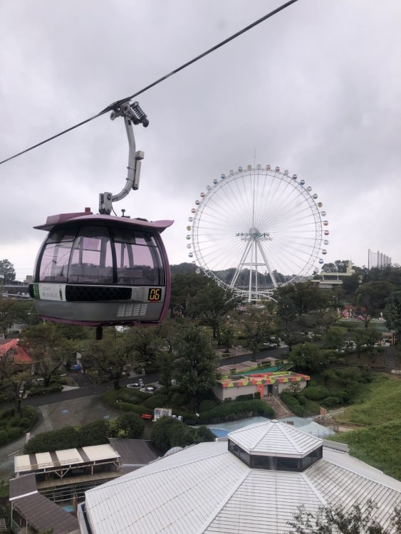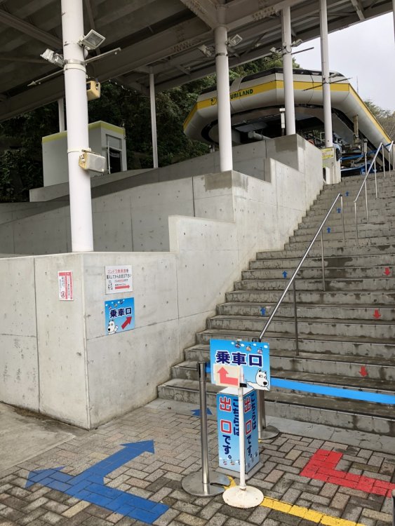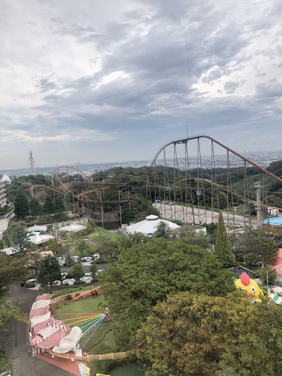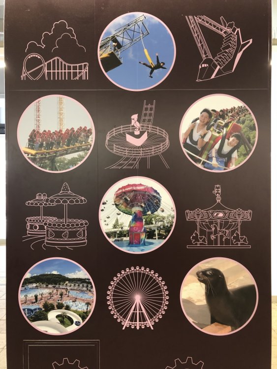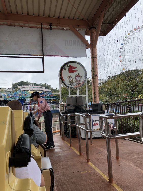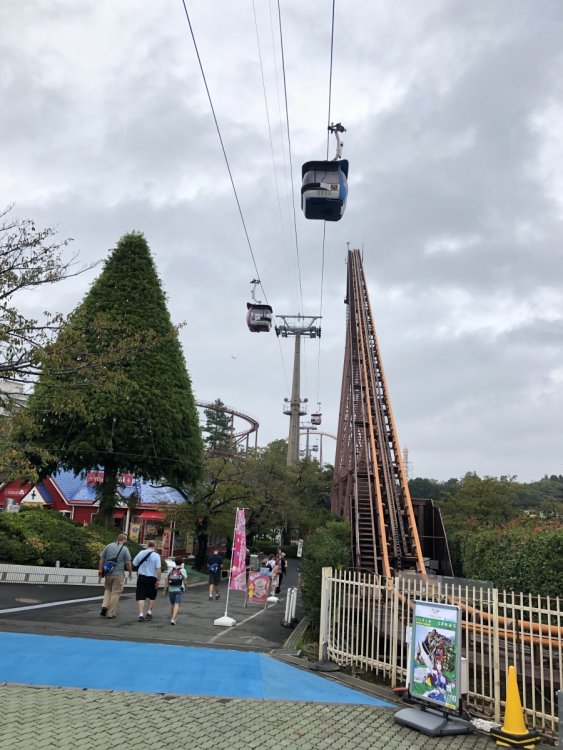 We got to sleep in a little this morning, as the meetup in the lobby was not until 8am. so a bunch of us in the group headed downstairs for breakfast (same restaurant buffet we'd been enjoying every morning thus far - tho I knew to stay far away from Warabimochi by this 3rd breakfast. . so everything was delicious) it's just after 8am on a Tuesday at Shinagawa Station, and holy crap. .its rush hour in Japan. I know it looks nuts. .and there are a lot of people lined up to get in trains heading both directions on this platform. but staying calm, we spit up into groups and all got in lines to get on the next train. and as nuts as it looks? Japan is *highly* efficient. the train would pull up, folks would easily get off, and the lines on either side of the doors would then get onto the trains. It was polite, and quick, and seriously: within 35 seconds, everyone had exited the train that wanted to and everyone who wanted to get on the train had. . and the train took off on time! it was phenomenal to watch, and tho I didn't stop to watch it - as I was participating in the well oiled machine - it really takes one's breath away at how *easy* the Japanese folks make it look. and not one raised voice, or yelling either! the Shinagawa Station was really the only one that had the train platforms this crowded, tho the other stations were busy too as we moved our way thru them to switch trains at a couple of other stops. and before we knew it, we were pulling into the station in Inagi that services Yomiuriland. the park is not visible from the train, as it's built among the hillsides that are covered in lush vegetation. in fact, you have to take a fairly lengthy gondola ride over and thru the hills to get to the park gates from near the train station. (there was a long, winding, walking path, but I only noted one person going that way (it was quite the walk), and he appeared to be a maintenance guy). it reminded me very much of Hawaii (a landscape similarity that popped into my mind several times during my trip to Japan. . . several areas looked for all the world like I was back on Maui) here's some of the lush vegetation from the train station. and looking the other direction, you can just make out the roof of the Gondola station -- the horizontal blue roofs peeking out over the hill, to the left of the tan apartment building. before we headed out across the street to the Gondolas tho, I stopped for a quick potty break, as we had been traveling and I'd had a lot of coffee with breakfast I really liked this mirror wall in the Men's room, so stopped to snap a picture of it. and while waiting for others, someone pointed out that there was a mural of a Carousel, so did I want a pic? of course I did. . . tho the Carousel nerd in me noted the visual effect doesn't really work since the horses are going in opposite direction on either side of the door. I know. . nerd. a side of the pillar highlighting the Factory area of the park - called (I kid you not): the "Goodjoba!! Area" in this section you can build and test dive a car (think of a way more interactive test track, tho slower moving), become a cup noodle and fight the bad guy who's trying to cook you on a rapids ride (no really), make your own cup noodles, ride fashion (on a fashion themed interactive spinning coaster), or much more! another side of the pillar promoting activities in the "Lan Lan" (bungee, wave swinger, seal show), :Flag Street" (Loop Coaster), "Bandit Area" (Bandit coaster), and "Aqua Area" (waterpark) they had some of the pillars in the station also wrapped with Yomiuriland banners. . . which were cute enough that I took some pics while waiting for folks to finish up with bathroom breaks. Yomiuriland has a mascot called the "Land Dog" and he's cute, tho a little bit weird looking. strangely, they seem to dress up Land Dog in a tuxedo complete with bow tie, and he's referred to as "Good" on the map. this is the female version dressed up and referred to on the map as "Lucky" she's cute, and tho you can't tell in this two tone pic, she actually has rainbow sprinkles on her Bow, and on her arms & legs. and also snapped a pic of the park map they have on the wall. it really doesn't look that large from the map, and doesn't appear to have that many rides. But it's really misleading, as the park is *much* larger than it appears from just the flat surface of the map - with many hills and stairs, and it's pretty spread out, with a lot of things to do. You can really see just how large it is from the Gondolas, with the site including Yomiuri Giants Stadium (the training ground for the Yomiuri Giants, and where they used to play before Tokyo Dome was built), as well as a couple temples, and a lot of space for picnic, fairgrounds, and tons of cherry trees which blossom in the spring - and the Bandit coaster runs right over them. this was an absolutely lovely park. (the whole bottom section of the map in grey -the part that looks like it has big warehouses? That's the "Goodjoba!! Area") We've crossed the street and gone up to the Gondola station to buy our tickets. The Gondolas aren't quite running yet, but they are loading them on and this should only be a short wait. going up the stairs/ramps to the station, we passed behind this apartment building, that I thought was interesting enough to snap a picture of. I really like the brickwork here. we've got our tickets (to the park gates, plus return trip for later. . do NOT lose the ticket stub for the return trip!). now at the bottom of the stairs up to the station awaiting the opening of the Gondolas for our trip to the front gate. Looking back down one of the ramps we came up to get to the gondola station, from the train station down there across the street. and we're on our way! Heading out of the station towards the top of the 1st hill. and cresting that hill, we get our first view of the park off in the distance. can see the Shot/Drop towers on the left, one of Bandit's turn arounds in the ce