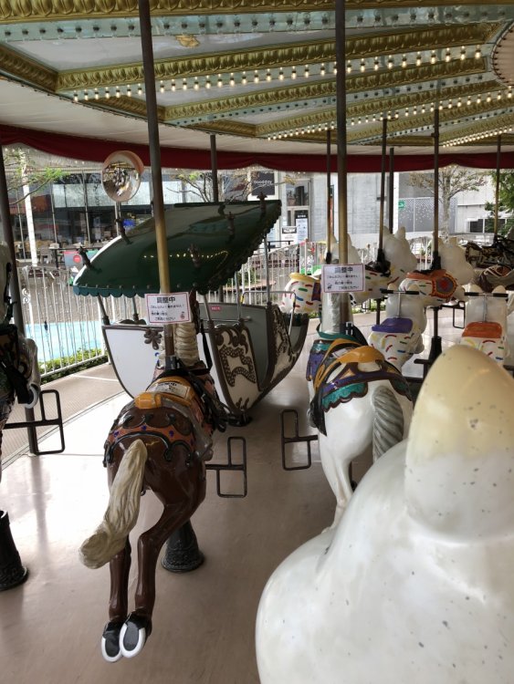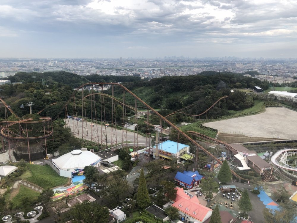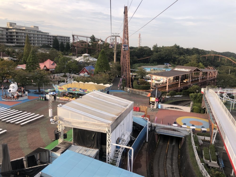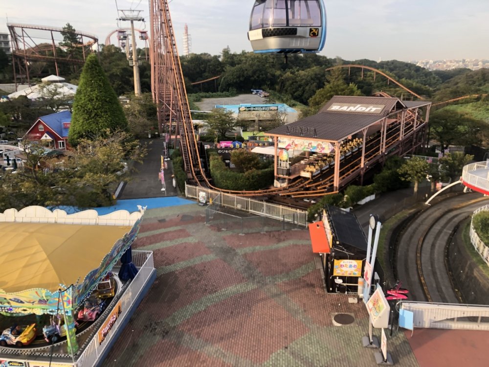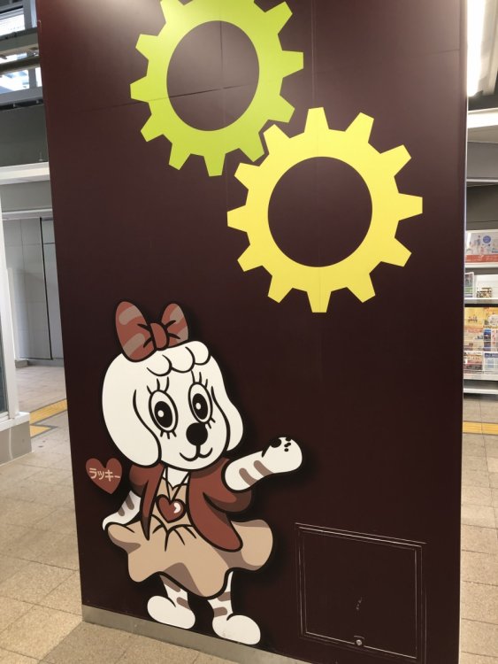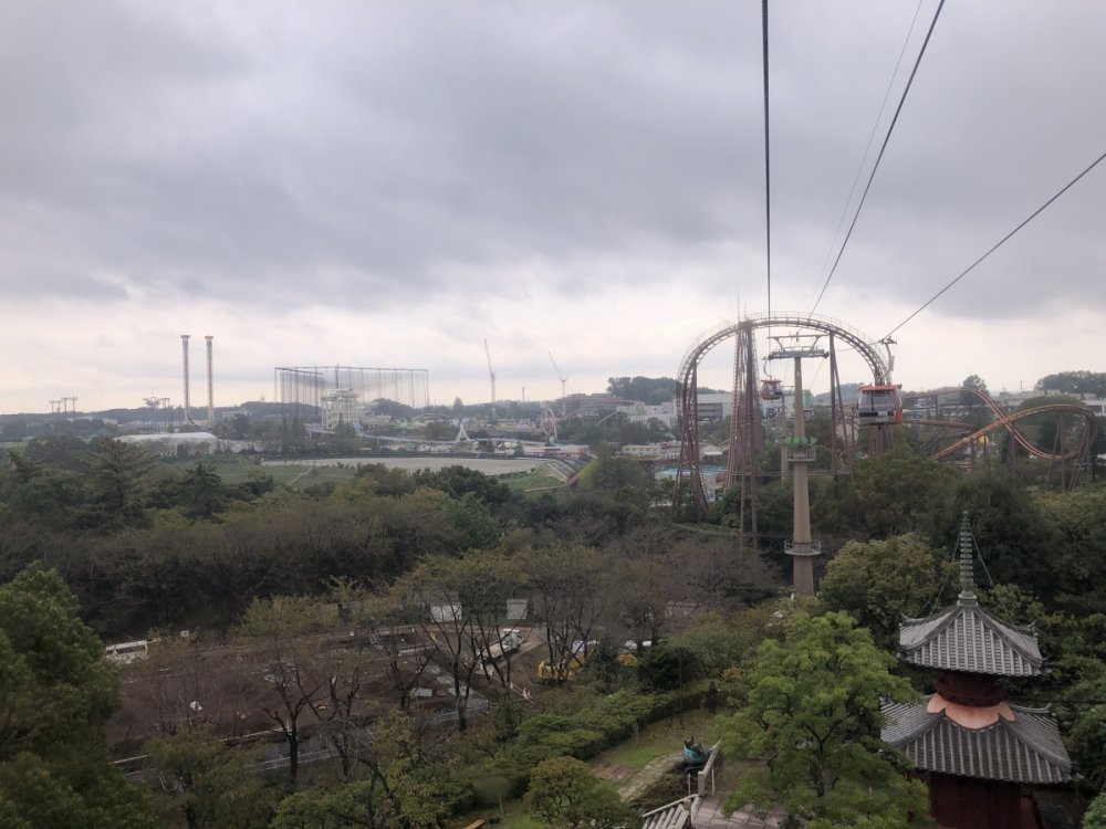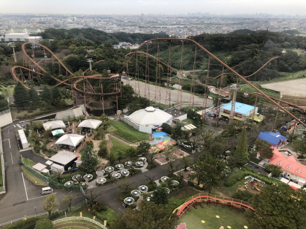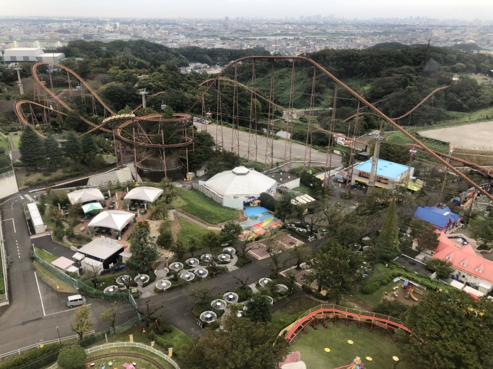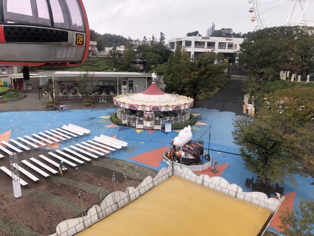 We got to sleep in a little this morning, as the meetup in the lobby was not until 8am. so a bunch of us in the group headed downstairs for breakfast (same restaurant buffet we'd been enjoying every morning thus far - tho I knew to stay far away from Warabimochi by this 3rd breakfast. . so everything was delicious) it's just after 8am on a Tuesday at Shinagawa Station, and holy crap. .its rush hour in Japan. I know it looks nuts. .and there are a lot of people lined up to get in trains heading both directions on this platform. but staying calm, we spit up into groups and all got in lines to get on the next train. and as nuts as it looks? Japan is *highly* efficient. the train would pull up, folks would easily get off, and the lines on either side of the doors would then get onto the trains. It was polite, and quick, and seriously: within 35 seconds, everyone had exited the train that wanted to and everyone who wanted to get on the train had. . and the train took off on time! it was phenomenal to watch, and tho I didn't stop to watch it - as I was participating in the well oiled machine - it really takes one's breath away at how *easy* the Japanese folks make it look. and not one raised voice, or yelling either! the Shinagawa Station was really the only one that had the train platforms this crowded, tho the other stations were busy too as we moved our way thru them to switch trains at a couple of other stops. and before we knew it, we were pulling into the station in Inagi that services Yomiuriland. the park is not visible from the train, as it's built among the hillsides that are covered in lush vegetation. in fact, you have to take a fairly lengthy gondola ride over and thru the hills to get to the park gates from near the train station. (there was a long, winding, walking path, but I only noted one person going that way (it was quite the walk), and he appeared to be a maintenance guy). it reminded me very much of Hawaii (a landscape similarity that popped into my mind several times during my trip to Japan. . . several areas looked for all the world like I was back on Maui) here's some of the lush vegetation from the train station. and looking the other direction, you can just make out the roof of the Gondola station -- the horizontal blue roofs peeking out over the hill, to the left of the tan apartment building. before we headed out across the street to the Gondolas tho, I stopped for a quick potty break, as we had been traveling and I'd had a lot of coffee with breakfast I really liked this mirror wall in the Men's room, so stopped to snap a picture of it. and while waiting for others, someone pointed out that there was a mural of a Carousel, so did I want a pic? of course I did. . . tho the Carousel nerd in me noted the visual effect doesn't really work since the horses are going in opposite direction on either side of the door. I know. . nerd. a side of the pillar highlighting the Factory area of the park - called (I kid you not): the "Goodjoba!! Area" in this section you can build and test dive a car (think of a way more interactive test track, tho slower moving), become a cup noodle and fight the bad guy who's trying to cook you on a rapids ride (no really), make your own cup noodles, ride fashion (on a fashion themed interactive spinning coaster), or much more! another side of the pillar promoting activities in the "Lan Lan" (bungee, wave swinger, seal show), :Flag Street" (Loop Coaster), "Bandit Area" (Bandit coaster), and "Aqua Area" (waterpark) they had some of the pillars in the station also wrapped with Yomiuriland banners. . . which were cute enough that I took some pics while waiting for folks to finish up with bathroom breaks. Yomiuriland has a mascot called the "Land Dog" and he's cute, tho a little bit weird looking. strangely, they seem to dress up Land Dog in a tuxedo complete with bow tie, and he's referred to as "Good" on the map. this is the female version dressed up and referred to on the map as "Lucky" she's cute, and tho you can't tell in this two tone pic, she actually has rainbow sprinkles on her Bow, and on her arms & legs. and also snapped a pic of the park map they have on the wall. it really doesn't look that large from the map, and doesn't appear to have that many rides. But it's really misleading, as the park is *much* larger than it appears from just the flat surface of the map - with many hills and stairs, and it's pretty spread out, with a lot of things to do. You can really see just how large it is from the Gondolas, with the site including Yomiuri Giants Stadium (the training ground for the Yomiuri Giants, and where they used to play before Tokyo Dome was built), as well as a couple temples, and a lot of space for picnic, fairgrounds, and tons of cherry trees which blossom in the spring - and the Bandit coaster runs right over them. this was an absolutely lovely park. (the whole bottom section of the map in grey -the part that looks like it has big warehouses? That's the "Goodjoba!! Area") We've crossed the street and gone up to the Gondola station to buy our tickets. The Gondolas aren't quite running yet, but they are loading them on and this should only be a short wait. going up the stairs/ramps to the station, we passed behind this apartment building, that I thought was interesting enough to snap a picture of. I really like the brickwork here. we've got our tickets (to the park gates, plus return trip for later. . do NOT lose the ticket stub for the return trip!). now at the bottom of the stairs up to the station awaiting the opening of the Gondolas for our trip to the front gate. Looking back down one of the ramps we came up to get to the gondola station, from the train station down there across the street. and we're on our way! Heading out of the station towards the top of the 1st hill. and cresting that hill, we get our first view of the park off in the distance. can see the Shot/Drop towers on the left, one of Bandit's turn arounds in the ce