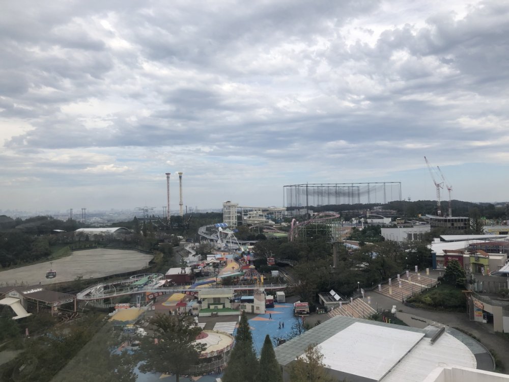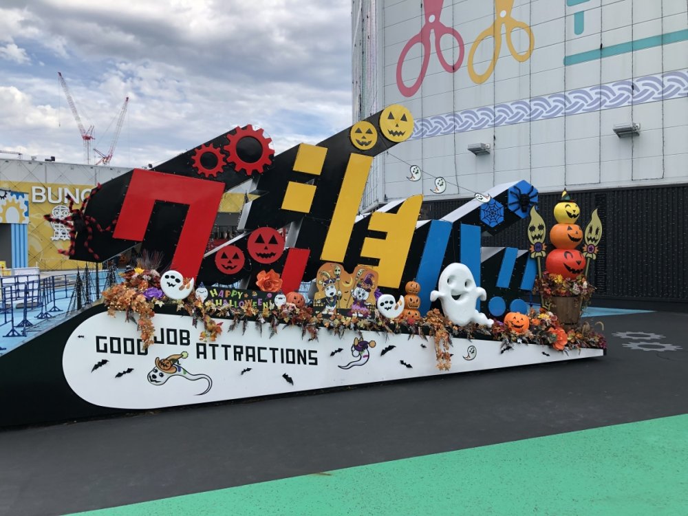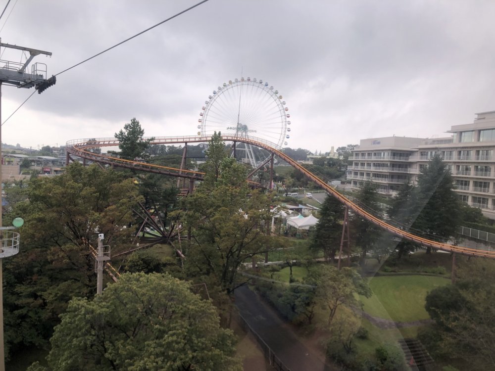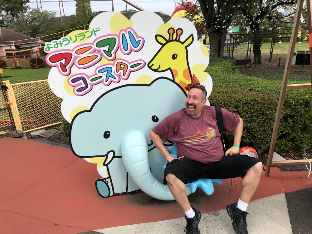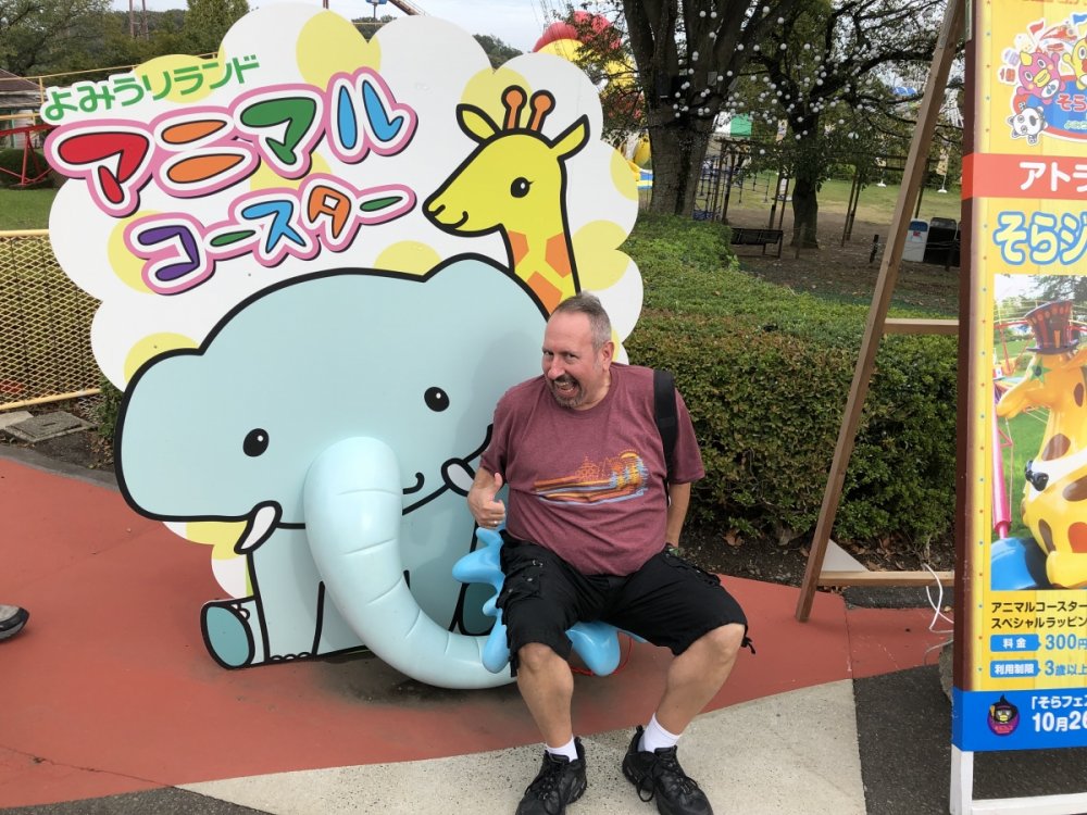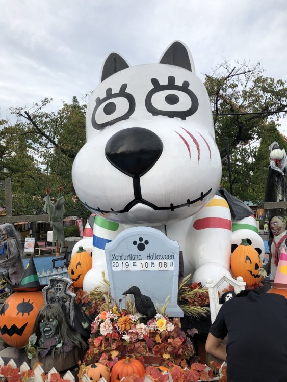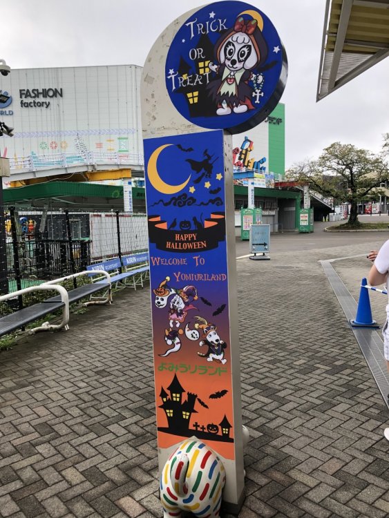 Yomiuriland continued. . . Across from the Fashion Factory building was the "Bungu Factory" - this building didn't have any rides, per se, but it did have: "Campus Challenge" - per the map, "try 7 challenging games using your body, based on the manufacturing process of Kokuyo's "Campus Notebook" & "Hirame Kids" - a playground with the theme of Kokuyo Children's books. There were no takers today, and we were hungry - and honestly, the "challenge" sounded a bit too much like "work", or at least "effort" was required. . .LOL. So I instead just snapped a picture of this neat display out front (the big pumpkin looks like it's made of cardboard), and then we moved on without going in this building. we ended up at the "Goodjoba!! Kitchen" that was the main eatery in this part of Yomiuriland, and it had a large selection of curries, noodles, doria (with the melted cheese), among other things. here's what I got, and if I'm recalling correctly, it was called "Gon Koe", which was kind of a Pork Katsu on top of a bowl of noodles in a fragrant broth. it was really good, and filling, and reasonable (it was like $11 American). I do believe we were the only customers, so they were happy to have a "lunch rush" come in. A few folks are missing from this pic (maybe Trent had already eaten. . as he had been with us on the Spinning Coaster. . and that's why he's not in this pic?), but a bunch of ended up hanging together most of the day at Yomiuriland, and thru lunch too. the Variety of options at this place left everyone pleased, and I think all really liked their main dishes. tho I know that the Pinkberry (that was being sold at front counter as well), didn't go down really well from those who tried it. this was interesting. . "self serve beer" station. Saw something similar at a few other stops on the trip too - you purchase the cup, then can use it to get your own beer. the Halloween Decorations in front of the "Goodjoba!! Area" It looked to me like this is a permanent sign (with Halloween overlay placed on it). . since this is on the park map as a landmark. This sign faced the "Aurora Gate - Temporary park entrance" . . . I would assume this entrance is used for school groups, who are coming to experience the "factory" portion of the park in this area, and this is the welcome sign to this area. snapped a quick pic, and then we headed towards the area of the park we had not been to yet: "Family Area". . which mainly is the kiddie section, but also had some adult rides such as the Ferris Wheel. we bypassed the Merry-Go-Land Dog (no one wanted to ride, so I could wait a bit to ride it still) as we passed thru the "Plaza Stage of the Sun" area, and into the "Family Area" and there was a photo op, where one could sit on the elephant's trunk as he lifts you with "water". . so of course I stopped to pose. and then noticed the box of decorations for Halloween next to it. . so another pic. this time as a witch! "I'LL GET YOU, MY PRETTY!!!" (and notice my inflated purse noodle holder that I was trying to hide behind my leg. . LOL). There was a ride here in this section called "Animal Coaster" and we had been teasing Trent & Luke about it, since it was called "coaster" but it's really a caterpillar or turtle type ride. when we walked by there was no one on it, so I harangued everyone to take a spin, and we had a TPR "Coaster" takeover. the selfie came out pretty good. but I like the one the Operator took for me, even better. TPR on "Animal Coaster" Wheeeeee!!!!1 This Giraffe, wearing a tuxedo, and with "KISS-stars" on his eyes, was on the front of the "train" (you can see a better view of him on the poster to the right of the Elephant trunk picture a few above this) after that ride on "Animal Coaster" - which was about what I expected. . . a circular turtle type ride that was just fine - I was ready to take a ride on the park's "Giant Ferris Wheel" not everyone wanted to ride, and some folks split off to go find ice cream, or just sit and take a break, or other things. . so we decided we'd meet up after our ride (for those of us who wanted to), and continue on together after. Jon and I again shared a gondola, and I believe Brad and Leia shared the one behind us. As noted in the other part of this report, the park was doing a VR headset game with certain gondolas, where you spotted or interacted with animated characters (or something. . I didn't quite understand what one was supposed to do), but we decided not to do the headsets, and instead just got in the "regular" gondolas for our spin on the Giant Wheel. this pic is headed up, looking out at a good chuck of the park. (not counting the Goodjoba!! area, the Bandit Area, or the Aqua Area - nor the Sechi Park (where the temple was) nor the JU-JU BBQ-Park (one of the large picnic areas off to the left). but you can see a good chunk of Yomiuriland. Moving camera to the left, a nice pic of Bandit, and the top of the JU-JU BBQ pavilion. More of Bandit Area, some of Tokyo, and looking down? the colorful supports for the "Animal Coaster" ride we had just gotten off of and the undulating track for it. also some of the picnic area behind it. up over Bandit, to get more of the Skyline. . .a bit foggy, but still a neat pic I thought. if it were a clearer pic, we could just make out the Tokyo Skytree from the ferris wheel. additional random shots from the side facing the park as we go up and get ready to crest the top of the Giant Wheel. Turning to look out the other direction, away from the park, and thru the clouds you can just make out Mt Fuji there near the center of the picture. again, mt. Fuji thru the clouds. Some of us were going to be headed to Fuji-Q the next day, but based on prior reports of trips there? There was a chance that THIS was going to be the best view I'd get of Mt Fuji, so I snapped a few pics. Crossing over the apex of the Giant Wheel, and starting to come back down, I spotted Bandit going up the lift hill. who am I to pass up an opportunity to take p