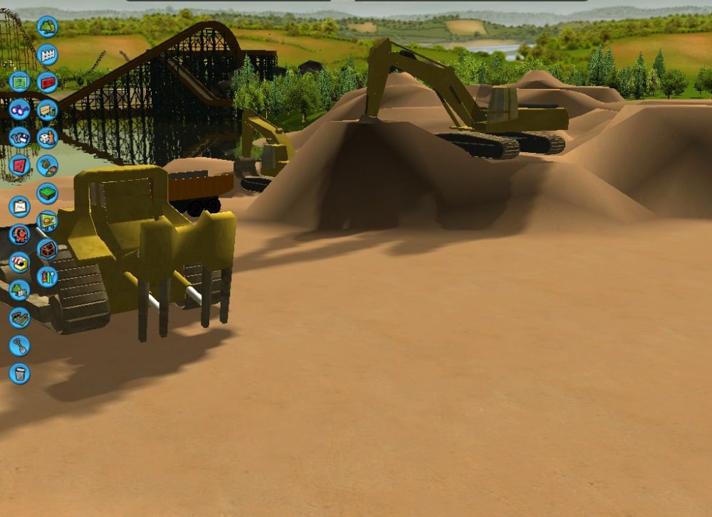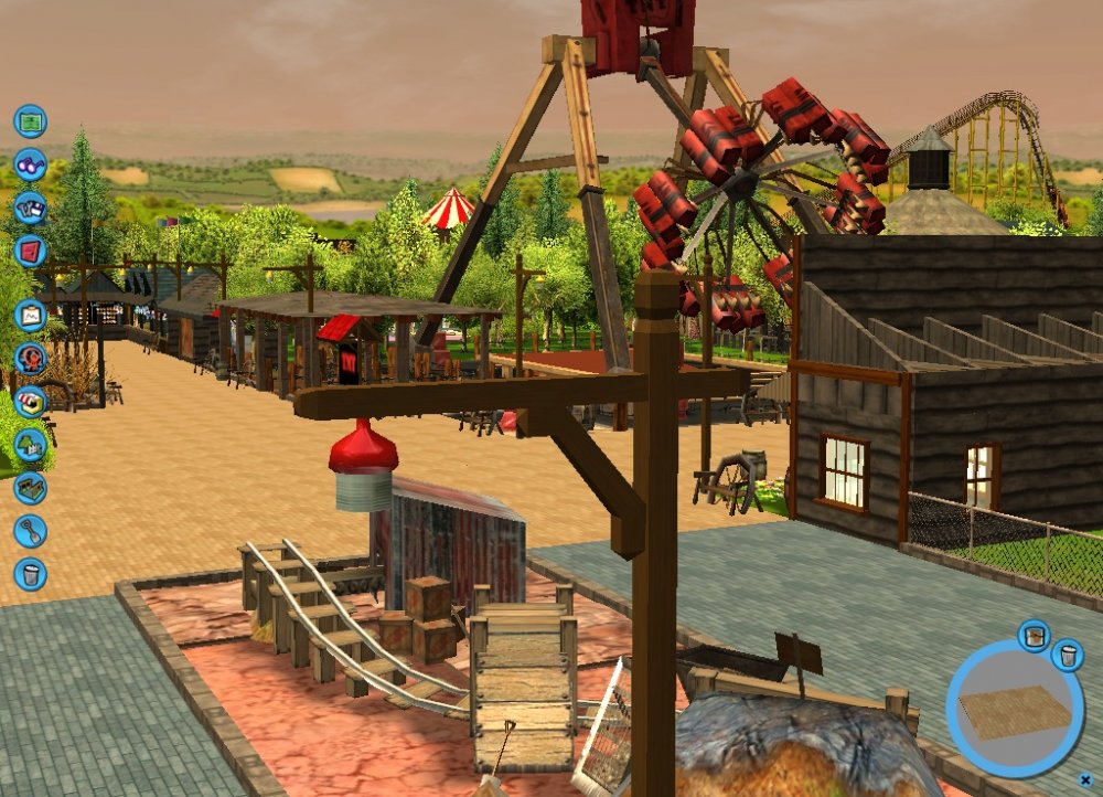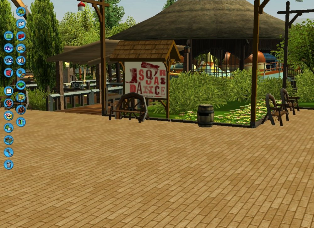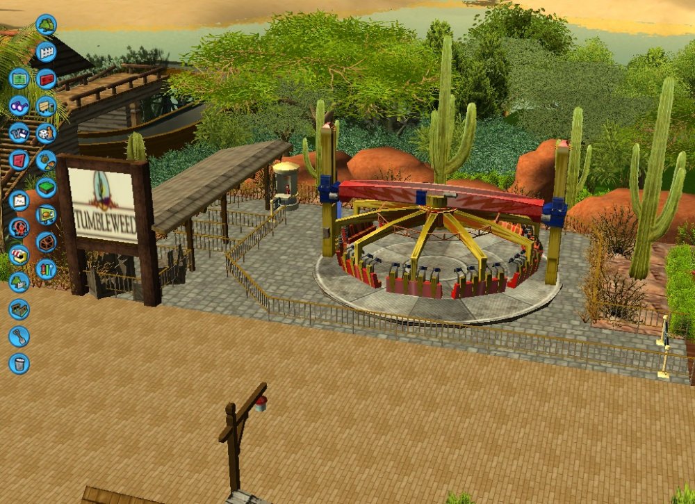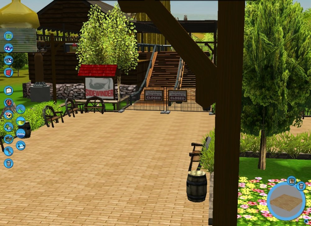 Hello again, it’s time for a visit to Six GunTerritory as season four is in full swing. Big things have happened since the destruction of Barnstormer. The Redman’s have a new business partner in the park and word is he has very deep pockets and is as passionate on this park being successful. His name is John Wilson and he is a real estate tycoon who wanted a new venture to sink his teeth into as he planned to move on from the real estate business. The park is in the process of aquiring a new ride to replace Barnstormer and possibly a second ride along side of it. The biggest news though is expansion of the park into the backside of the property. Construction vehicles are already working on clearing the backside of the property. Details on what will be put there are still top secret, but I’m told it will be a big expansion with a new roller coaster and a compliment of flat rides, shops and eateries. So here are a few shots to hold you over until we get more info. Here's the new arrival taking place of the departed Barnstormer. Name will be announced soon. A little land clearing under way. Some new views of the parks other attractions. Here's Lasso a themed round up ride. What's a theme park without a few games here and there? Sidewinder doing its thing on a Sunny Day. -