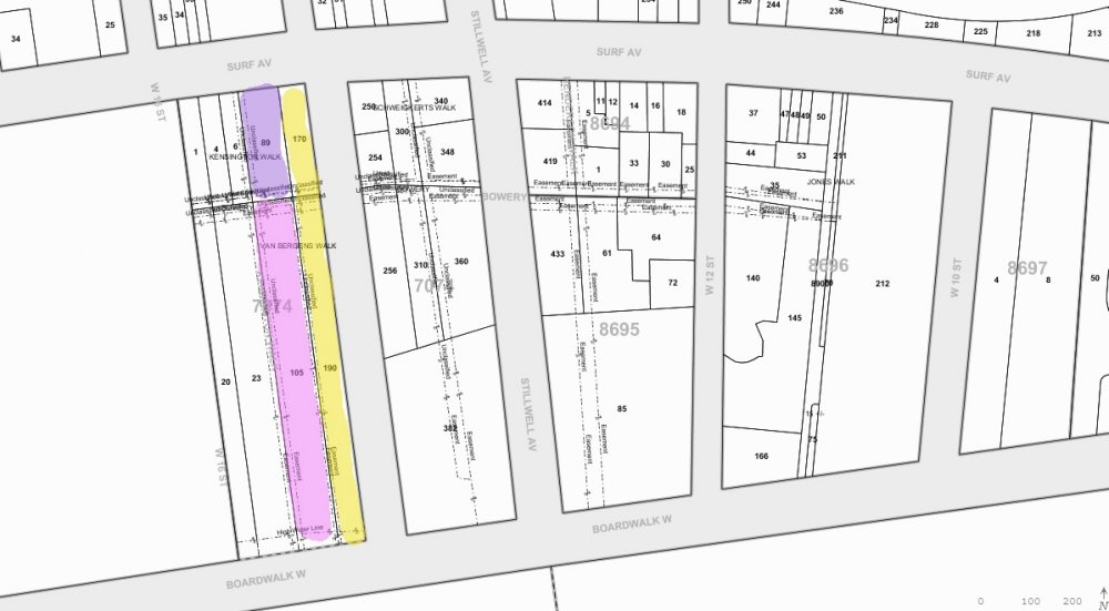 The original Thunderbolt stood on lot 105, it and lot 89, where the Playland Arcade stood, are owned by Jasmine Bullard. She inherited the land when her father Horace passed. The remaining lots I believe are all city owned. Also see link to Horace Obit, this says the lots are on the market for 90 million, but a later New York Times article notes that Jasmine took the property off the market.