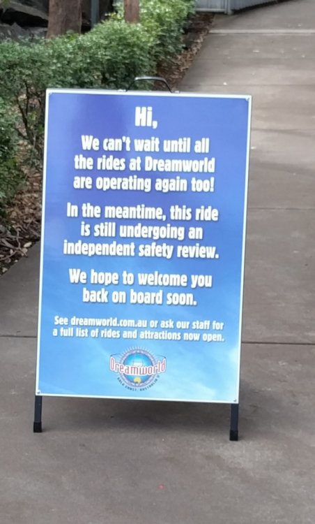 So I managed to be able to make the 9 or so hours drive up the coast to the gold coast to visit the parks. First park I hit up was Dreamworld. As you all probably know last year the Thunder river rapids ride malfunctioned and caused the deaths of 4 people. Which lead to the park being shut down for weeks and most of the rides also being closed to be checked over to make sure they were safe. I went to dreamworld on the 5th Jan. Which is smack bang in the middle of the school holidays so usually the park would be full. This year was a bit different. I was reading for days before I went to the park how empty the park was, carpark half empty etc. I was thought that maybe it was the media still trying to stir up stuff. But to my shock it seemed to be right although the car park did seem at least 70% full so maybe a fair few people went to the water park that day. As for the crowd at Dreamworld it was empty everything were either a walk on or at worst a 10-15 Min wait. Hopefully this was down to the fact that only 3 of the big 9 were open although I got lucky and a 4th one opened up later in the day. It will be interesting to see how the park goes in the future as many people think that Dreamworld and by proxy the other theme parks in Queensland are now unsafe death traps. Anyway on with day 1 Dreamworld The park was actually open from 9am to 9pm which was nice and with the cheaper tickets they were selling was a bargain. With the low crowd I was about to ride everything as many times as I wanted Sign board out the front say which rides were closed. Sorry for bad photo my phone didn't like taking photos of the boards main street about 50 mins after opening, I hit up the Motor coaster. I only got one smooth ride out of it. The front seat, all other seats were jerky and clunky Walls around the now infamous Thunder river rapids ride Poor photo but 2 guys working on the giant drop, I assume they were doing some maintenance while waiting for it to pass safety inspections Inside the Claw line. Fun ride. These types of flats are my favourites Second ever haunt, I really like this fun and scary too Fun little Kung Fu Panda themed bumper cars They have a whole area themed to Kung fu panda and it's awesome Looks fantastic at night too Signs out the front of all the closed rides Lunch for the day. This cost all up about which for what it was wasn't great, Typical theme park food Got lucky with Tail Spin opening the day I was there, Saw a guy working on it but didn't think it would be opening. I guess I got lucky. P.S don't go full out spinning right after lunch NOT FUN. After I had recovered from tail spin by watching a 4d movie in the Dreamworld theatre. I headed over to the BuzzSaw. I love this ride don't know why but I just do. Also this is probably my favourite shot of the whole trip Bad photo of the car park but it was actually quite full which was nice to see Fireworks and laser show. Good show great way to end the day at my first park since 2012 So that was the end of the day at Dreamworld, Great day being able to ride every ride how ever many times I wanted. Funny story the restraints on the claw got stuck and I thought I might've had to watch the fireworks and lasers from the claw but that didn't happen. Coming up next Part 2 Seaworld