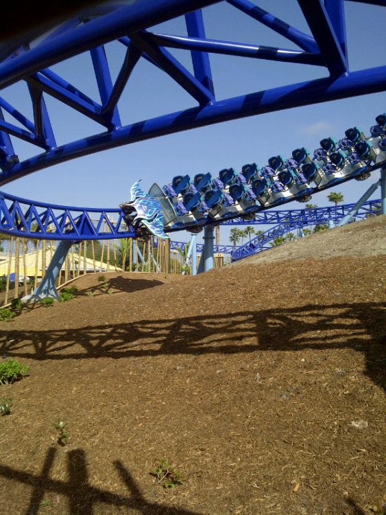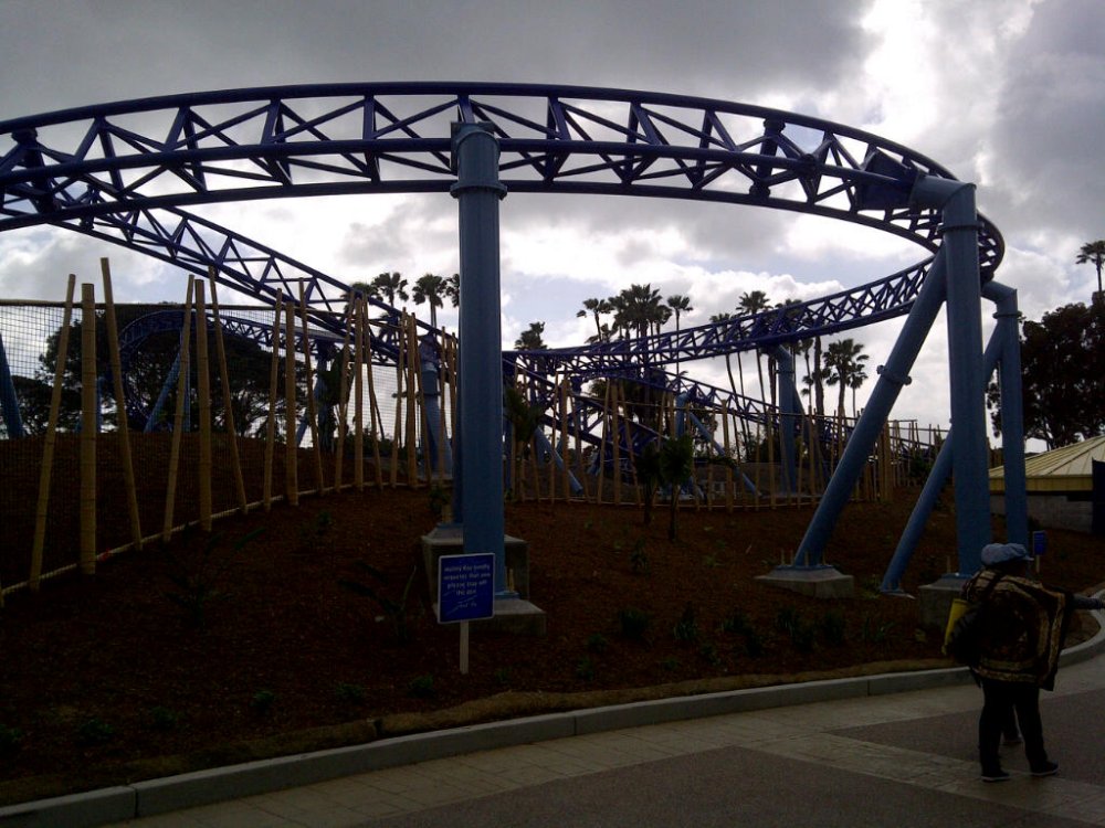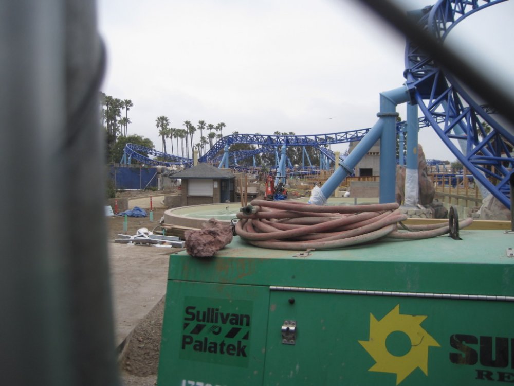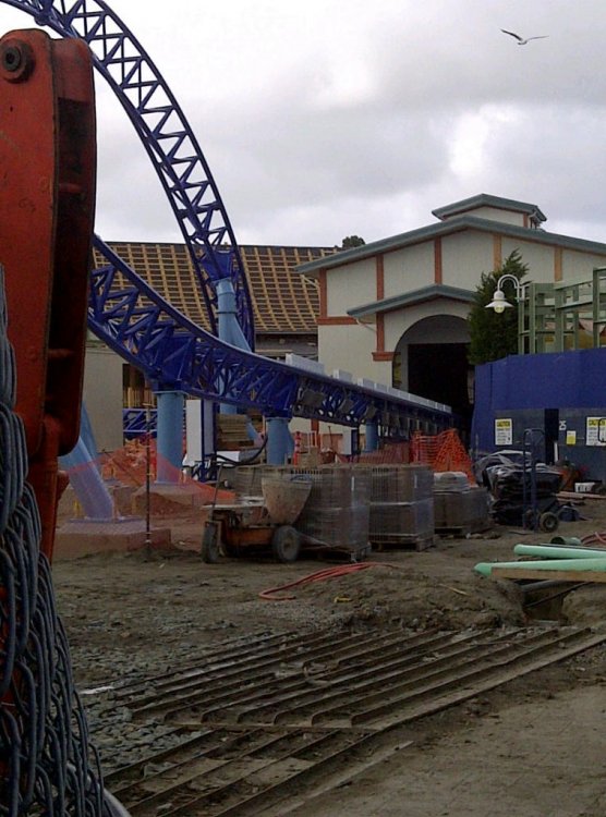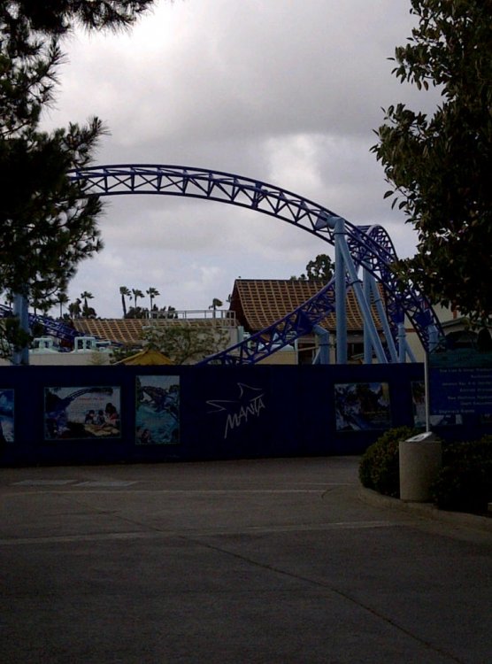 Quick weekend update, plus cool shot of Manta cars in testing Pathway on the left has been closed. Usually you can use this to get around Rocky Point, but now you have to go THROUGH that area. Looks like they're working on the main entrance as seen in the artist concept Good progress on queue and station Action shot - with weights Even better action shot, with empty cars! (such an awesome car design)