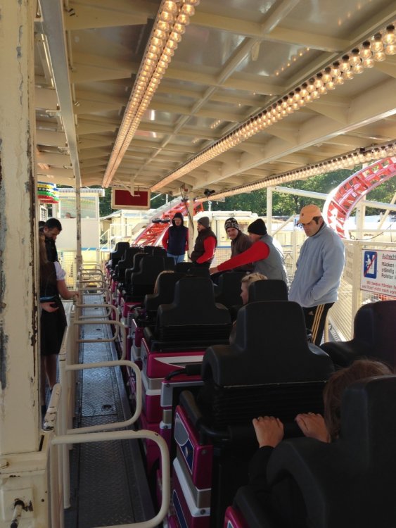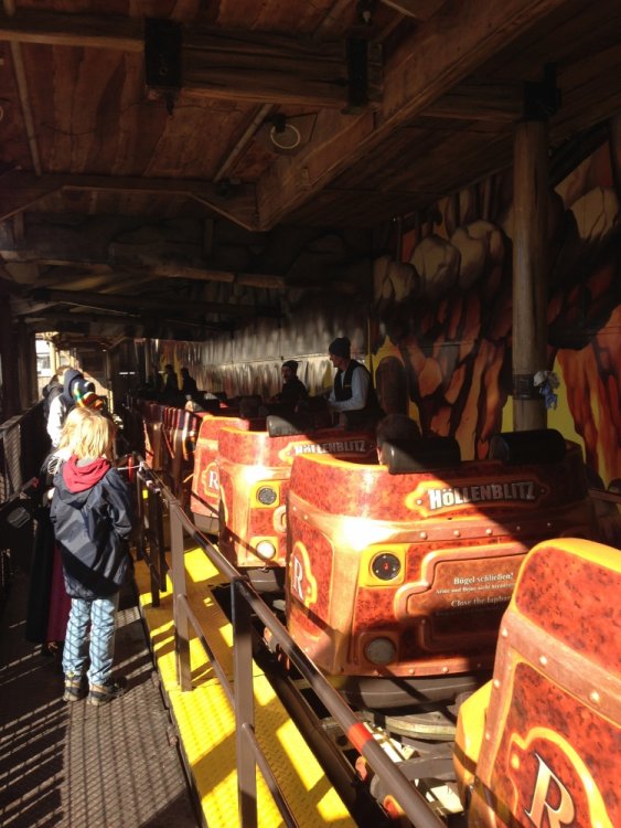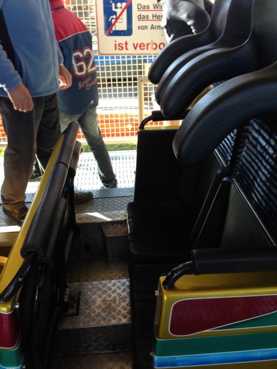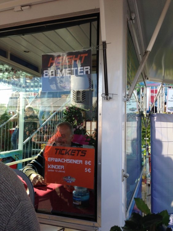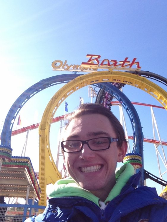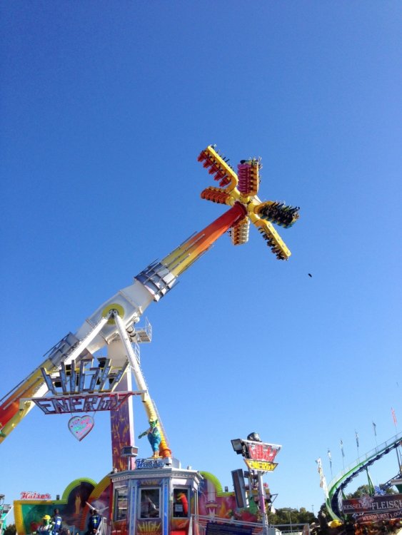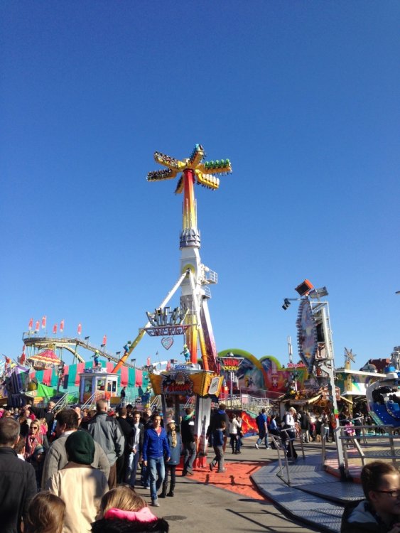 HAHA! Here in Germany you're allowed to drink beer and wine with the age of 16! Liquor when you're 18! Go for a beer! Since I rode Olympia Looping in the morning, crowds were not too bad and I could choose any seat! Most people queued up for the front row. Therefore there was no q for the back seat! You actually could choose your seat! Later the day, when q's were totally full, you could choose your seat as well, but you had to wait! The thing you normally do is q-ing up and just go wherever you think it is right For example, the wild mouse had CRAZY wait times, because the carnies did not fill the seats! There were cars with two persons or only one person! Yeah, the place is quite huge! If you want to go on a German Fair with the BIGGEST selection of rides you have to go to Stuttgart. The fair is called Wasn! Oktoberfest has a lot of rides, too, but not as many as Stuttgart has Normally not I mean, people come from all over the world! It's crowded every day. Not as much as on weekends but still crowded! People even take some days off just to go there. -