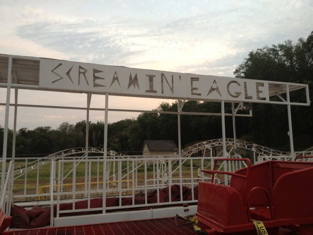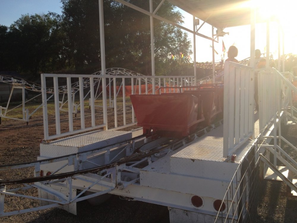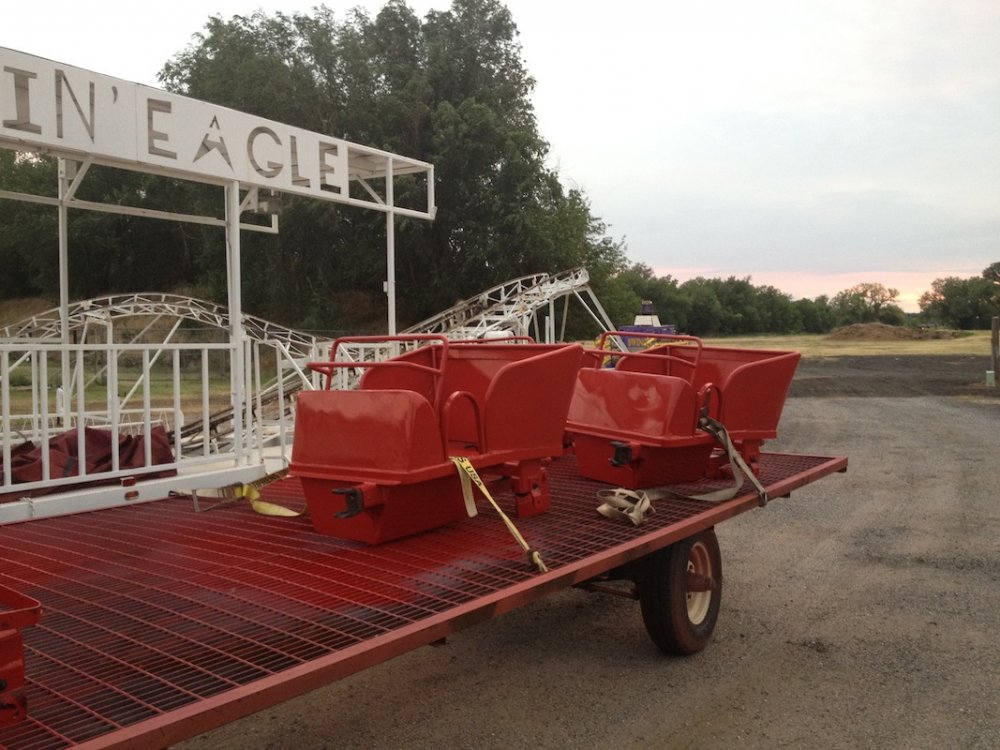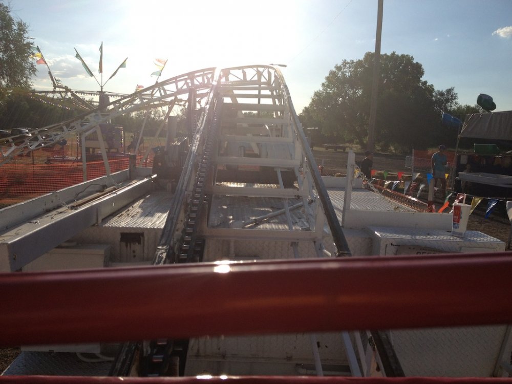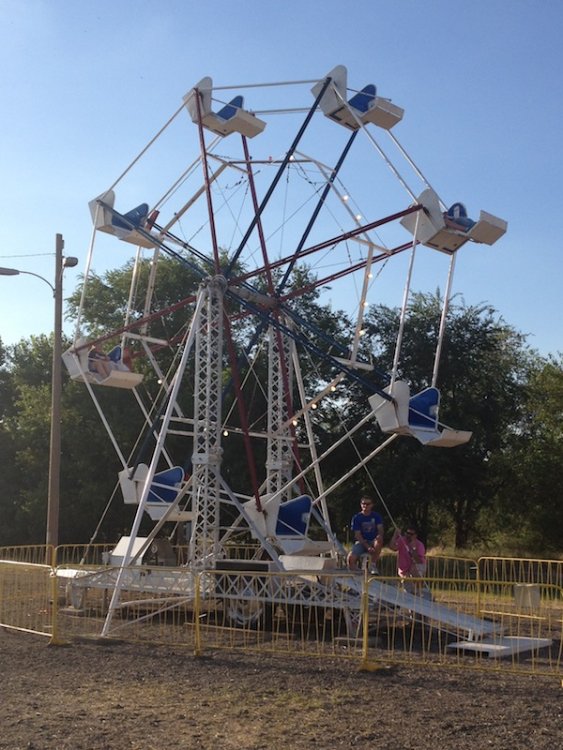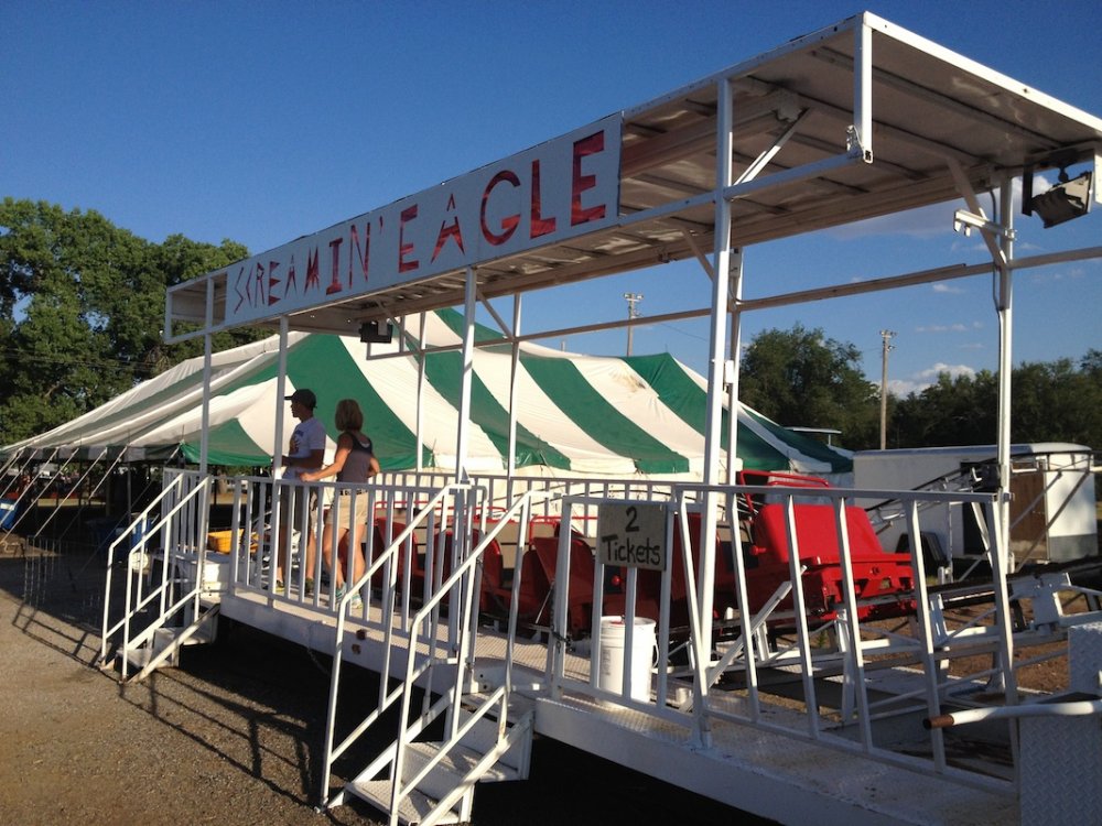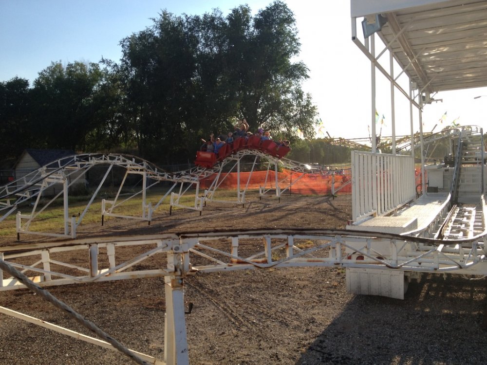 Mikey's MINI TravelsTheSchwitek replied to TheSchwitek's topic in Theme Parks, Roller Coasters, & Donkeys! KINGMAN COUNTY CARNIVAL Alright, so I have to give credit to the smartestscoasterkidever! for finding this rare little coaster. I decided to stop by this little place in a town called Kingman, Kansas on my way to Colorado a few weeks back. I just stopped to get pictures of this "abandonned" roller coaster when I noticed a couple ladies nearby. They informed me that they ran the carnival and that it would be open for 4 days at the end of July. They informed me that they decided to buy their own carnival rides about 7 years ago, because they didn't like the image traveling carnival folks brought to their town. They have bought a new ride almost every season, and staff each one with volunteers during this once a year fair. Everything about this little place reminded me a lot of Brookhaven Exchange Park in Mississippi. Needless to say, they invited me back to enjoy the carnival, so I did just that. I hopped in the Mini Cooper Friday afternoon, and enjoyed a fair (and a coaster), that not many people have ever experienced. Now, let the fair begin: So 30 minutes West of Wichita, you will find Kingman Kansas. During my first vist I saw the only two rides that are left standing all year; the Ferris Wheel and... ... The Screamin' Eagle!! And it looks like it someone is getting ready to put the trains on the track! And there are the coaster cars. Looks like I will be coming back in a couple weeks to see this super rare coaster in operation! So here we are, July 27, 2012. Parking at the Kingman County Fair, next to a statue of some guy riding a bull. Here is the flyer for the fair. I met up with the nice ladies that run the carnival, and they were so excited that I drove all the way here, that they gave me one of their volunteer buttons which enabled me to get VIP treatment and a free dinner! On the way to the food, I smelled, and saw a nice sized rodeo going on. They also had Kingman County Idol taking place, with all the communities best singers. (There were 4 people in the contest) Yes, I found the food! That sweet corn was amazingly awesome. 2 minutes later. Now that I have a full tummy, its time for the main event. The Kingman County Carnival!! Looks like there is a bit of a wait for tickets. But who cares, they are only 25 cents! They had a lot of homemade games to play as well. Here you can see Milk Jugs and some random Beer Pong looking game where you tossed a ping pong ball into one of about 30 glasses from someone's kitchen. A couple more classic games including the Bottle Toss, where you can win a 2 liter bottle of Sam's Choice Soda Pop. They even had Plinko! And a carnival wouldn't be complete without Mini Golf and Drinks. These lovely old men ran the High Strikers. You can also see the men's and women's restrooms in the background. And yes, there were rides as well. Ride #1: The Motorcycle/Dune Buggy/Car/Truck Ride. Ride #2: The Classic Carousel. Ride #3: The Swings. Ride #4: The Tilt A Whirl. Ride #5: The Ferris Wheel. Ride #6: The Spider (By far the most popular ride at the Carnival) And last, but definitely not least, Ride #7: The Screamin' Eagle. Lift Hill POV. (Yes I took a full ride POV as well). Overall ride layout. Track close-up! Action Shot. A shot from the back. My favorite iphone picture of the evening. So I got a new coaster credit, met some nice people, ate some great (free) food, and had a fantastic evening. So that's the Kingman County Carnival. PS - This coaster does stay here all year, so rcdb needs to add it. Thanks for reading!