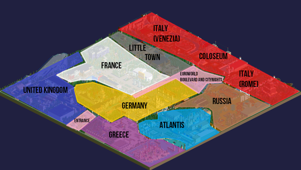 [RCT2] EuroWorldthemeparksbuzz replied to themeparksbuzz's topic in Roller Coaster Games, Models, and Other Randomness ITS FINISHED! DONE! Thanks to everyone who supported this park and commented to make it better, Thanks a lot! Here is the Map of the Complete Park. Compare the picture above to the original picture of the land when TPL INC bought the space. Amazing right? Here is the Pavilion division. Russia Update coming tomorrow!