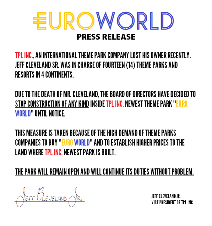 1. Yes, Don't worry about this project, we are a long way to go. This Drama is only created to have the feel of a real Theme park and all the possibilities of problems that could happen. -------------------------------------------------------------------------------------------------------------------- EURO WORLD PRESS RELEASE BY TPL INC.