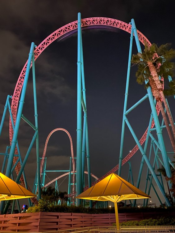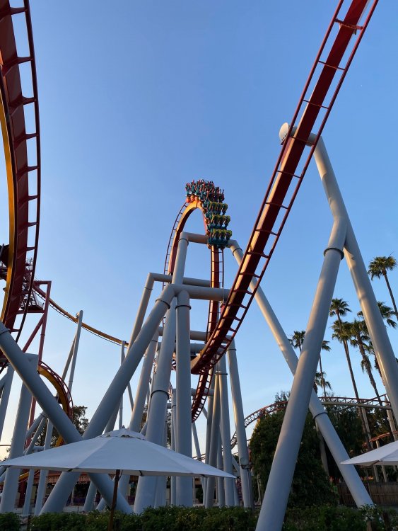 I finally returned to Knott’s yesterday after 433 days (yes, I asked Siri how long ago was March 7, 2020). It felt so nice to be back at the park. I have never gone this long without visiting Knott’s since I was a toddler. I will NEVER take parks for granted again! It was a wonderful visit. Oddly enough, the slowest moving line was Silver Bullet and the fastest was GhostRider. Quite the contrary on a normal operating day. The upper and lower floors of GhostRider’s building were extremely socially-distant, only utilizing a few switchbacks, and they were keeping an empty row between parties on the train. It moved very quickly. The line started outside the building and I waited approximately 30 minutes both times. Still a wonderful coaster that will forever be one of my favorites. I cannot believe the re-tracking was 5 years ago now. It still runs like the day it reopened! Silver Bullet was a bit more frustrating. The line still moved quite well, but I don’t understand why are they are loading every other row on this coaster. It just doesn’t make sense when people are much closer together (and for a longer period of time) in the queue line. But at this point, I didn’t really care. I was just so excited to be back at the park. Hopefully they start loading all rows again soon and this coaster goes back to being the capacity monster of the park. Even at half capacity, it keeps the line moving “enough” to not be unbearable. Xcelerator and HangTime were both running very well, and their respective queues were quite manageable. Xcelerator was never too far down the ramp. They are also running two trains, which is nice to see, but really does not help capacity too much for anyone familiar with this ride’s block system setup and operation. They were loading one party per car, which is actually quite similar to pre-COVID days. A few empty seats per train but it felt like pretty normal operations. Same goes for HangTime. This coaster hardly ever filled every seat pre-COVID. There was always an empty seat or two per row, so this coaster’s operations felt normal as well. They just weren’t grouping pairs of two or singles. The line was never more than 20 minutes. Managed to get a front row ride. This is still a wonderful addition to the park, and I will never get over how much of an improvement it is to Boomerang. One of the best additions the park has made in the last decade. And the lighting package, of course, is fantastic. It really livens up the Boardwalk. I didn’t wanna brave the line for Bear-y Tales. The new facade and theming seems very nice and much improved over Voyage to the Iron Reef. But I’m just not a big dark ride person, and the line was not worth it to me yesterday. I know how slow-moving it is from my experience with Iron Reef. I will ride it eventually. I am moving to Florida next month, but I plan on returning to California around the Holidays for a bit. Hopefully the park is open to out-of-state visitors by then. But Bear-y Tales does seem like a great upgrade. I am excited to ride it eventually! Overall this was one of the best visits to the park I’ve had in a while. Part of me actually enjoys the socially-distanced lines and how quickly they move. Even pre-COVID, the cattle pen queue lines were never enjoyable. I’ll attach a few photos from yesterday. If you are a SoCal resident and a pass-holder, I HIGHLY recommend visiting before it opens to everybody on the 21st. Crowds are very reasonable, all rides are open and running at decent capacity, and food facilities hardly had lines. The 10pm closing was also great for night rides! Knott’s is BACK!