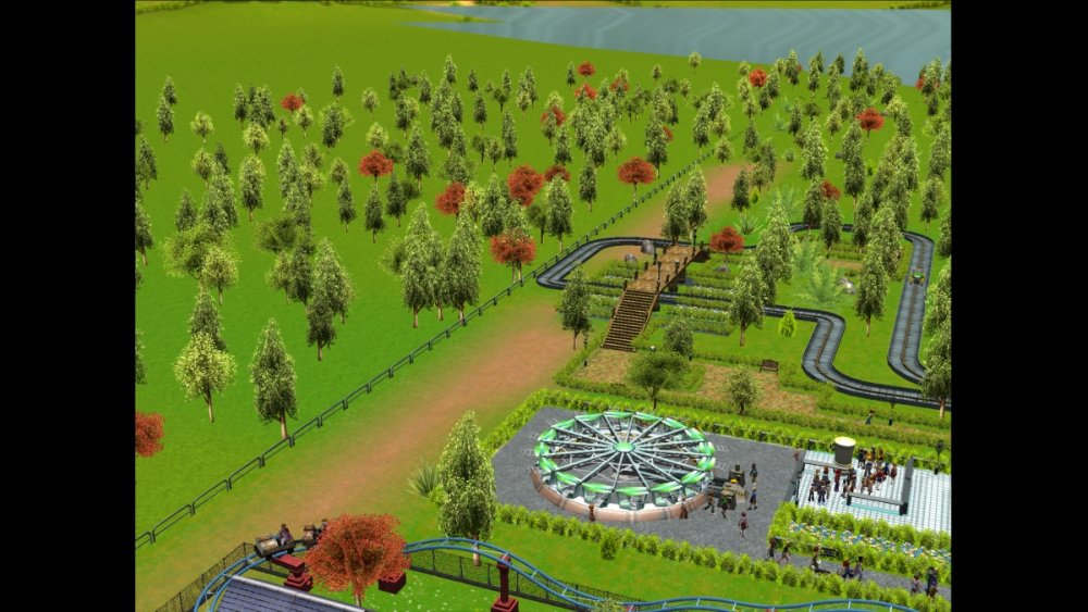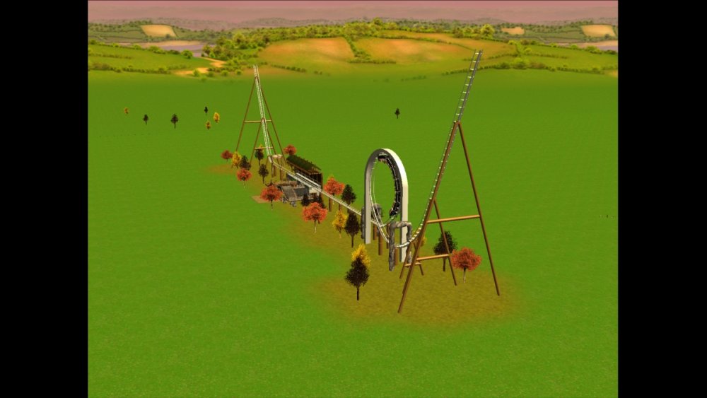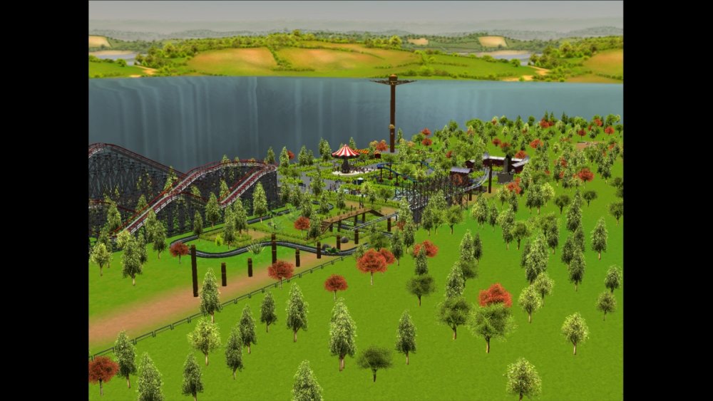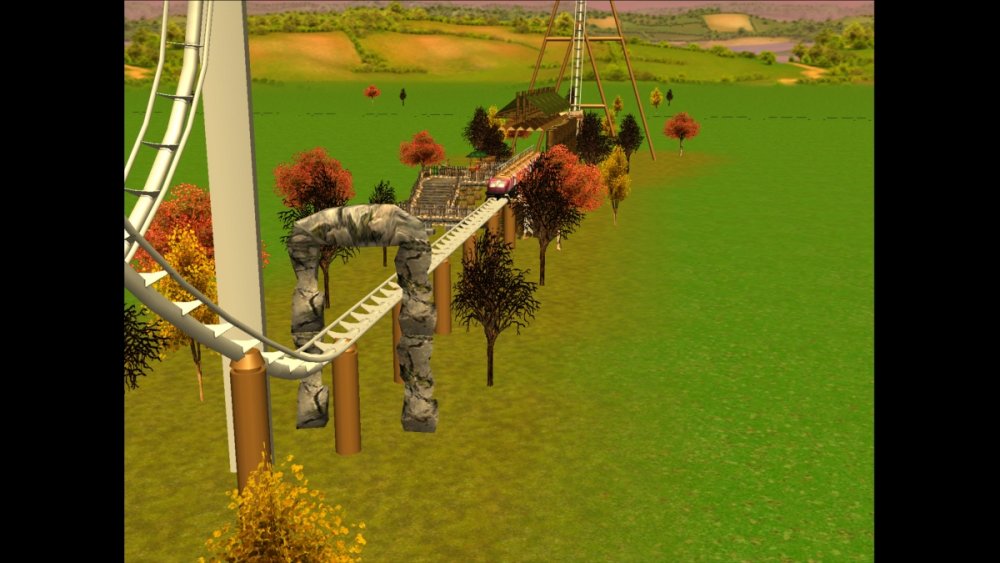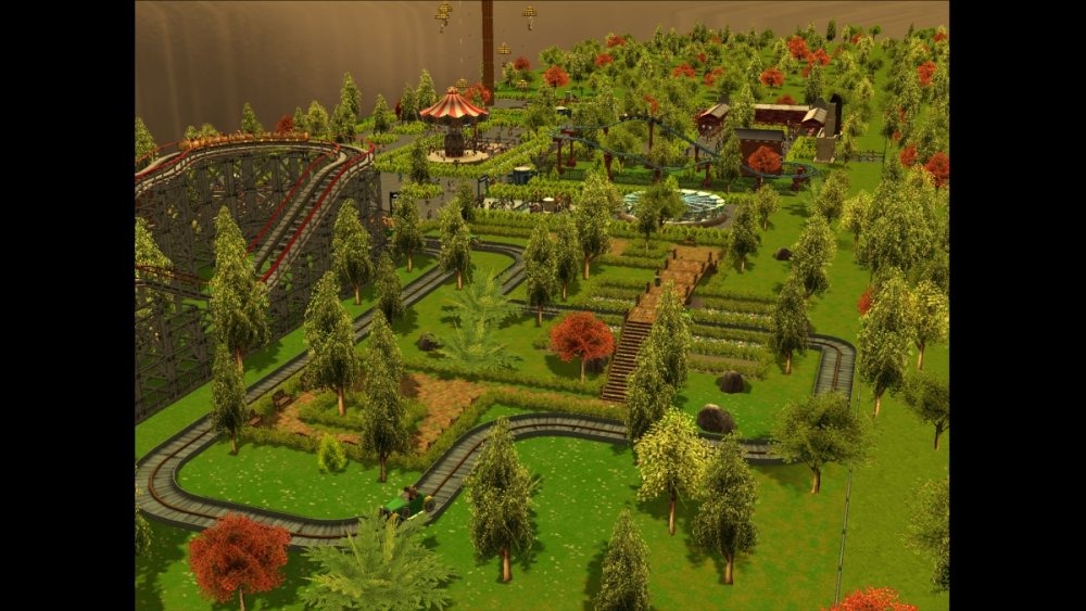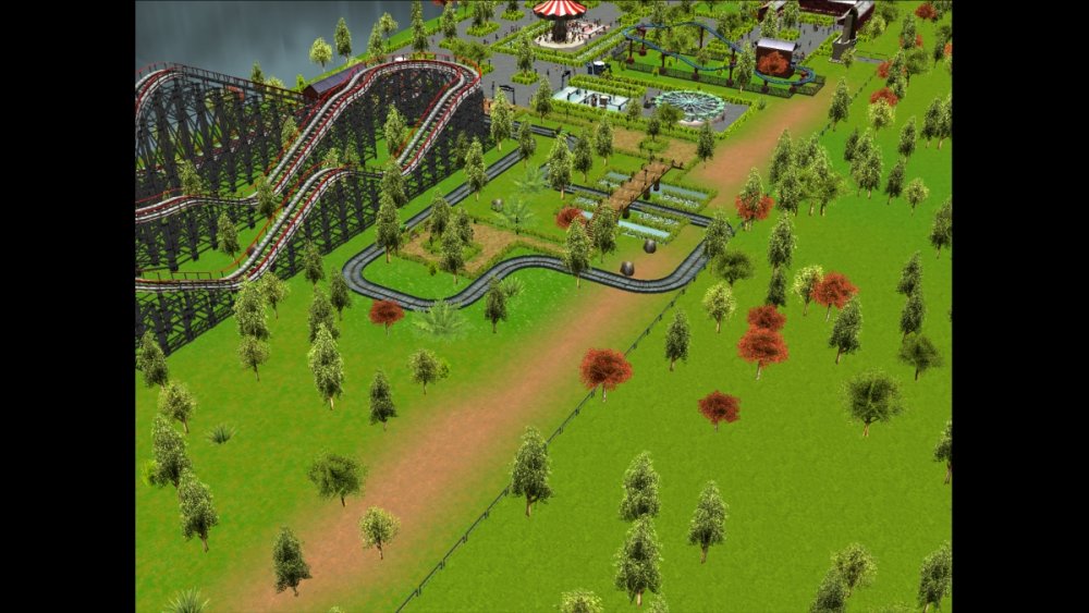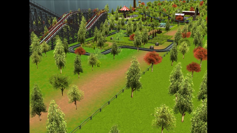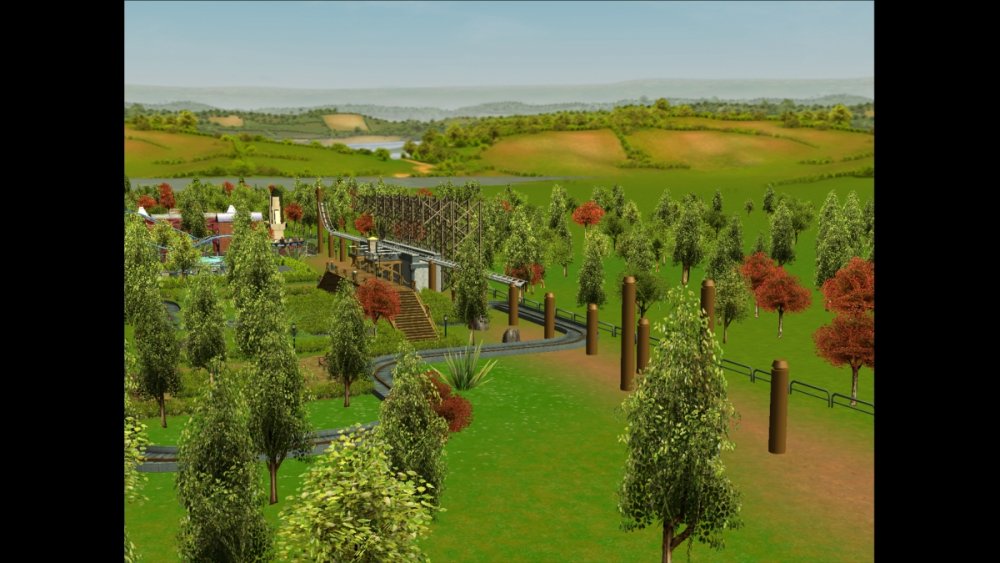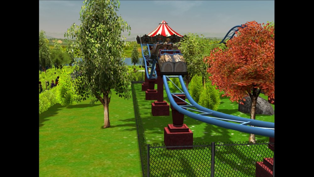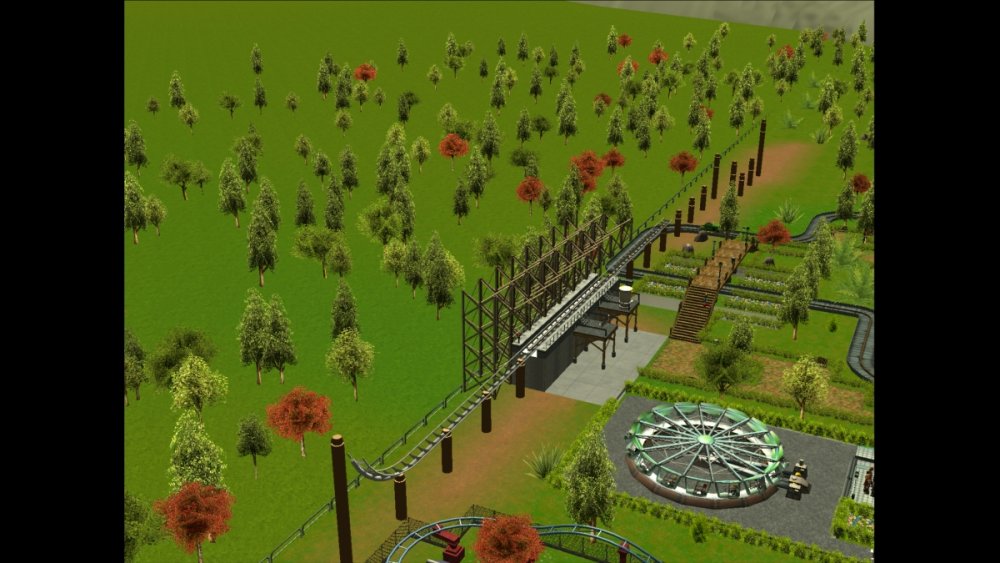 8 October 1977 Hello Seaside Spot's 1977 season is coming to a close, and it was a successful one! Guests very much enjoyed Adventure Cars this summer. However, some land clearing has begun around Adventure Cars and the park's main entrance. I wonder what it could be? While I can't tell you what our big surprise is quite yet, I can say that the announcement will be made on 22 February 1978! (Out of character, I would like to mention that I managed to get JCat's Steelworx on my iMac. Still no CTRs or CFRs, but some minor custom scenery may be involved from now on.) Fall is coming in as Seaside Spot's season is coming to a close. Some land clearing has begun on the east side of the park near Adventure Cars. The shape of the land being cleared is unusual, but that could mean anything... Whatever it is, it seems that it may have some kind of interaction with Adventure Cars. Do I see something back interesting back there? Hmm... It looks like some track pieces and columns have arrived. Only time will tell...