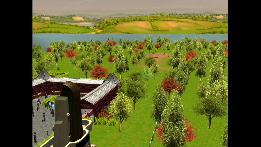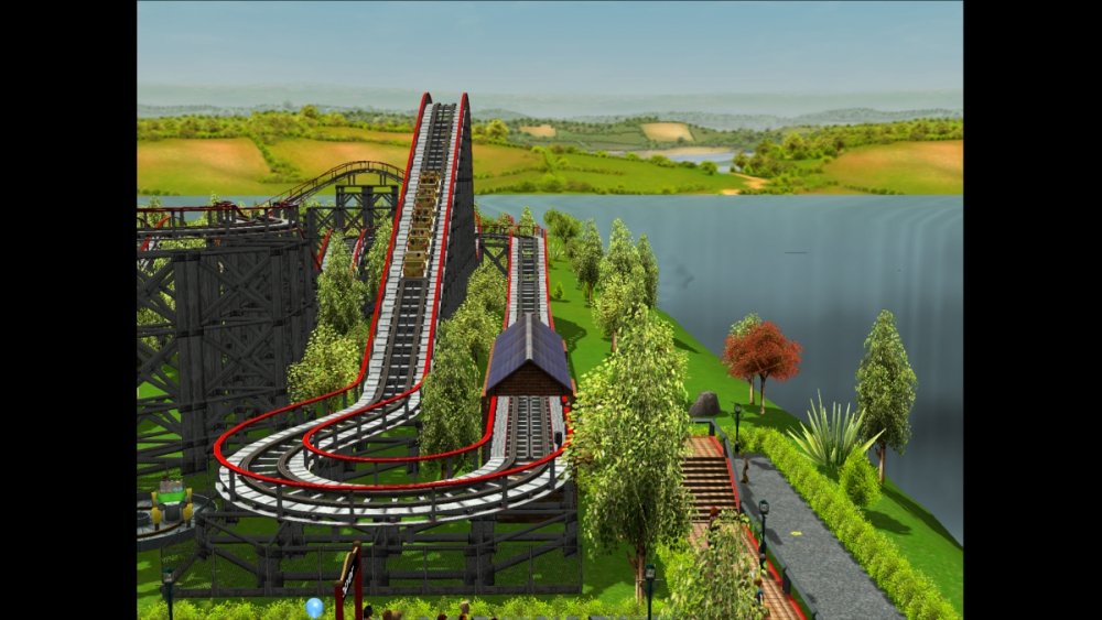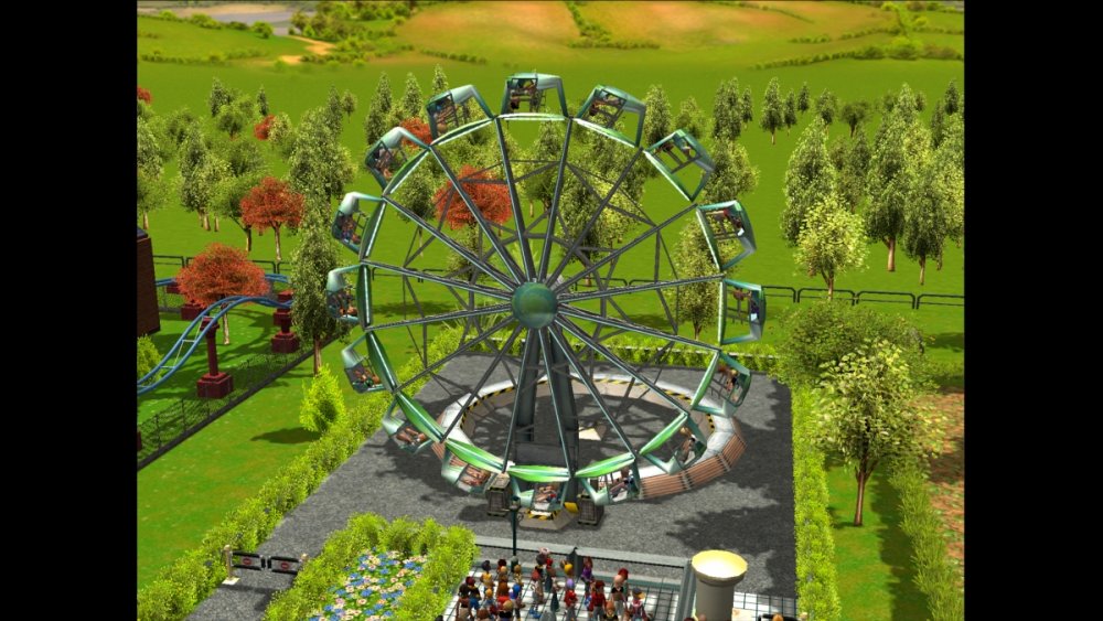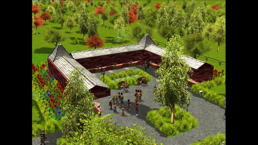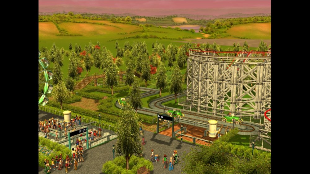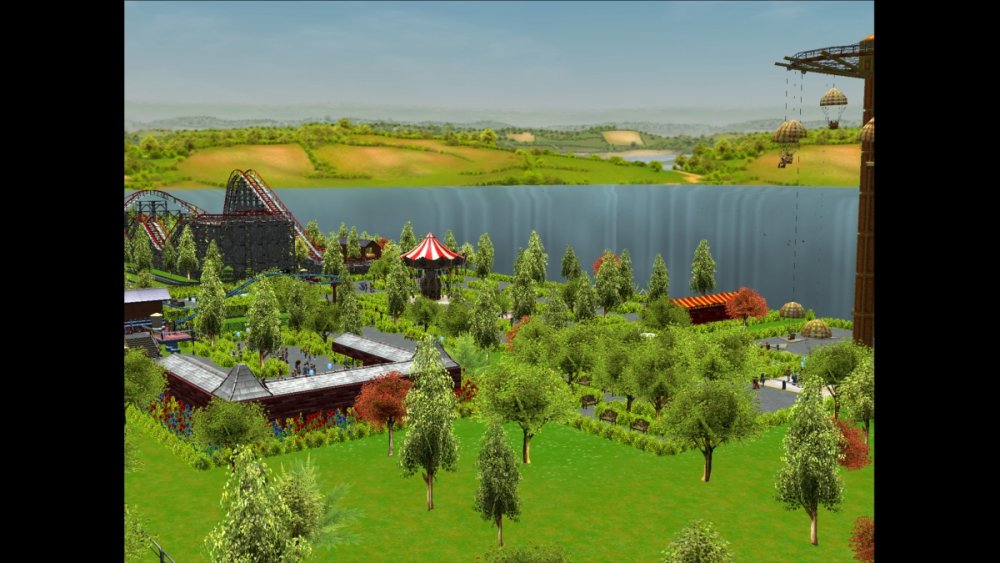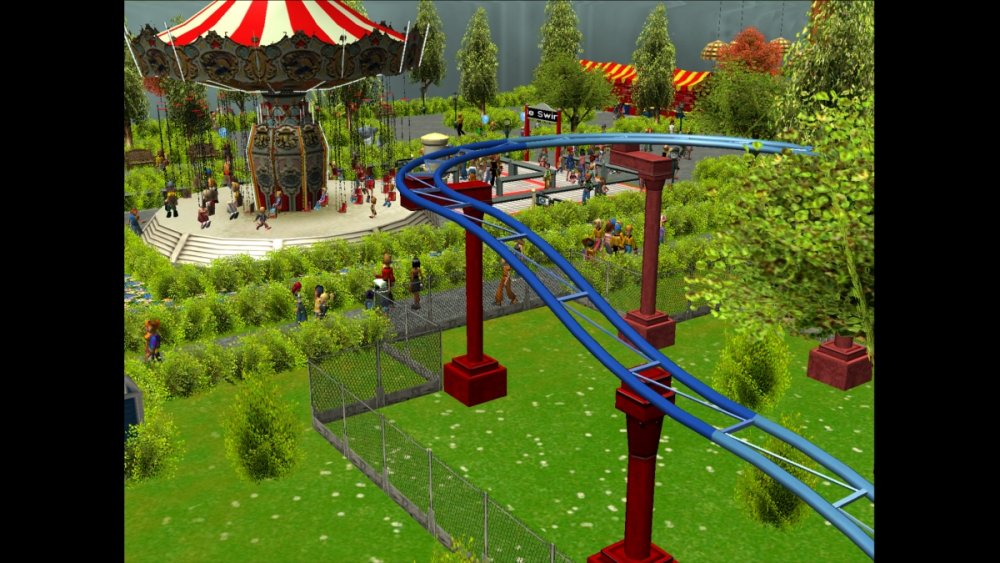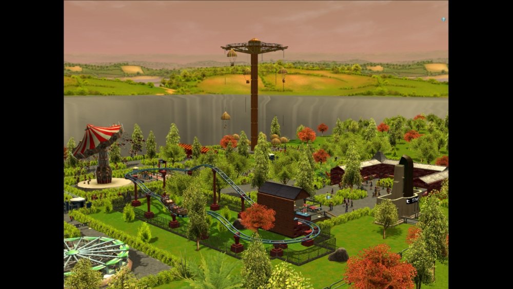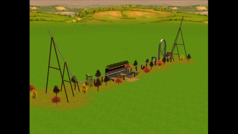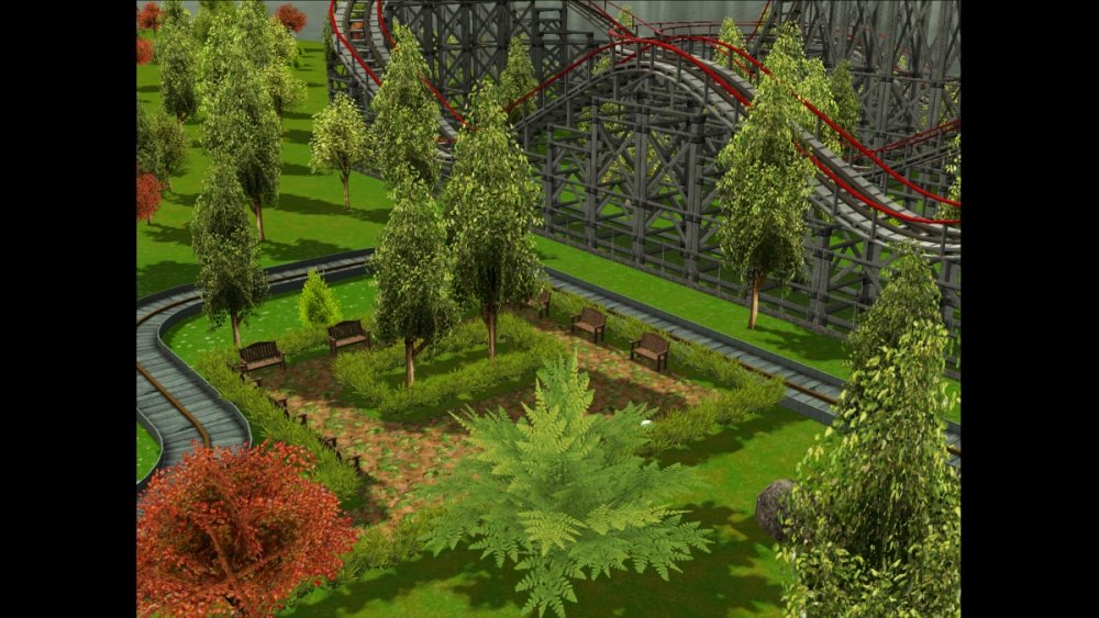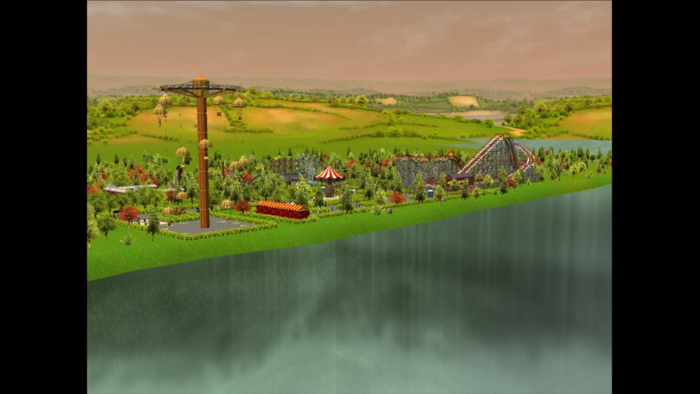 8 October 1977 Hello Seaside Spot's 1977 season is coming to a close, and it was a successful one! Guests very much enjoyed Adventure Cars this summer. However, some land clearing has begun around Adventure Cars and the park's main entrance. I wonder what it could be? While I can't tell you what our big surprise is quite yet, I can say that the announcement will be made on 22 February 1978! (Out of character, I would like to mention that I managed to get JCat's Steelworx on my iMac. Still no CTRs or CFRs, but some minor custom scenery may be involved from now on.) Fall is coming in as Seaside Spot's season is coming to a close. Some land clearing has begun on the east side of the park near Adventure Cars. The shape of the land being cleared is unusual, but that could mean anything... Whatever it is, it seems that it may have some kind of interaction with Adventure Cars. Do I see something back interesting back there? Hmm... It looks like some track pieces and columns have arrived. Only time will tell...