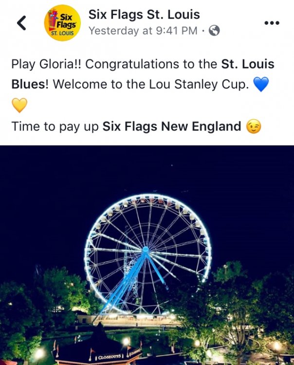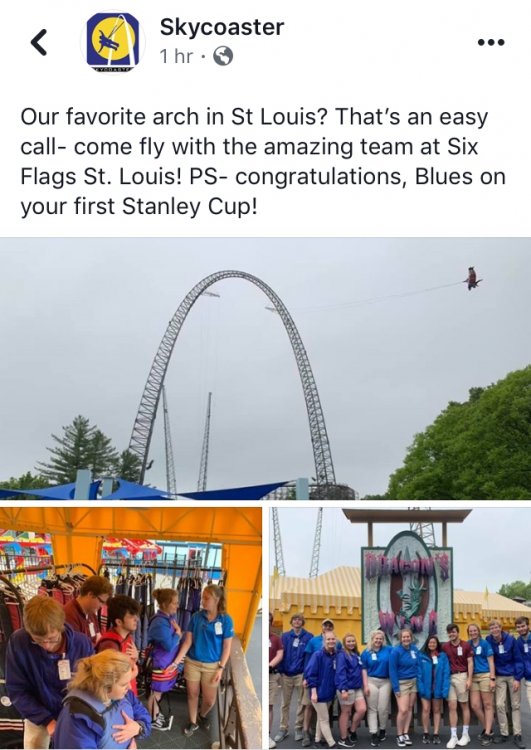 Don’t remember exactly who (sorry to whoever it was but thanks for the pics EDIT: that would be Danrarbc), but someone had posted a pic wondering what the spot lights outside Colossus were for, since the ride already has a lighting package. Well, here is what that was for: Quite the blue-tiful sight, don’t ya think? Also, the Boss not being renamed and SFNE having to pay up on their end of the deal (followed by SFDK having to make good on their bet too) is one of the best parts of the Blues win, in my opinion. With a country who loves a good underdog story, even the company behind the universally-popular Skycoaster brand extended their congratulations, albeit in their own appropriate way: To be completely honest, I’d have to say that out of the arches in St. Louis, mine are still probably the Golden Arches. (I’m a sucker for an Oreo McFlurry) -