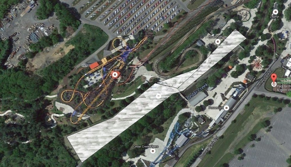 Even if you don't remove Dinosaurs Alive, I think you could still make it work if you relocate Revolution. Here's what I was thinking. Granted it's skinny, but you could always have higher turns extend over the creek. I also included Talon in the shot in order to illustrate size, and how you can still get a good coaster in a tighter spot. Shaded section = potential spot