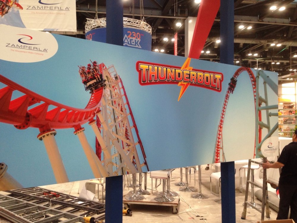 Update!!! Thunderbolt!!! OCT is ready to let you wait in line for 6 hours with one train operation and ride employees. Wonder World's knock-off Flying Dutchman with similar-to-Intamin-Multi-looper layout. Gerstlauer is here, well, the name is here. This is the big news!!! Outlaw Run at Vekoma booth!!! Chance!!! TP... 'nuff said Intamin is all empty. Closer and closer... WTF!?!? There is something weird This is Wanda's booth... Seriously? Golden Horse's 16 Inversion coaster? It's like full of barrel rolls and...headbanging. Golden Horse -