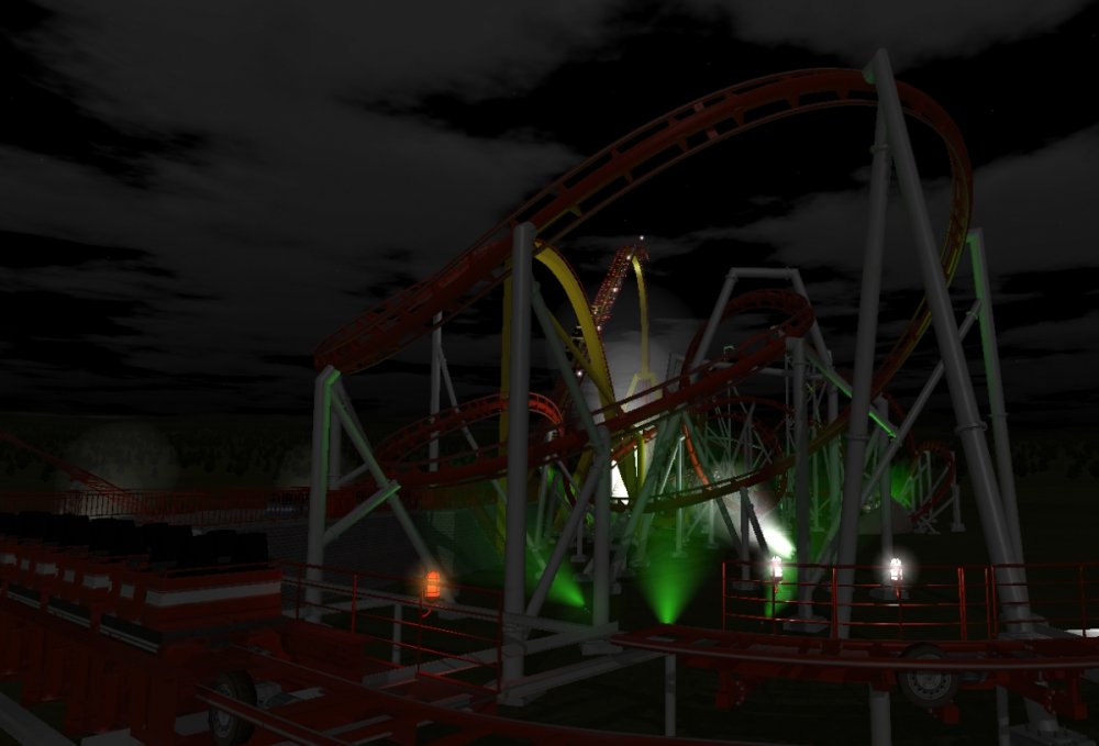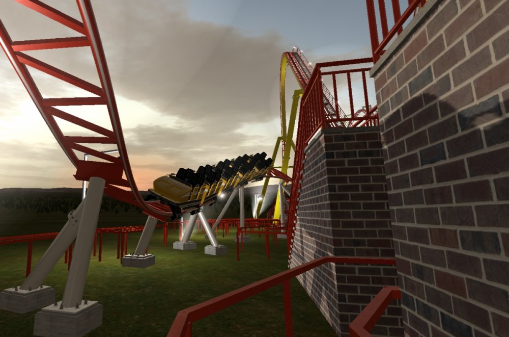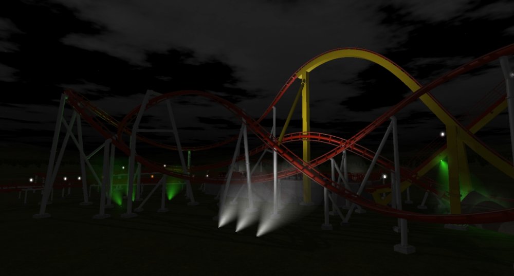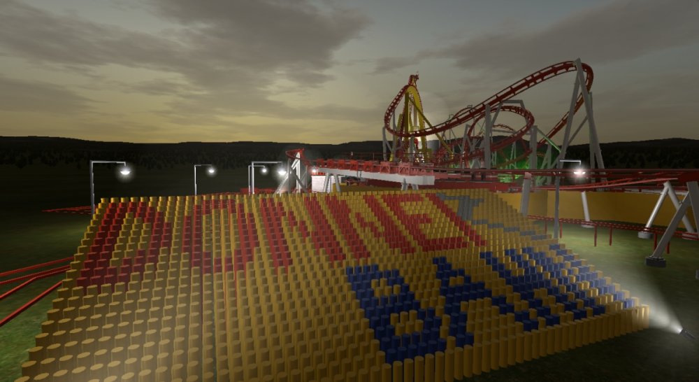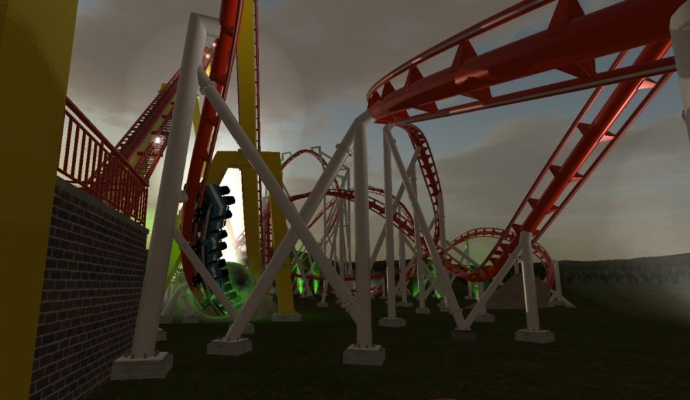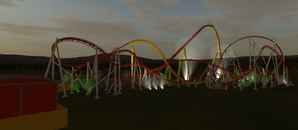I've created a coaster system with my own track and train. On NL2, Schwarzkopf classic looper is the closest system that I can use to represent this system. Donnerbahn is kind of a mix between Mega-Lite and Infinity Coaster with a new element called Immelmann Floater Dive which gives you a combination of ejector airtime and crazy lateral. Hourly capacity can reach up to 1200pph with three train operation, station design is similar to that of Millennium Force so sufficient load and unload time is guaranteed. 12 airtime moments, 3 overbanked turns, 2 inversions, 2 trick tracks, an underground tunnel and 9 crazy twists are all packed into this compact structure and you won't get a second to catch your breath after the train pulls you down the 100ft tall, 87 degrees first drop at 53 mph. Length of the track is only 3039 ft so imagine how insane the ride is! As my first NL2 release since I joined NL2 this Janauary, this coaster was originally planned to release on March 31st. But after I started with this project, I realized March 16th will be Edmonton Mall Mindbender's 30th Birthday so I changed the teal and grey color scheme into Mindbender's red, yellow and white then made a few modifications here and there. I will post at least one photo everyday on this thread until the release date. The track will be available on both TPR Game Exchange and NLE, TPR release will be 5 hours earlier. Please tell me what you think about it! Your review means a lot to me.