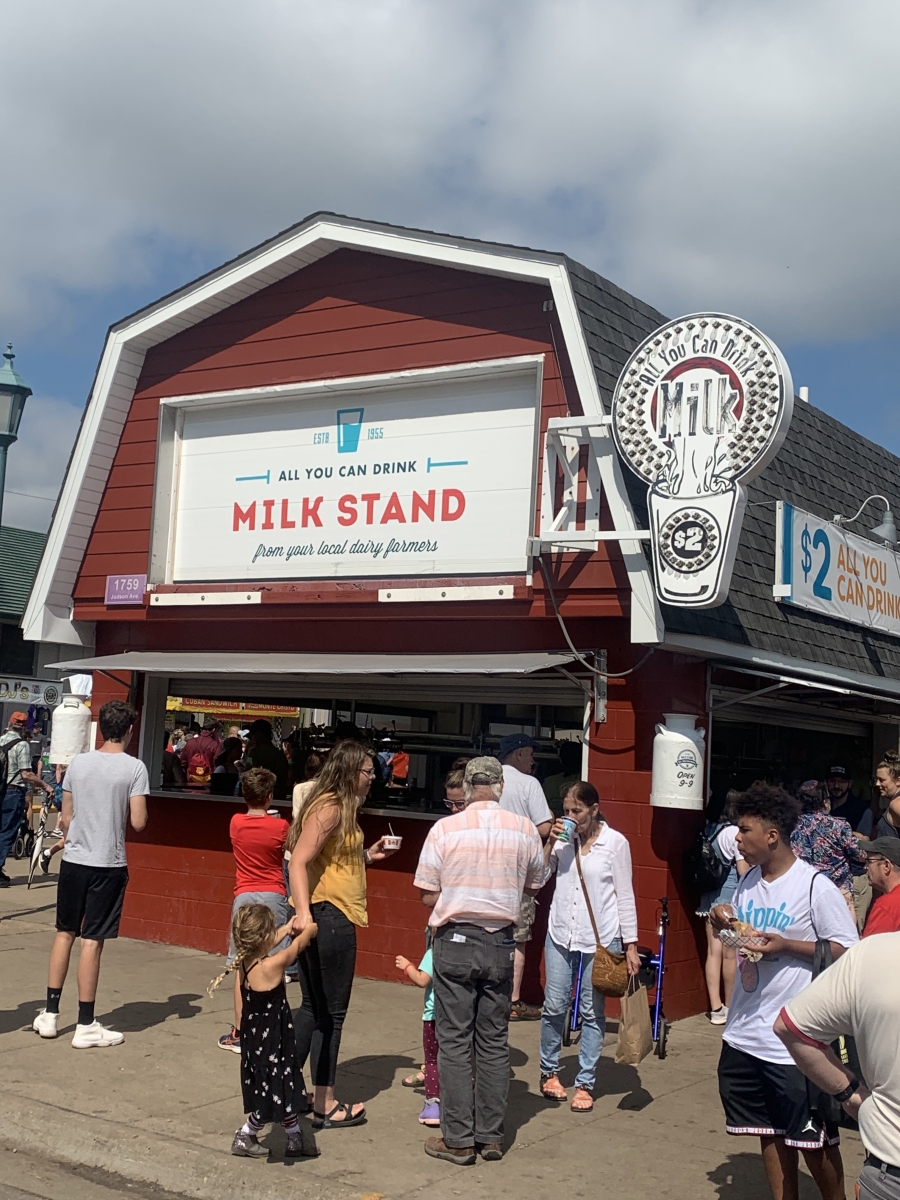 Greetings from the great state of Minnesota, and The Great Minnesota Get-Together (also known as the Minnesota State Fair)! I had not heard about this fair prior to moving to MN. I had heard of the greatness of Texas and Ohio and apparently the Minnesota State Fair is right up there with them. It may be a bit smaller than Texas and Ohio State Fairs, but it sure does cram a lot into a small space. Hopefully this report will give some insight into why the Minnesota State Fair is one of the best in the nation. My wife and I decided to visit on the first Saturday of the fair. We bought our tickets beforehand at a local grocery store (Cub for $12) tickets are normally $15 at the gate. We also purchased a book of ride tickets for $15 (normally $25). With tickets in hand, we headed to one of the free park and ride lots scattered around the cities where a bus picked us up and dropped us right at the front gate of the fair. The fair opens every morning at 6 am however, most of the buildings and attractions do not open until 9 am. We got to the fair around 8 so we had a little time to walk around and explore before crowds got crazy. Our first stop was the information booth to get a map and schedule for the day. We also took advantage of the free sunscreen provided by the fair. We did note that the fair also provided ID wristbands to put on children in case they got lost. We looked at the schedule and decided to go watch a show put on by the Minnesota Historical Society: History on a Schtick. It was really funny and we learned some things about Minnesota! Did you know that the Minnesota state muffin is blueberry? After the show we were getting hungry so we decided to get a cone of Sweet Martha's cookies ($7). They also sell huge buckets of cookies ($17) and pile them high on top. Fun fact: Sweet Martha's makes 3,166 cookies every minute. That's over 3 million cookies per day! If you give a mouse a cookie.....he's going to want a glass of milk. What better place to get a glass of milk than the milk stand. For $2 you can drink all the 2% white milk or 1% chocolate milk you can drink. This was by far my favorite thing at the fair. So much so, I came back and volunteered here later during the fair. I sold 328 glasses of milk and poured over 112 gallons of milk during my shift. Over the fair, they serve 26,000 gallons of milk! We walked around for a bit and stumbled across the corn roast booth where we bought an ear of corn ($4). The corn is roasted in its husk and then dipped in a vat of butter and served. It was really good! Over the course of the fair, the corn booth goes through 4,000 lbs of butter. We thought it was cool that instead of throwing away the cob, you could recycle it. They take it out to a local farm where it is used as compost. This is the oldest food establishment at the fair, it started operating in 1897. It looked like they had good milkshakes! They even have an Irish pub here at the fair with its very own bagpiper! Another popular establishment at the fair is Fresh French Fries, they go through 145 tons of potatoes over the 12 day run of the fair. And for all you die hard Minnesotans: Hotdish on a Stick! Now that we had put ourselves in a food coma, we went around and looked at all the exhibits the fair had to offer. We started with what could be the most famous exhibit at the fair: butter sculptures! These sit in a room kept at 40 degF so they don't melt. Apparently after the fair, the subjects get to take home their bust and use it however they see fit (I think one girl was giving to her schools pancake breakfast) Next was something Minnesotans are apparently very passionate about: crop art. So much so that there is always a 10-20 minute wait just to see the art. Now where's my fastpass.... I think my favorite piece was the cats with laser beams. In the same building as the crop art, they were selling these apple cider freeze popsicles ($1.50). It seemed like everyone in the building had one. Another exhibit was the Miracle of Birth center. We got to watch a baby pig be born. It was something I had never seen before, and a very unique thing to showcase at a fair. In addition to pigs, they also had live cow and sheep births. The DNR had a really nice exhibit center with lots of fish tanks and a taxidermy walkthrough of Minnesota wildlife. The DNR also has a fish pond at the fair. I don't know what it is, but there is just something therapeutic about watching Minnesotans look at fish. The fair also has lots and lots of animal barns. We strolled through the cow and sheep barns and it took half hour or so. The fair also has an exhibit called Moo Booth in the cow barn. They have cow milking demonstrations and even let kids milk a cow! On to the rides! I was kind of surprised that the fair didn't have the best midway. The midway is made up of several owners/companies so there are no pay one price wristbands. Rides tended to be between 5-6 tickets with tickets costing $1 each. Just because they didn't have the best midway doesn't mean they didn't have unique rides. The ride above was called beach party. I had never seen one before, it was kind of a tilt-a-whirl without the tilting platform. However they had cams under the ride to make the vehicles tilt to invoke a spinning motion. They had a downdraft so of course I had to have a ride. Unfortunately they didn't run a long cycle like Knoebels does. A spinning mouse! Other rides included a Spider, Rockstar, a Mondial Magnum, and a zipper. The Minnesota State Fair also has a few permanent attractions one of which is a Von Roll Skyride ($4.50)! I have been on a few of these but I've never seen one with enclosed buckets. The local news ran an article about the guy who owns the skyride; he apparently keeps a spare of every part and a spare generator because "Losing a day of business at the fair is like losing a month of normal business." In addition to the skyride, the State Fair also has the sky glider, a chairlift type ride ($4.50). Anothe